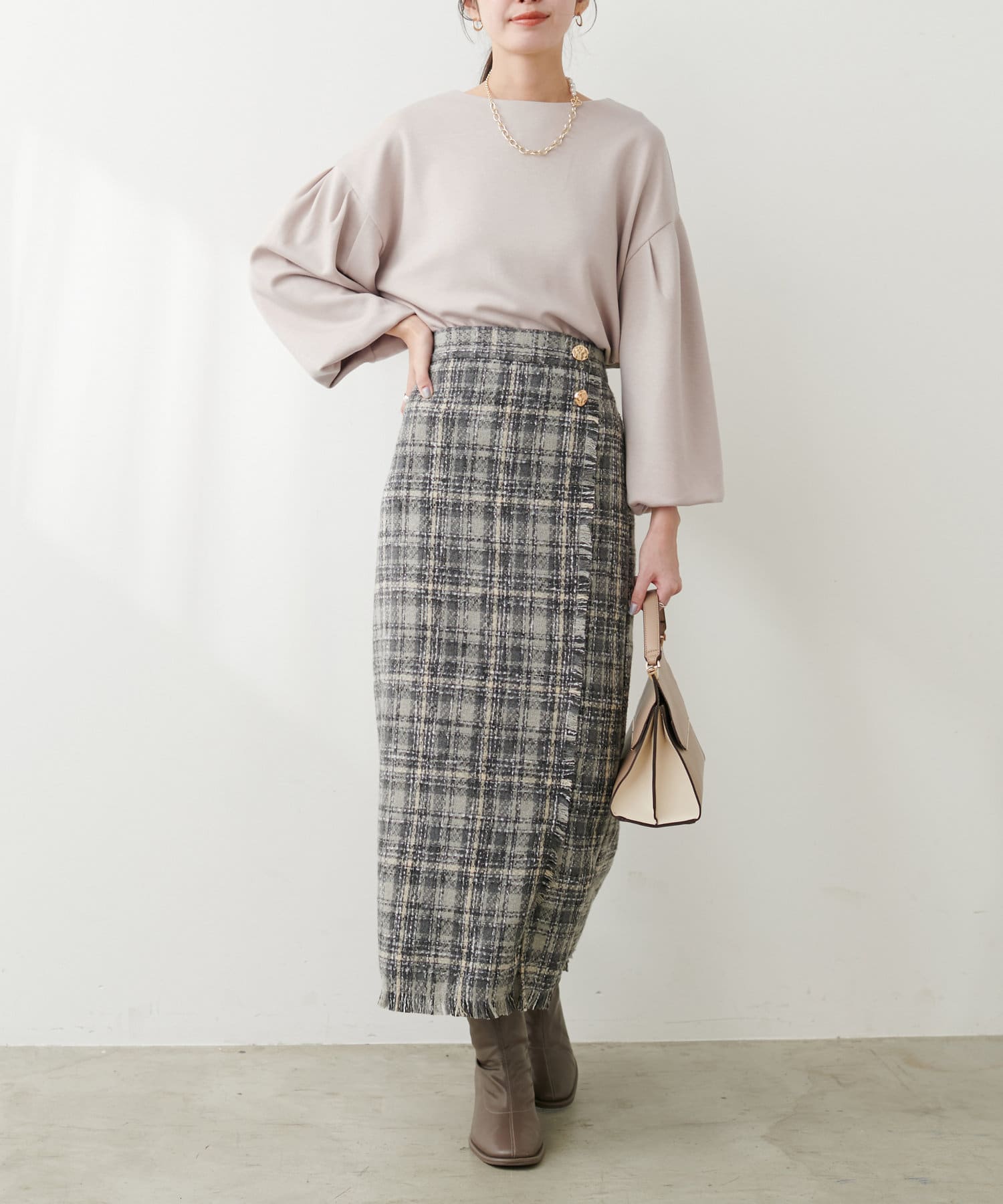 金釦ツイードやチュールなどきれいめなスカートと合わせて