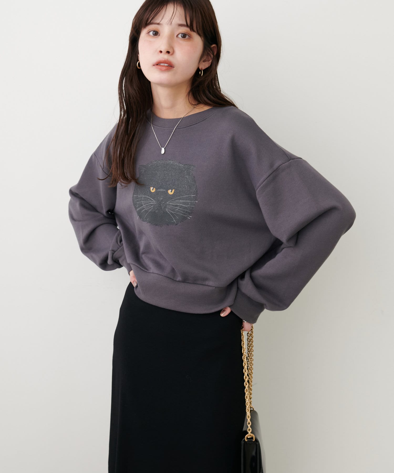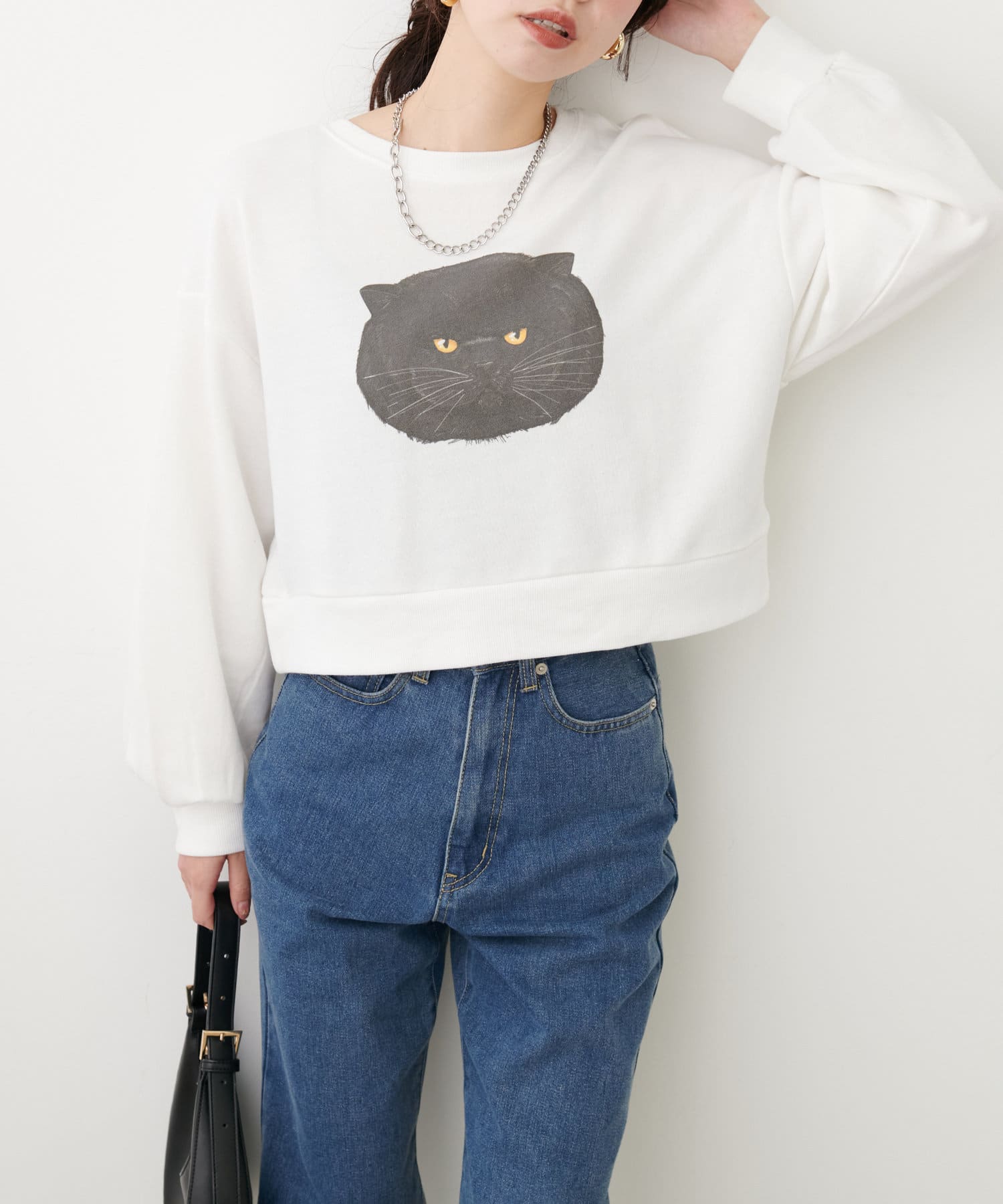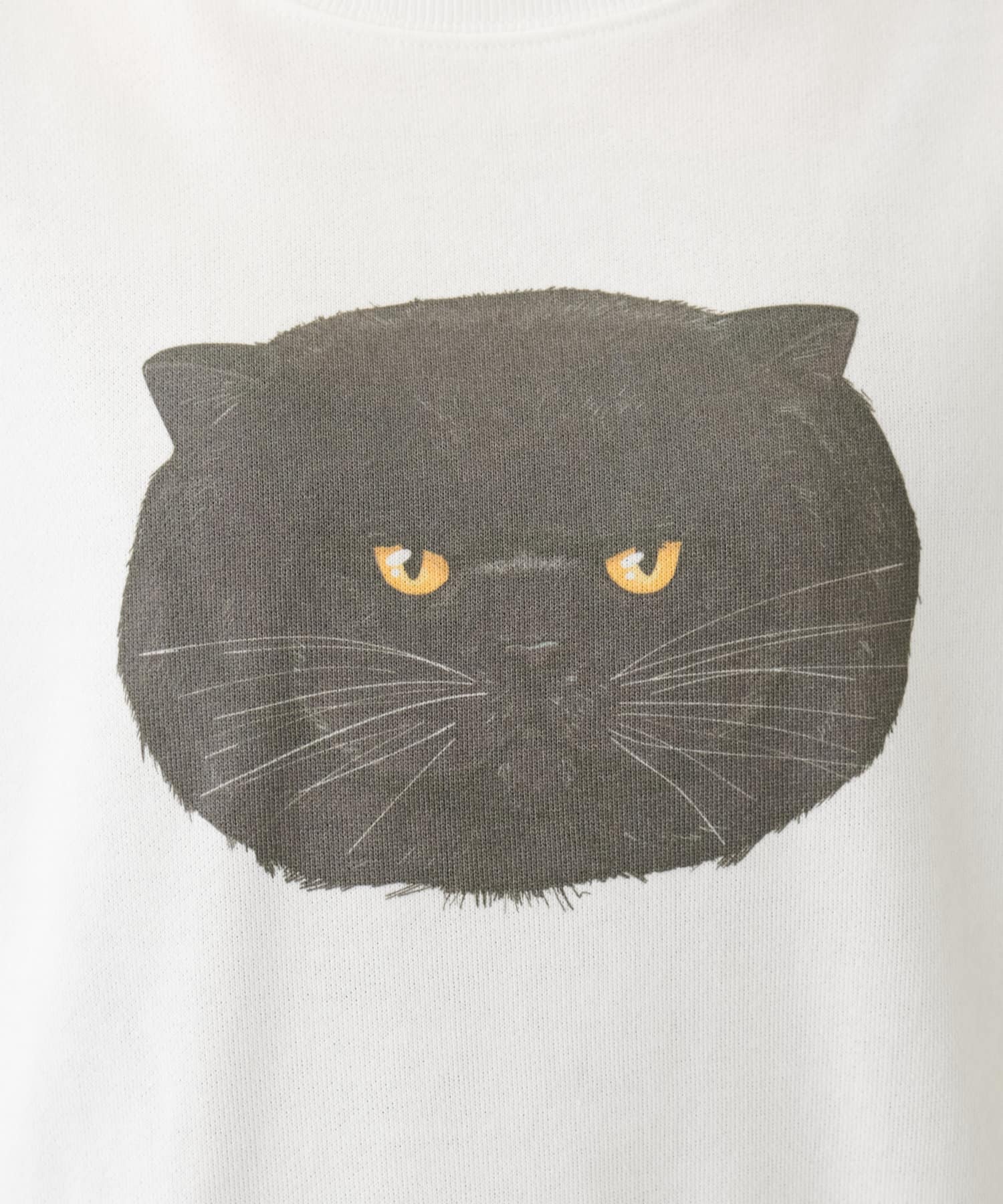 アンニュイな雰囲気のジト目ねこのプリントが可愛らしく、コーディネートのアクセントに。