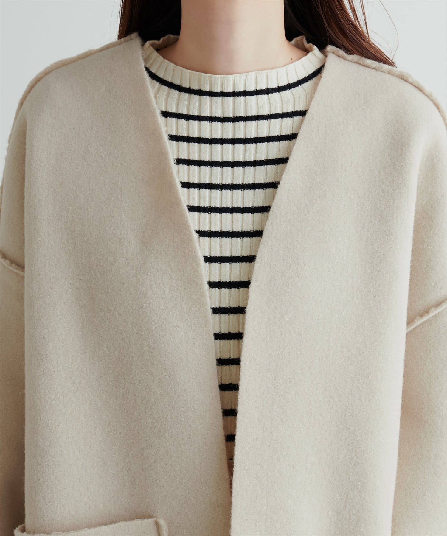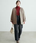 ノーカラーデザインなので、タートルネックニットやマフラーとの相性も抜群です。