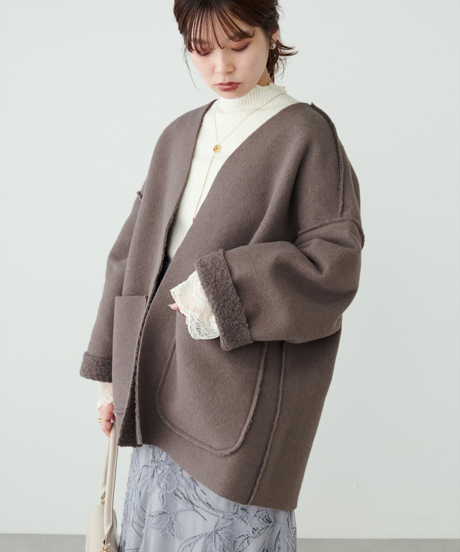 軽やかな素材と釦レスデザインで、さらっと気軽に羽織れる秋のスタメンアウターです。
