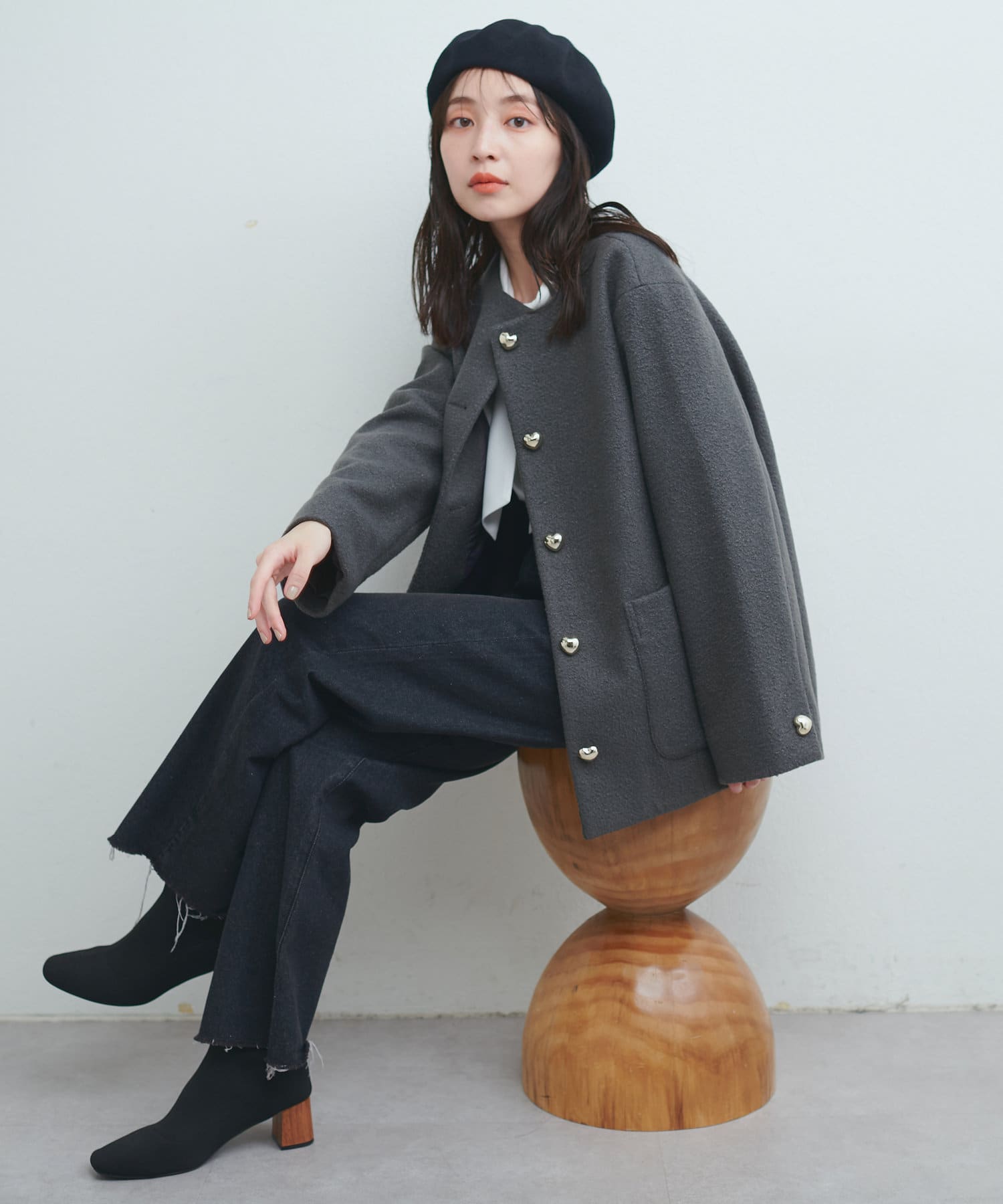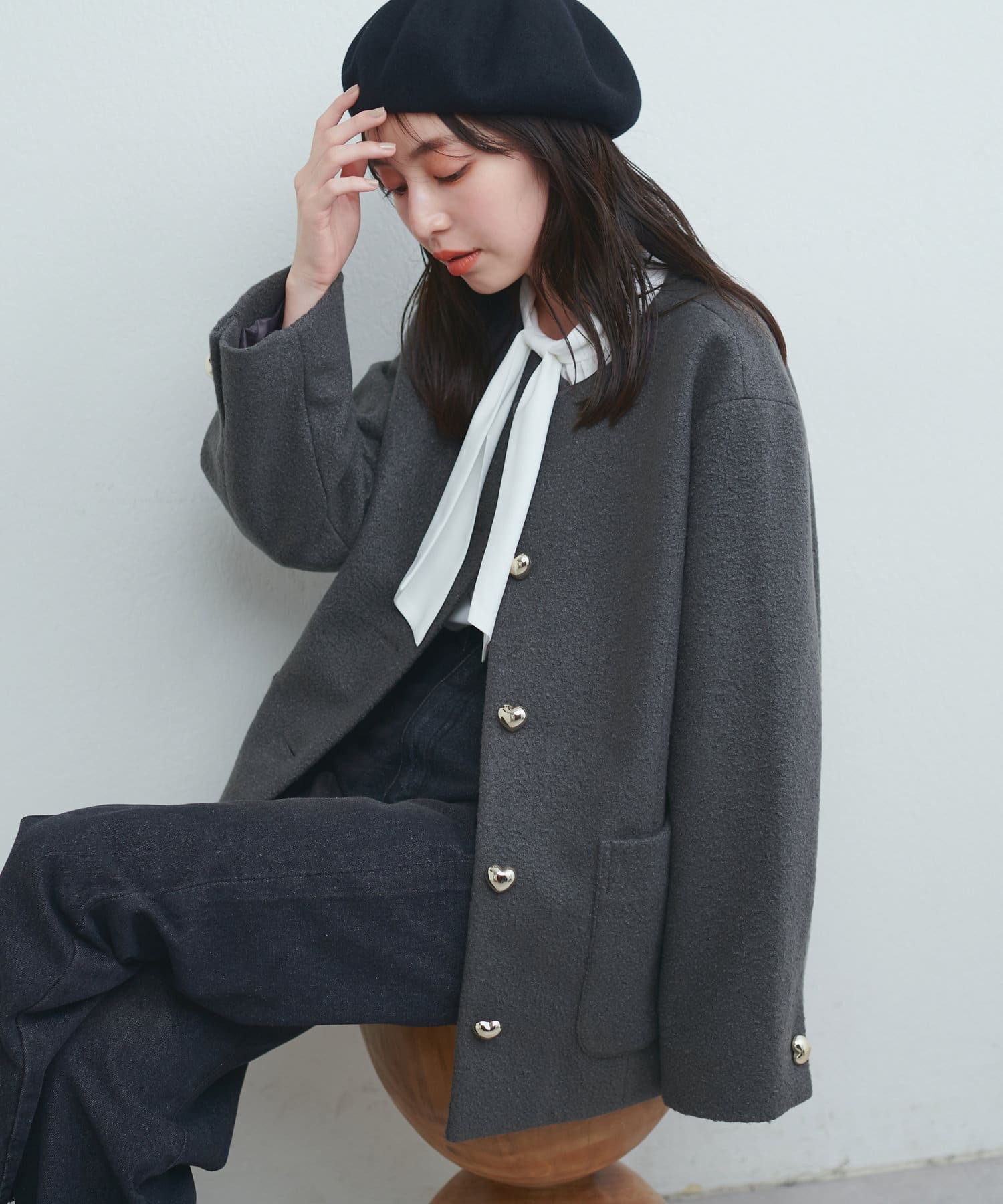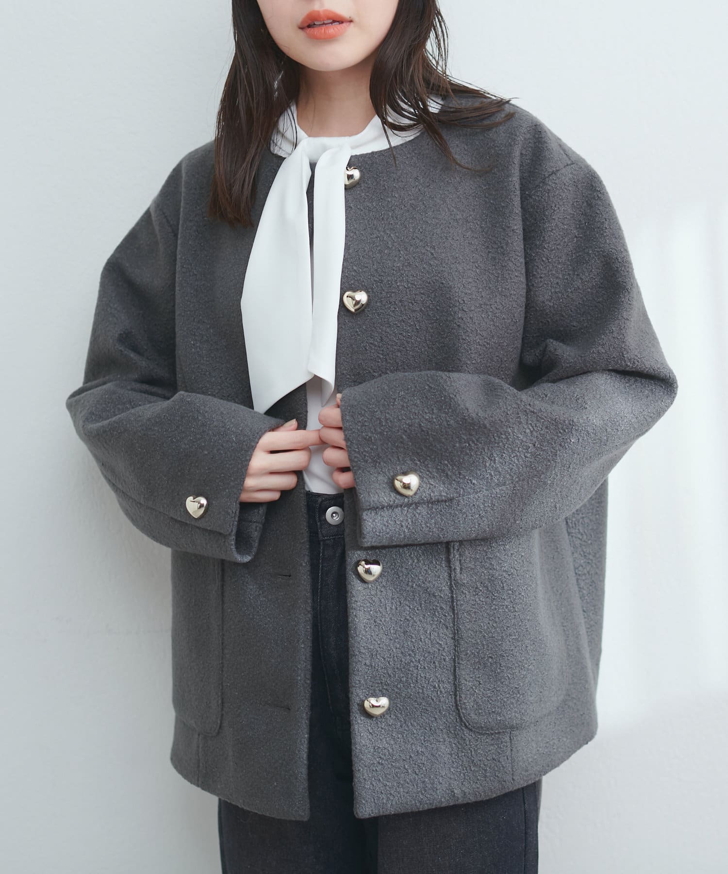 丸いシルエットと大きめのハート釦が特徴のジャケットが登場。