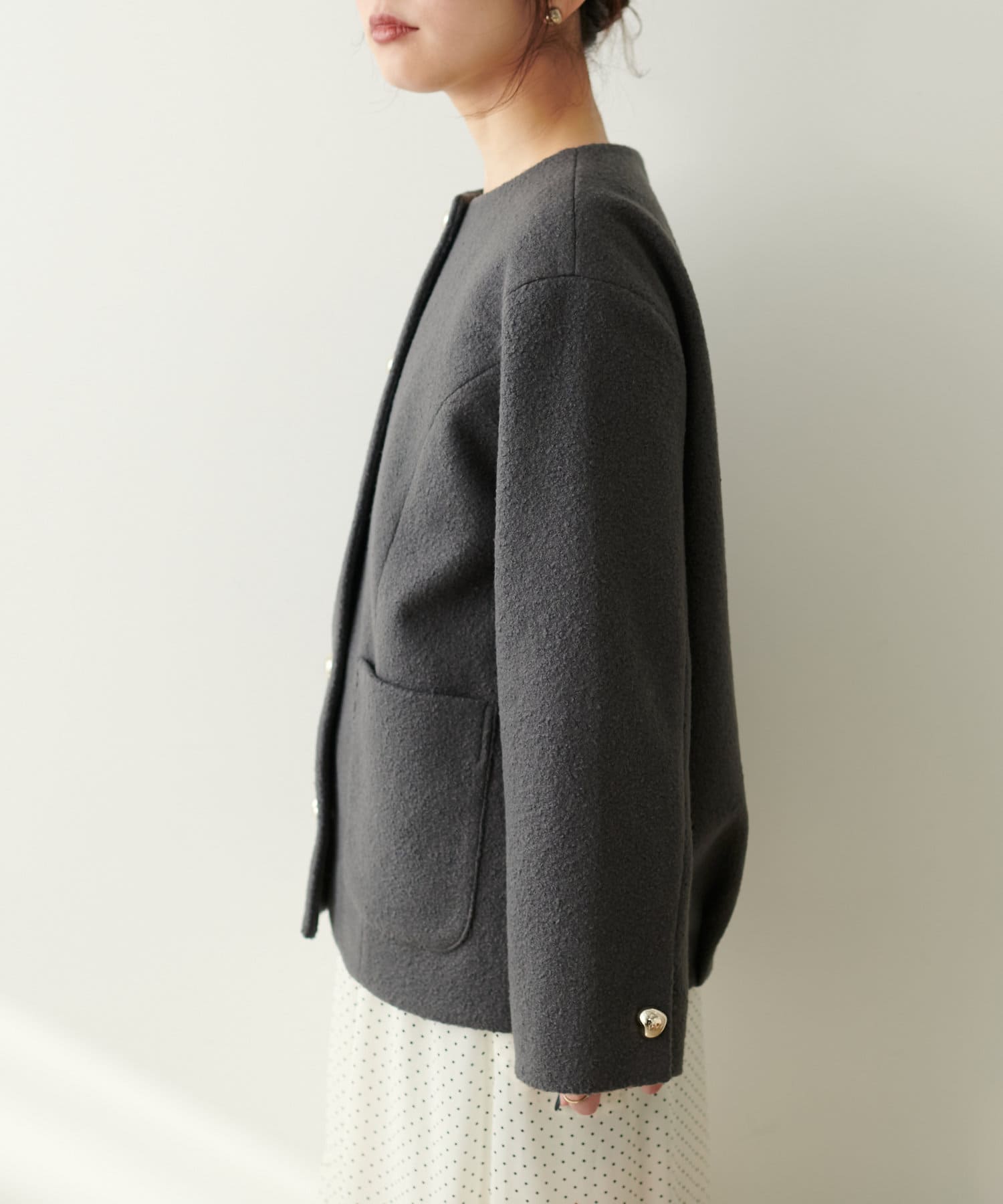 首元はノーカラーですっきりとしたデザインに。