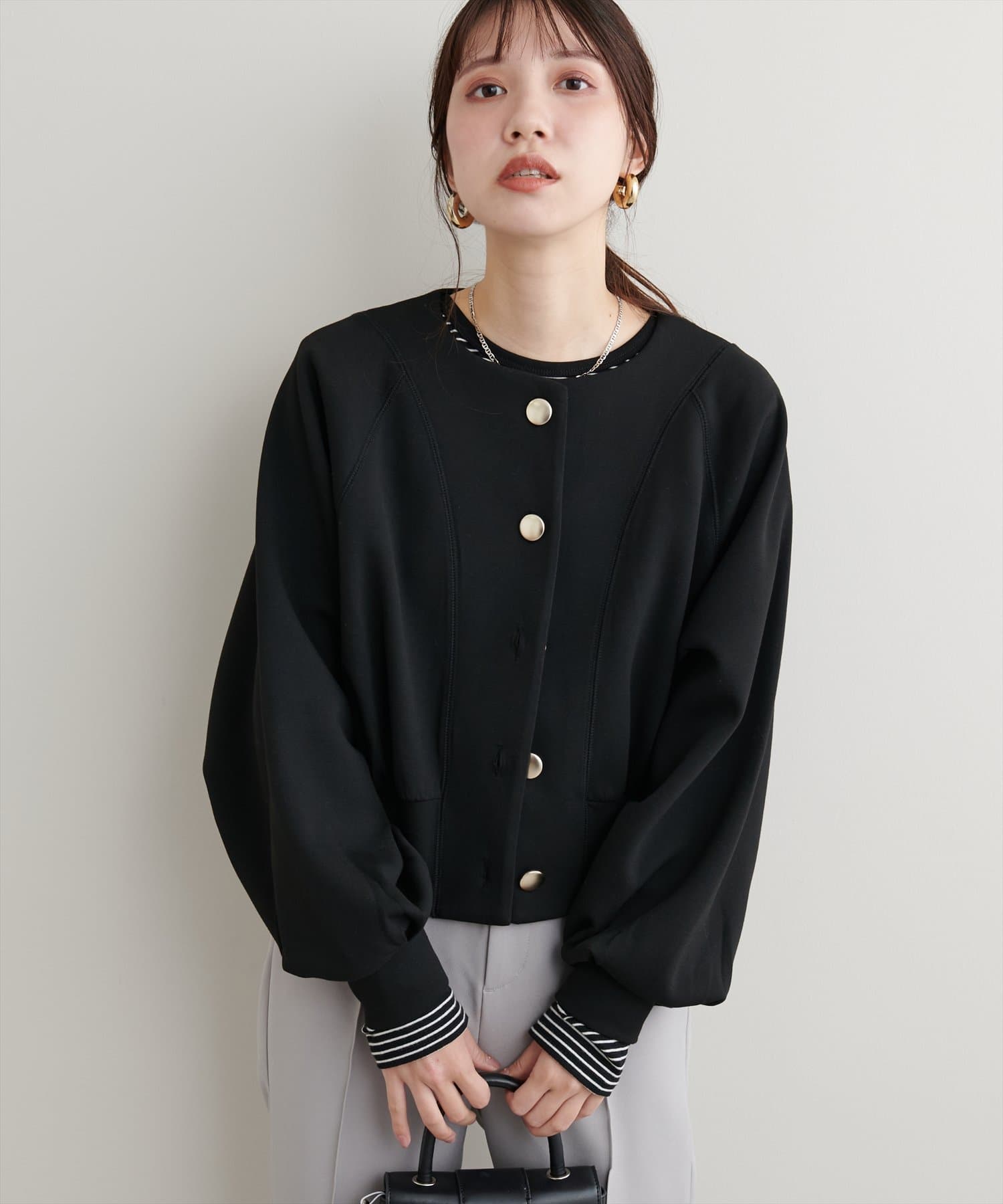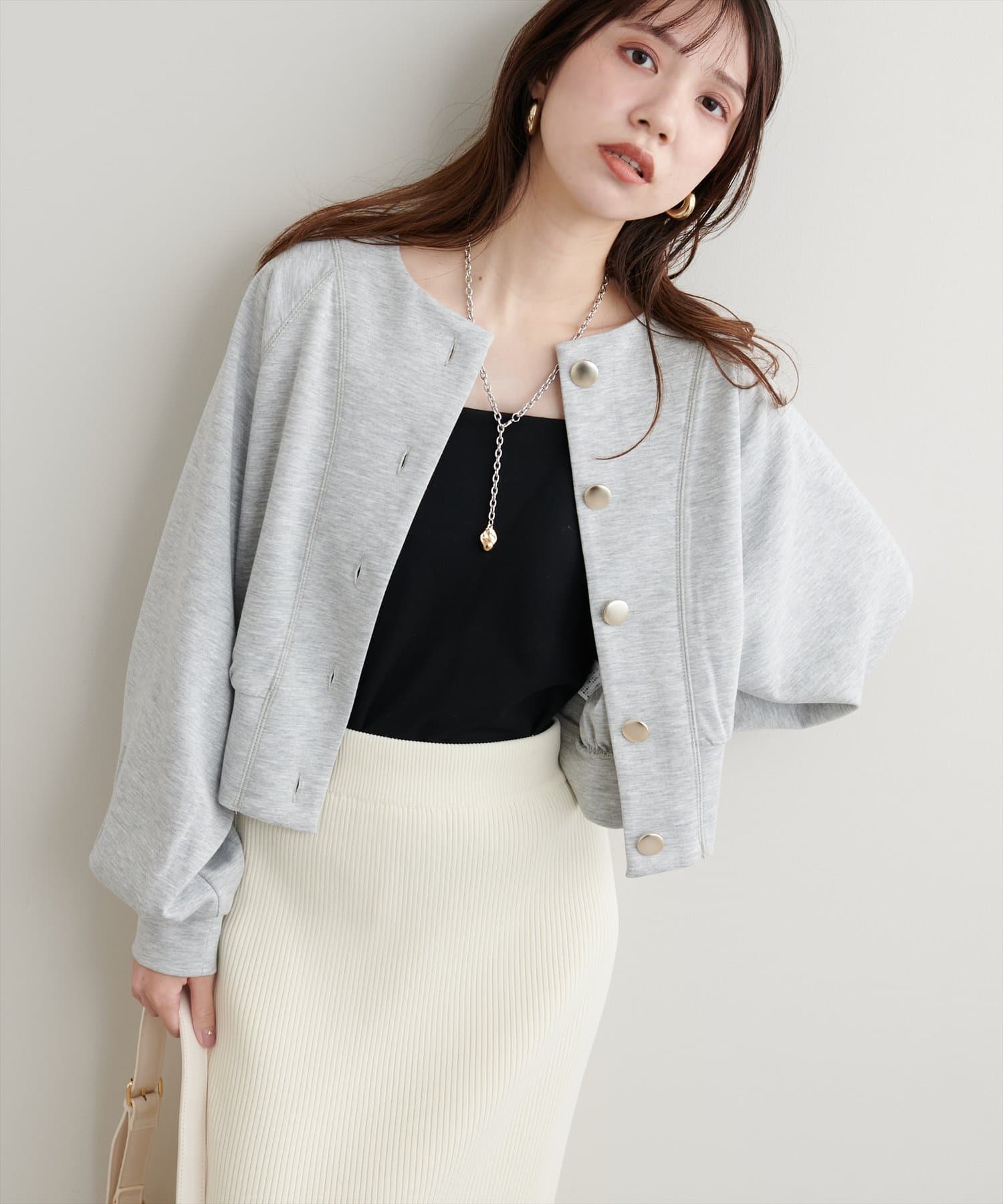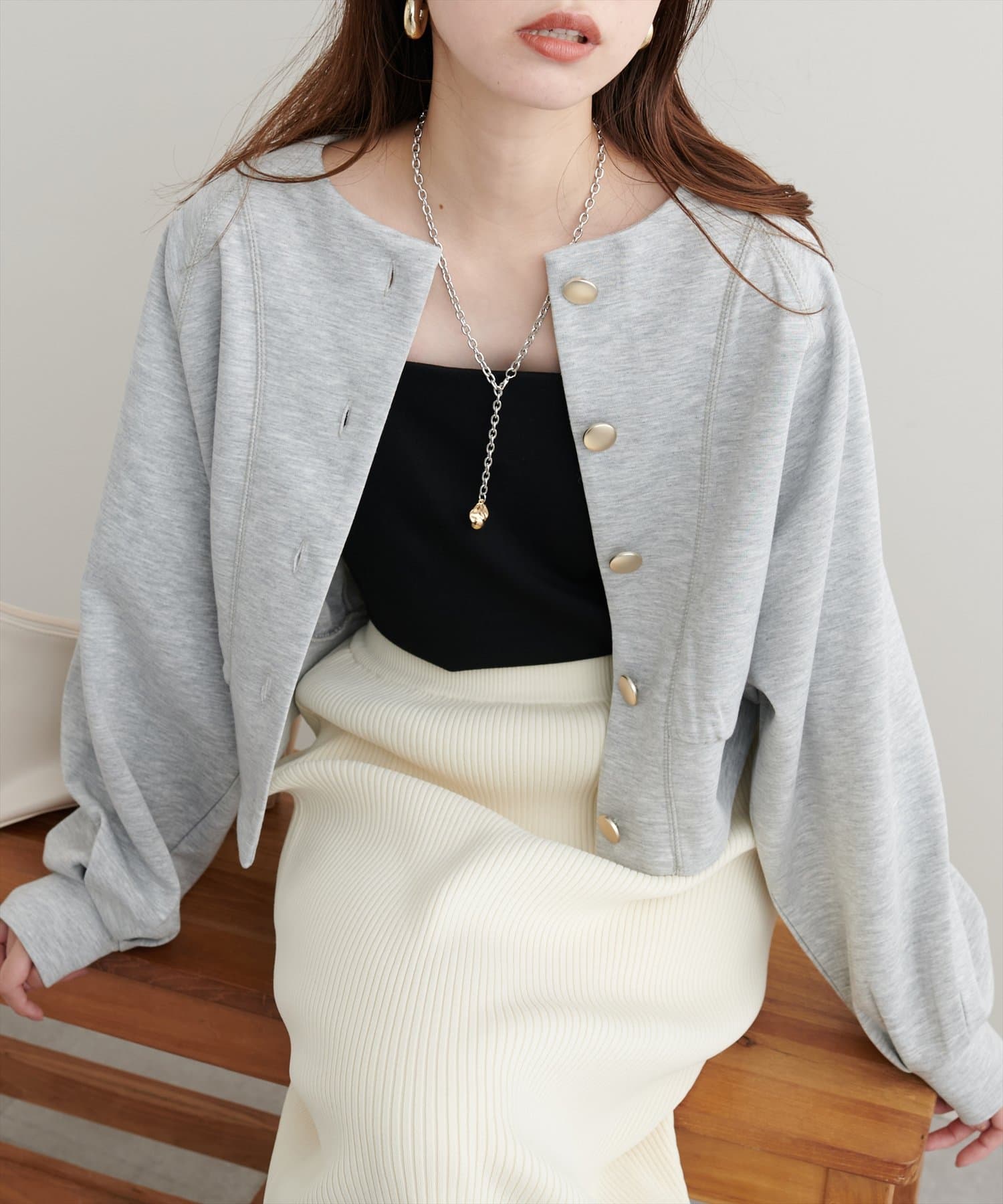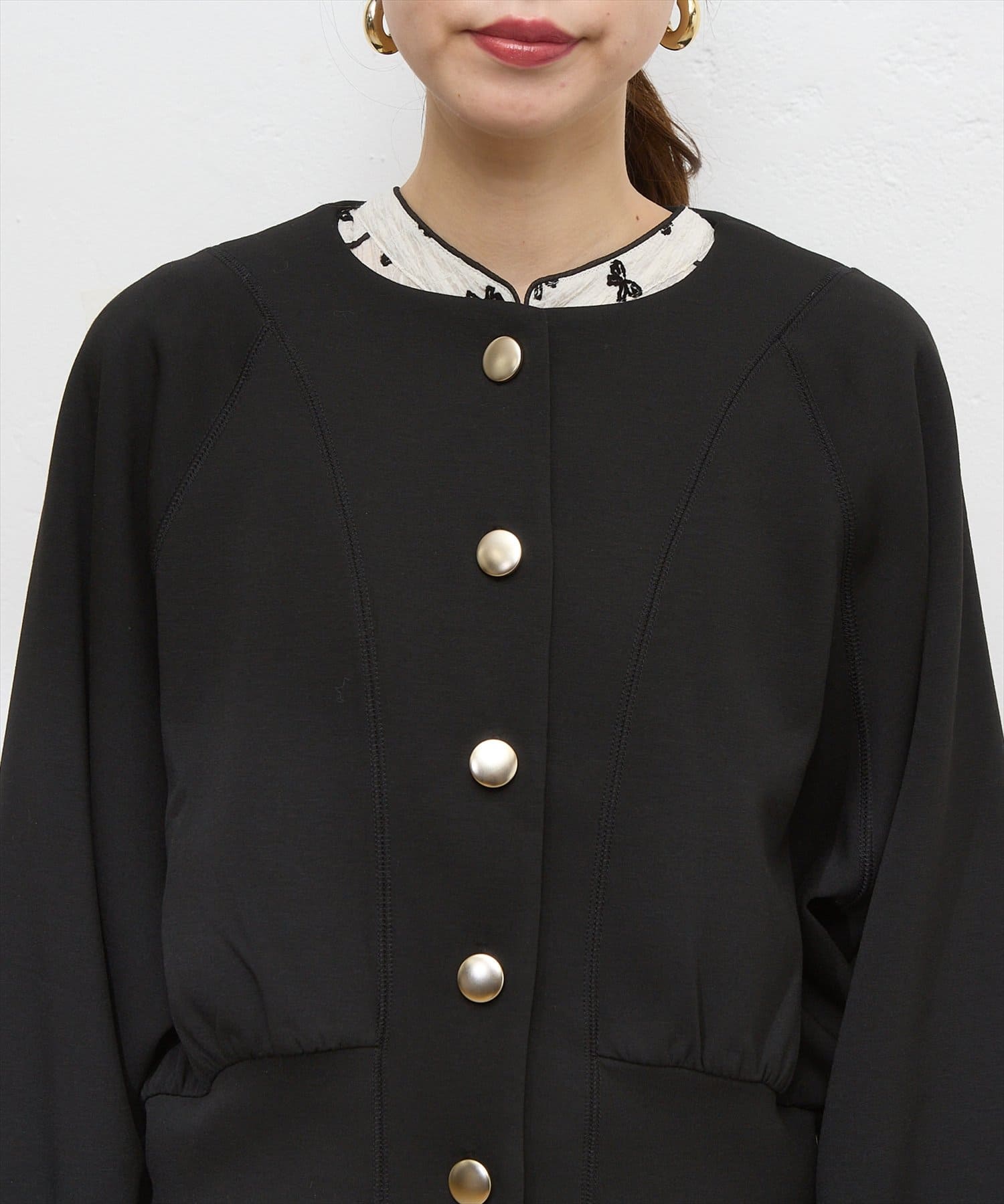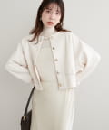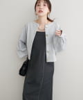 お顔周りがすっきりと見えるノーカラーデザインで、合わせるインナーのディティールを際立たせる1着。