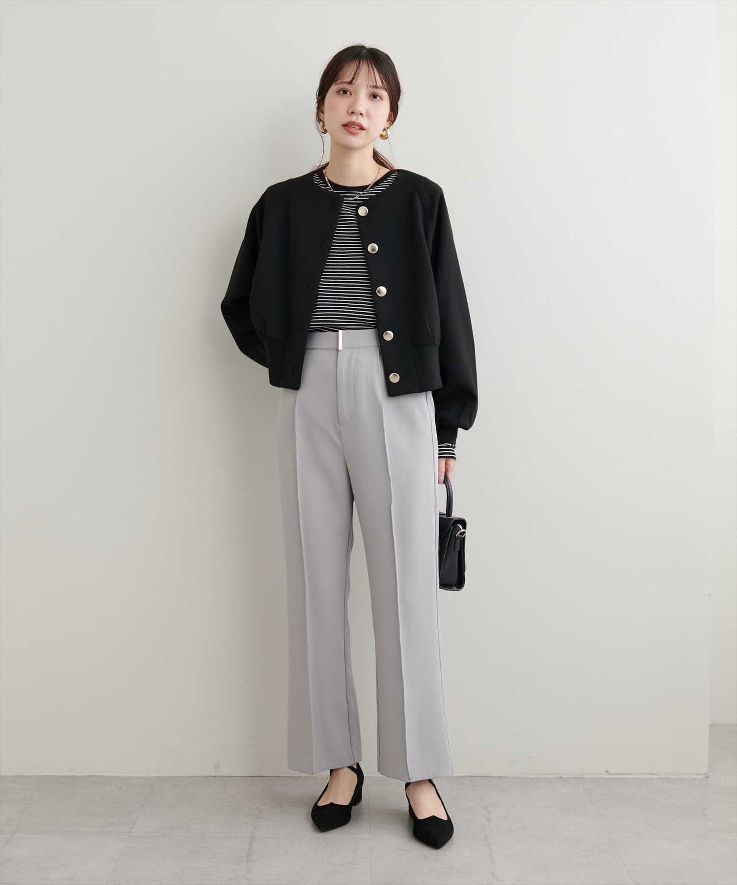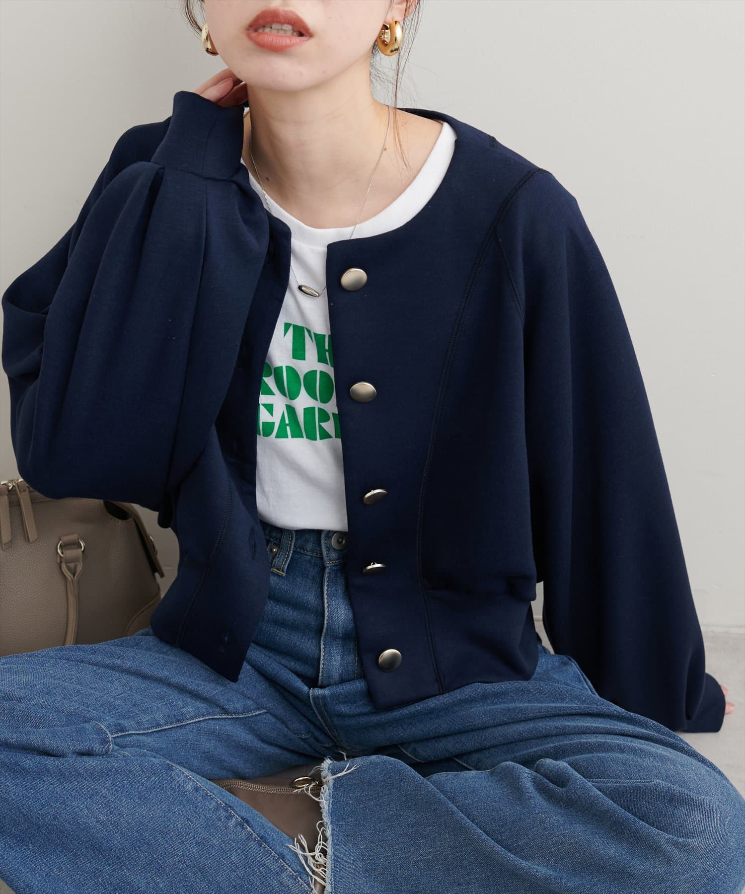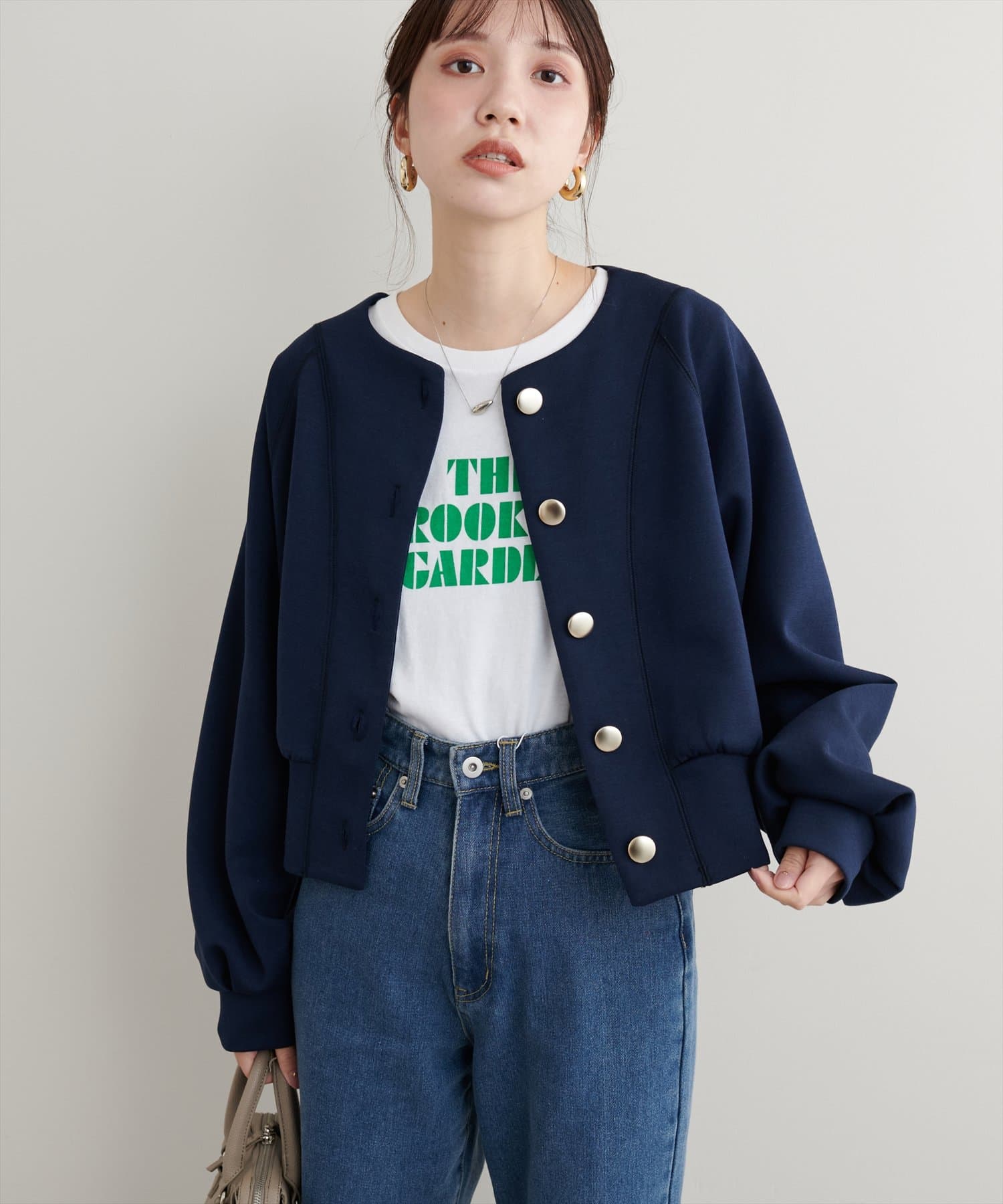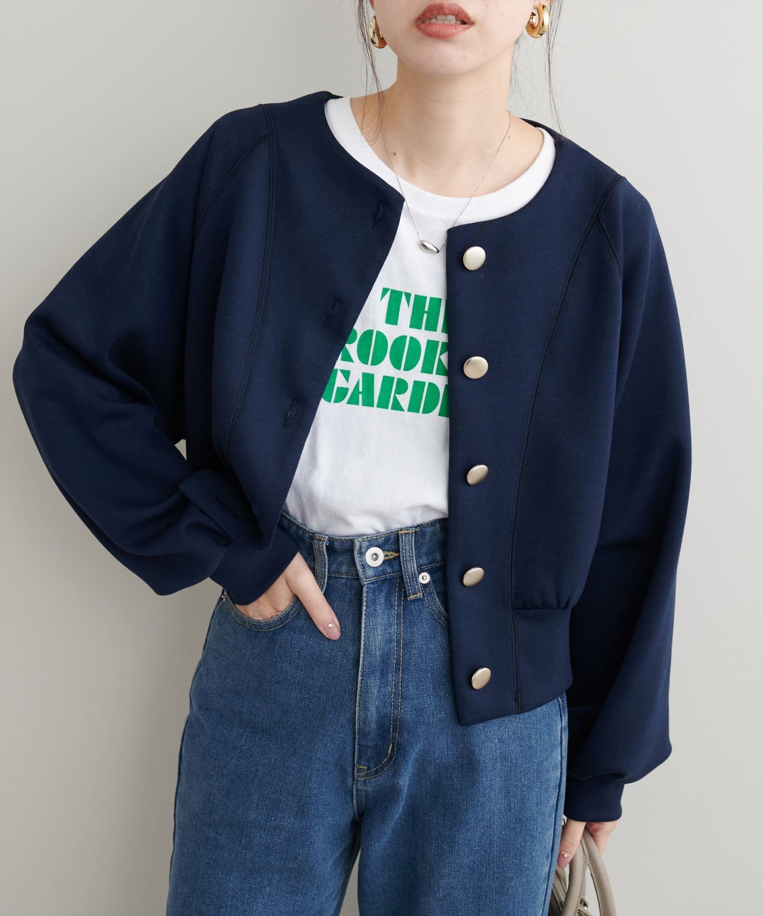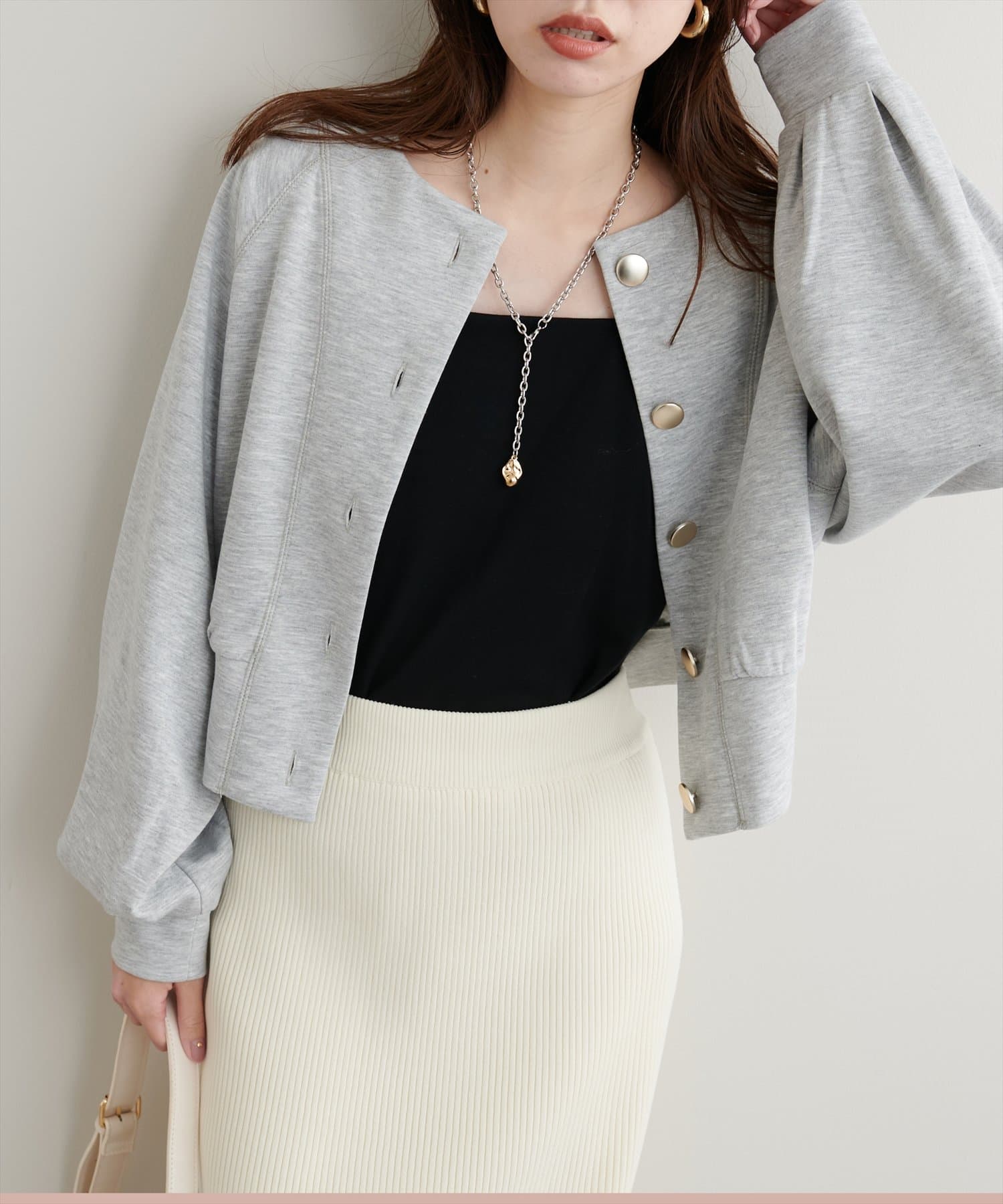 お顔周りがすっきりと見えるノーカラーデザインで、合わせるインナーのディティールを際立たせる1着。