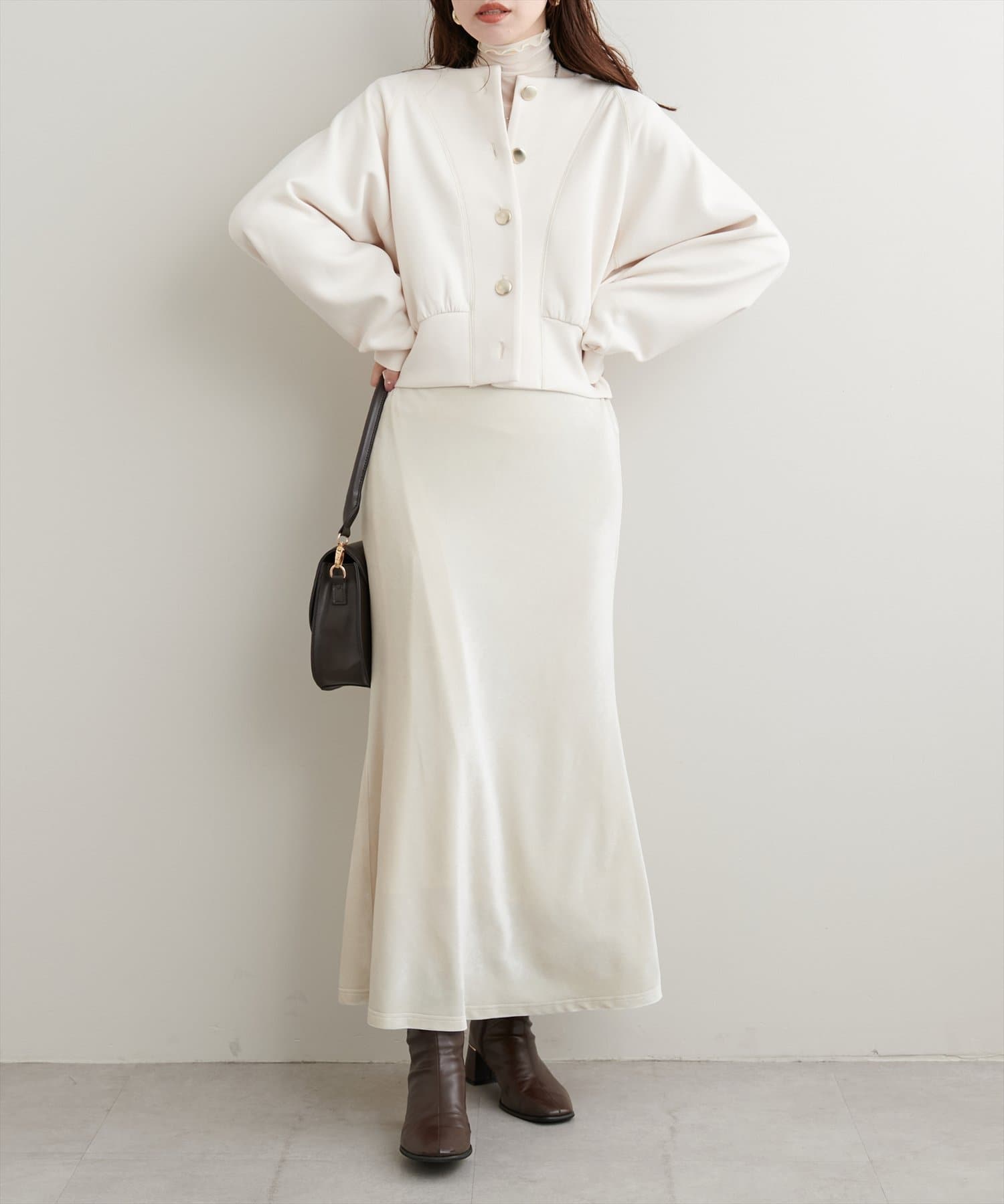 首元はすっきりとしたノーカラーなので、タートルネックトップスやハイネックトップスと合わせても◎