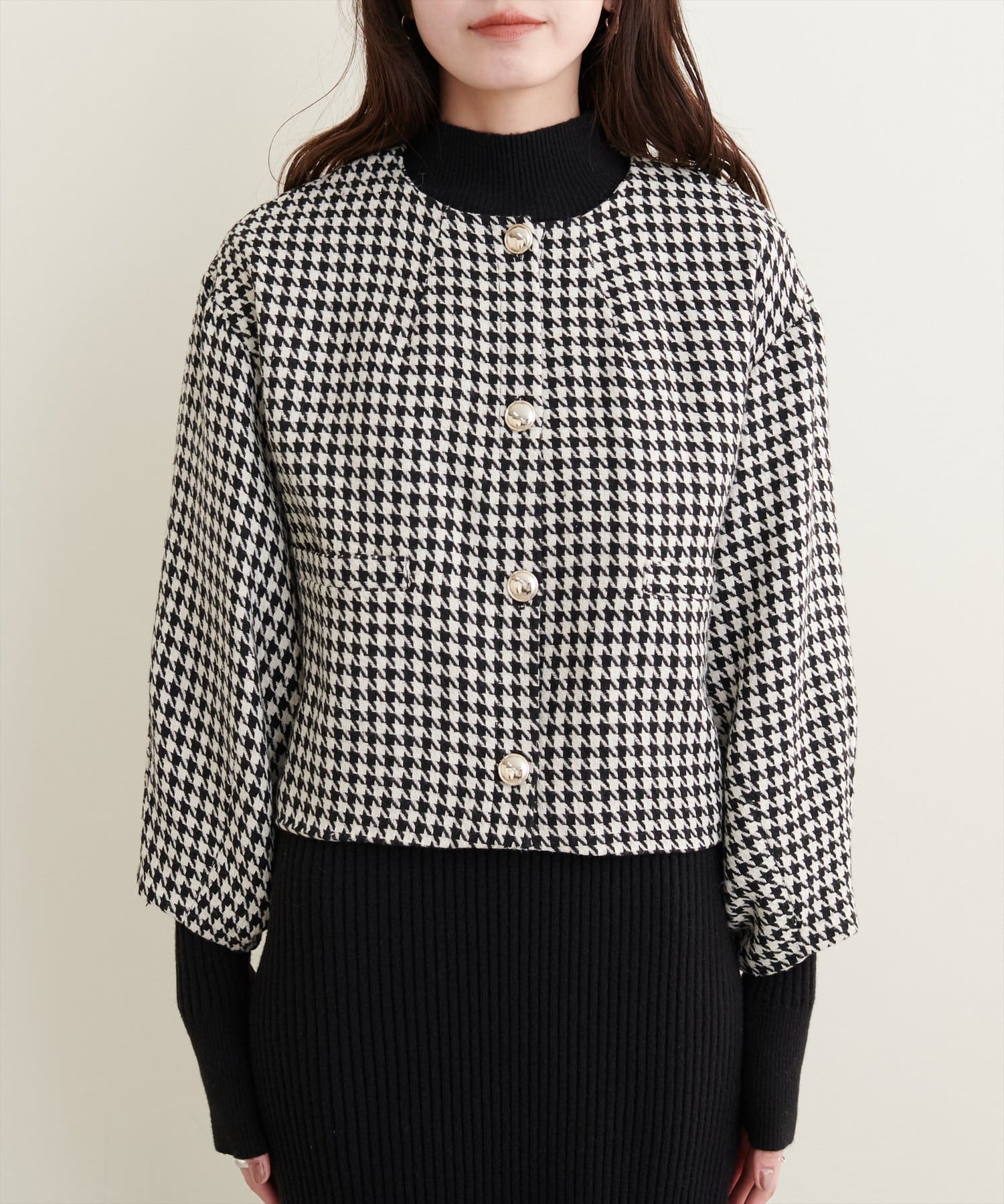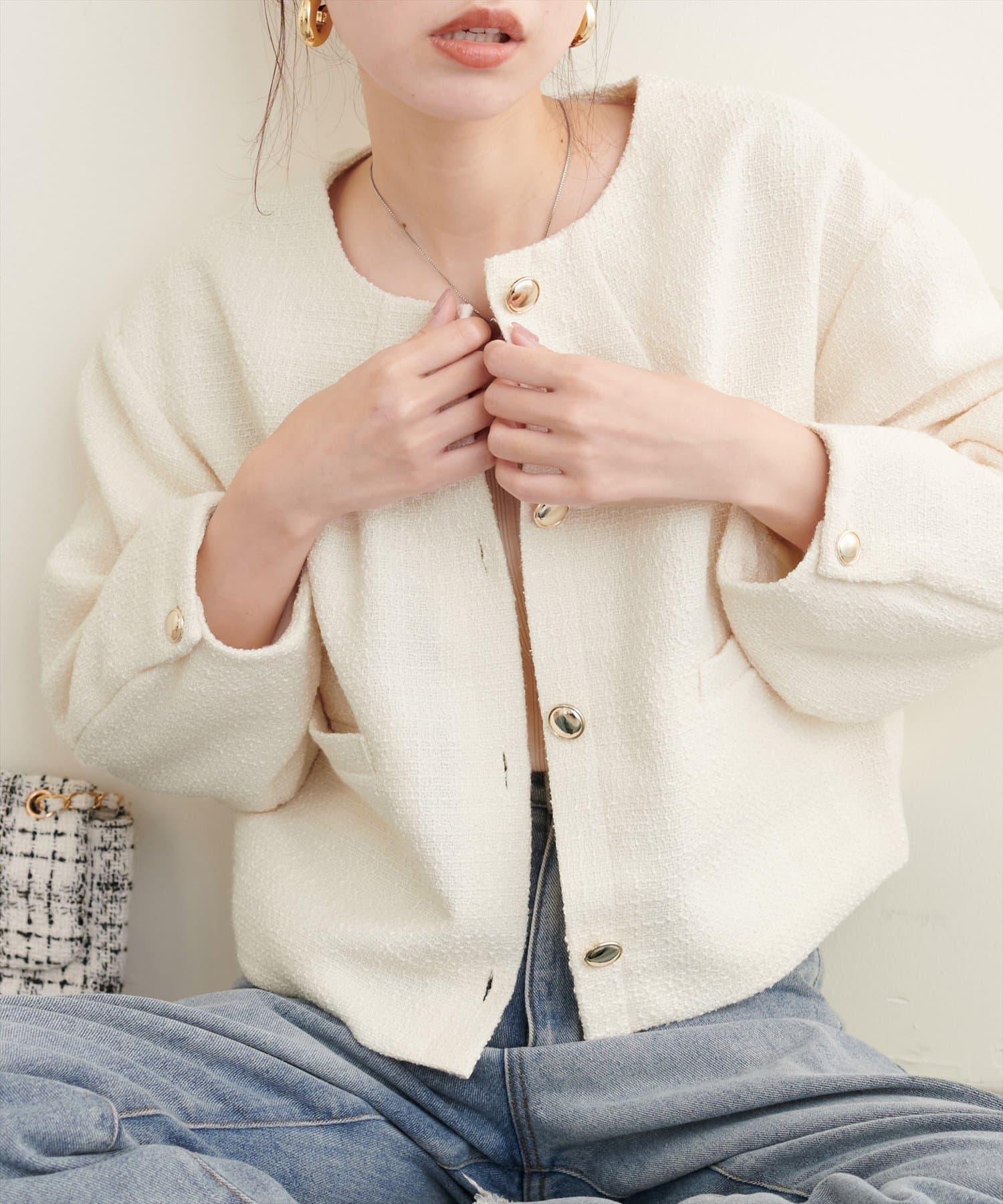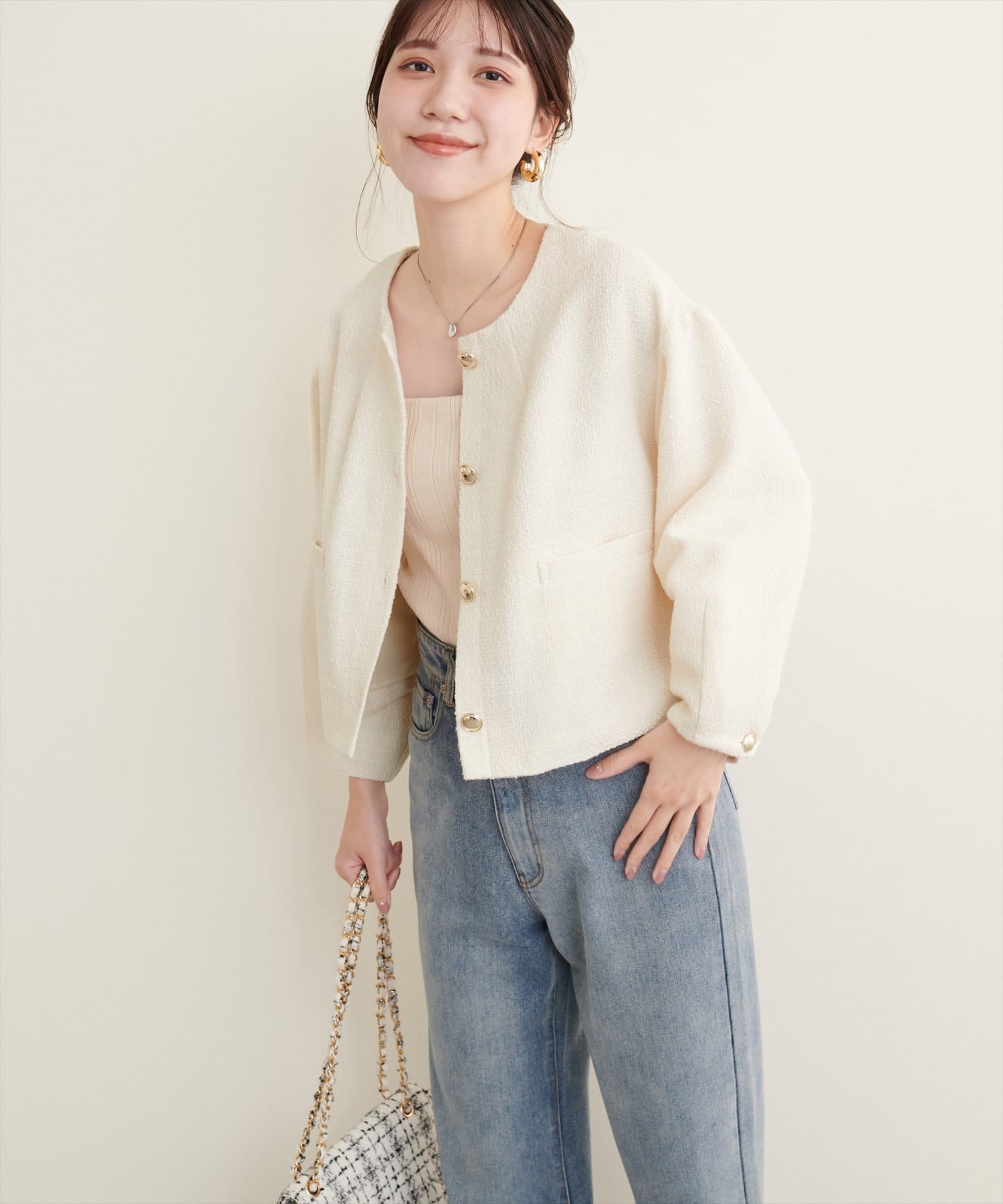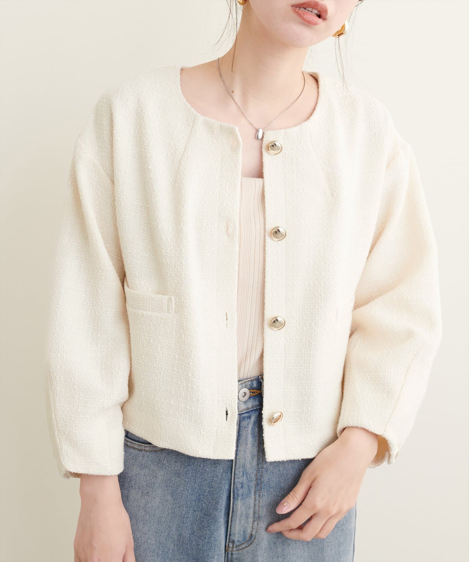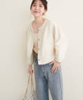 ノーカラーですっきり見えし、ショート丈でスタイルアップが叶う一枚です。