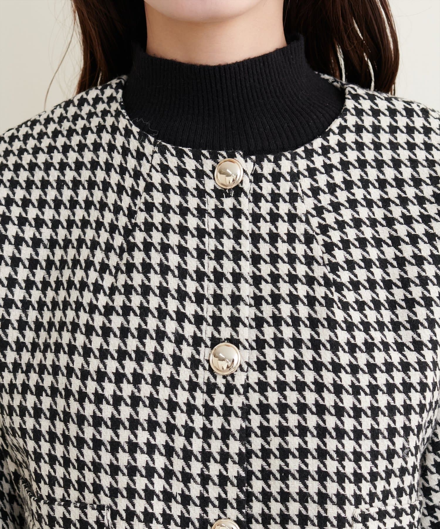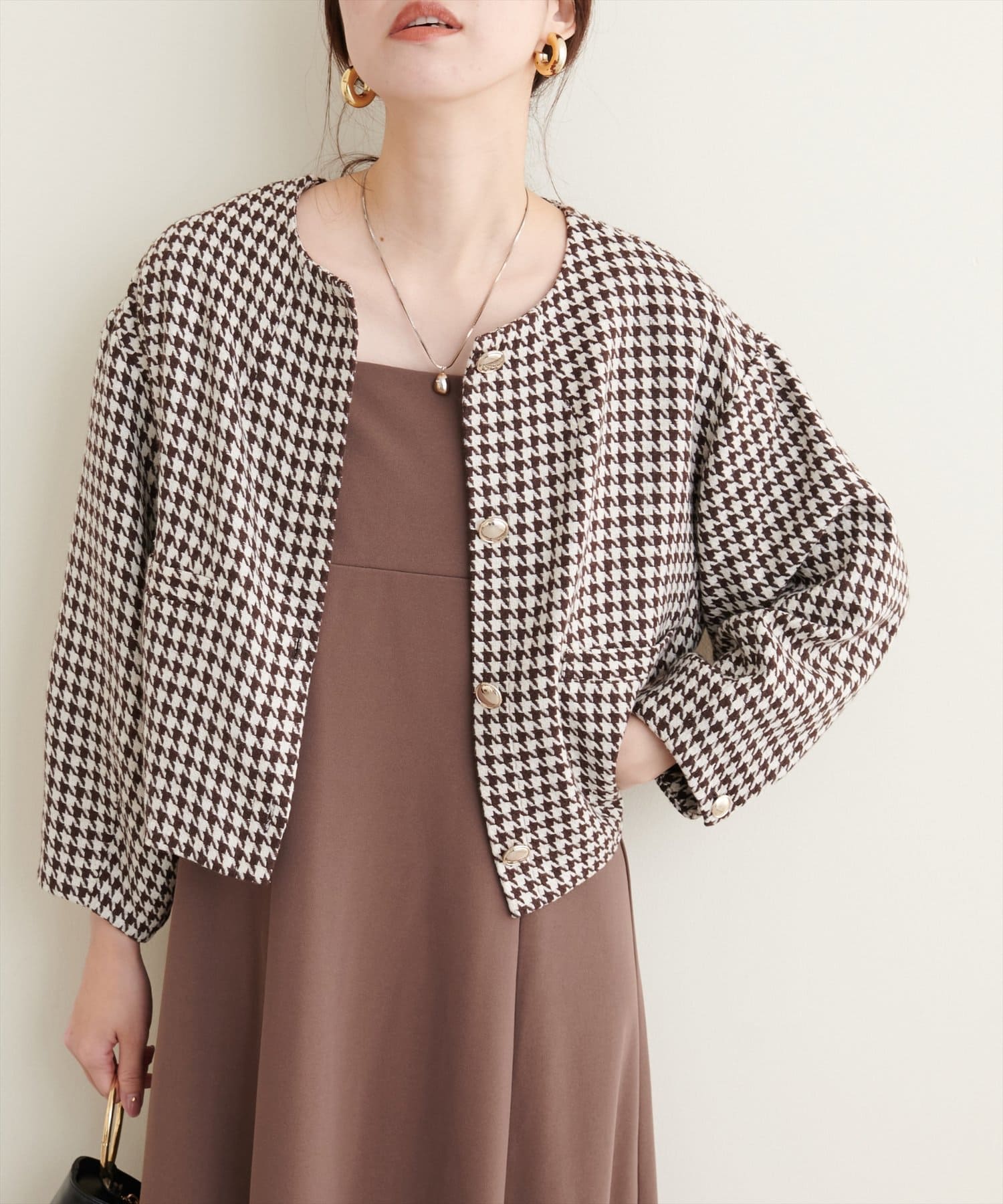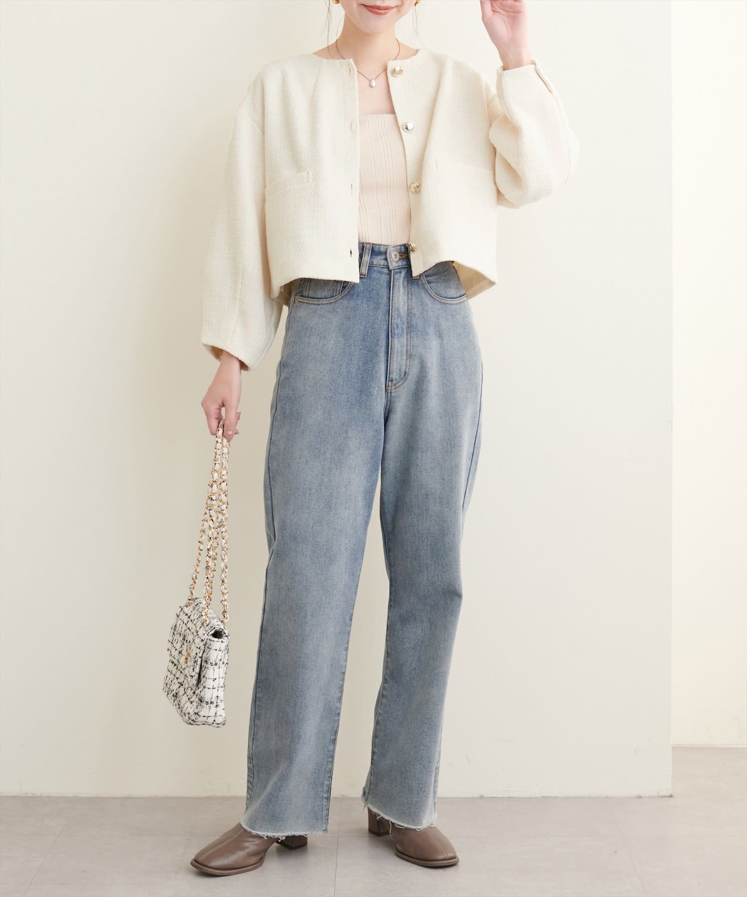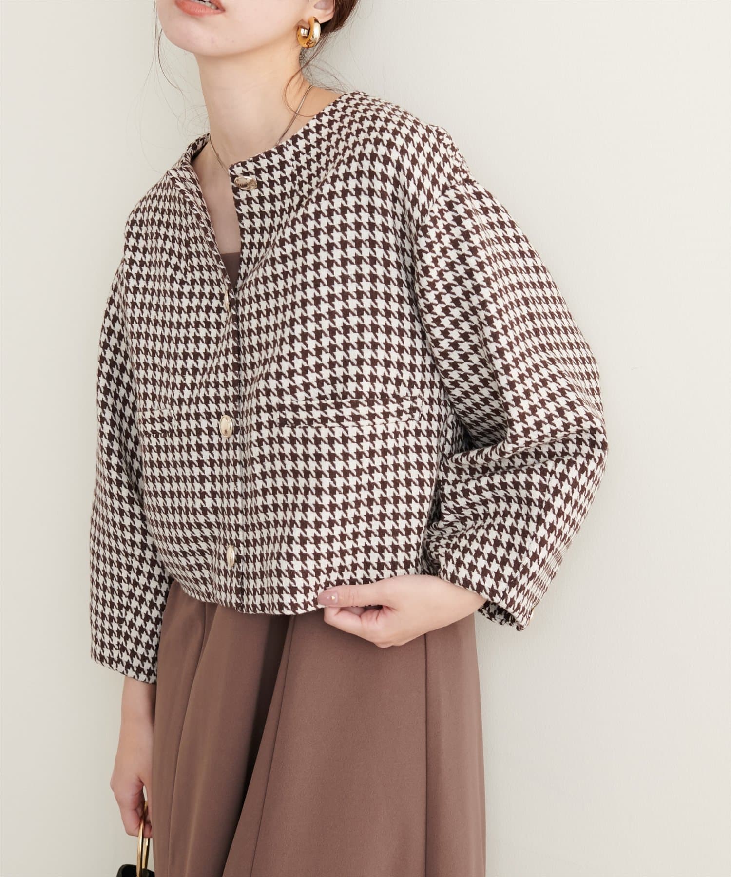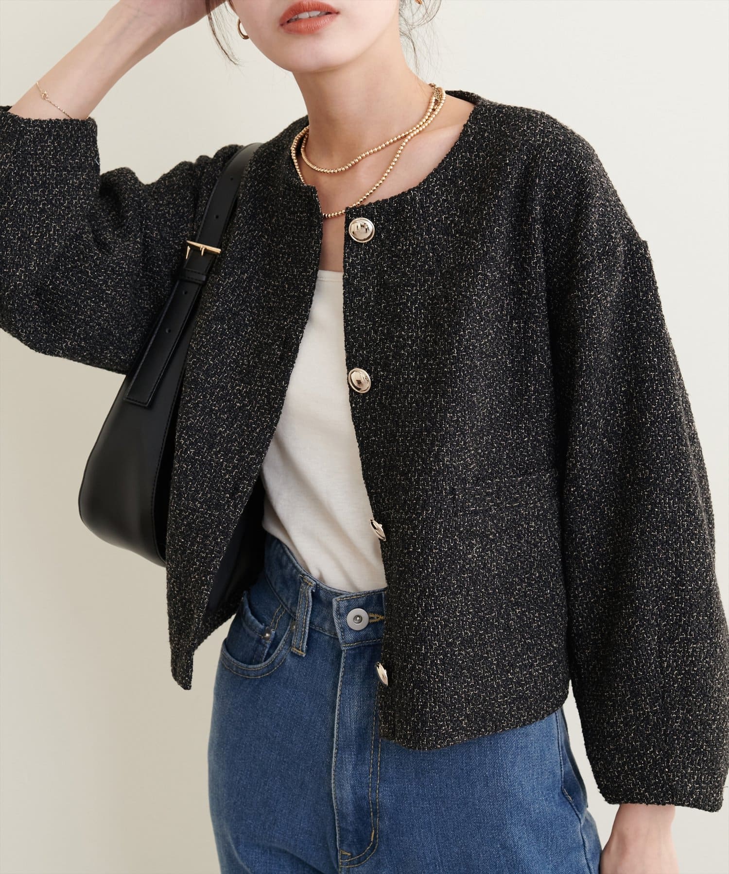 ノーカラーですっきり見えし、ショート丈でスタイルアップが叶う一枚です。