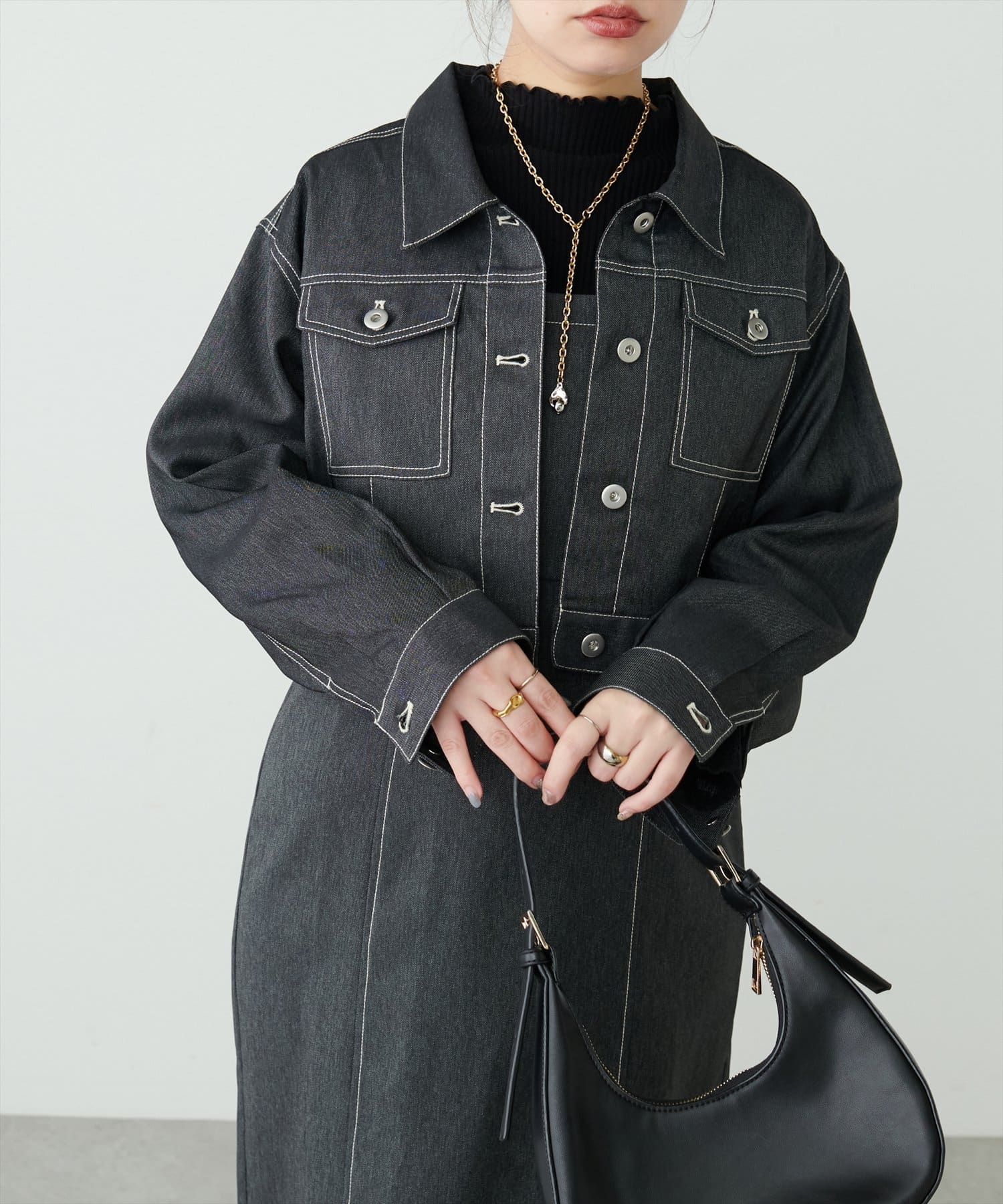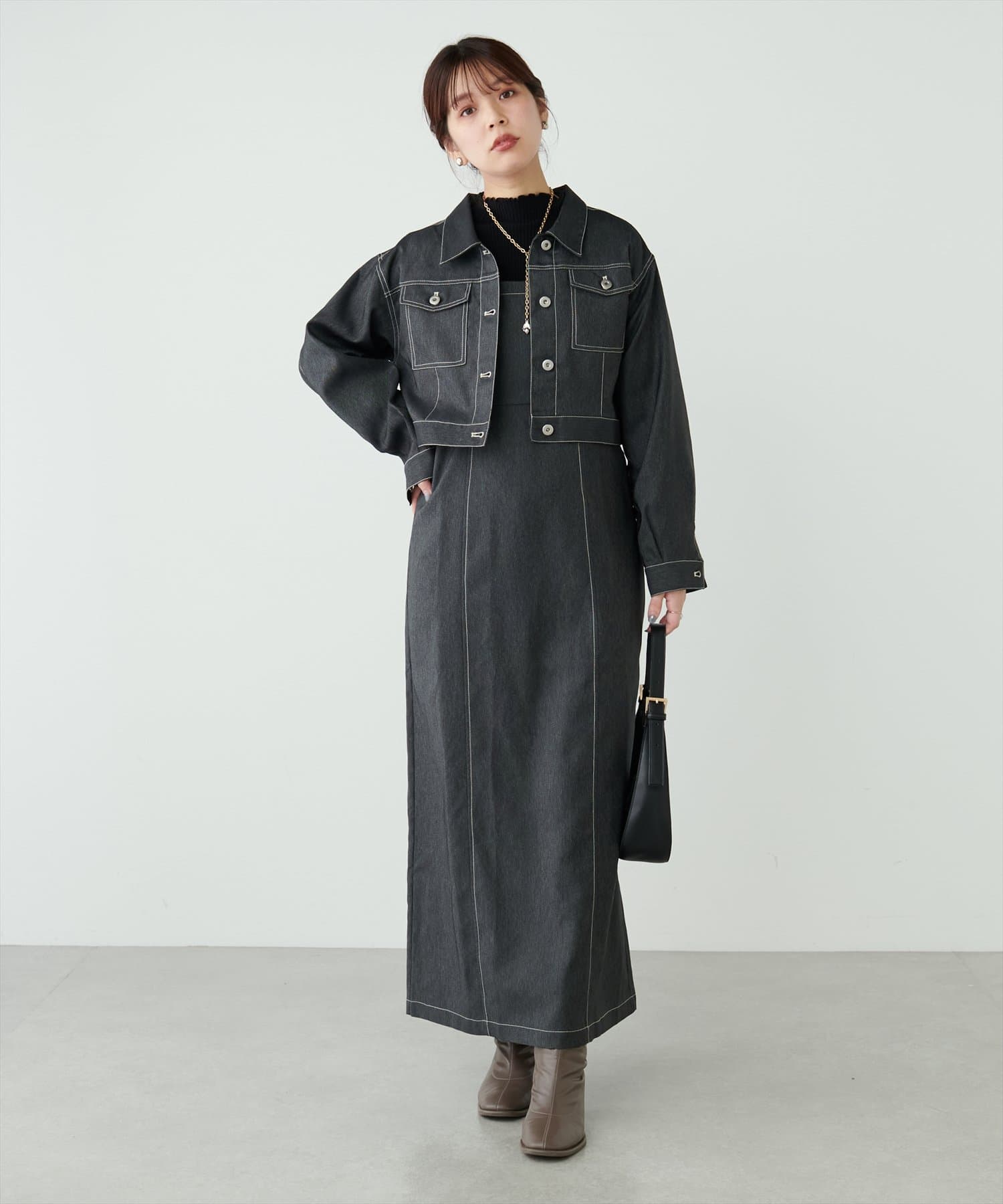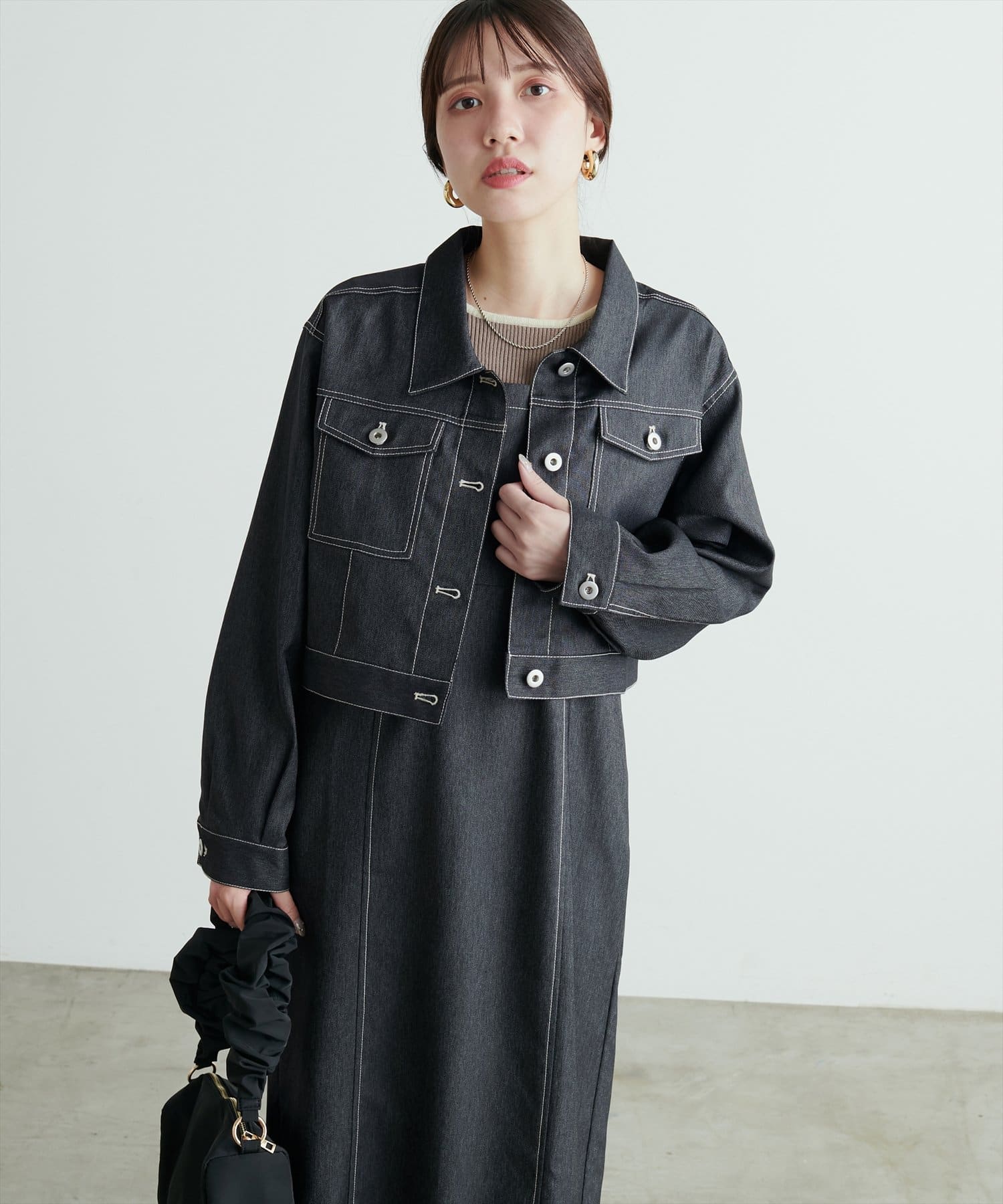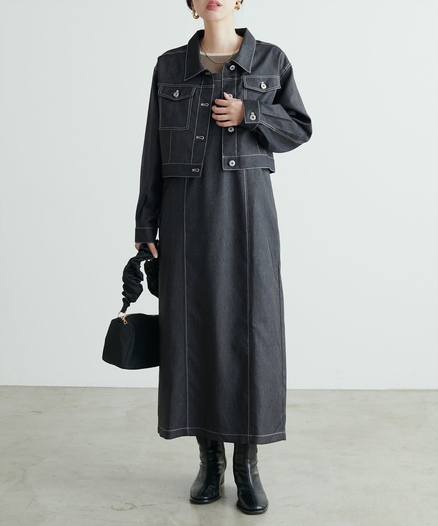 同素材のデニム風ビスチェキャミワンピースとセットでお召し頂くと、よりこなれた大人のおでかけスタイルが完成します。