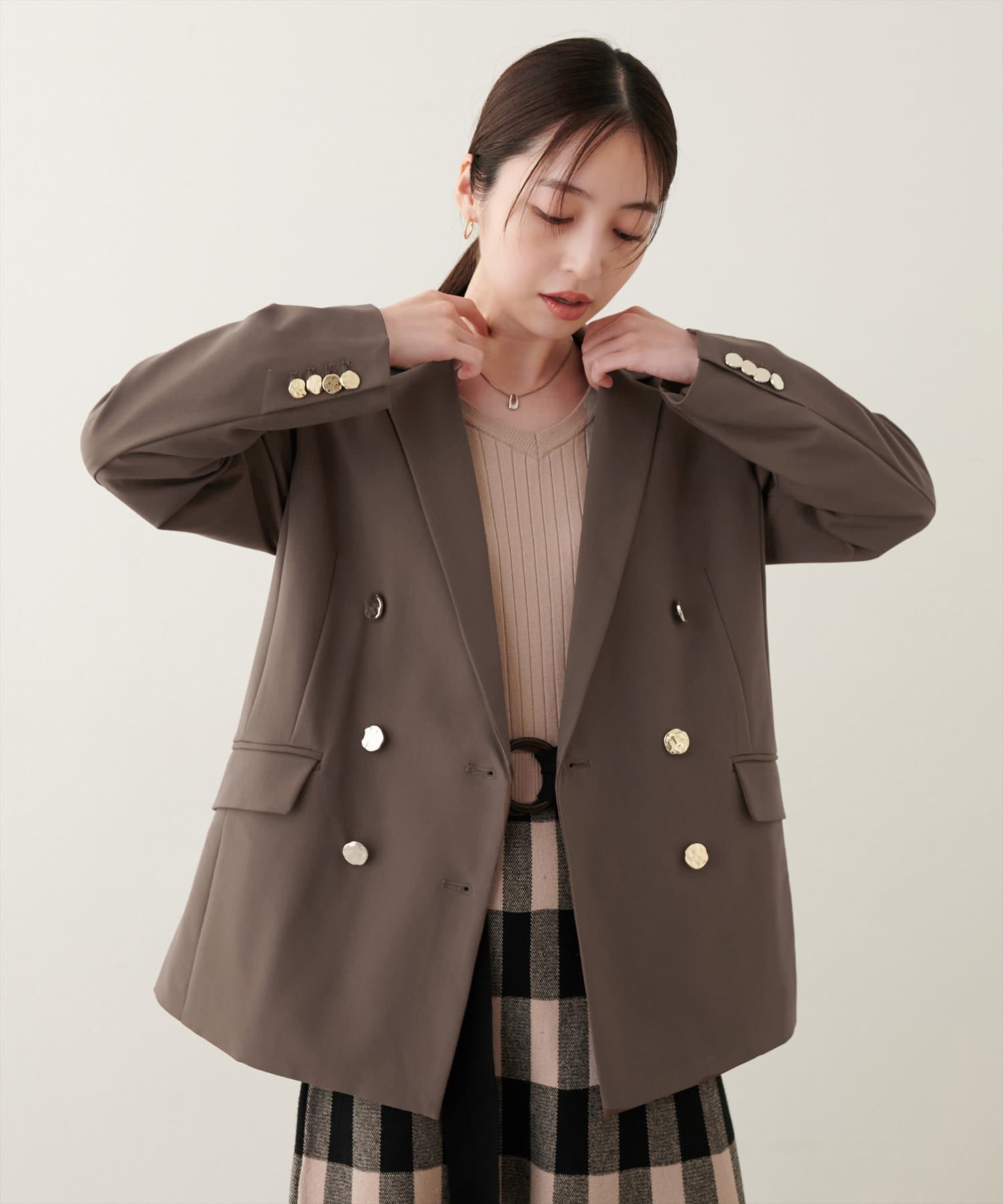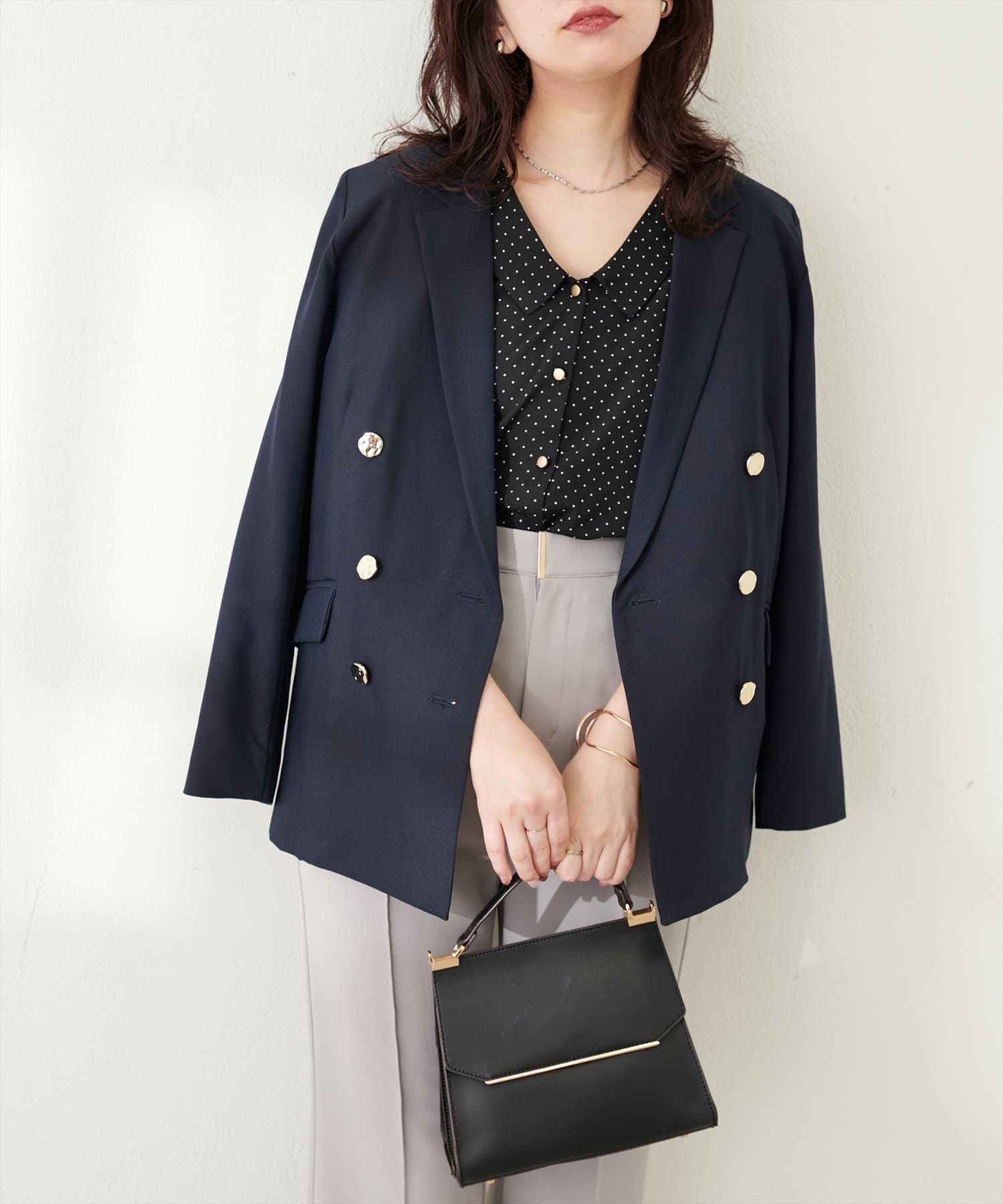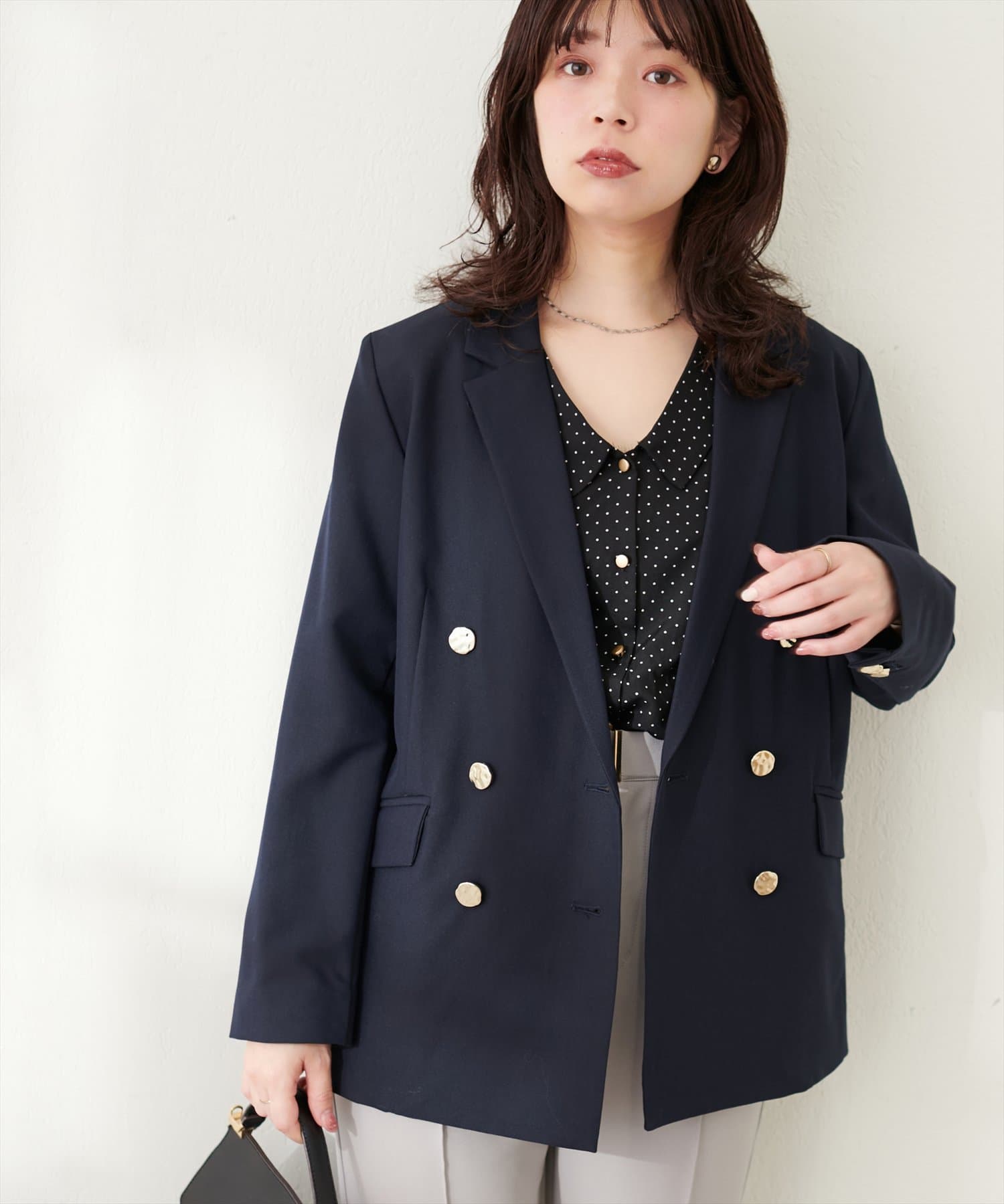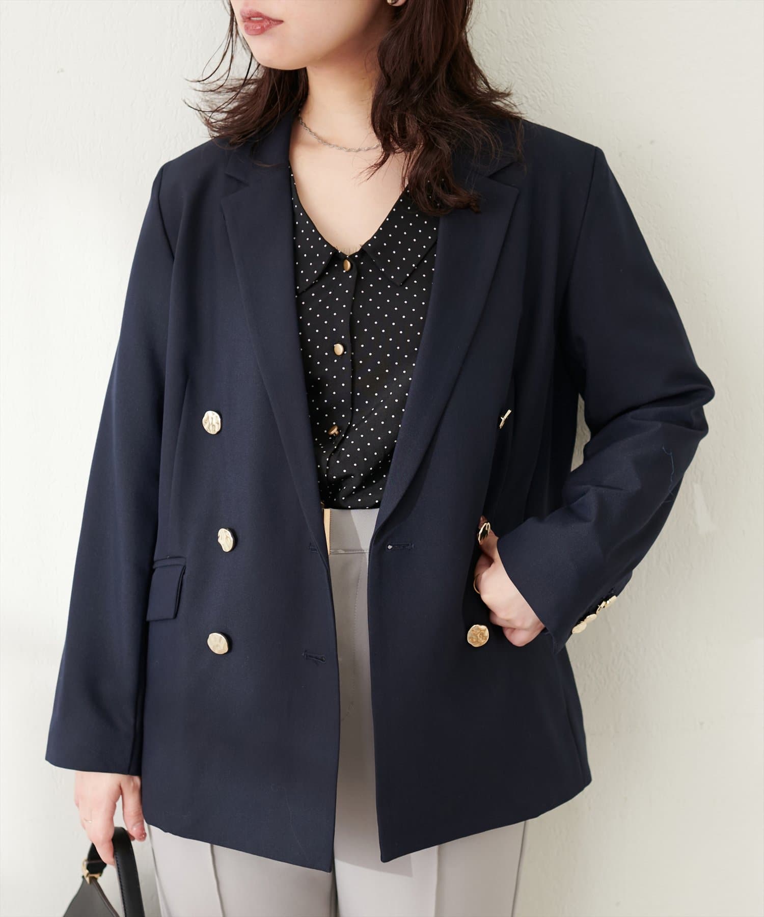 ゴールドの釦がアクセントになっており、ニュアンスのある上品な艶感がポイントに。