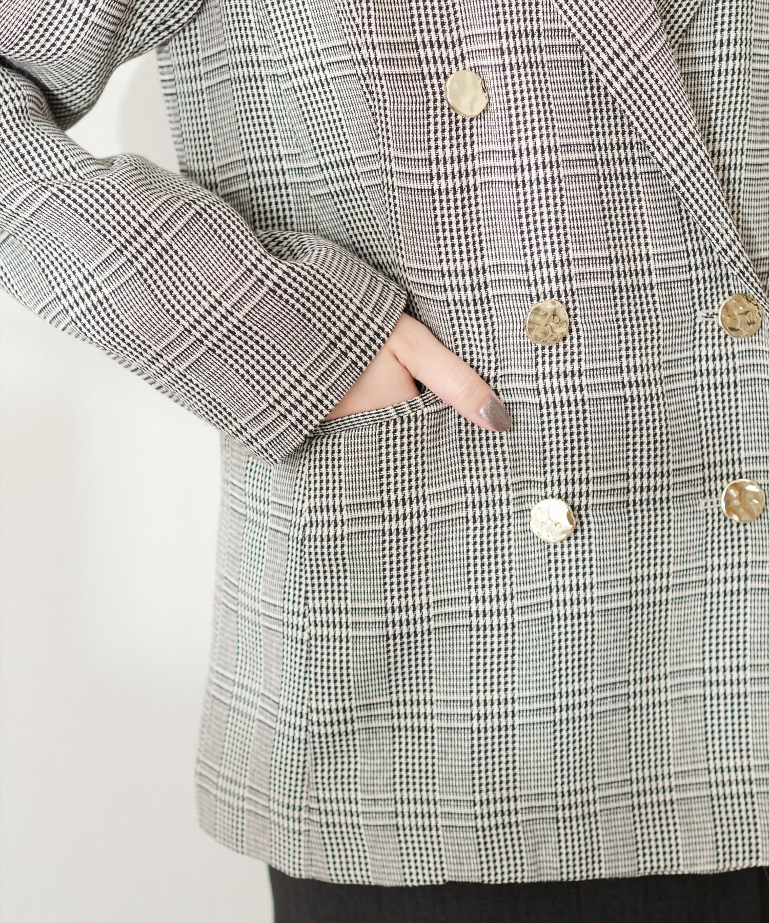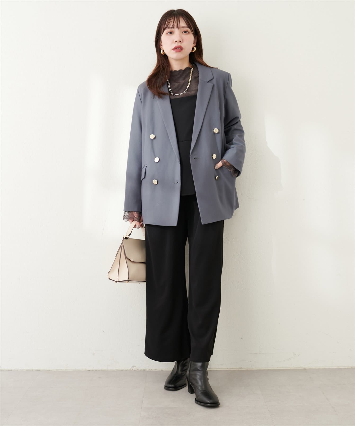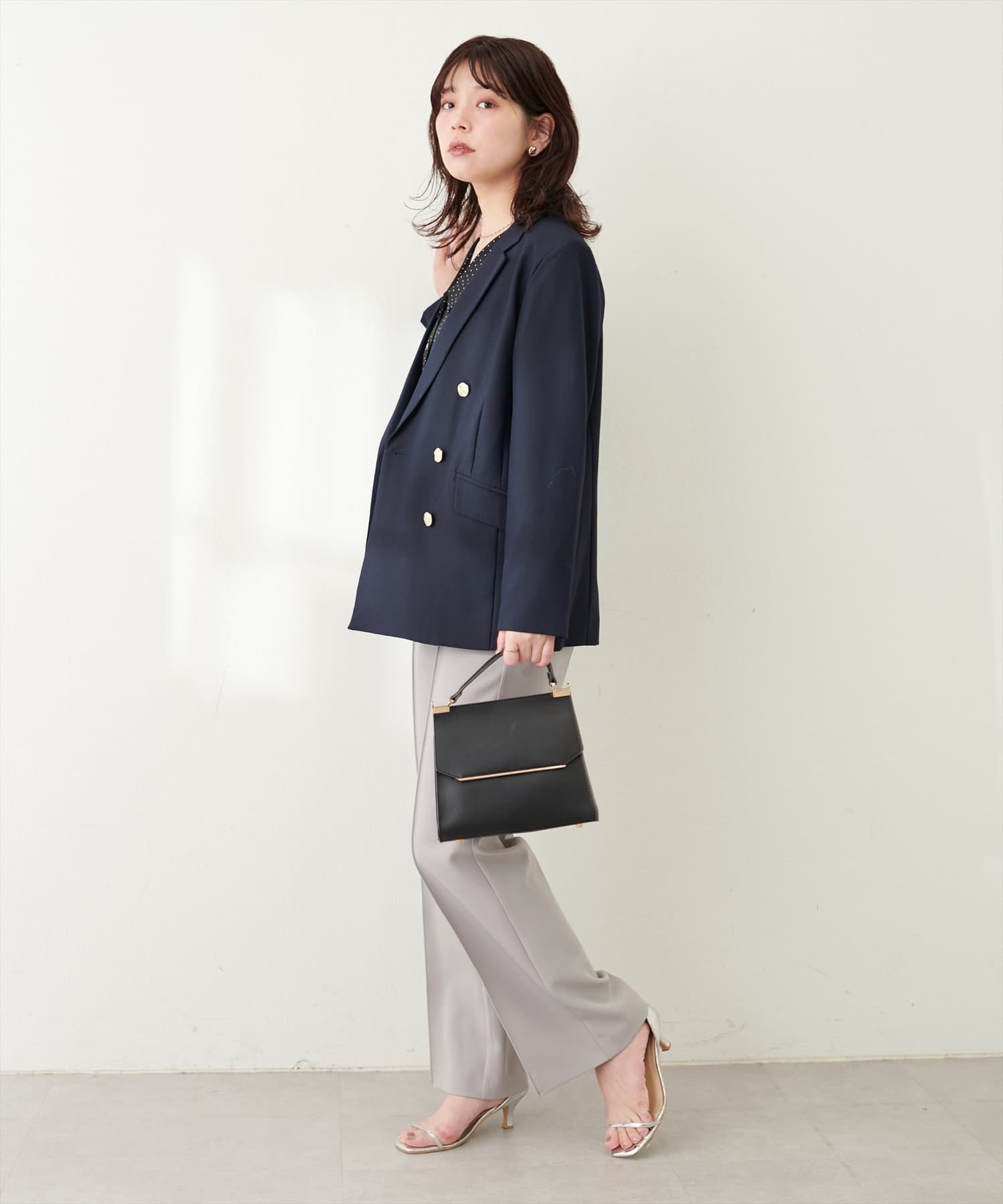 ゴールドの釦がアクセントになっており、ニュアンスのある上品な艶感がポイントに。