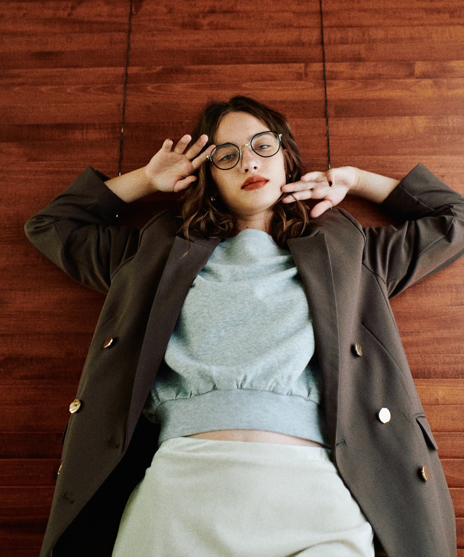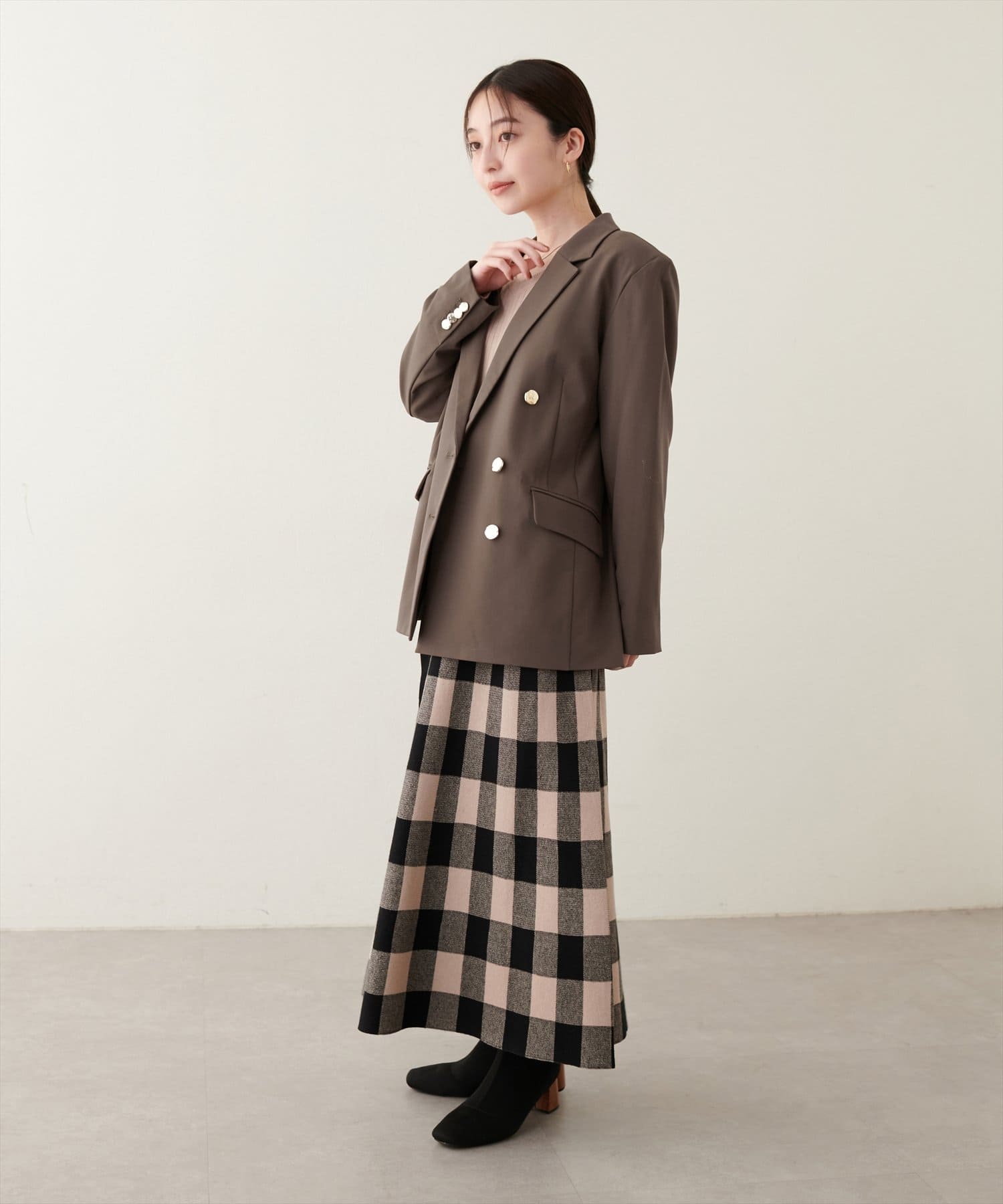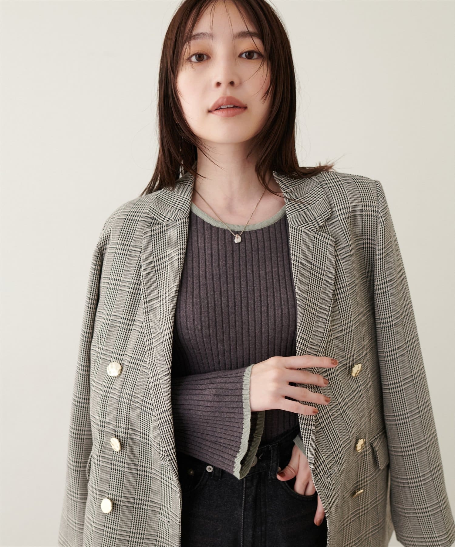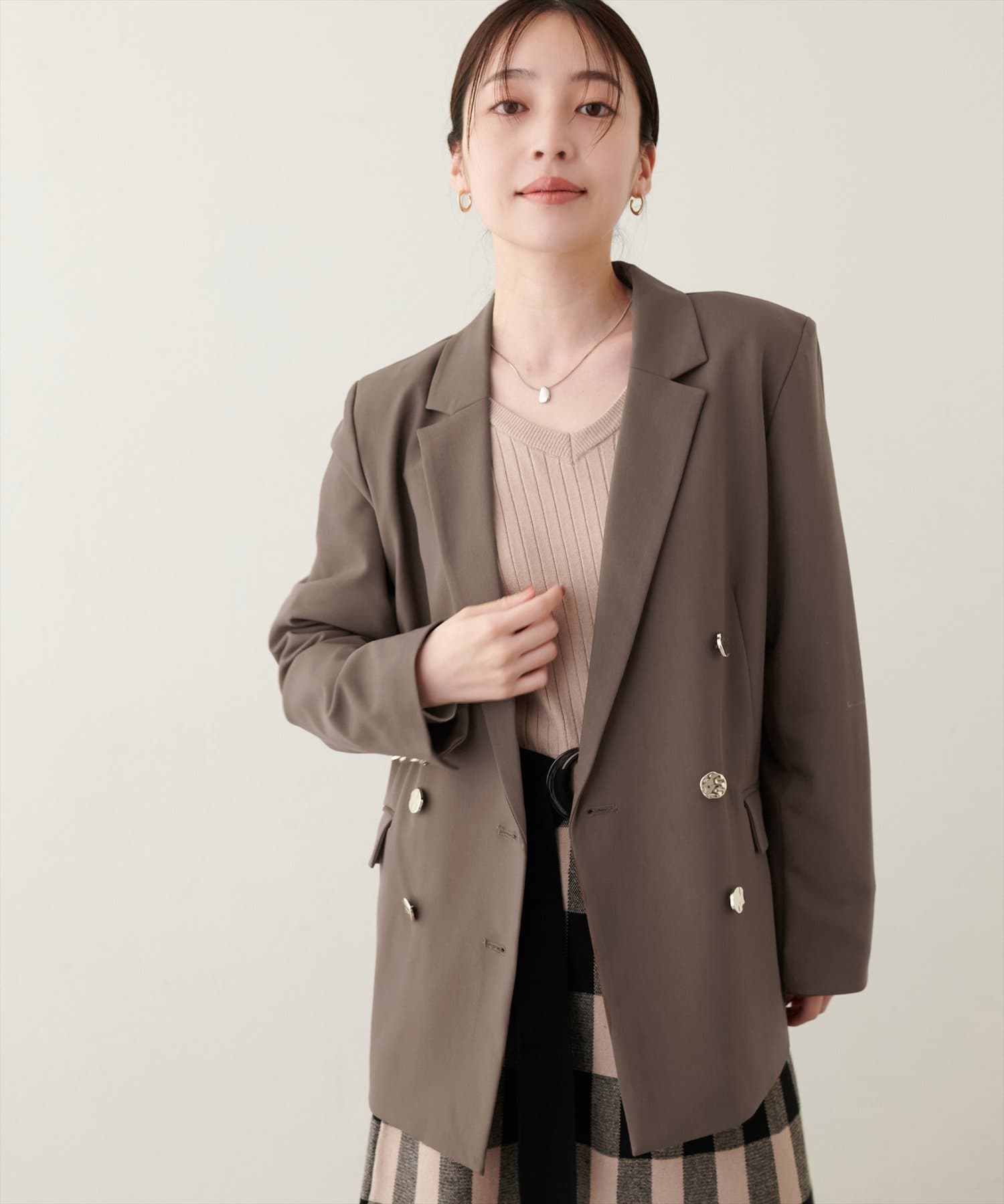 ゴールドの釦がアクセントになっており、ニュアンスのある上品な艶感がポイントに。