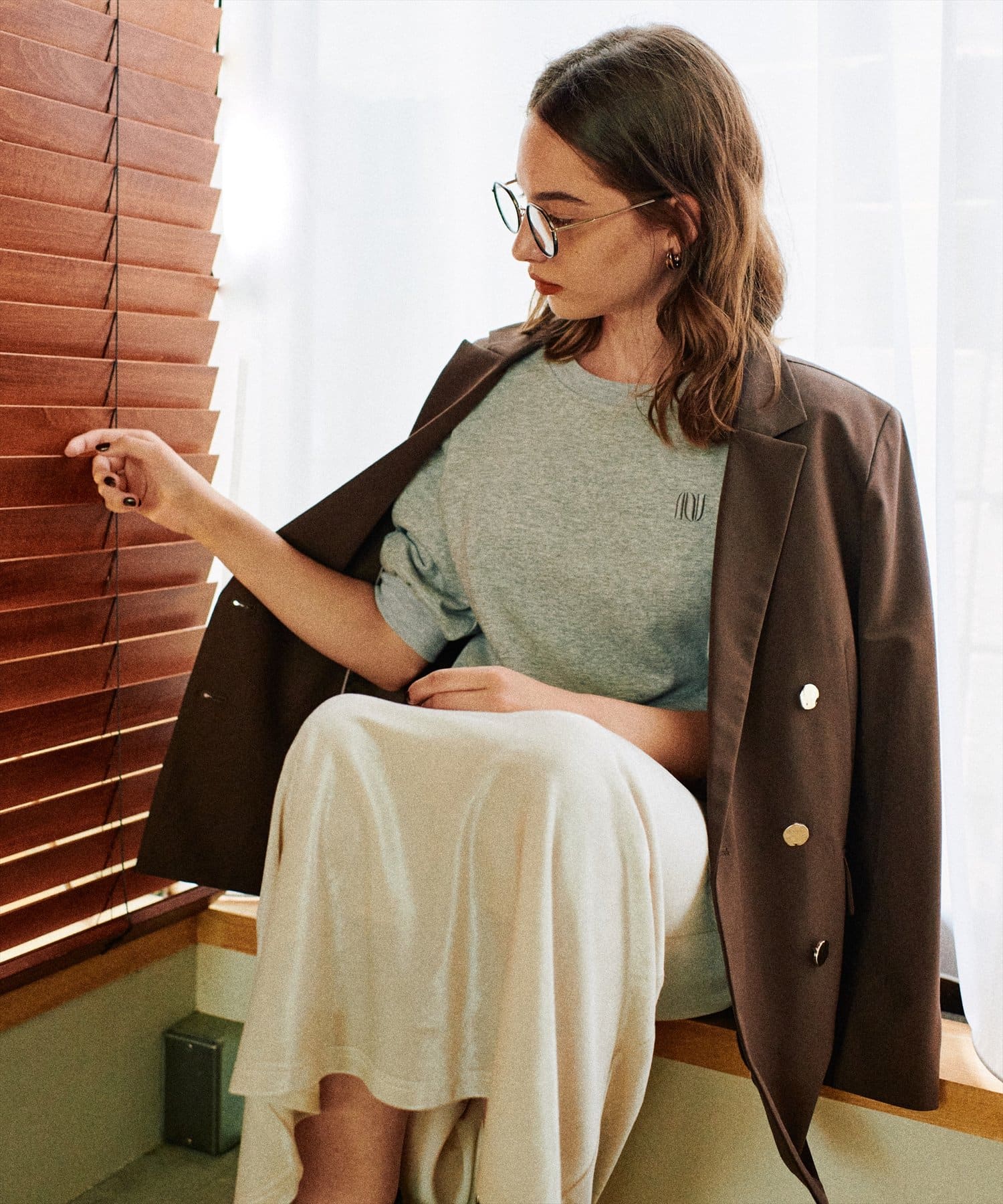 羽織るだけでカチっとした印象にきまるので、インナーにはロゴTなどカジュアルなアイテムを仕込むとラフさがプラスされておすすめ。