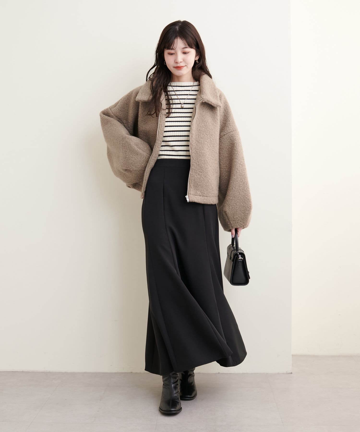 ボリュームのあるアウターなので、ナロースカートやIラインシルエットですっきり見えもおすすめです。