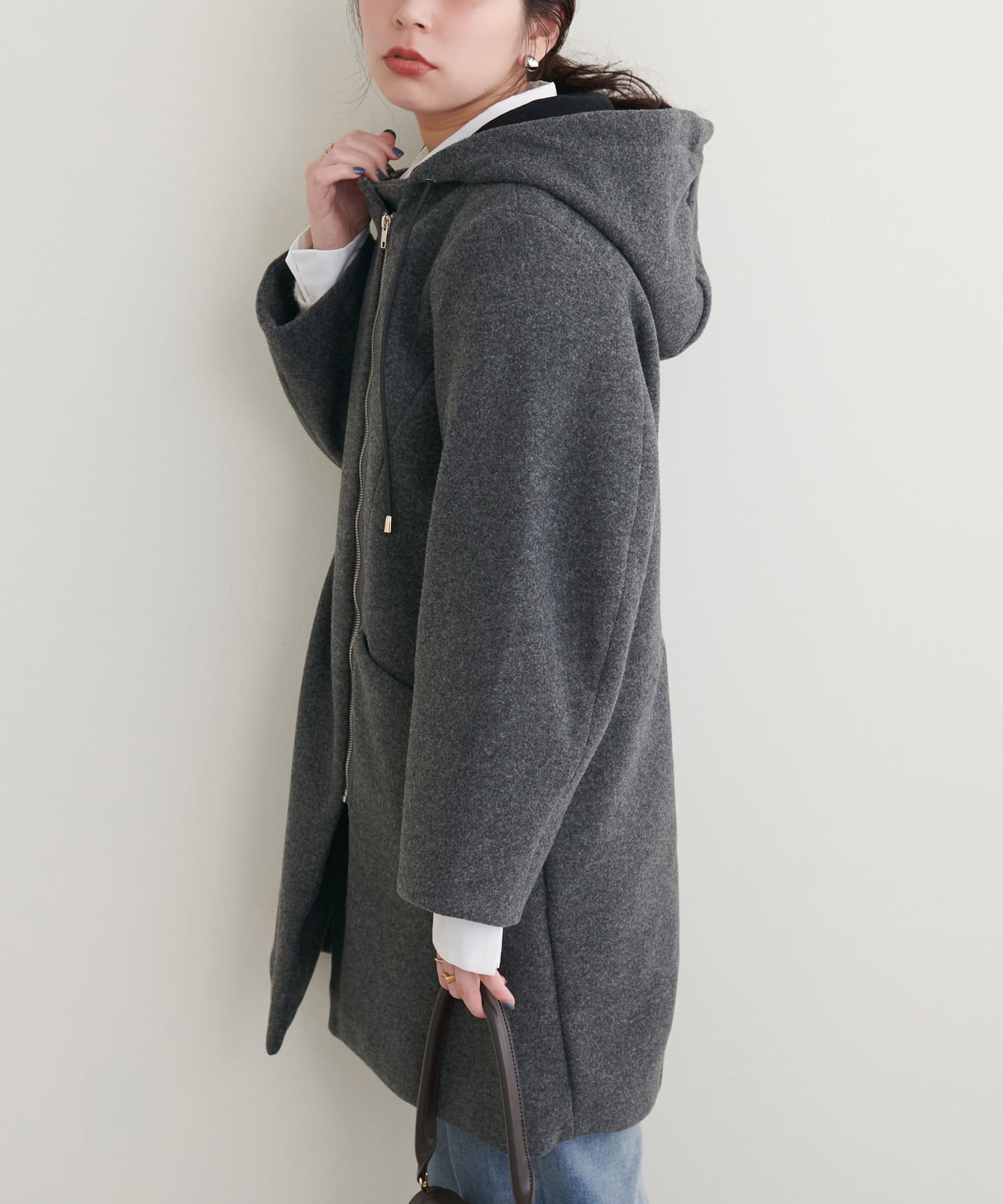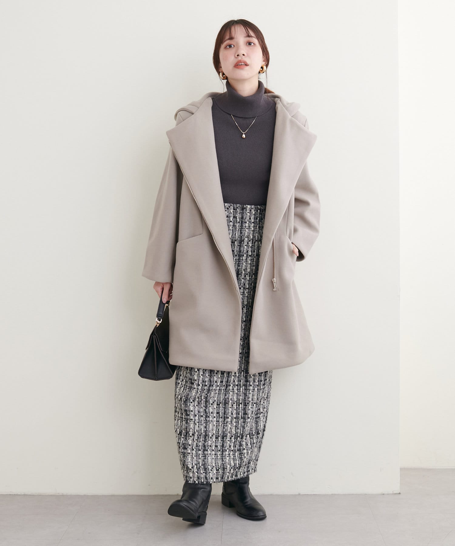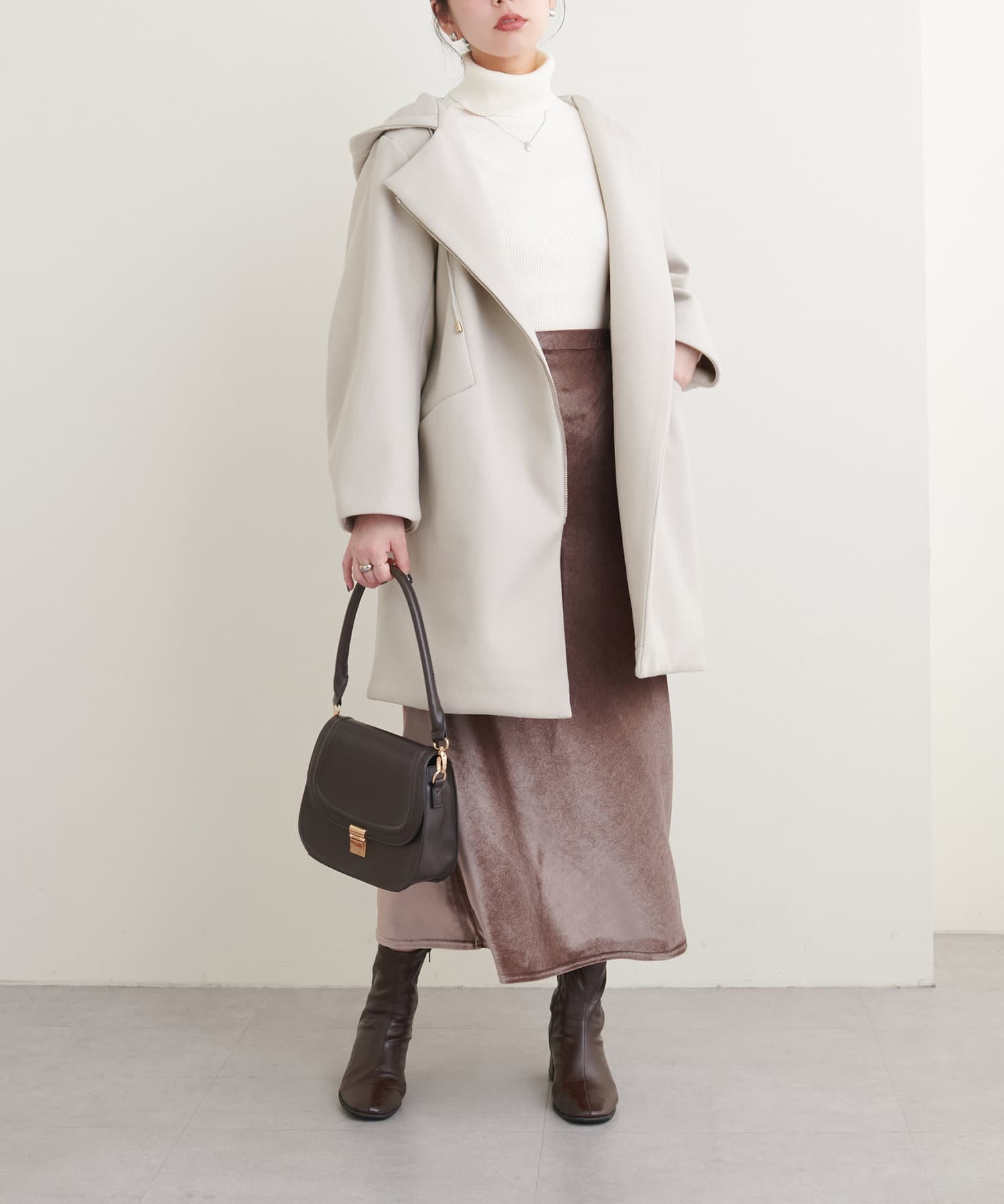 滑らかな肌触りで保温性も高いミドル丈コート。