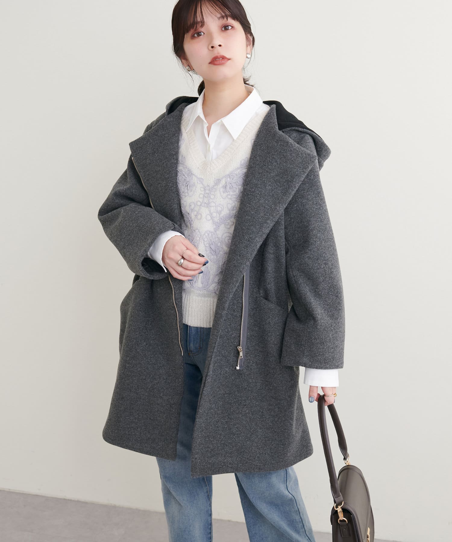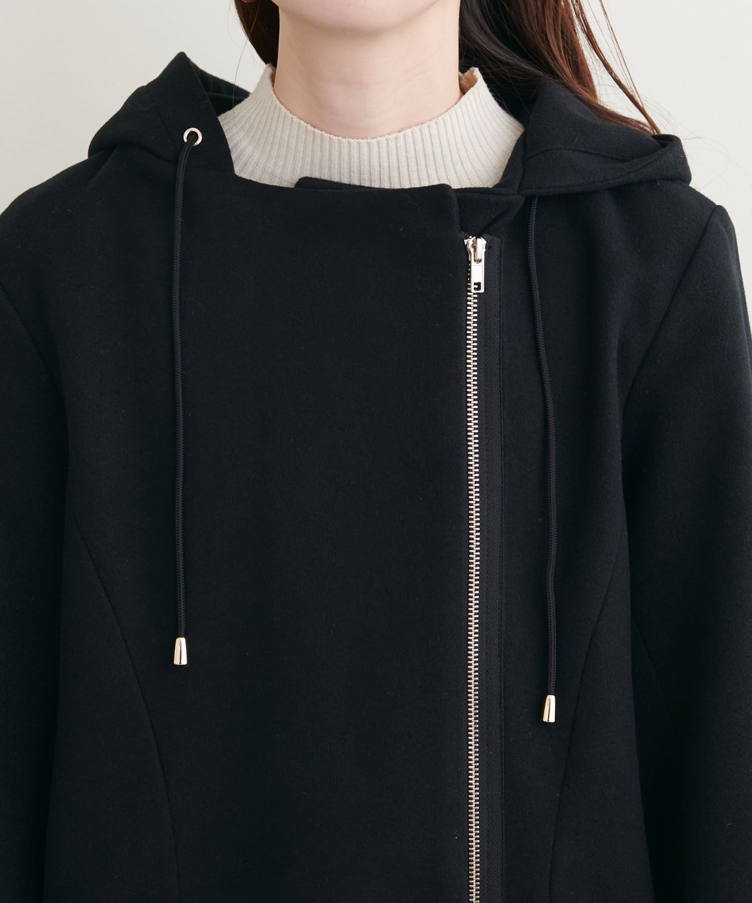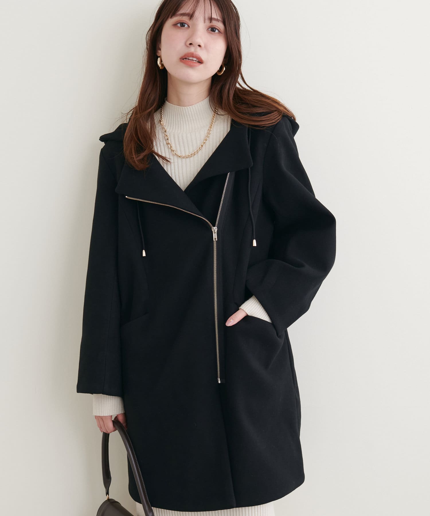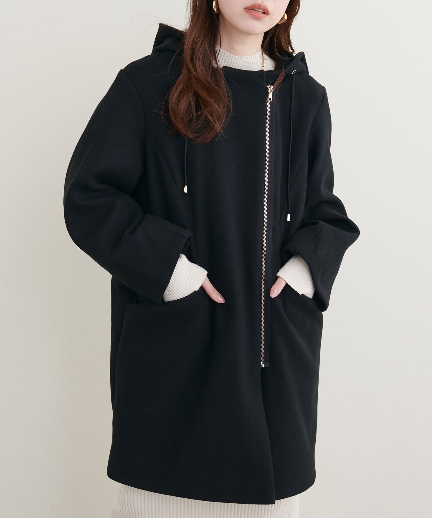 ジップを閉めればフーディを生かした可愛らしい印象になる