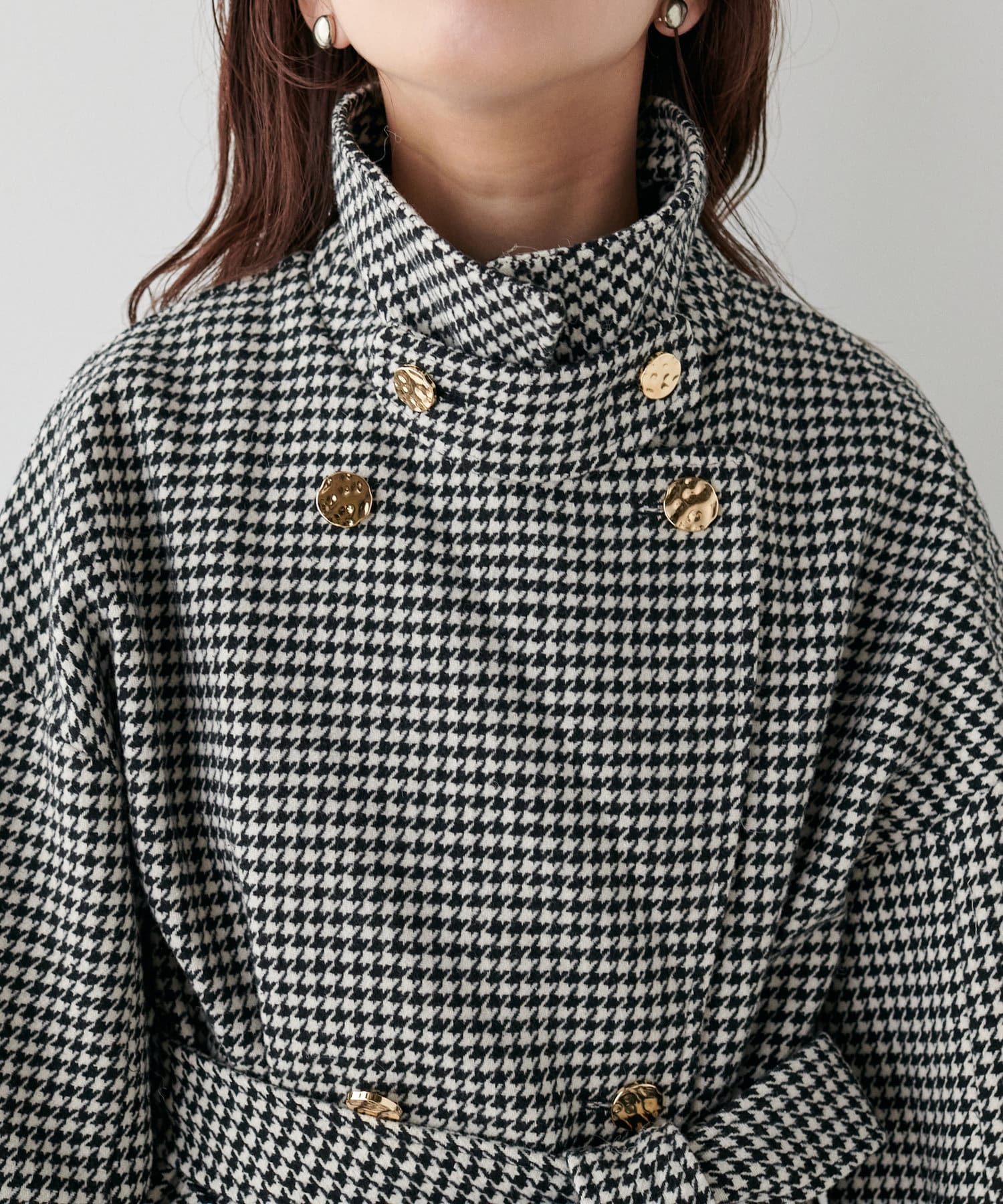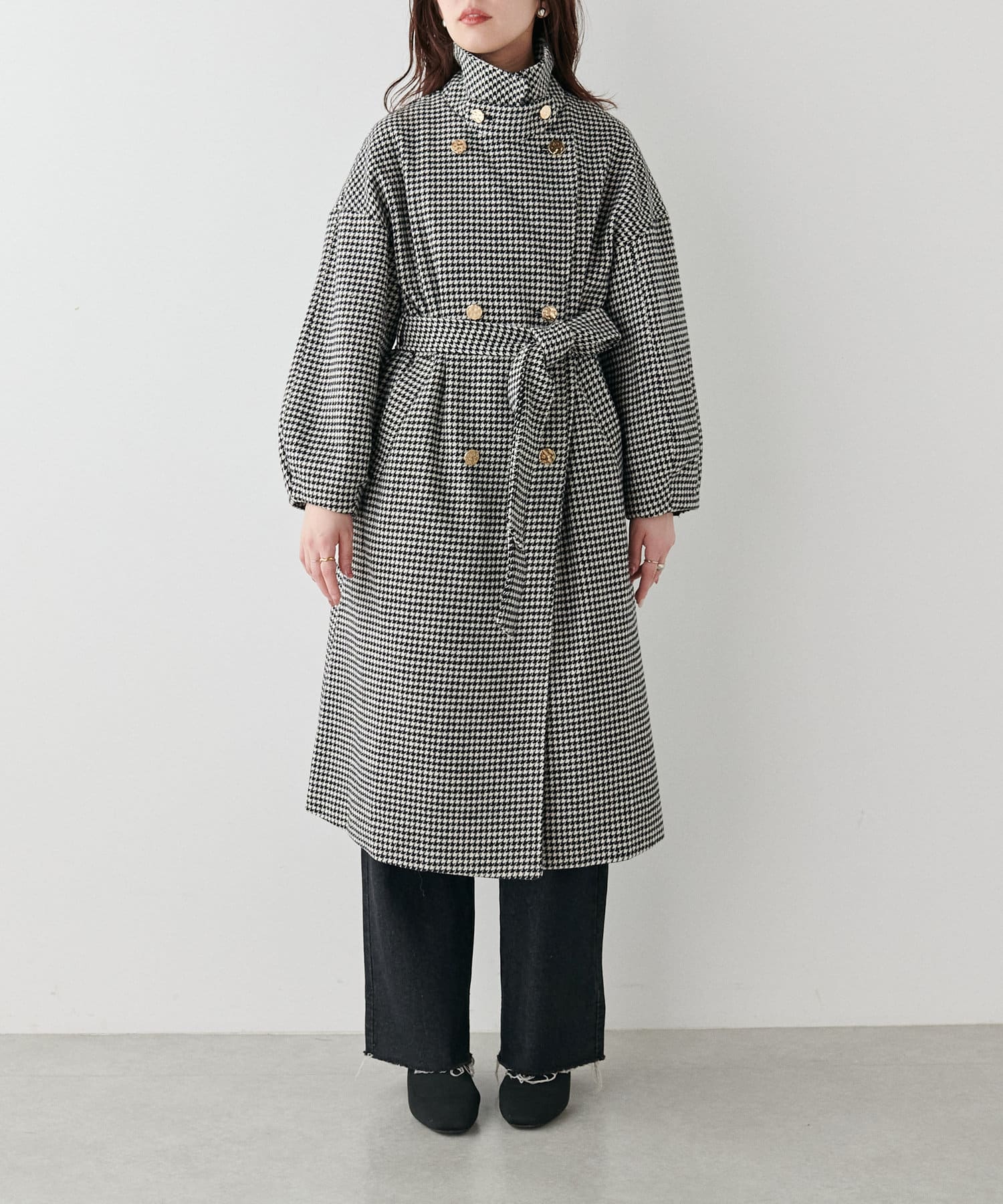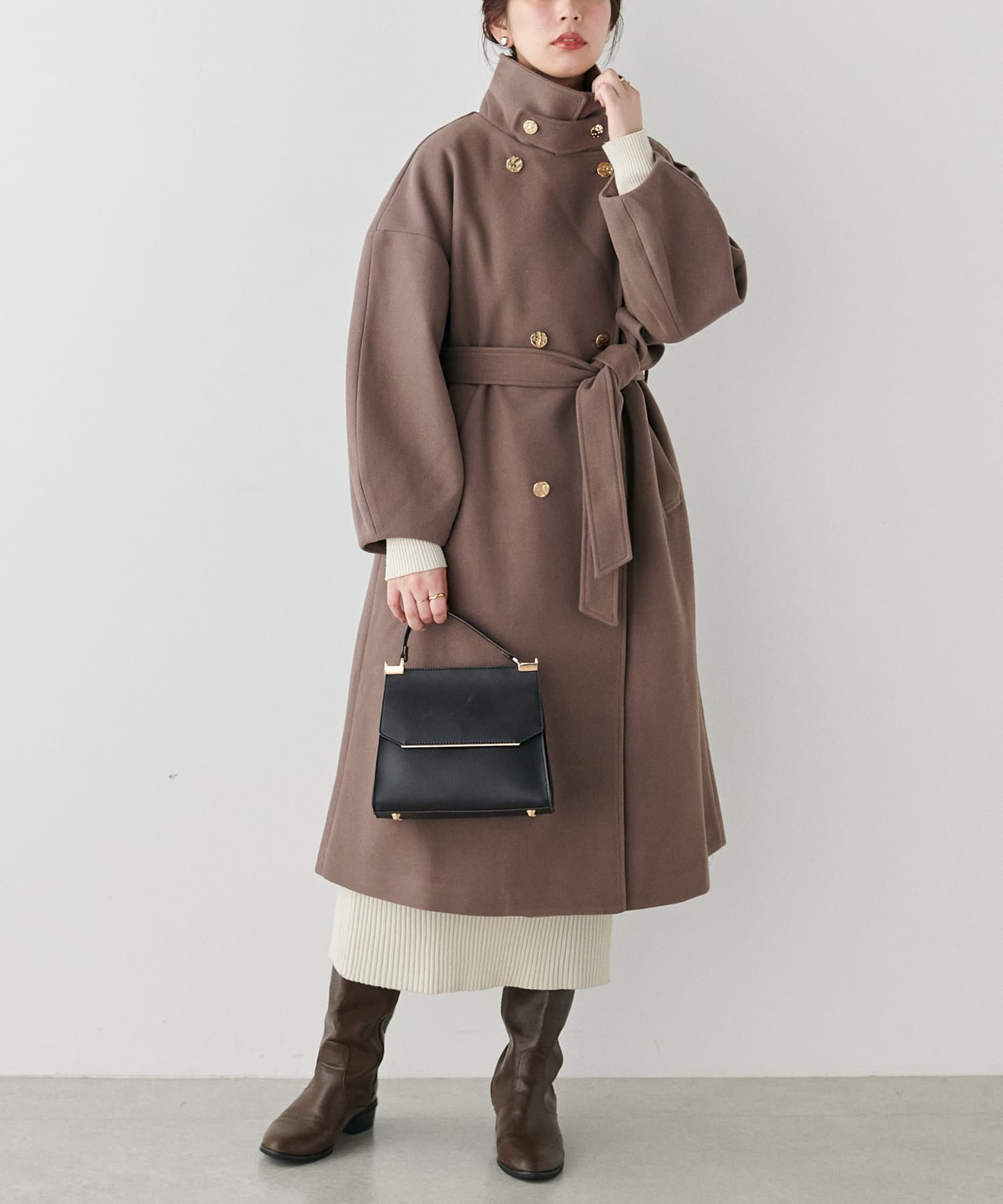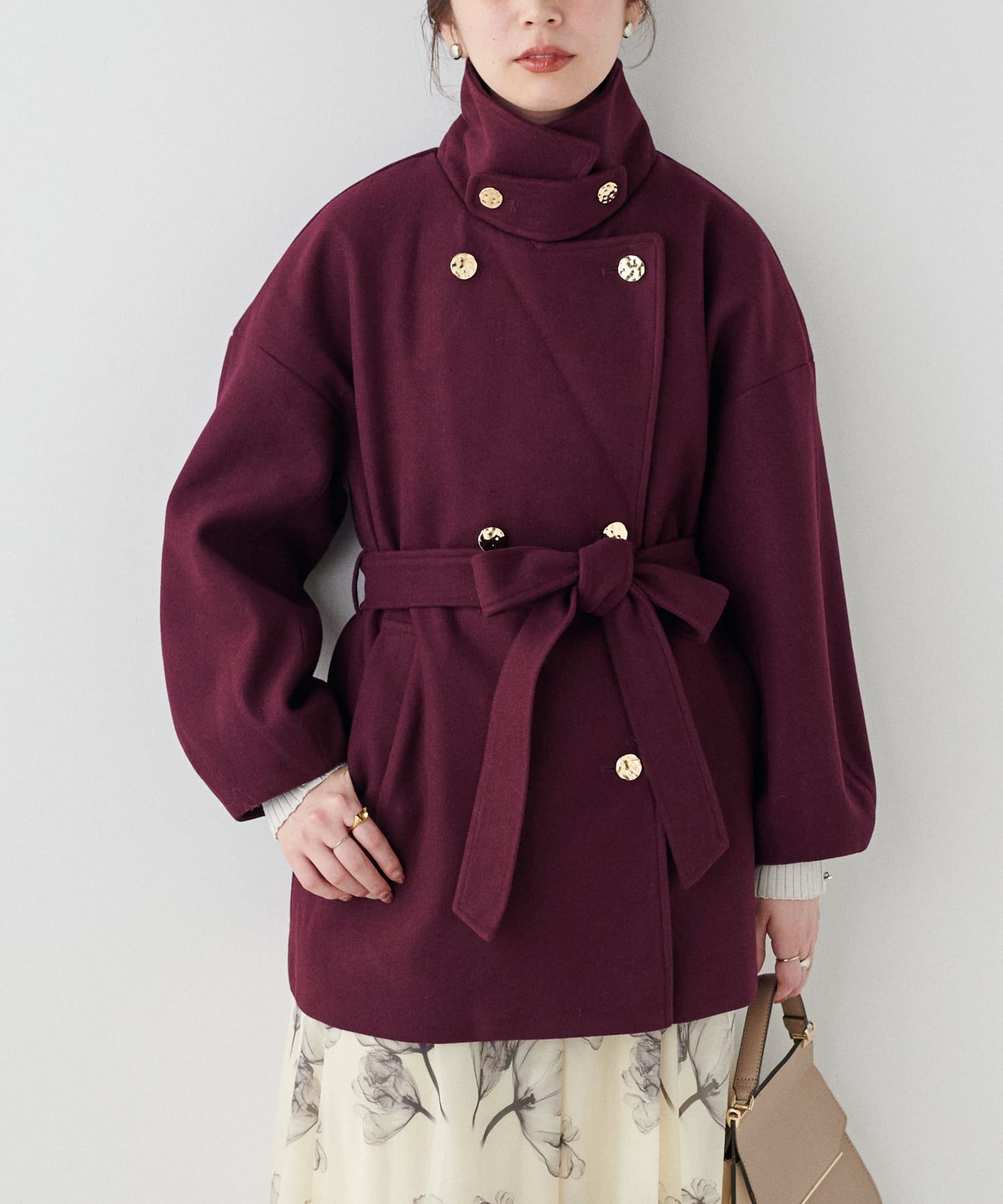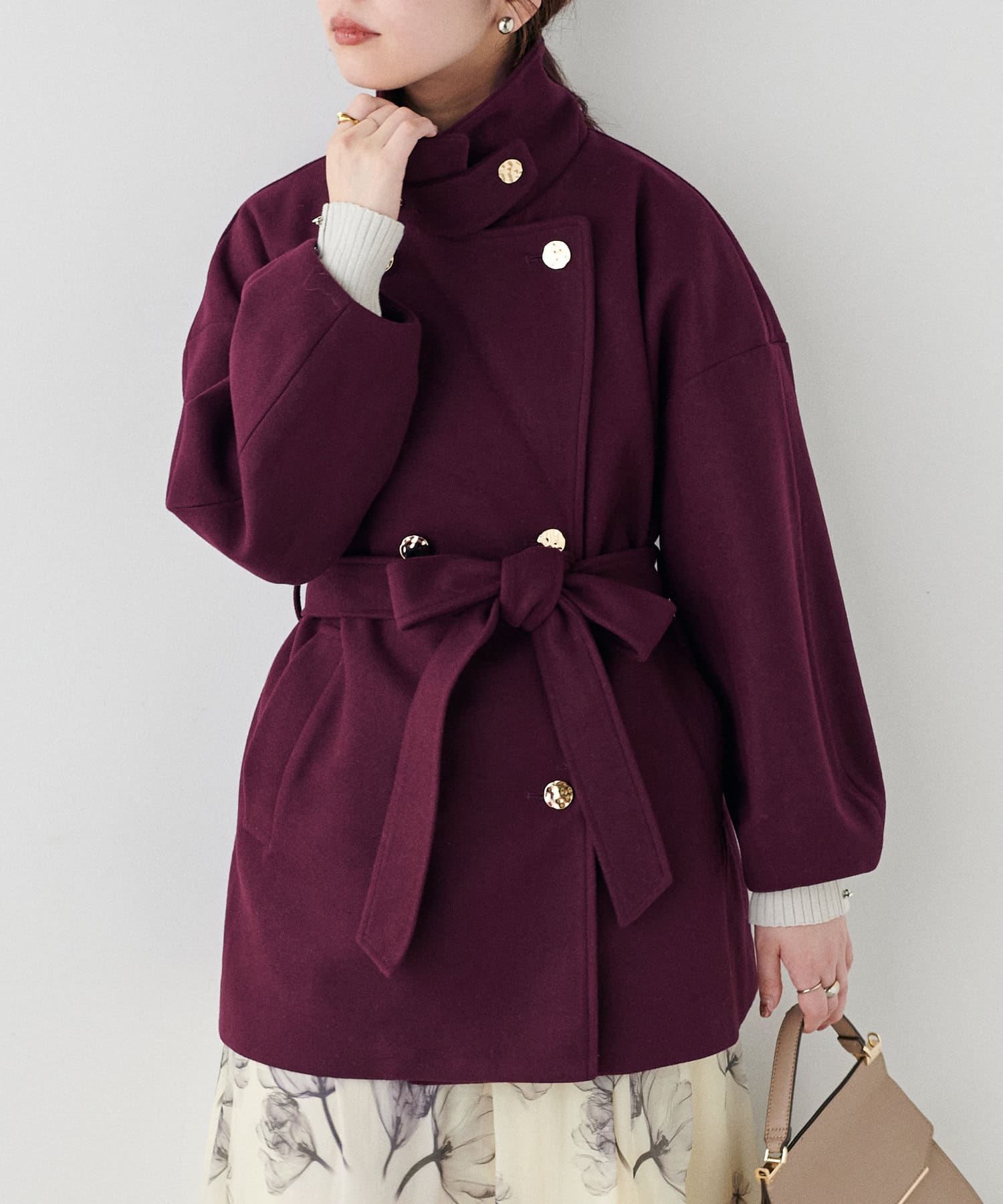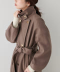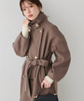 襟にフラップ付きでトレンド感のあるスタンドカラーのコート。