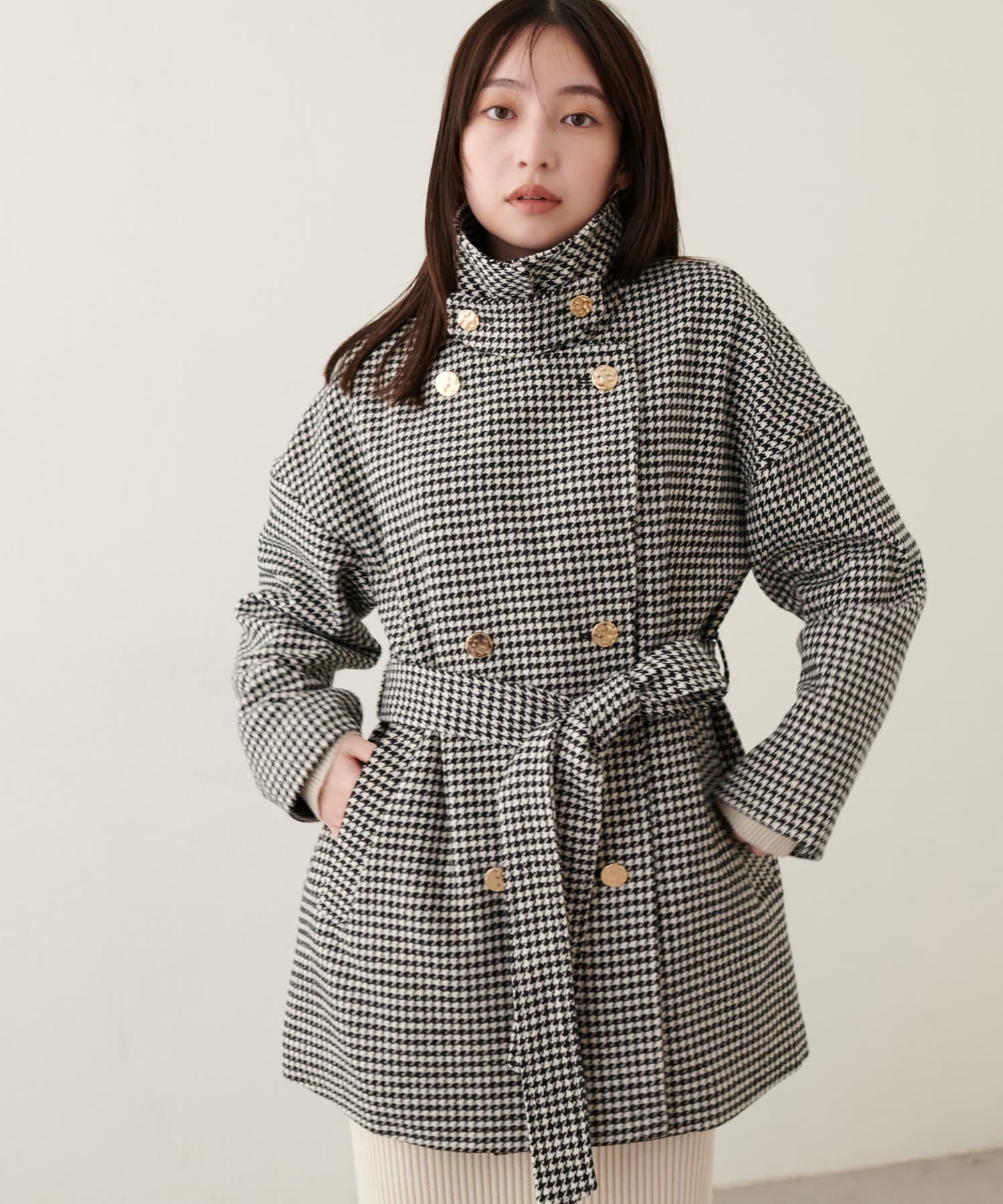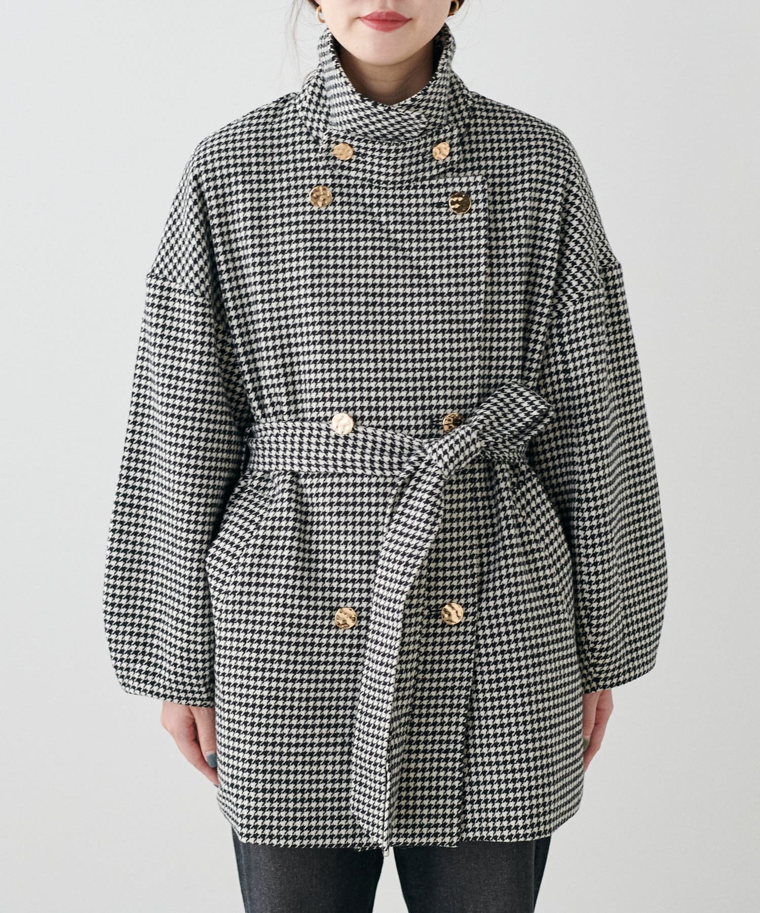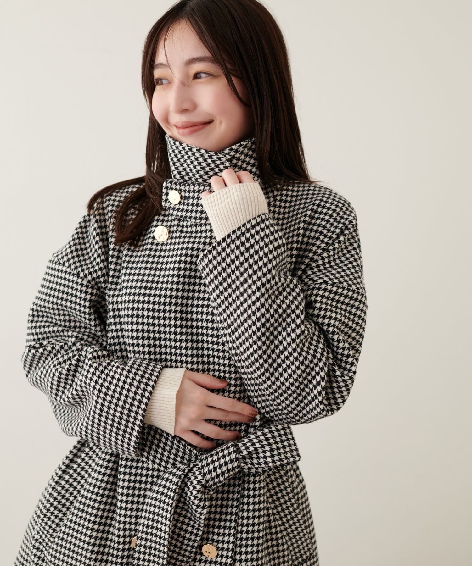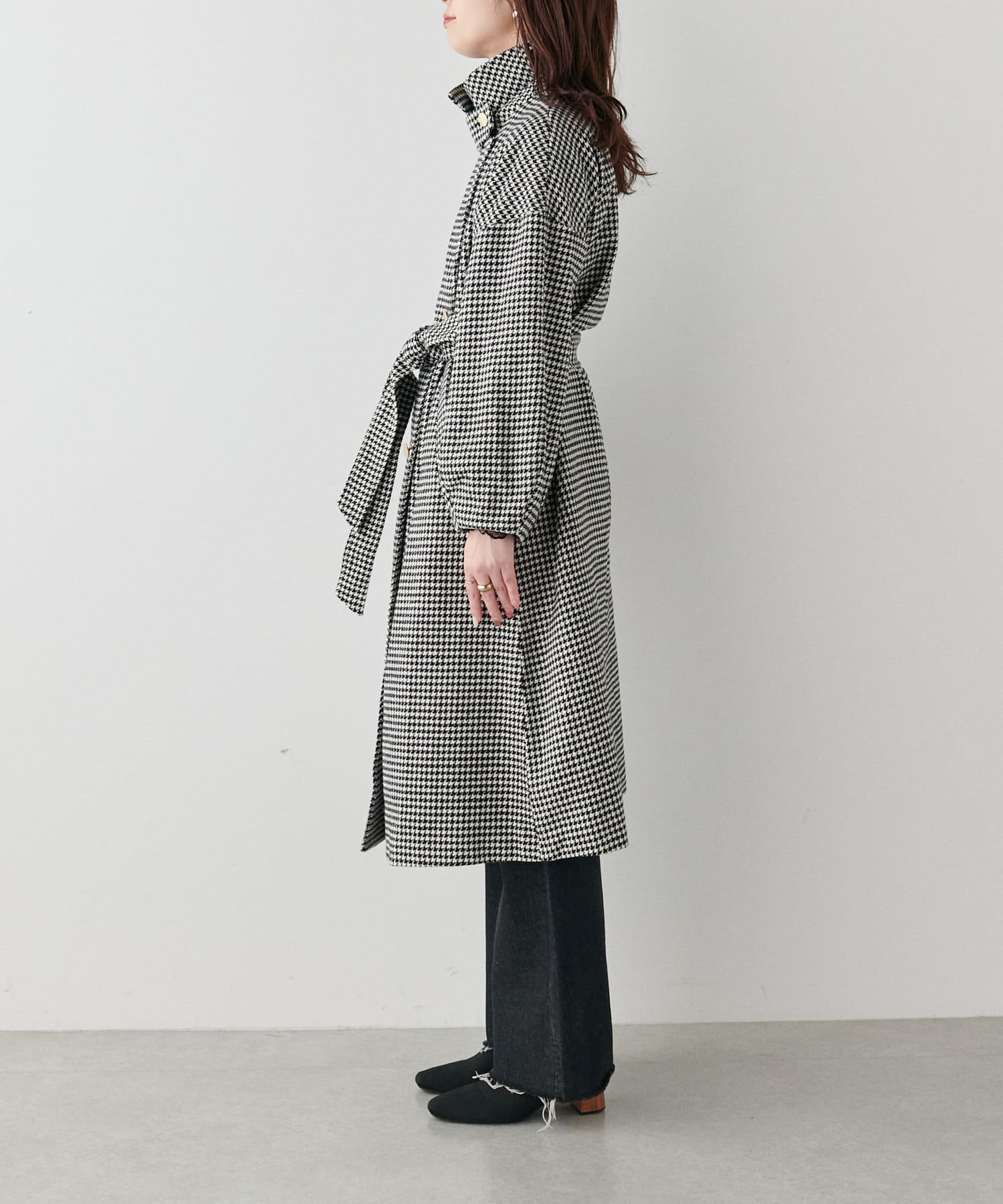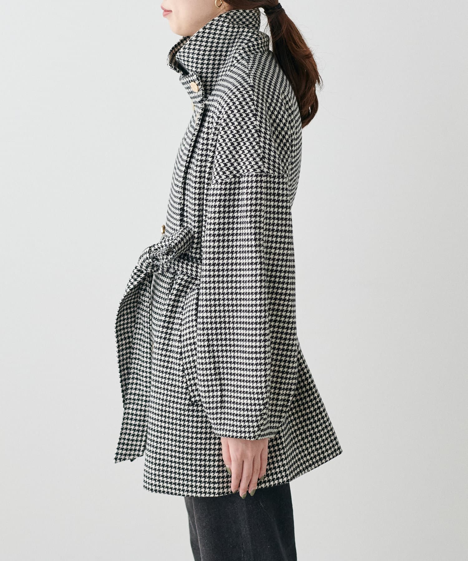 襟にフラップ付きでトレンド感のあるスタンドカラーのコート。