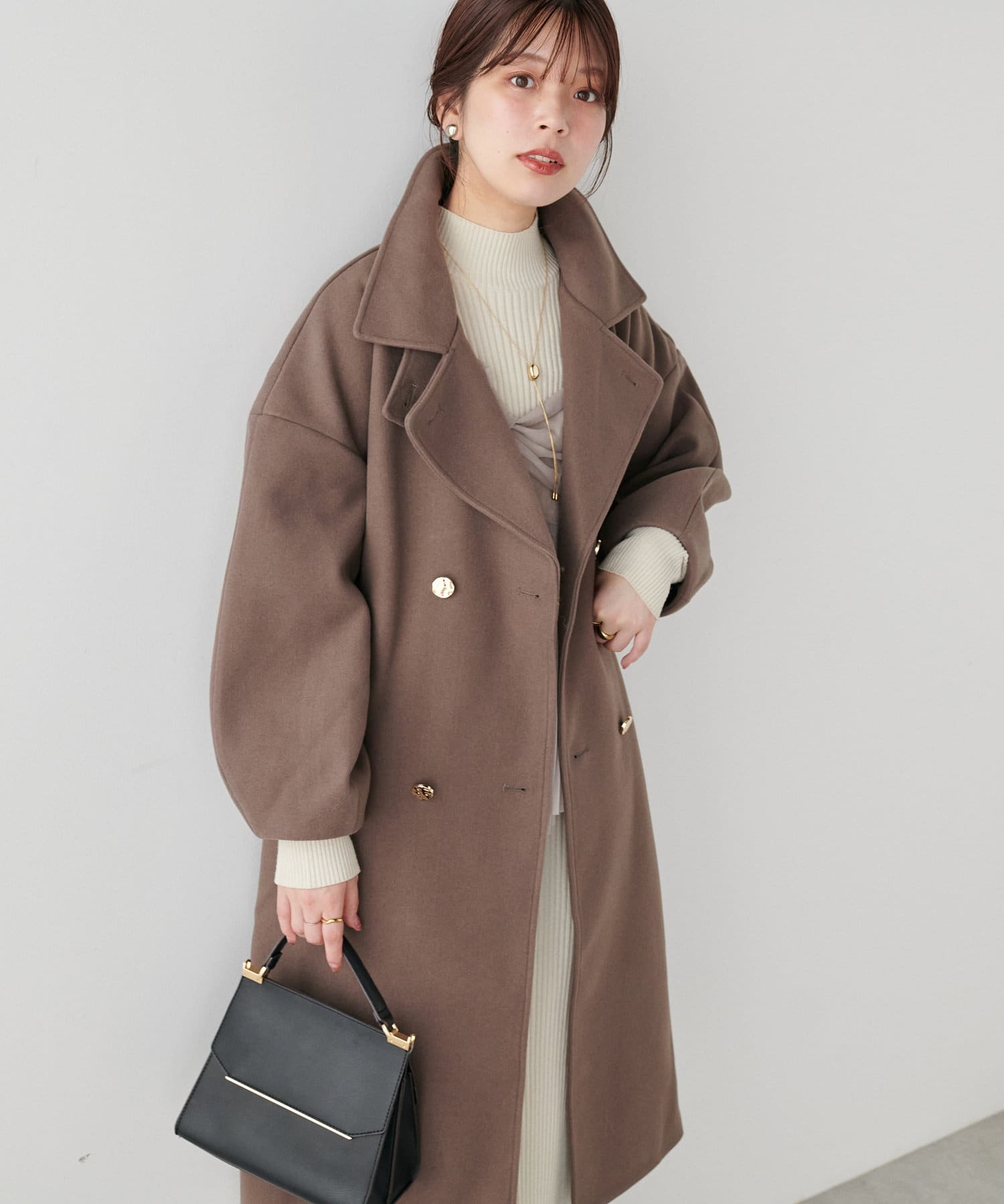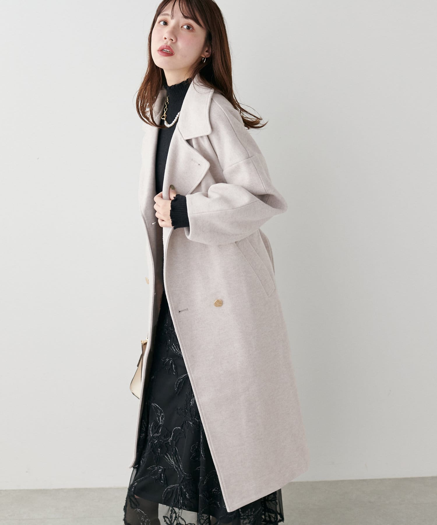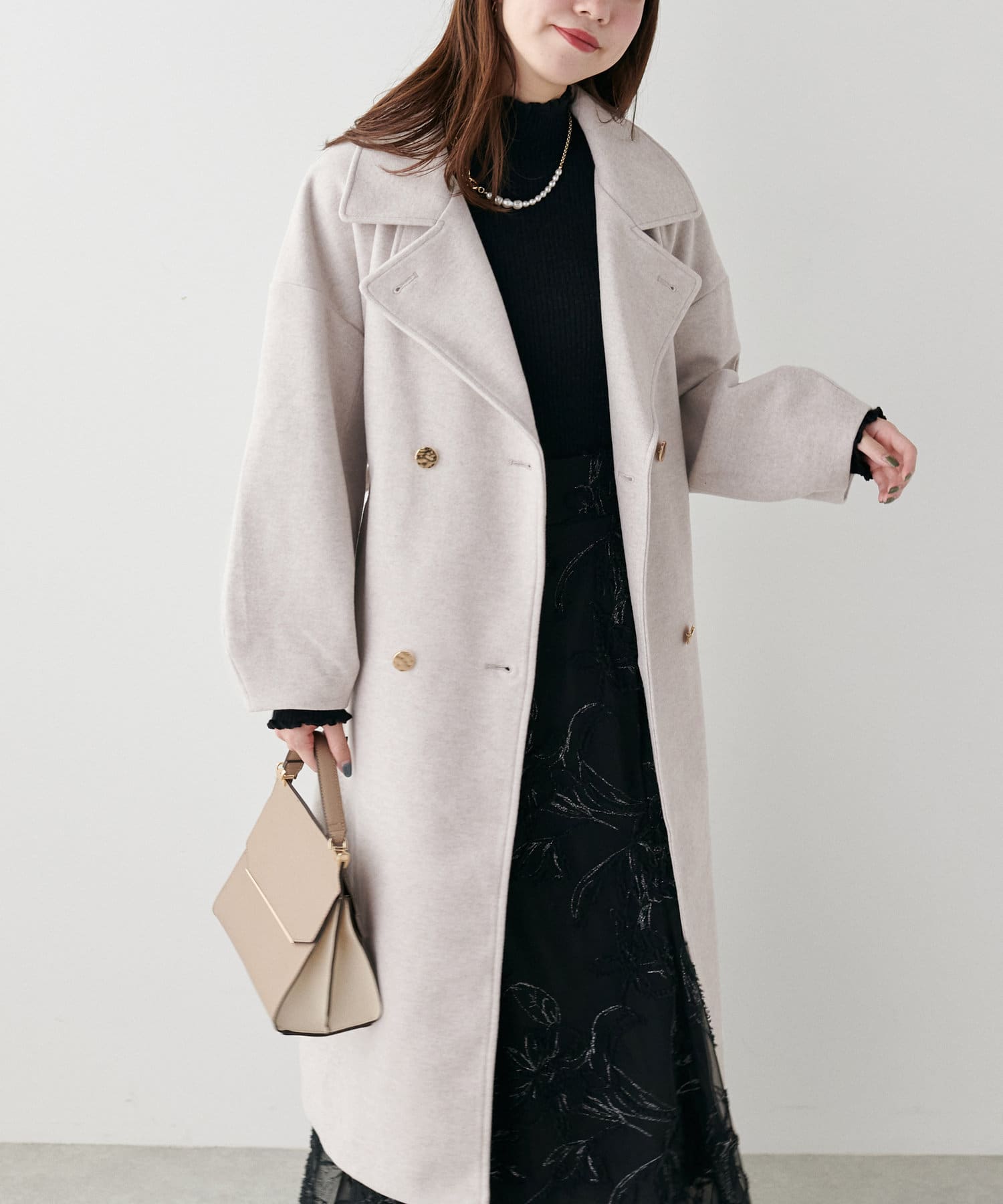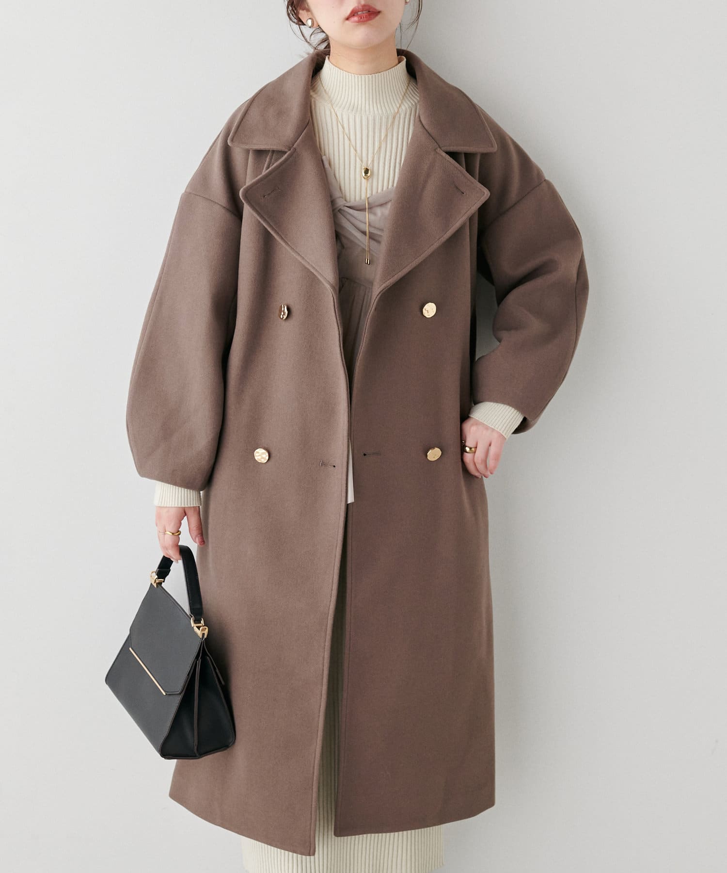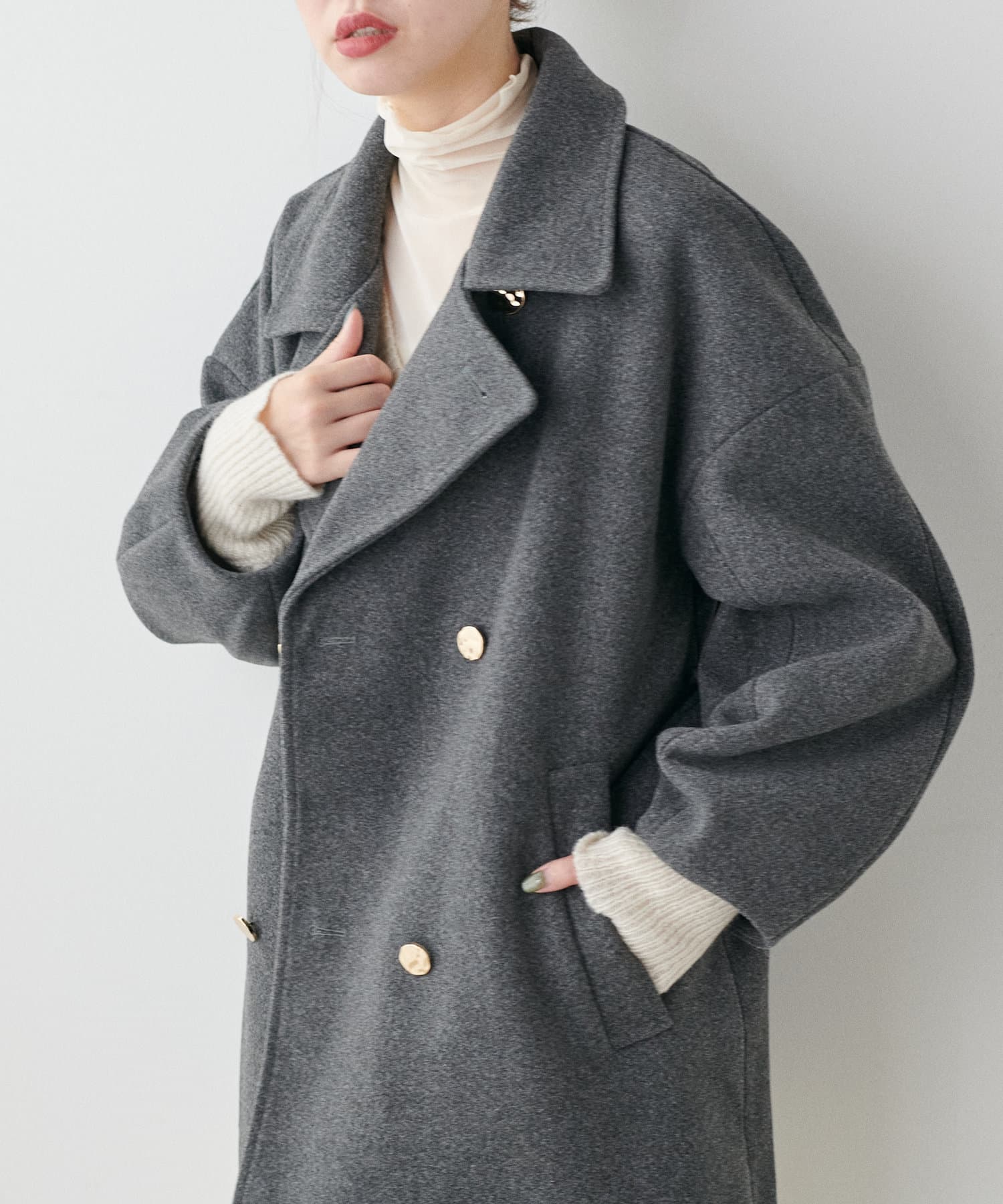 袖口はややコクーンシルエットなので、重厚感のあるアウターでもフェミニンな印象に。