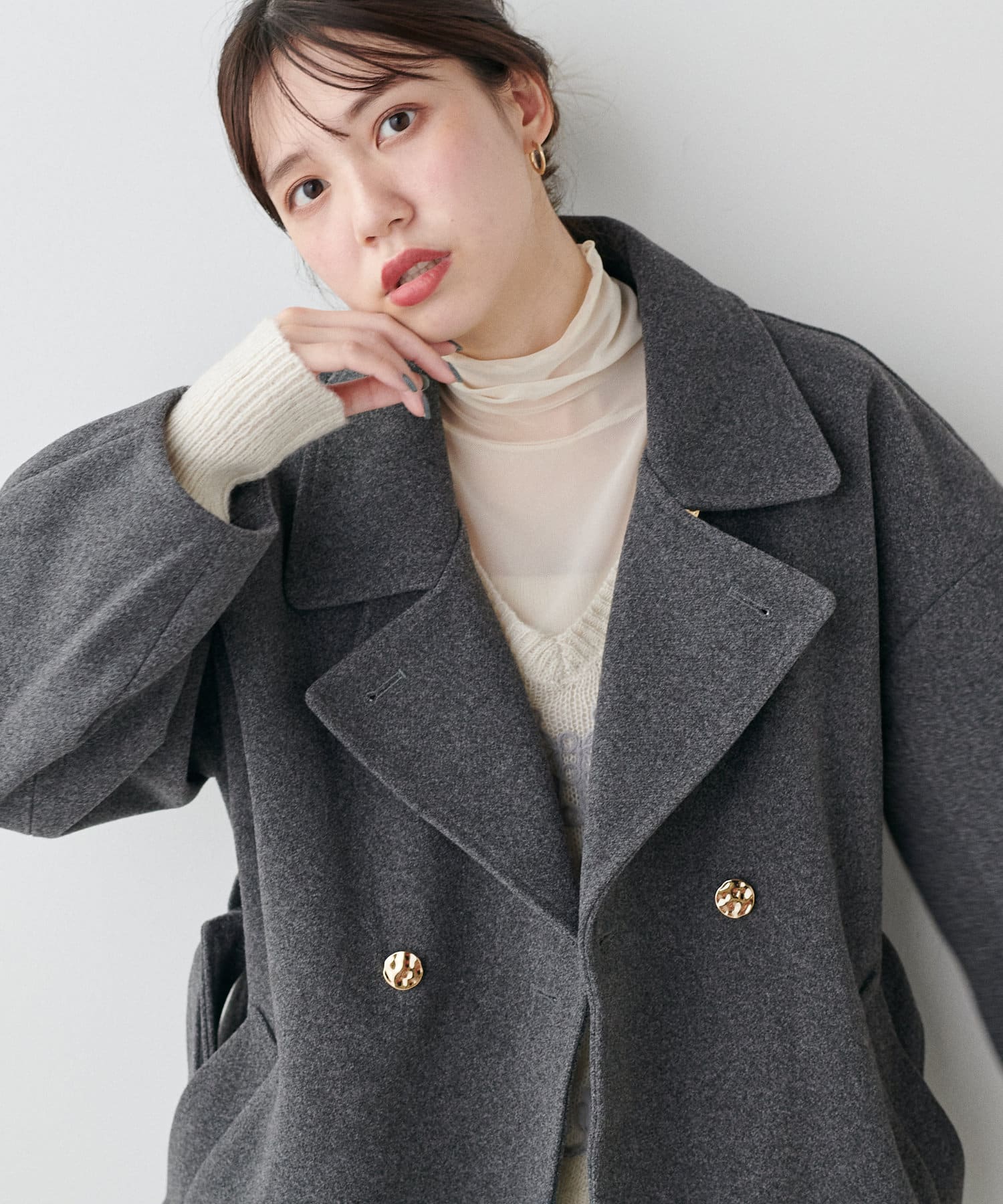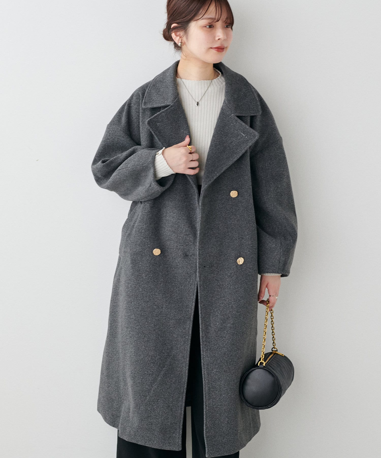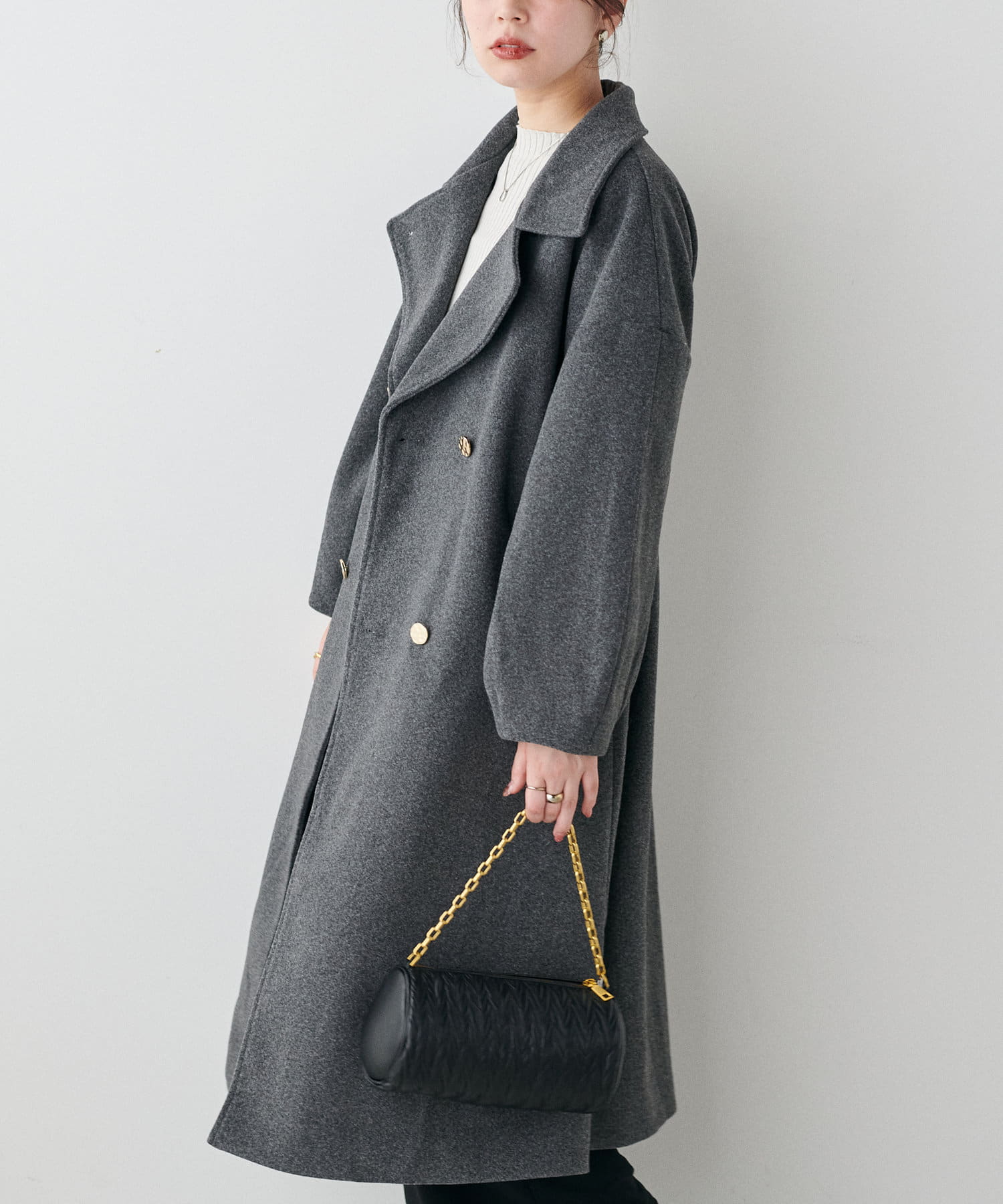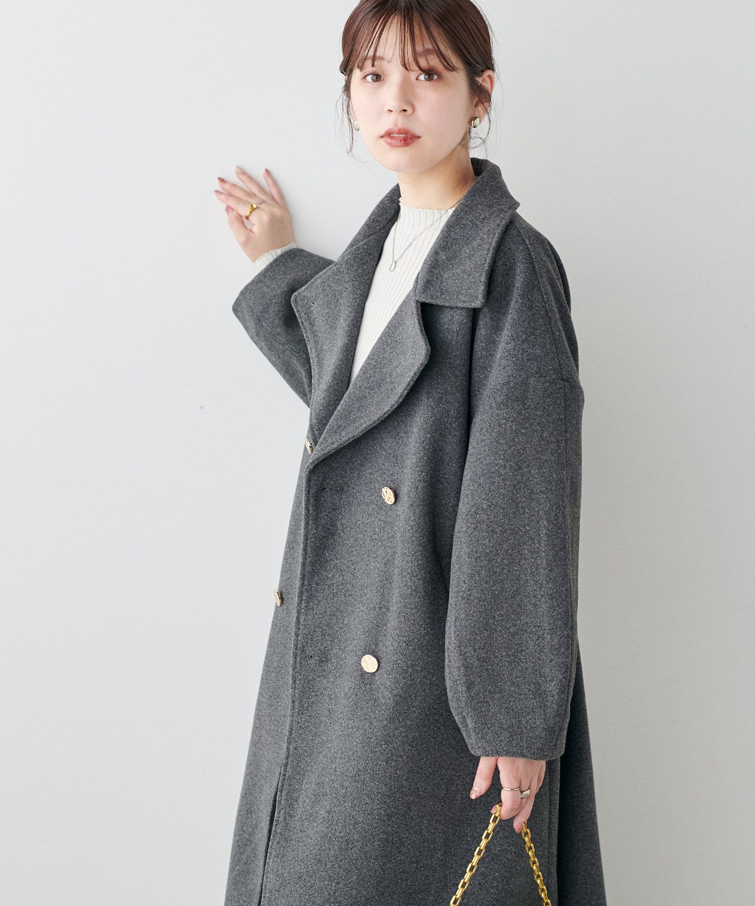 袖口はややコクーンシルエットなので、重厚感のあるアウターでもフェミニンな印象に。