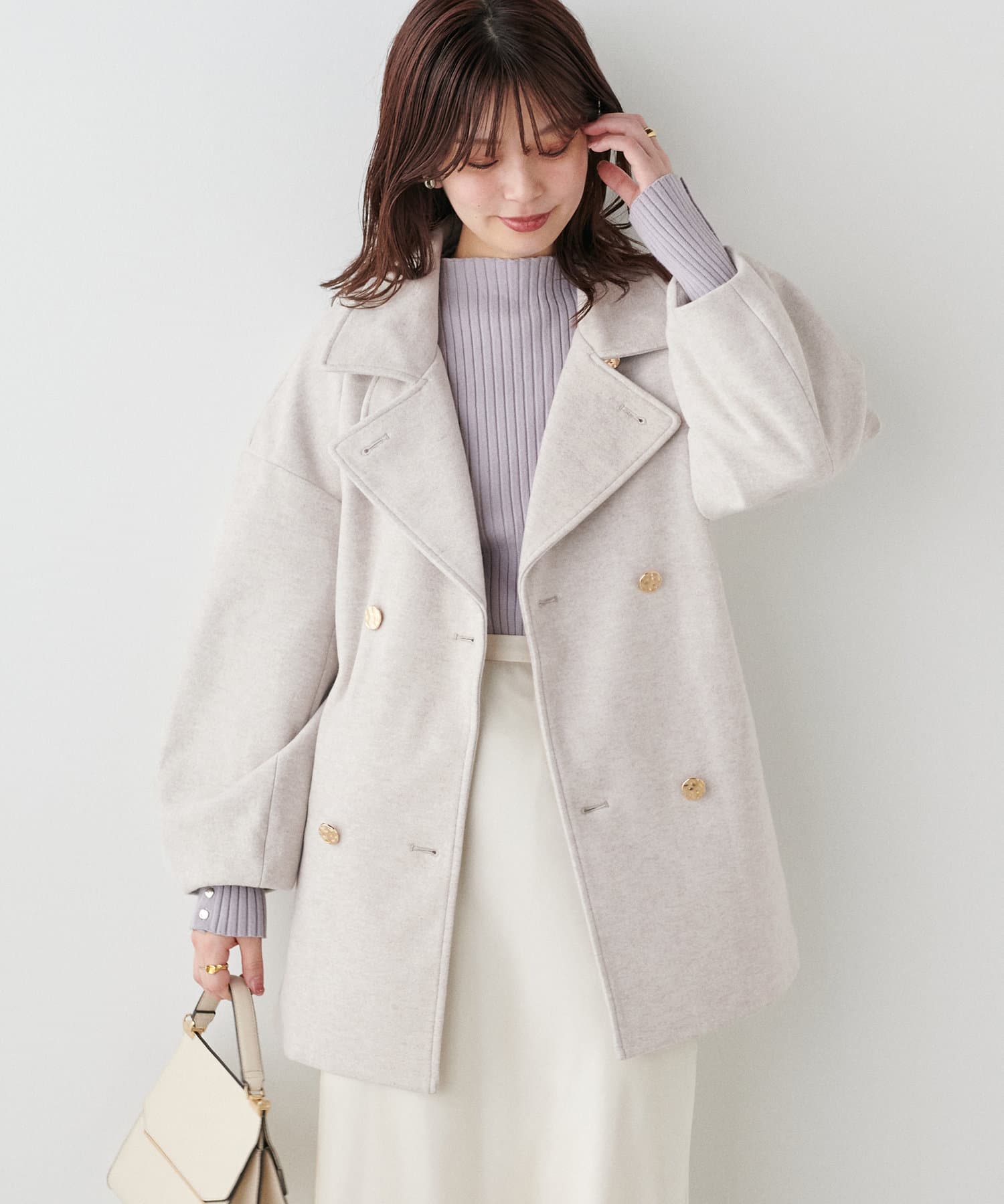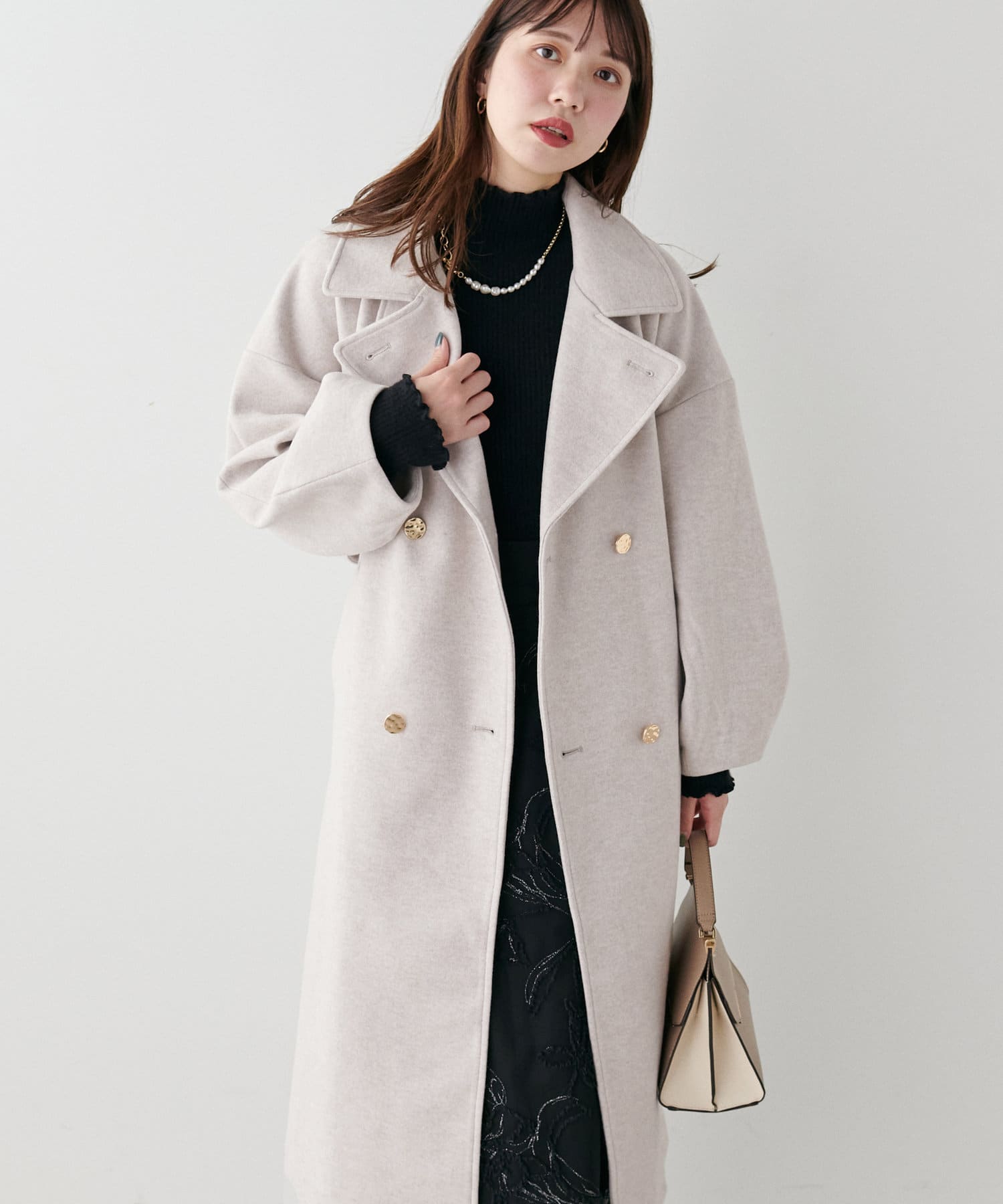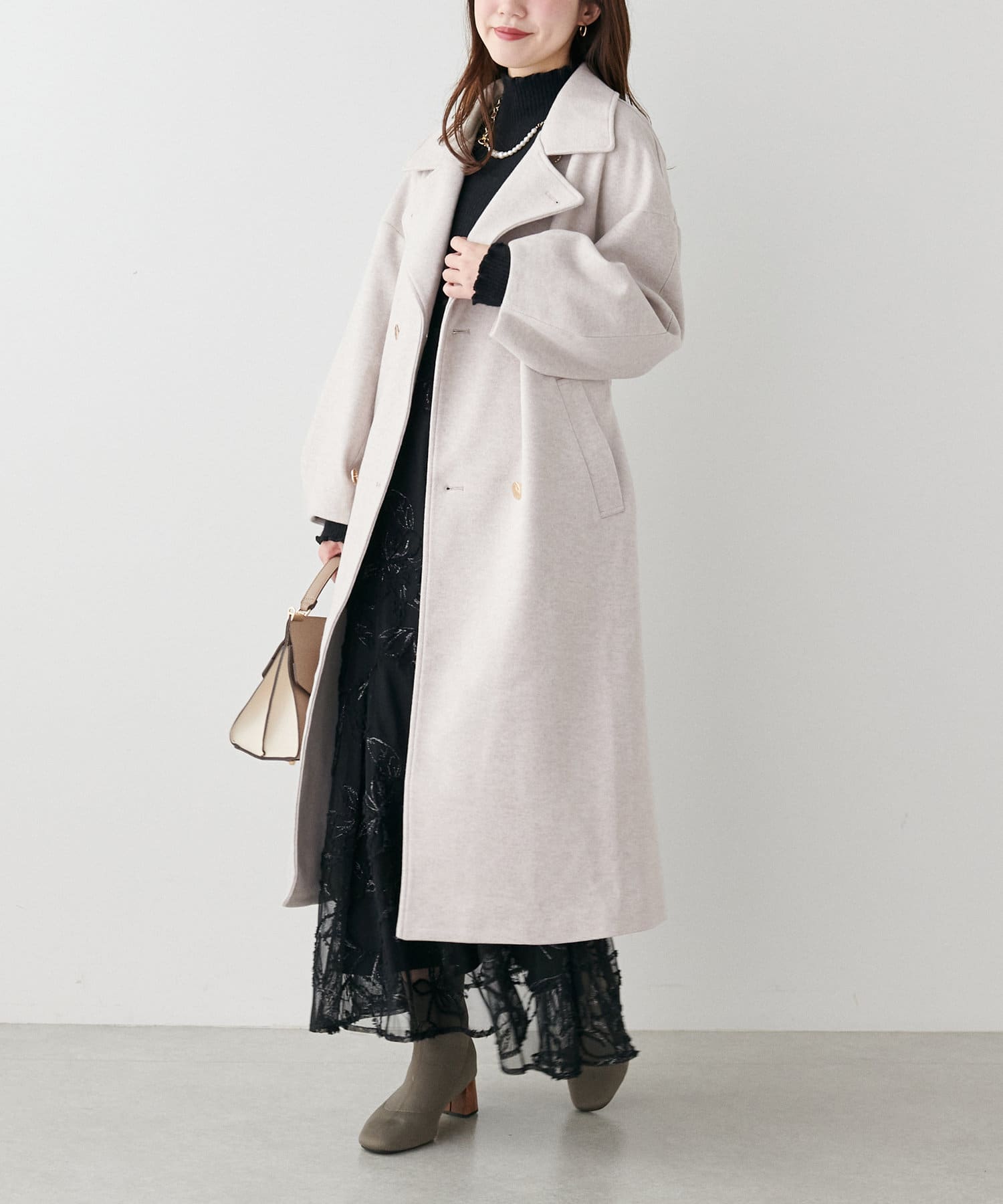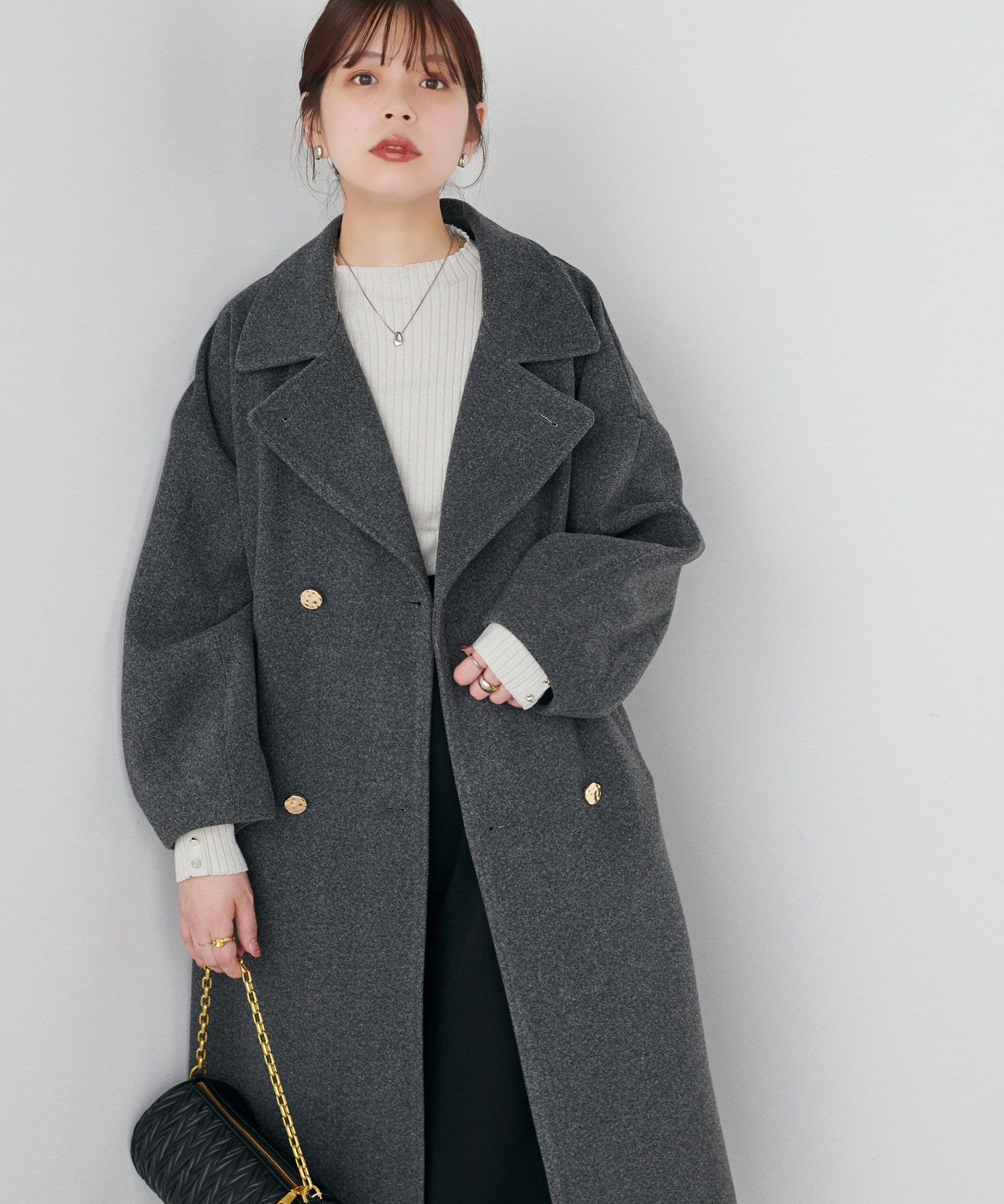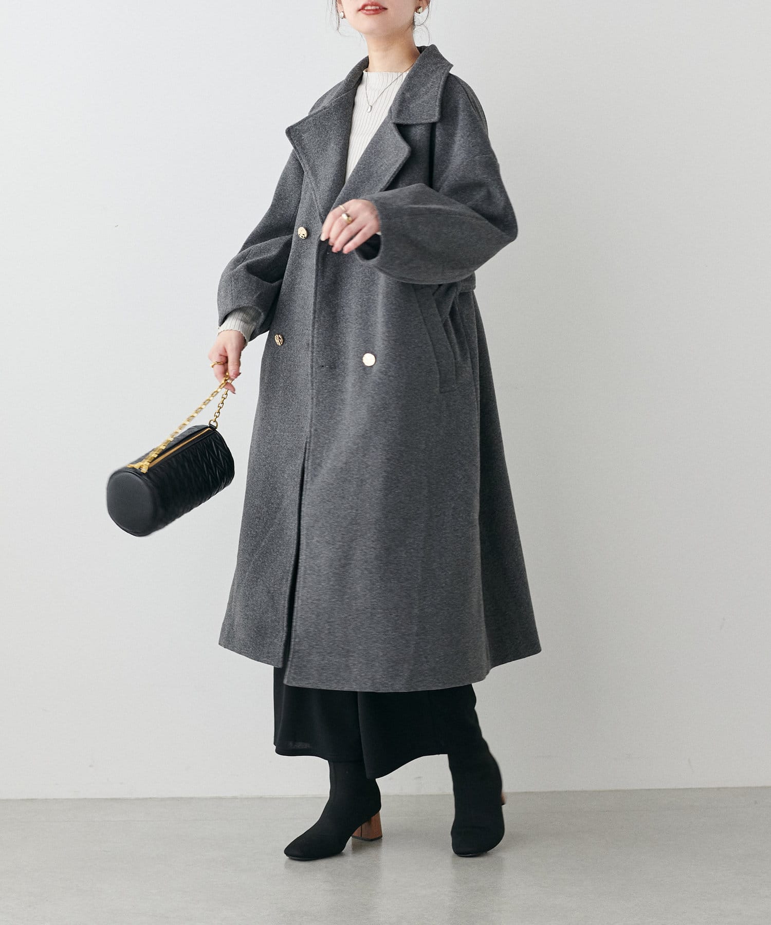 袖口はややコクーンシルエットなので、重厚感のあるアウターでもフェミニンな印象に。