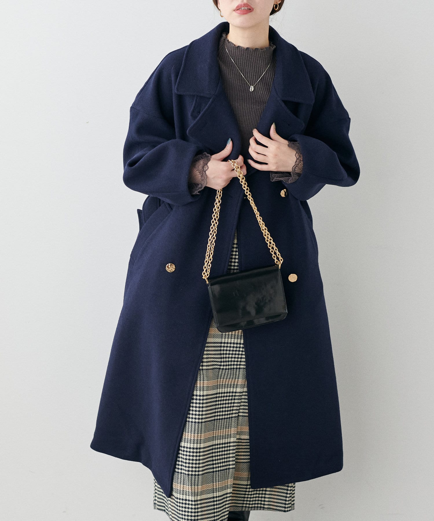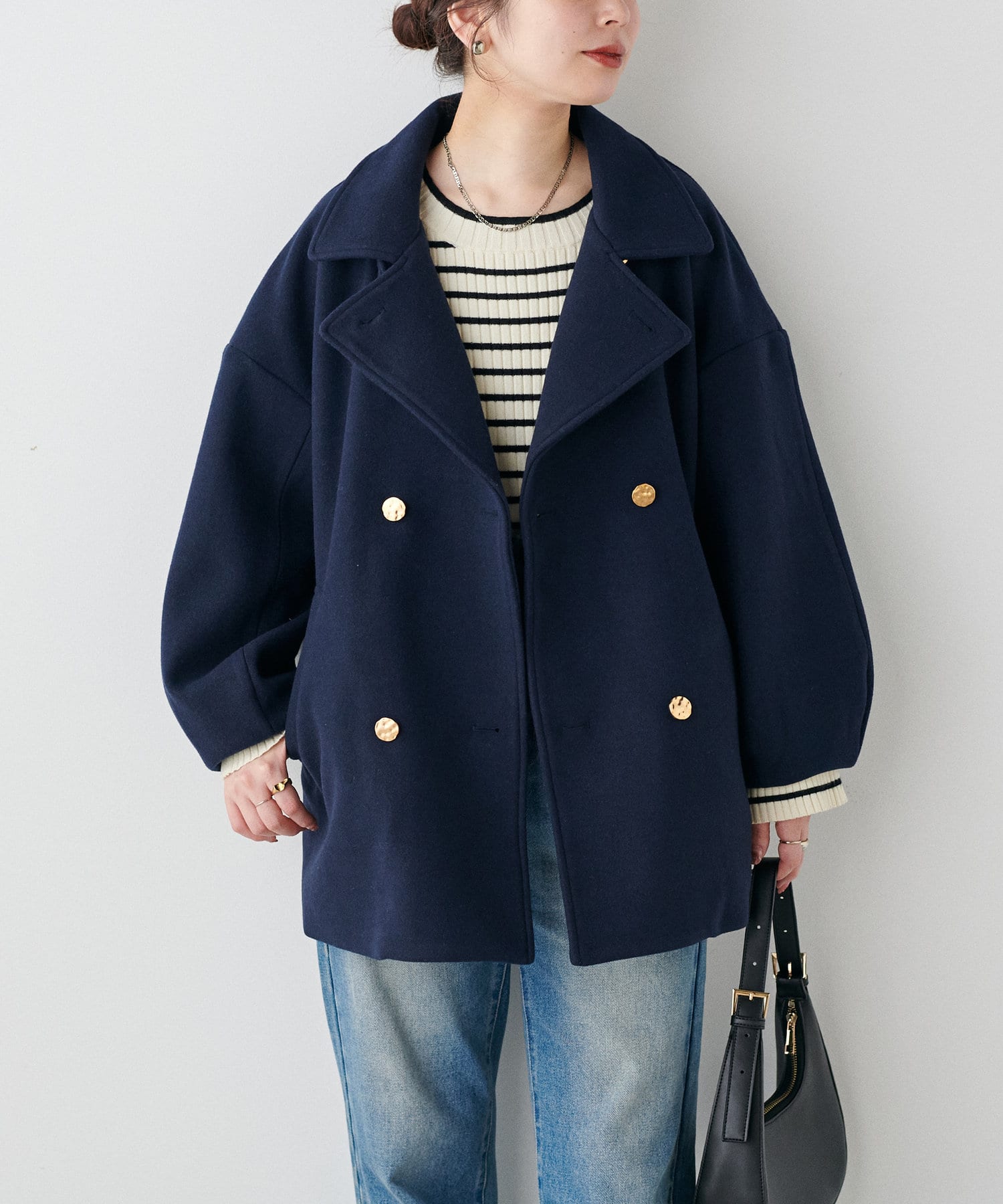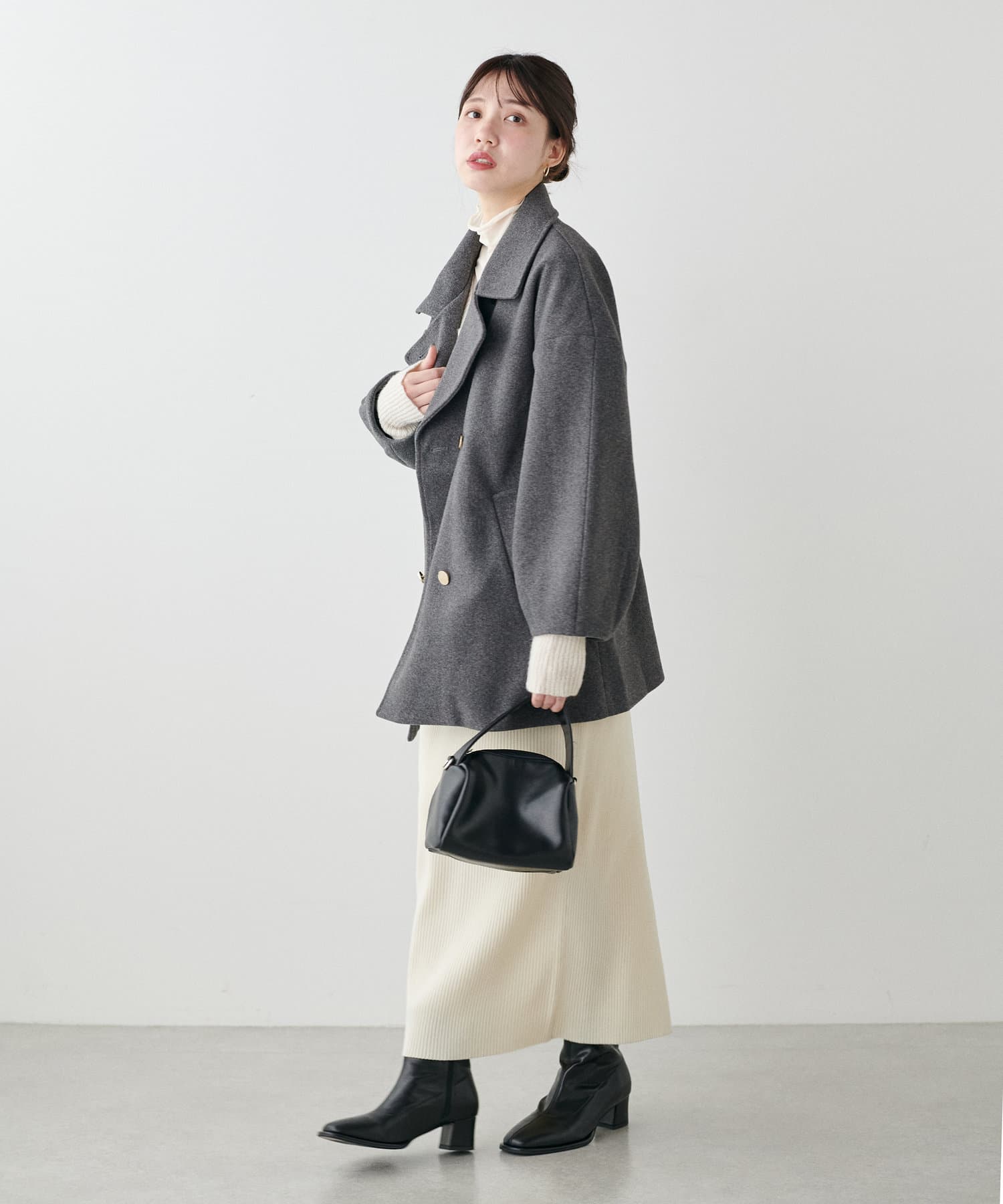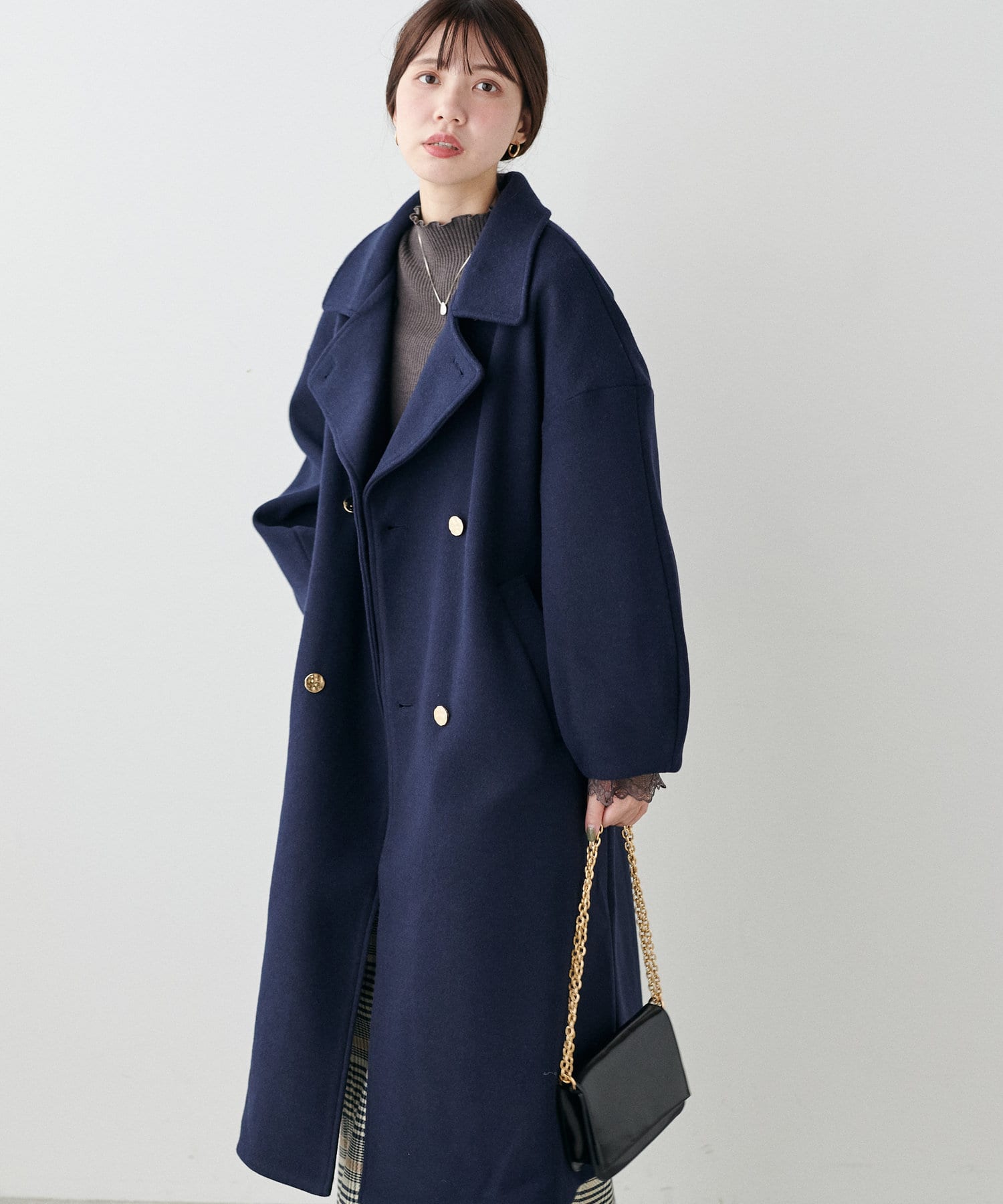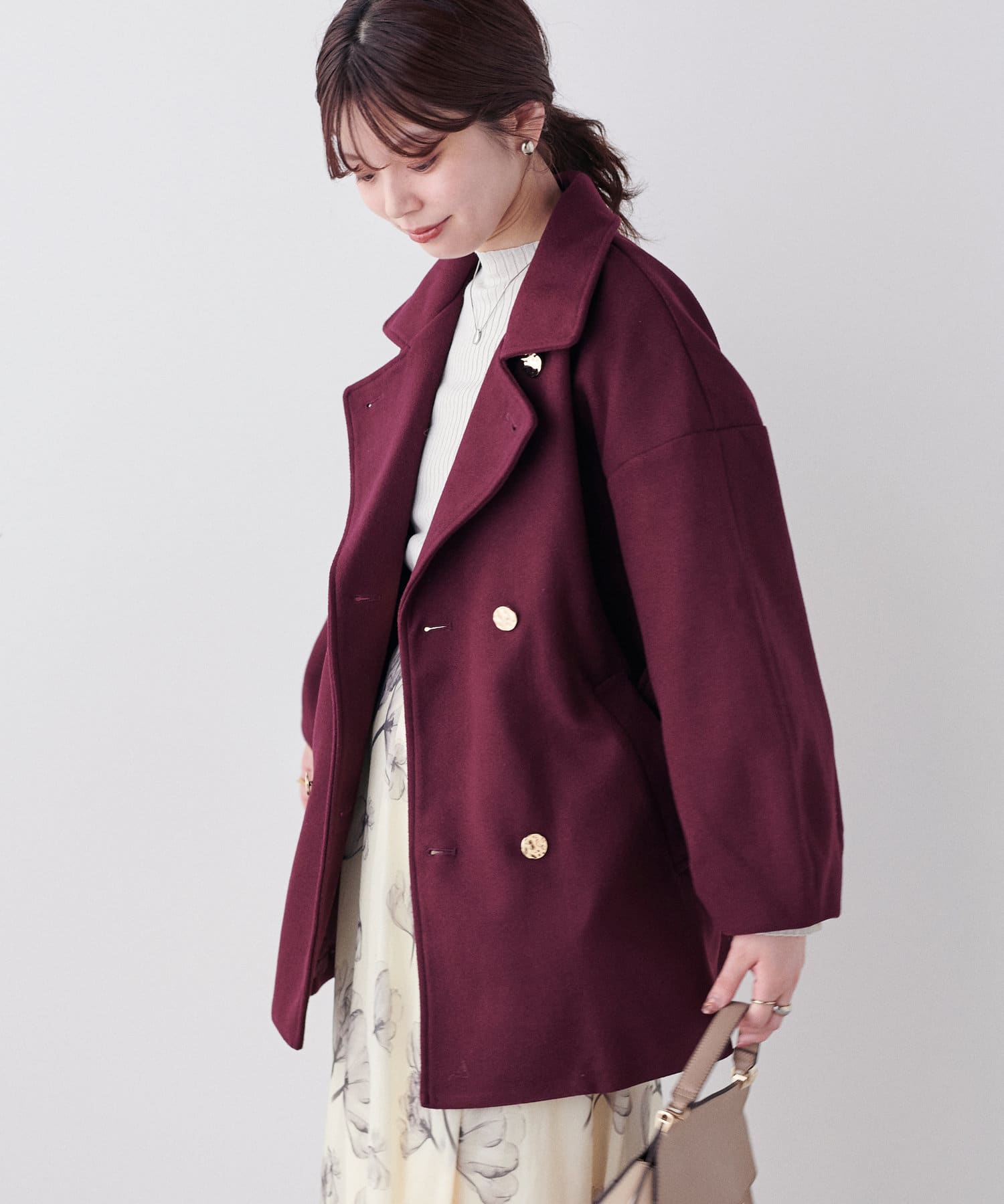 袖口はややコクーンシルエットなので、重厚感のあるアウターでもフェミニンな印象に。