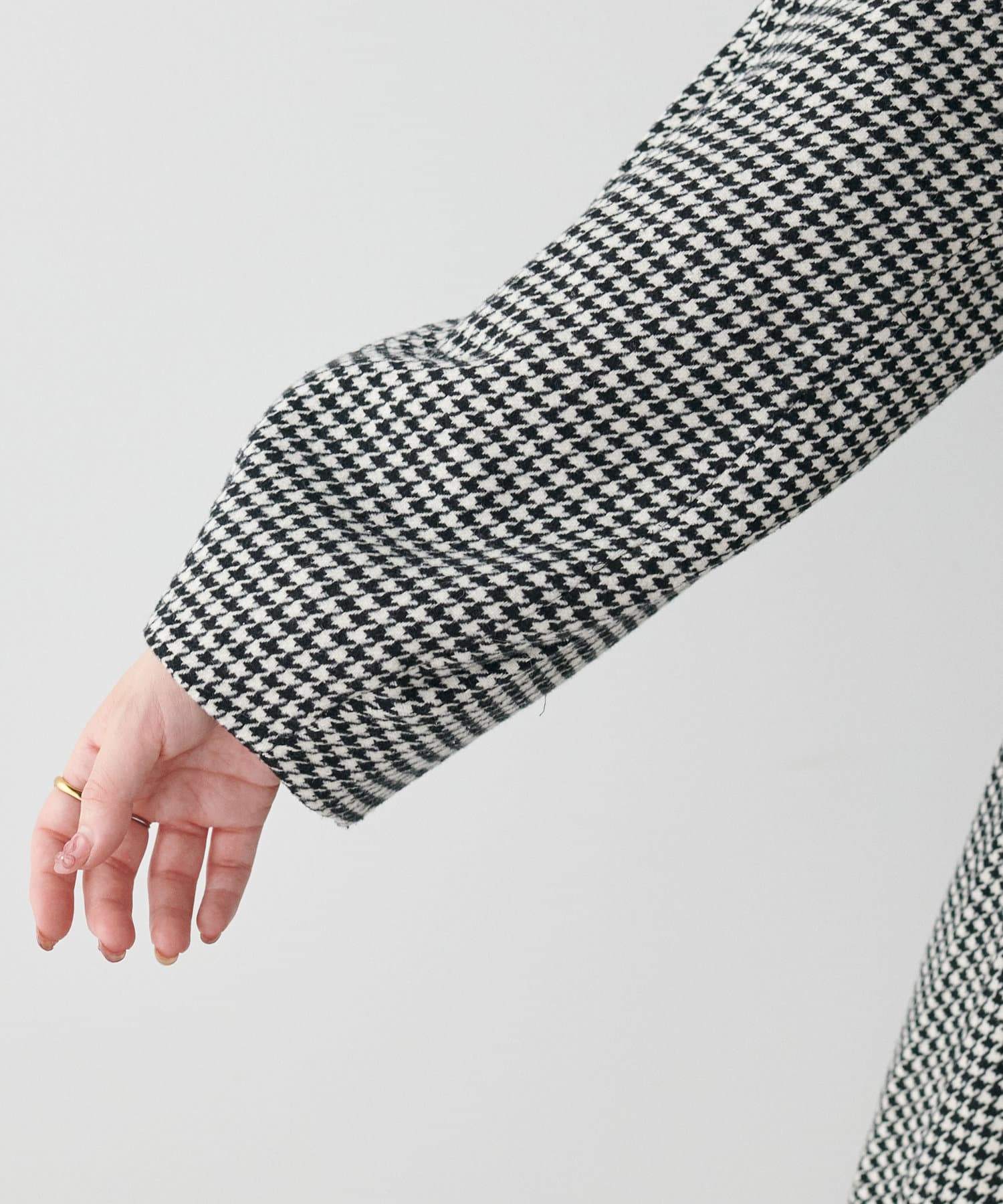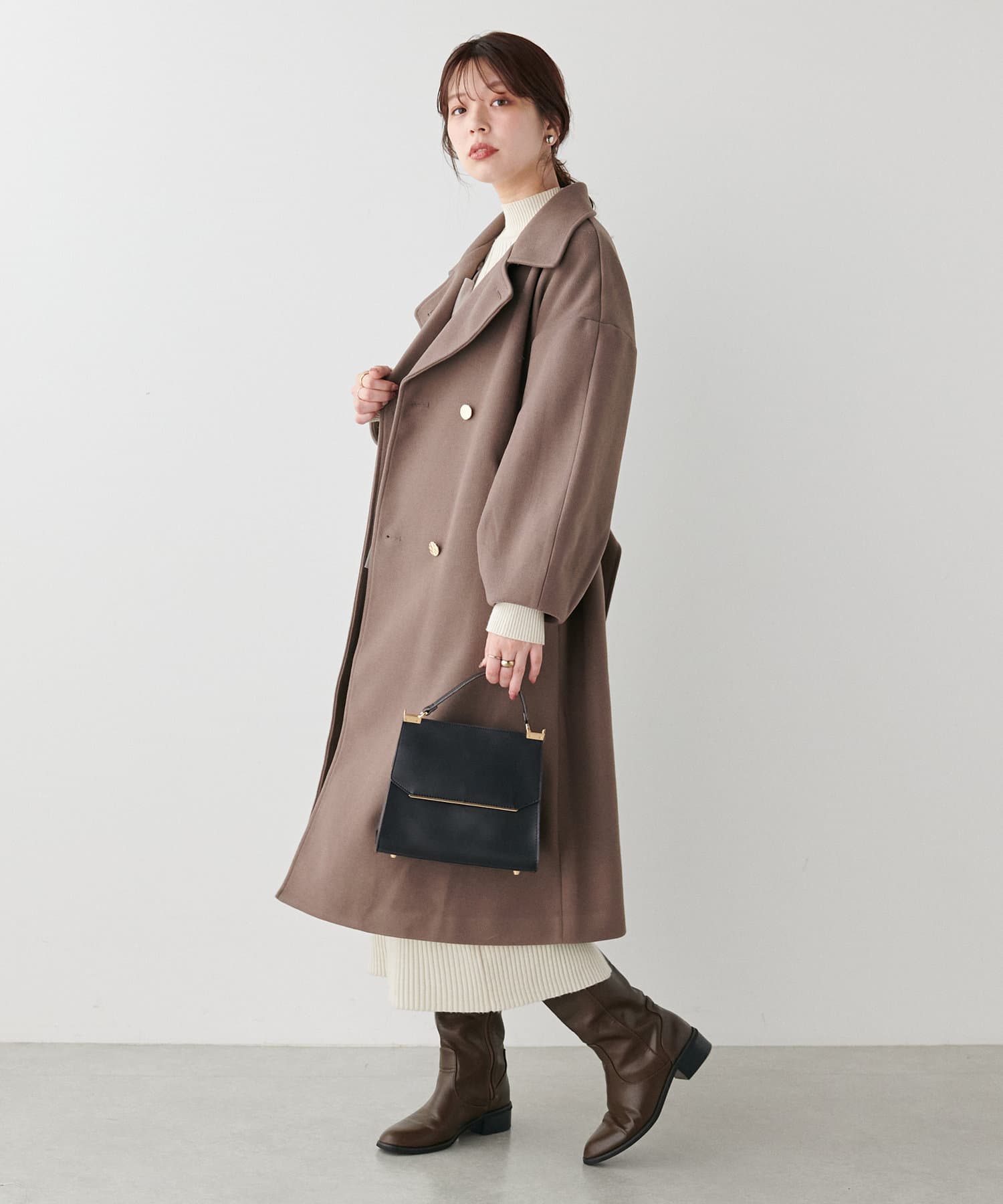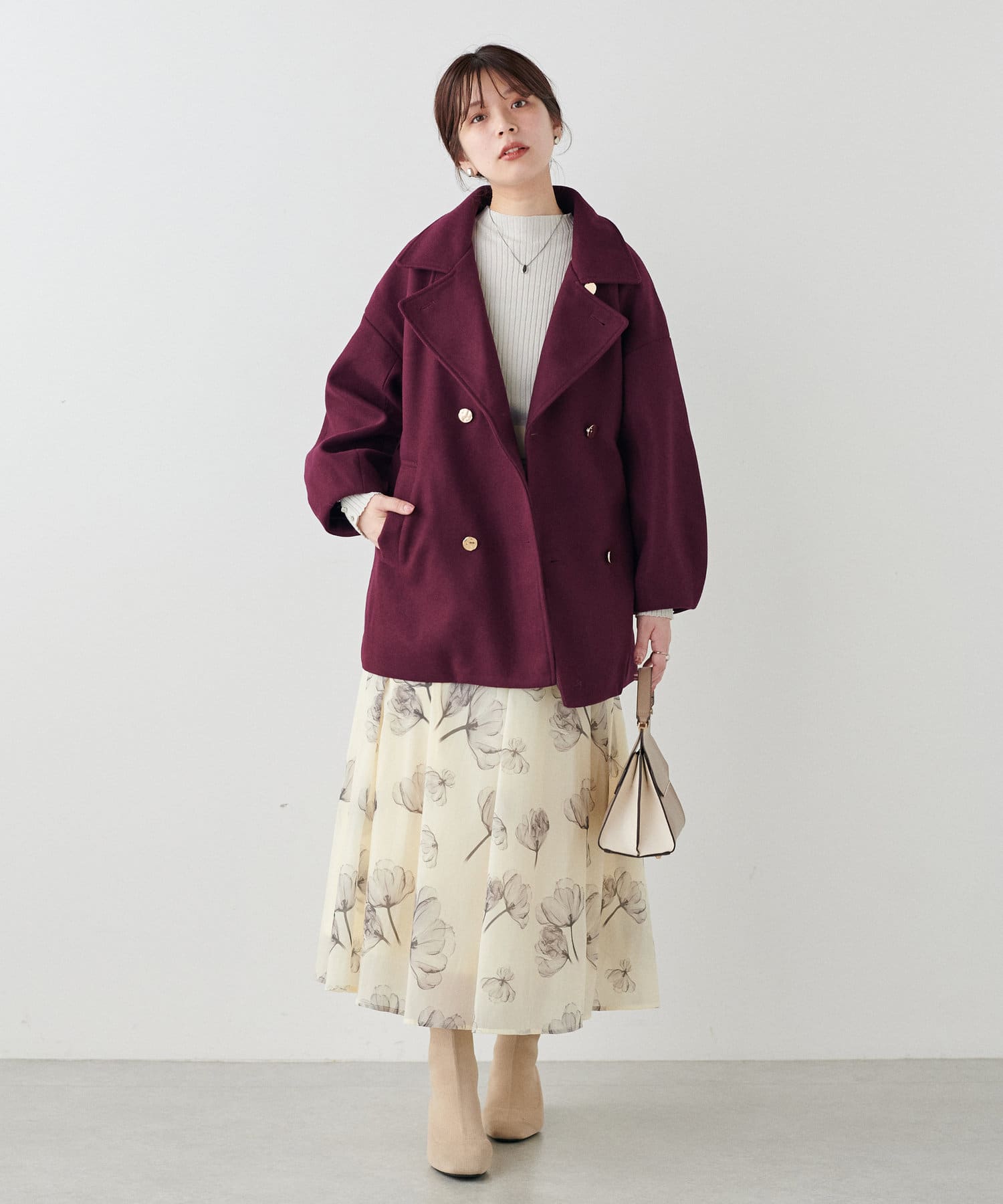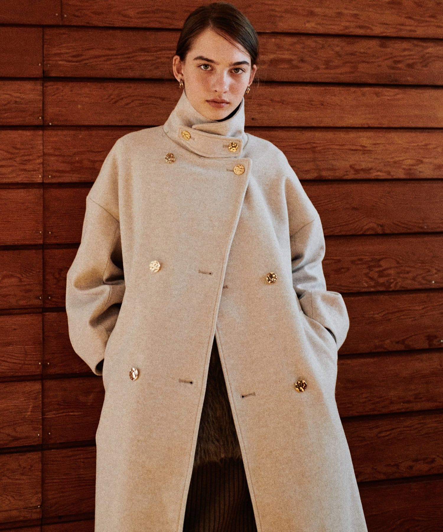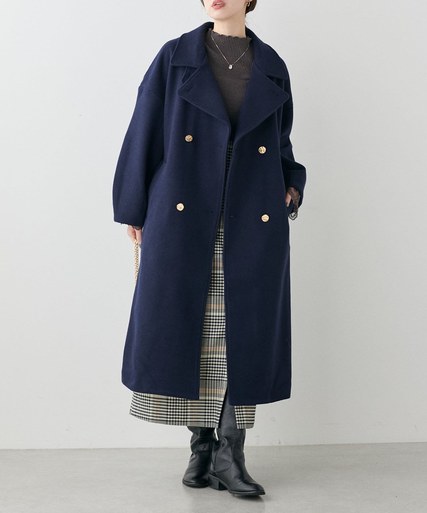 袖口はややコクーンシルエットなので、重厚感のあるアウターでもフェミニンな印象に。