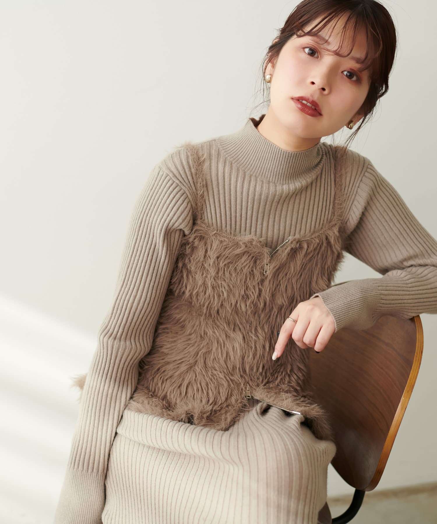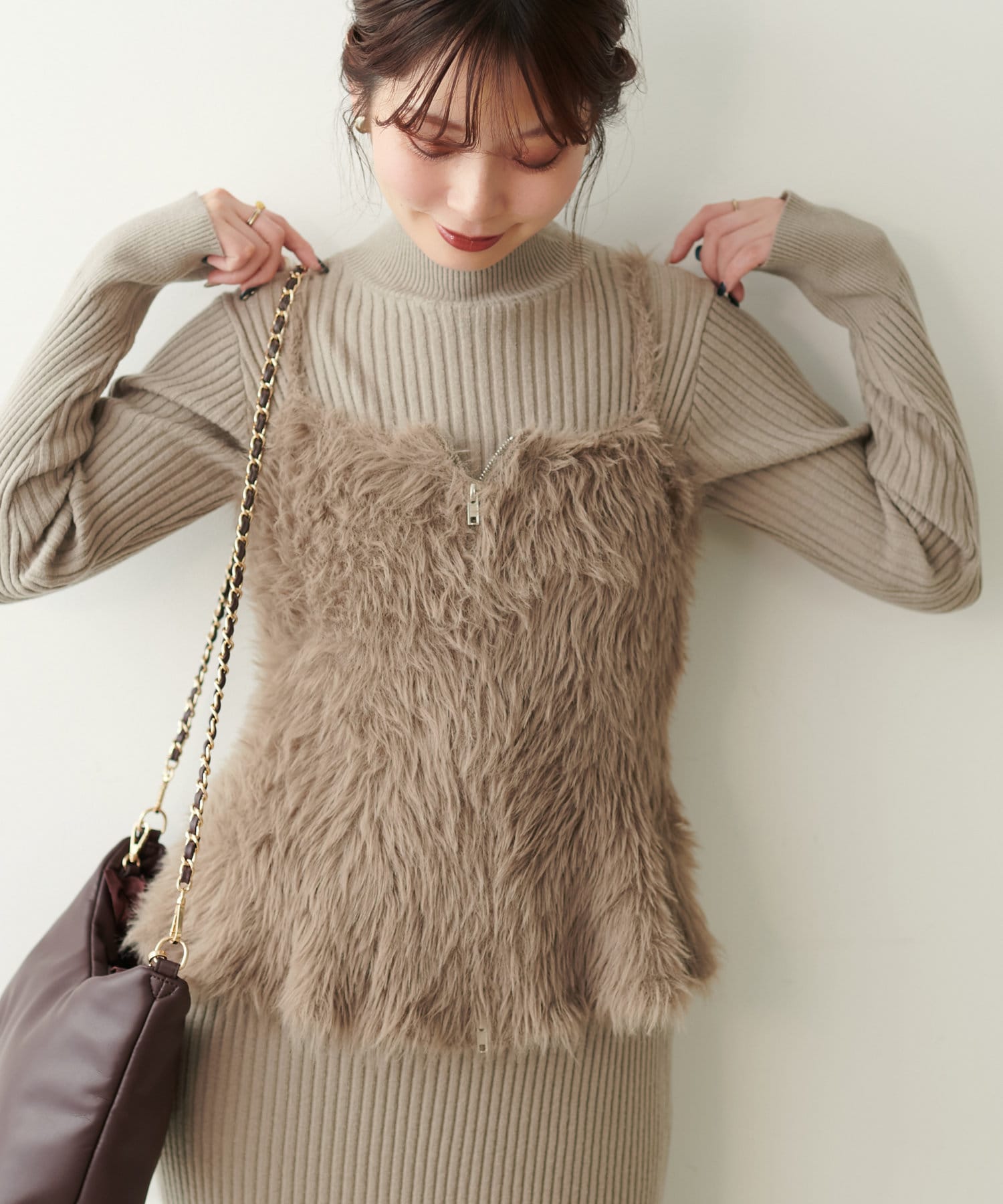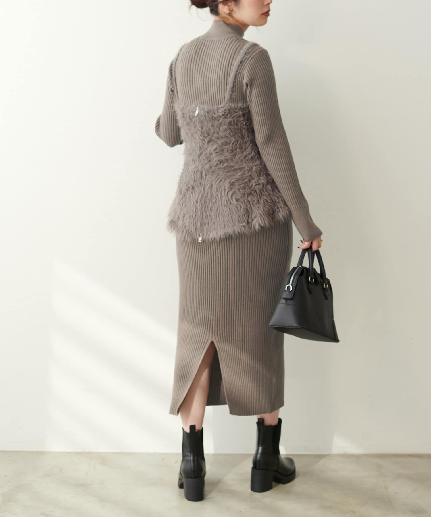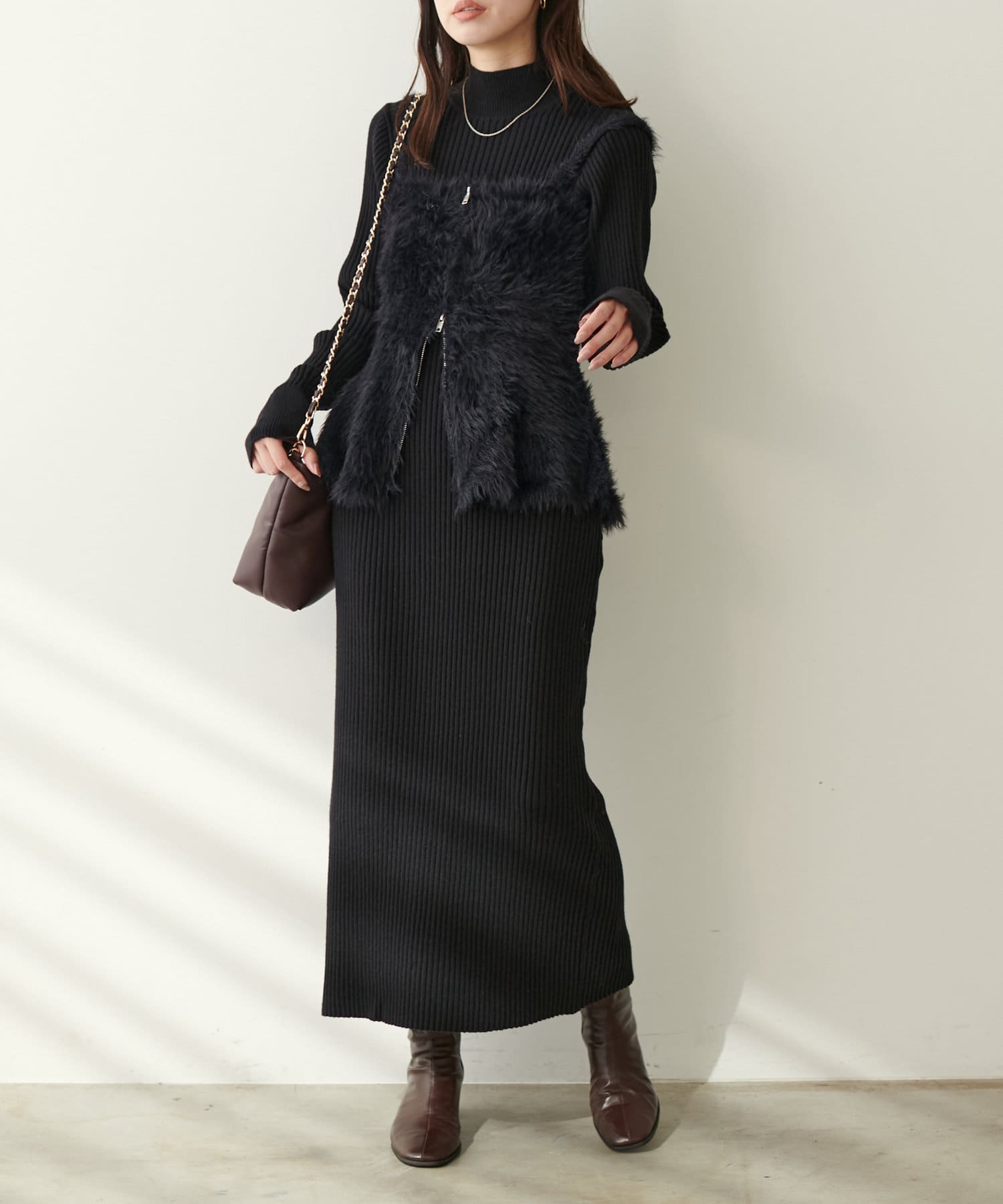秋冬の定番人気アイテムのリブニットワンピース×フェザーベストから、ベストがペプラムビスチェになって再登場!