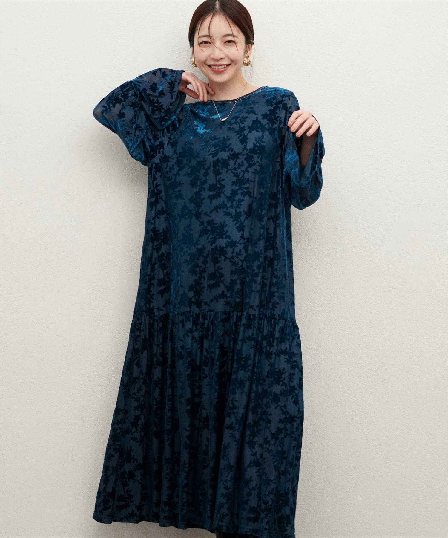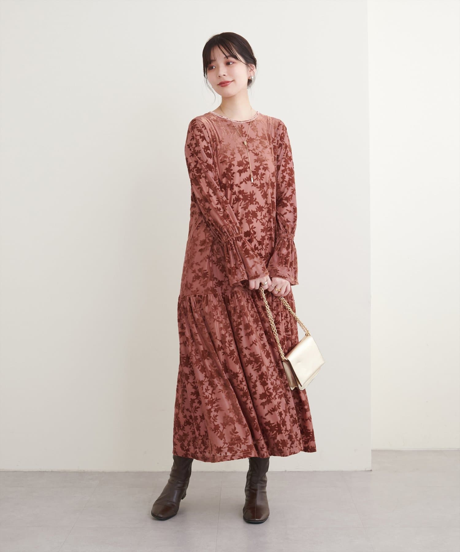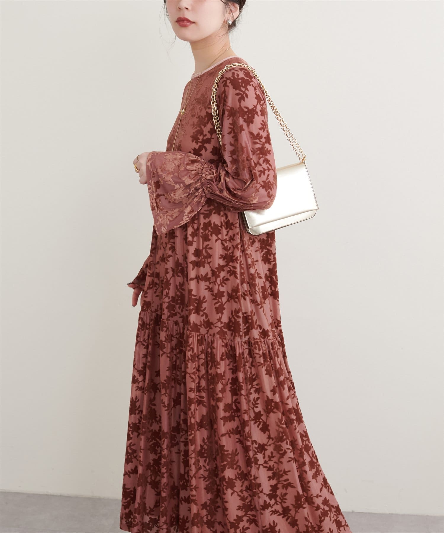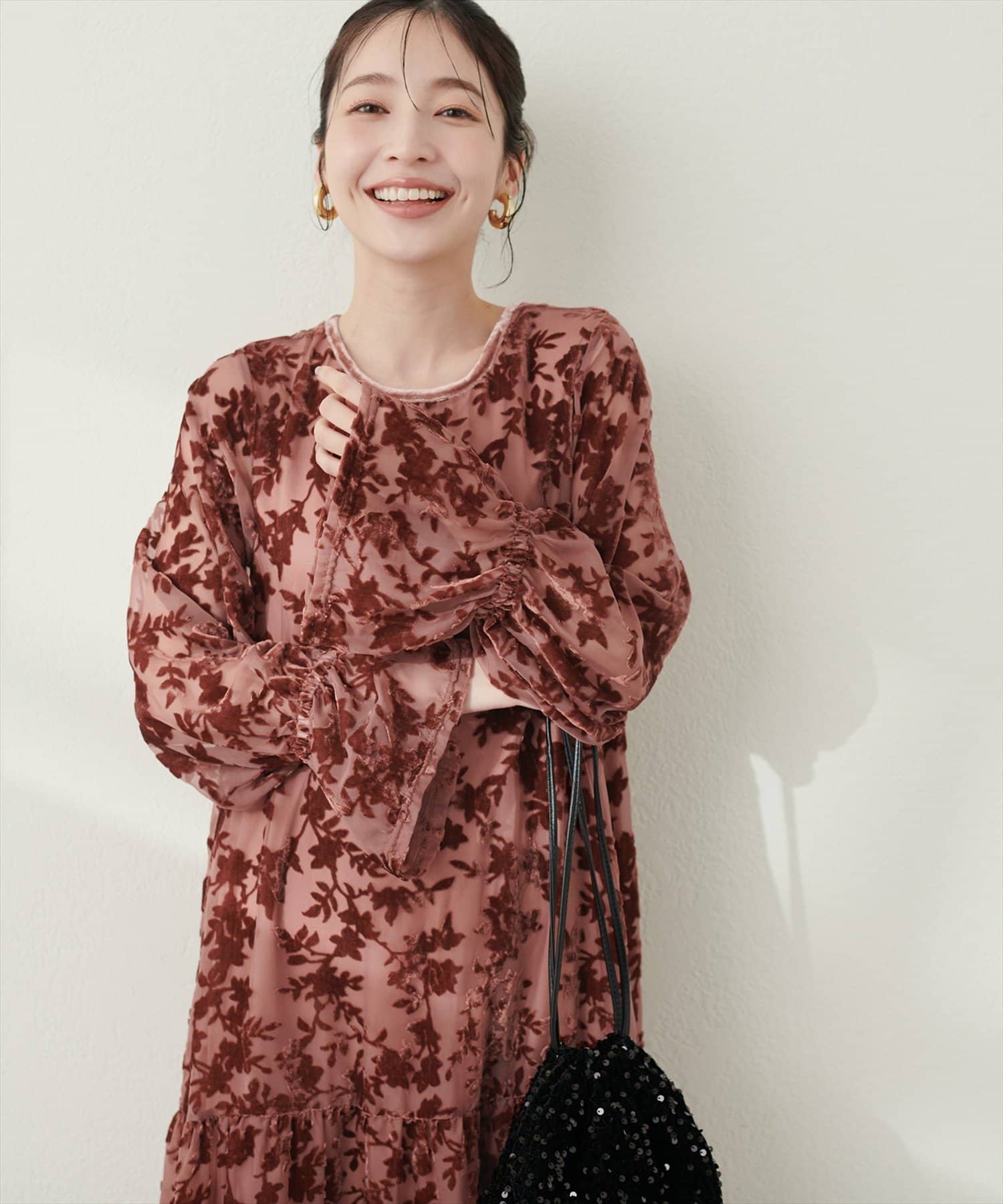 ほんのり光沢感のあるシアー×ベロア生地の高見えワンピース。
