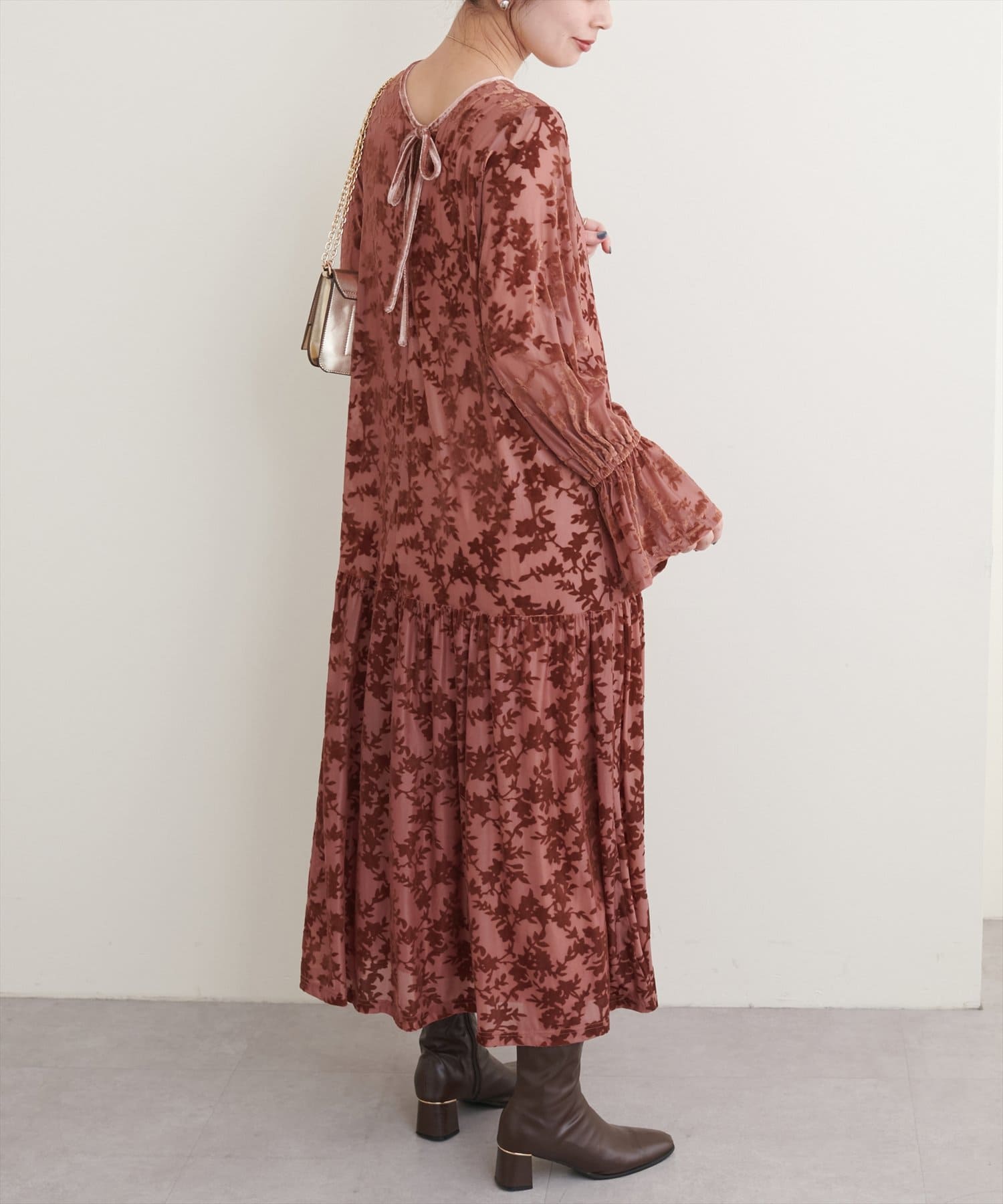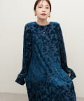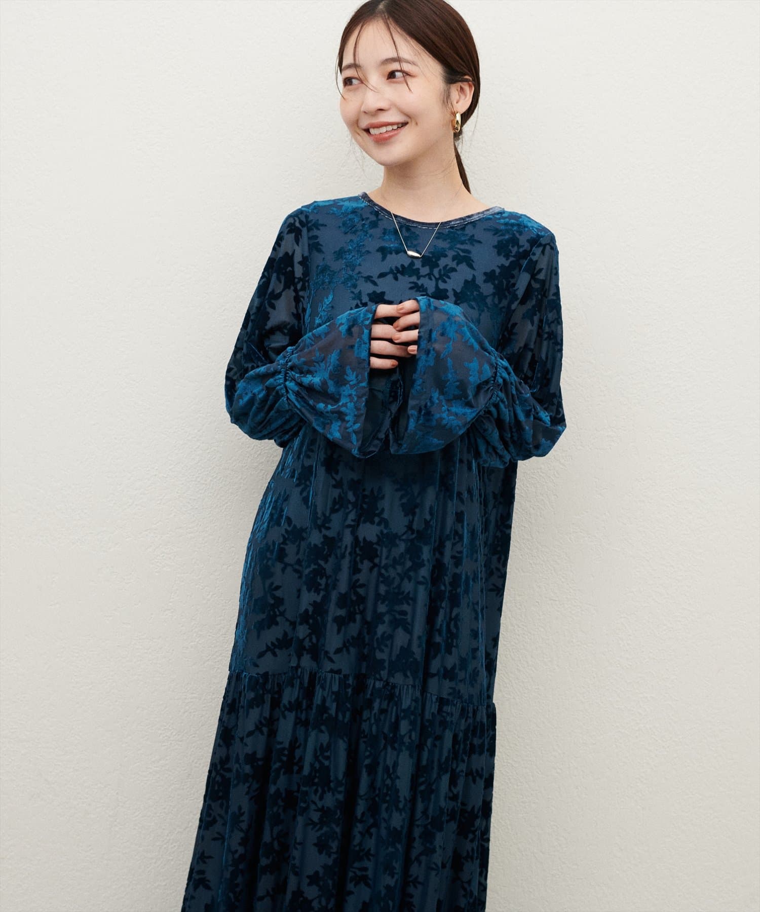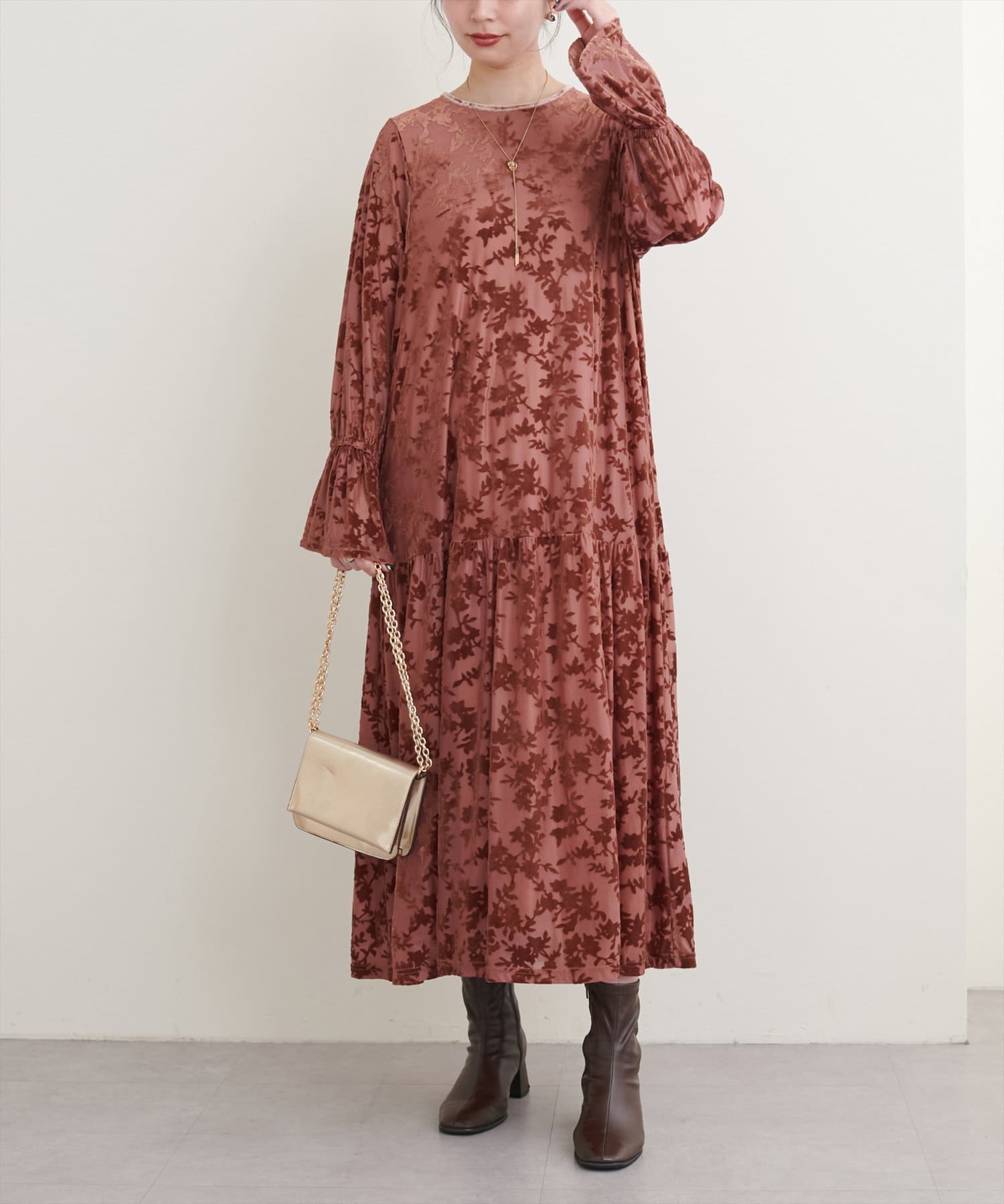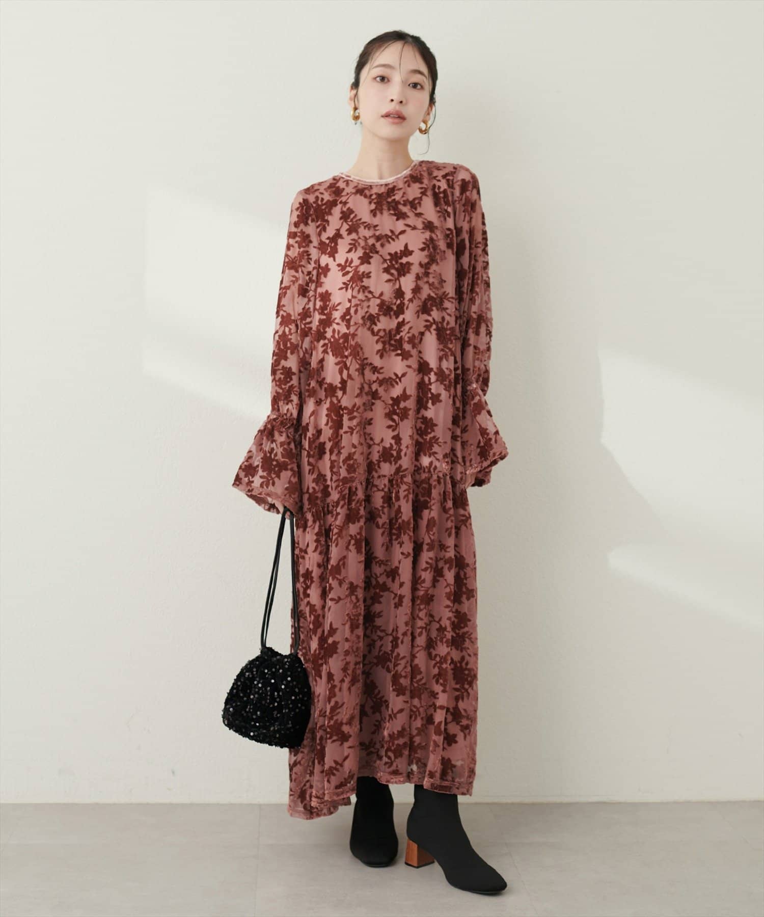 ほんのり光沢感のあるシアー×ベロア生地の高見えワンピース。