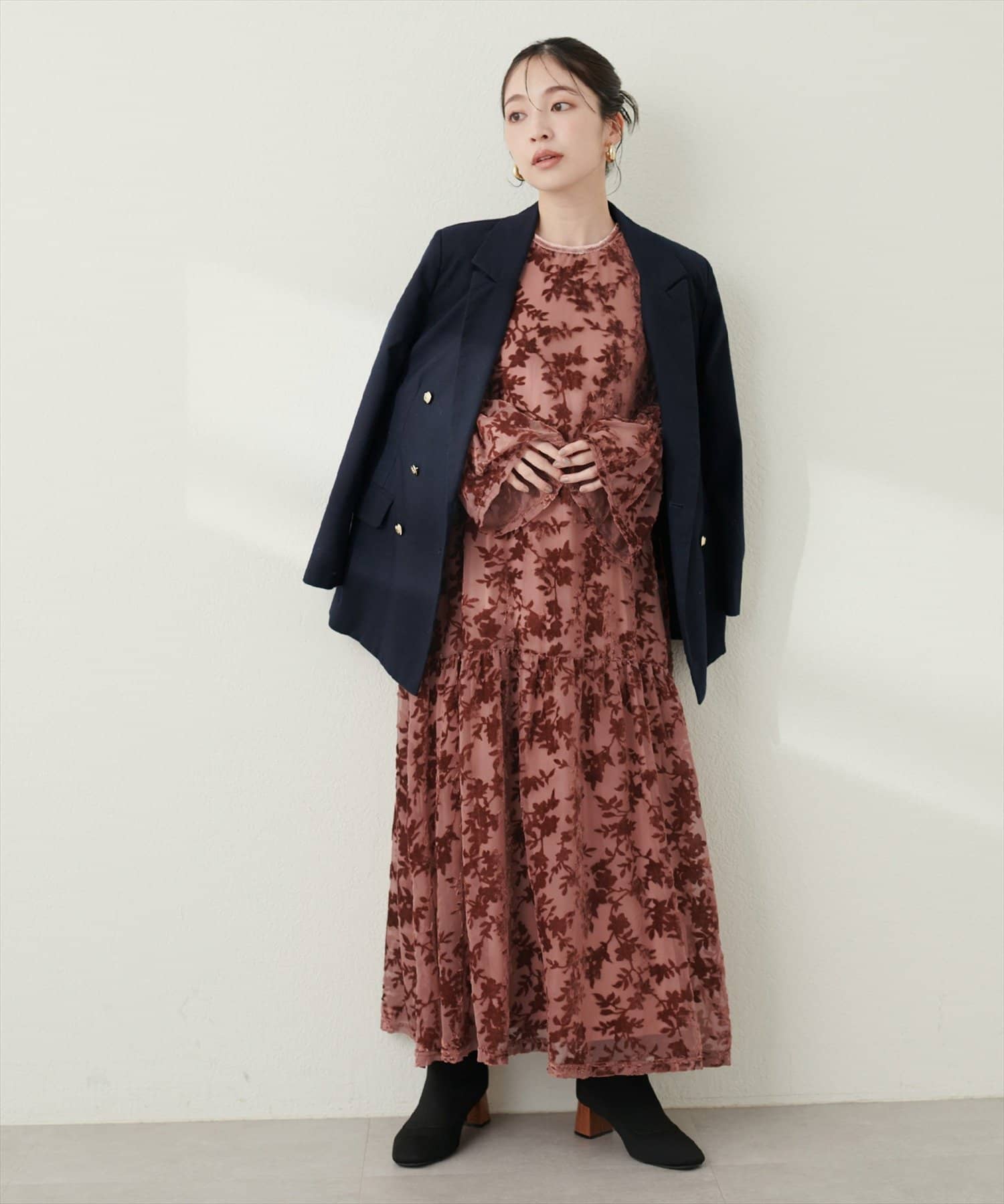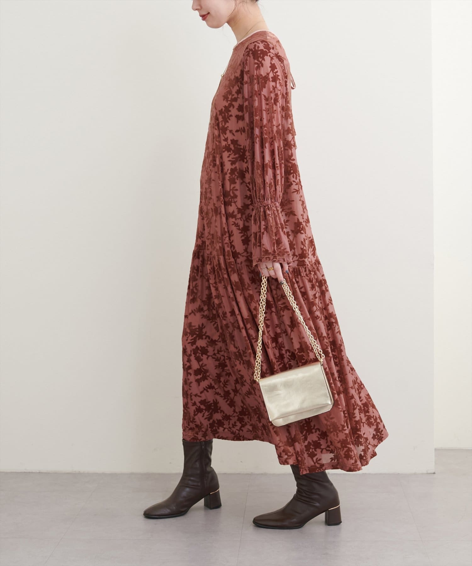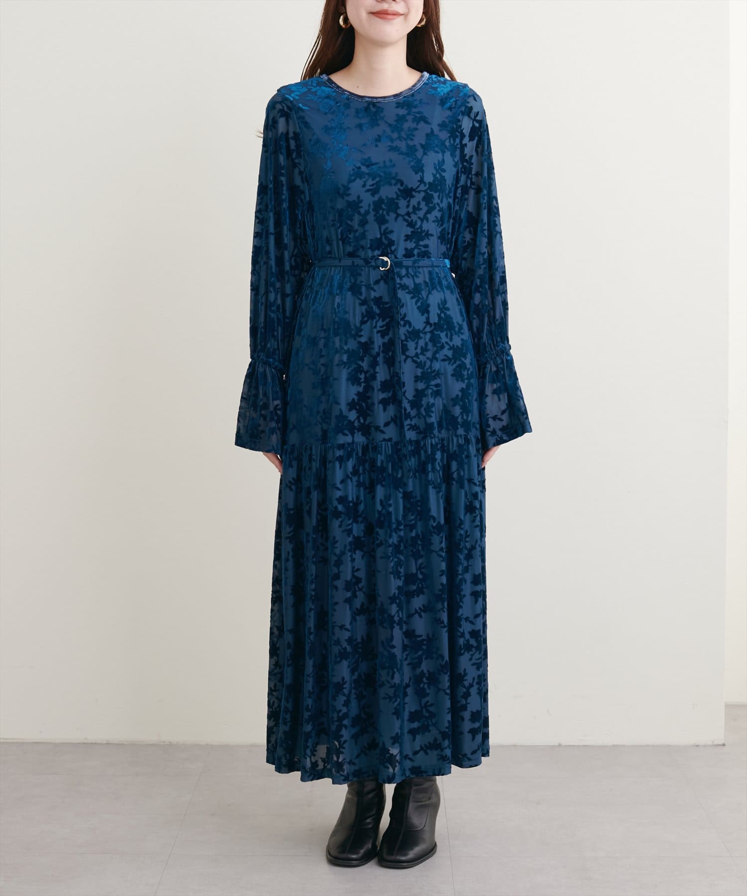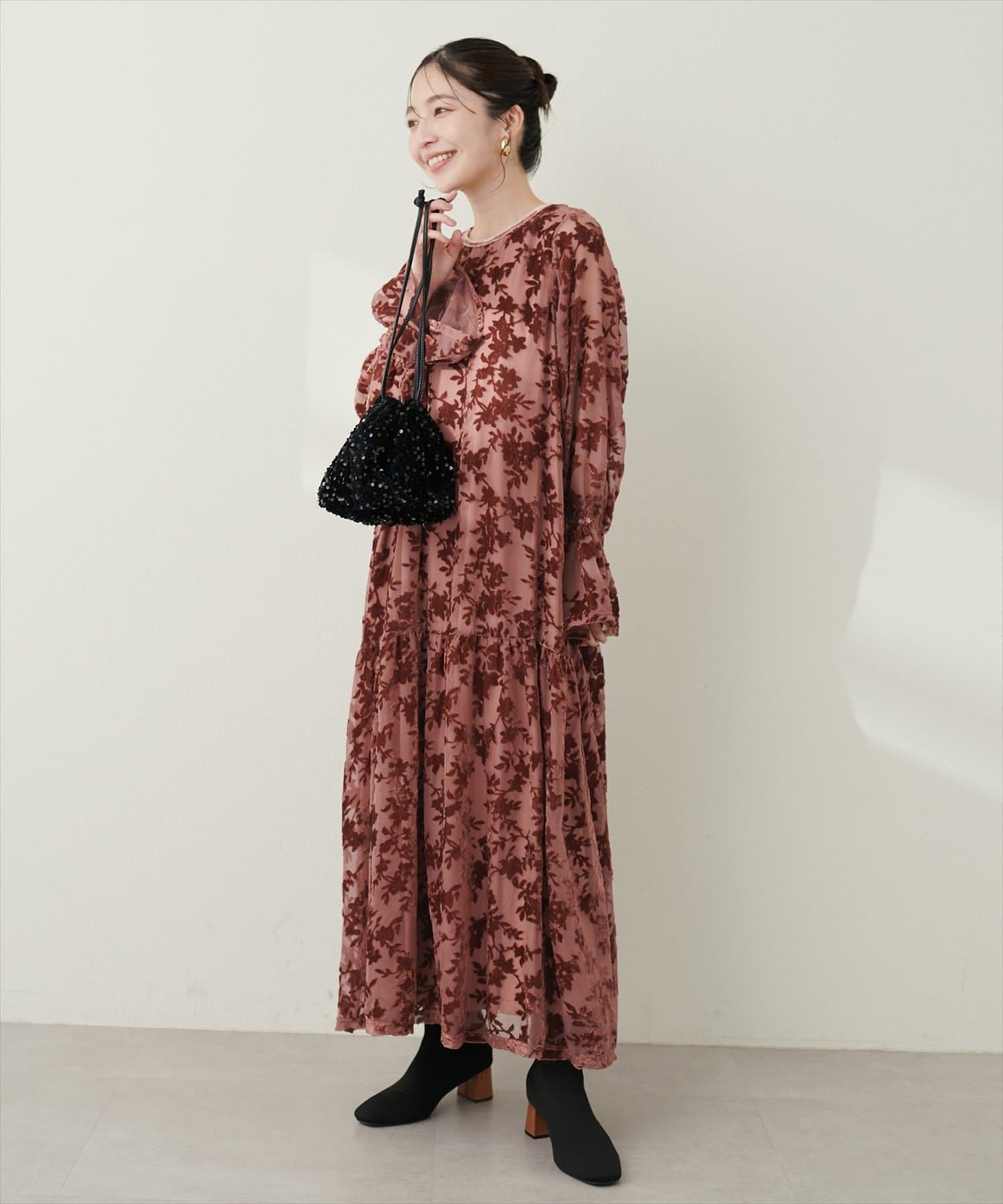 ほんのり光沢感のあるシアー×ベロア生地の高見えワンピース。