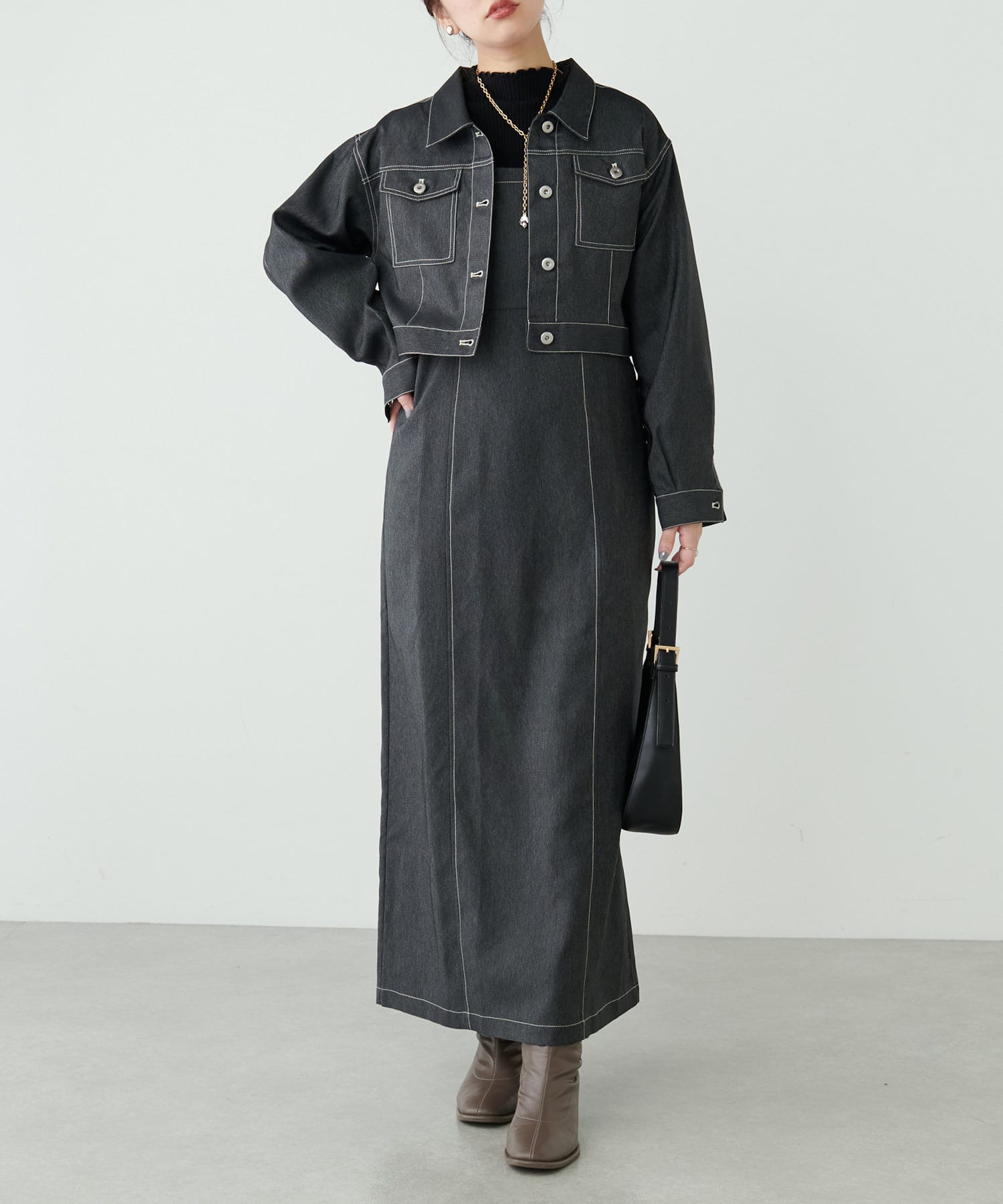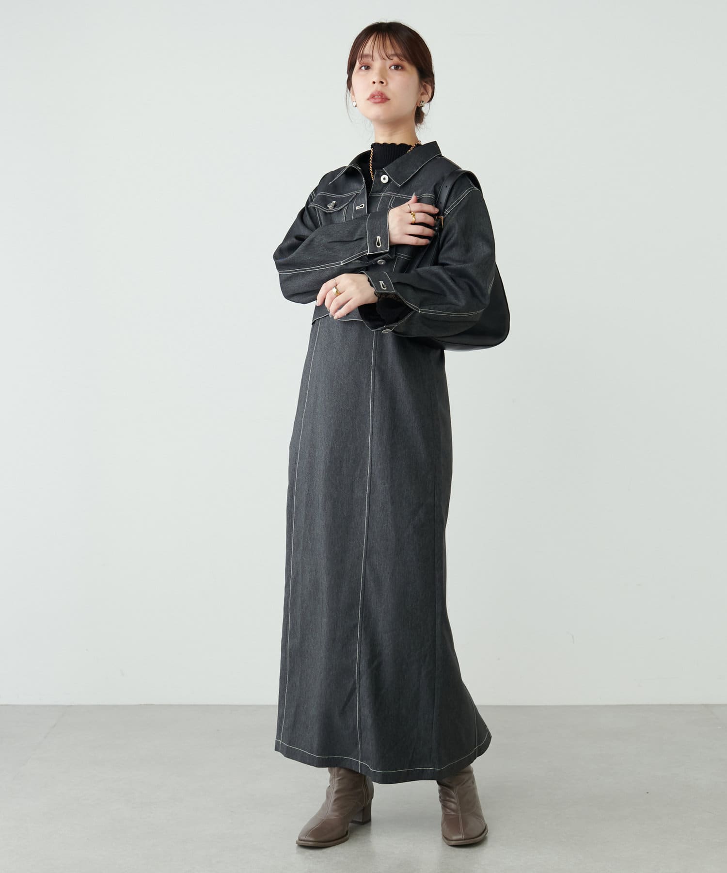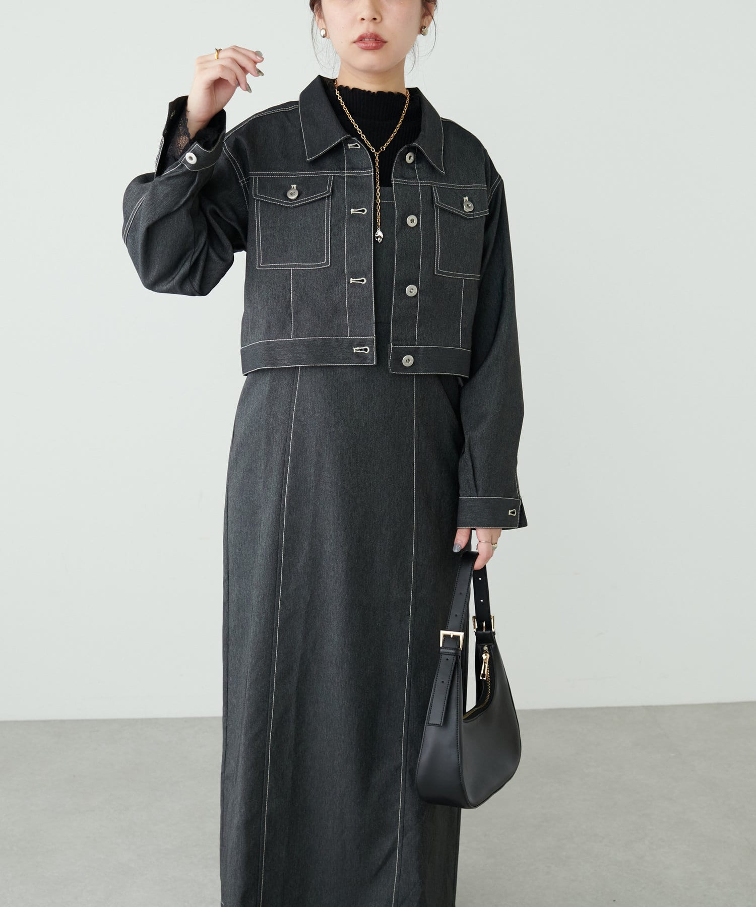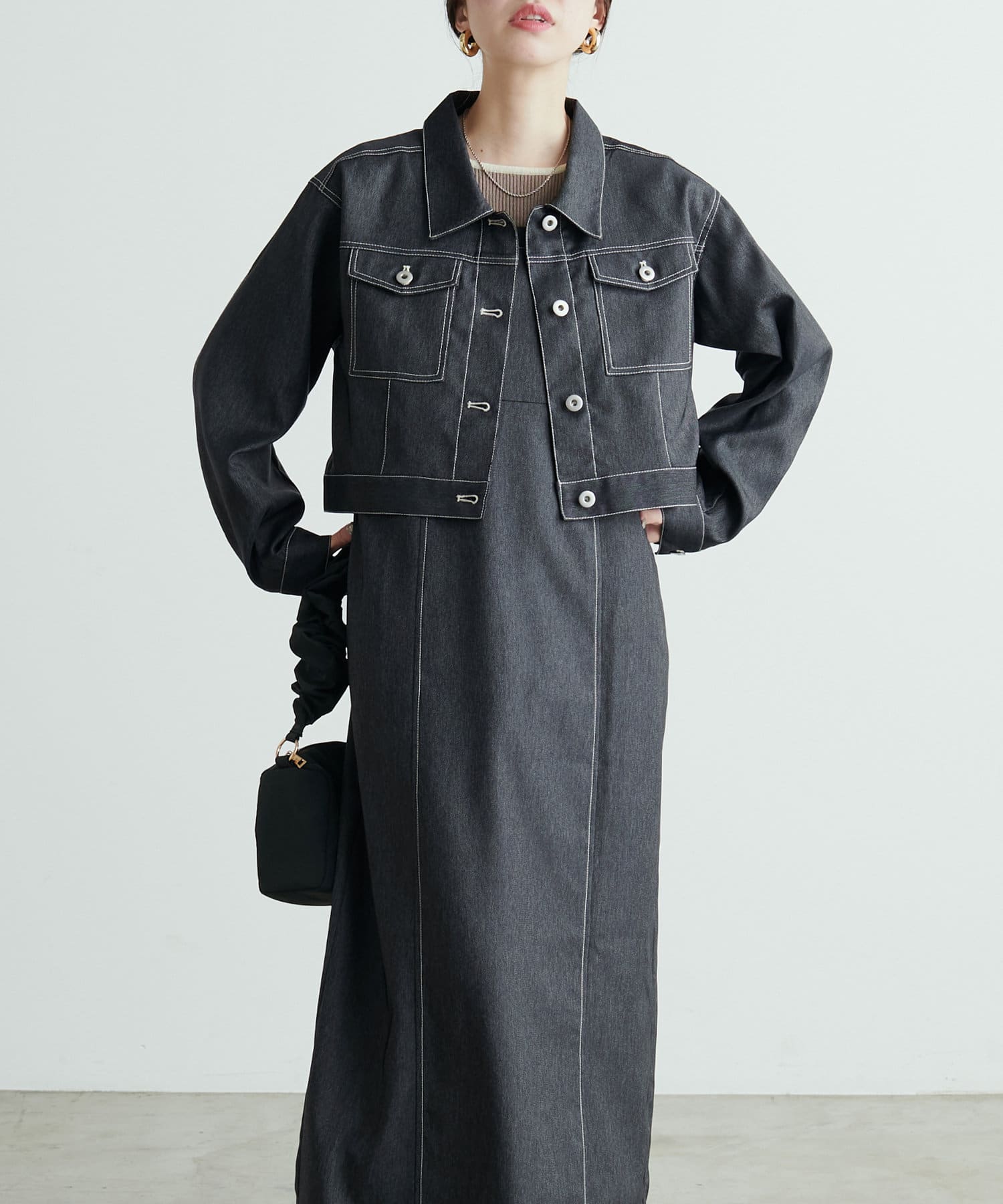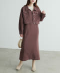 同素材のデニム風ショート丈ブルゾンとセットでお召し頂くと、よりこなれた大人のおでかけスタイルが完成します。