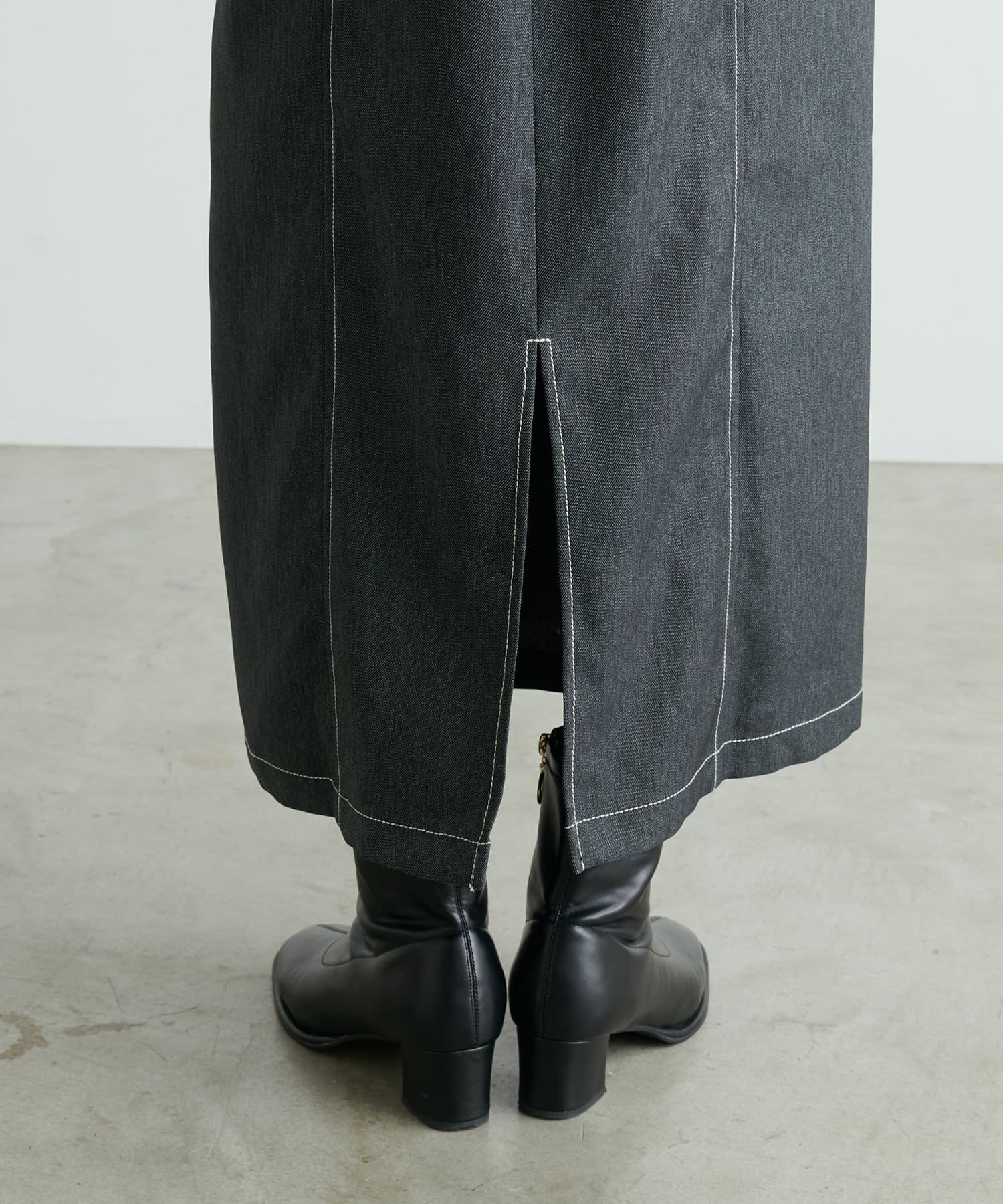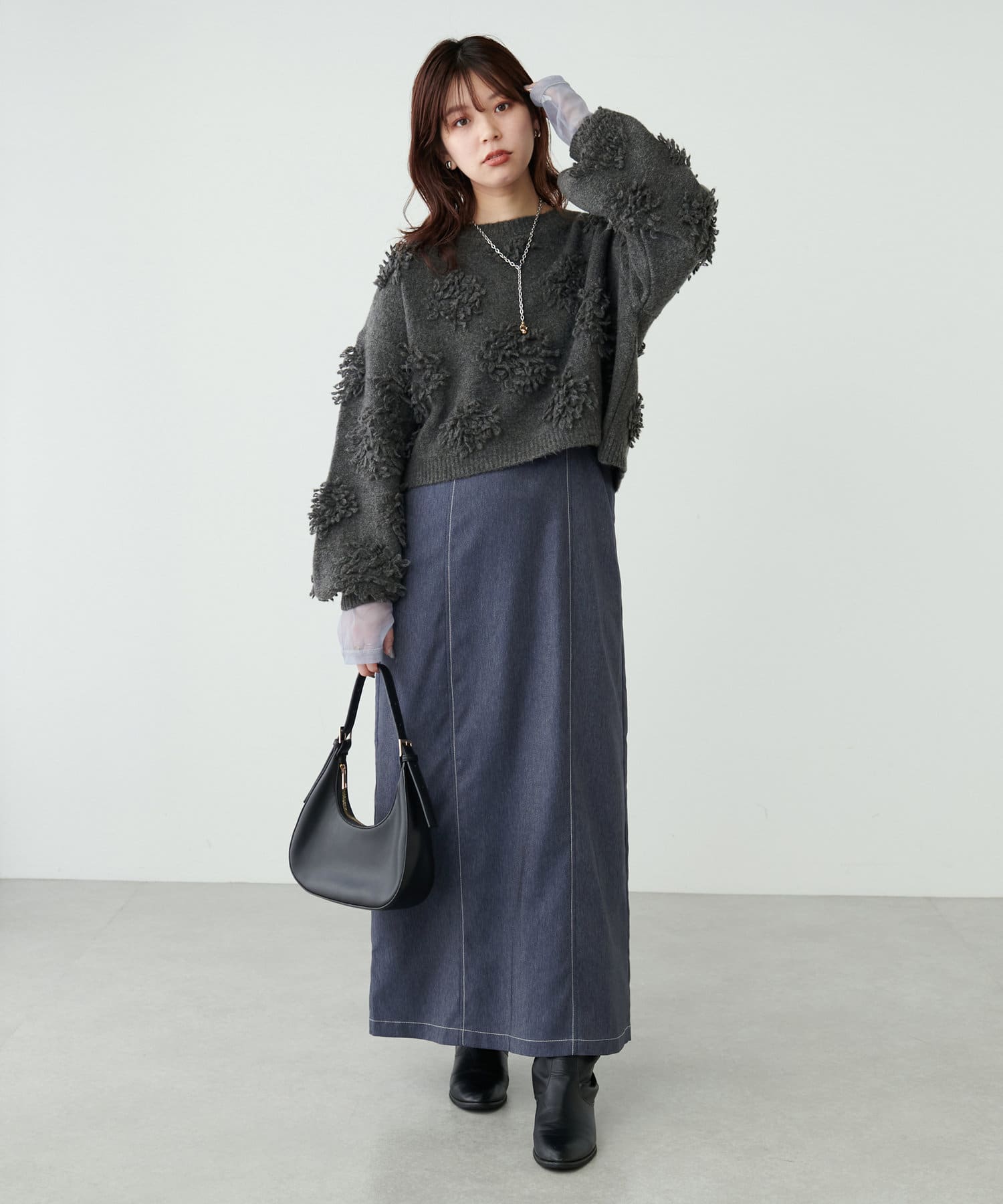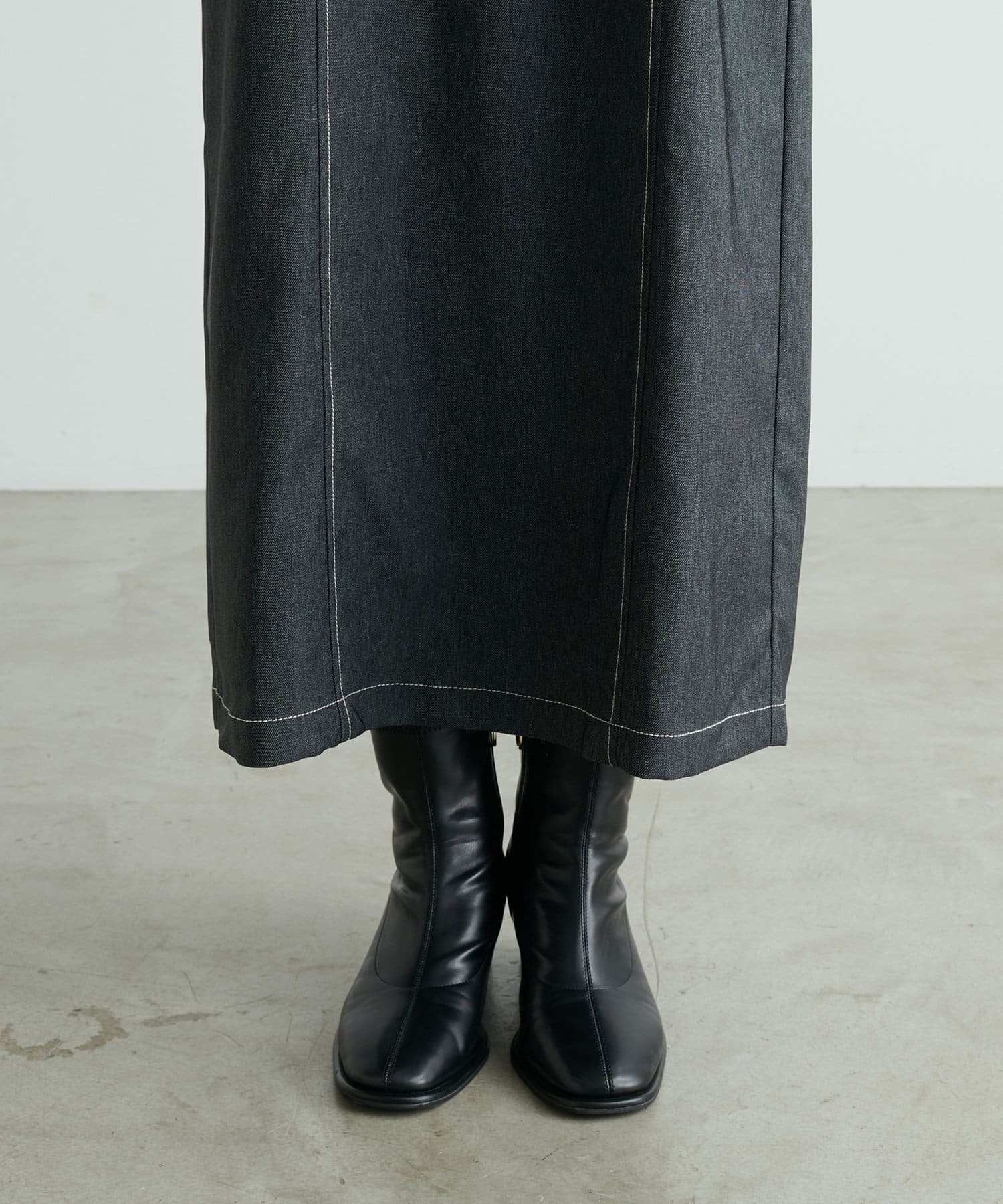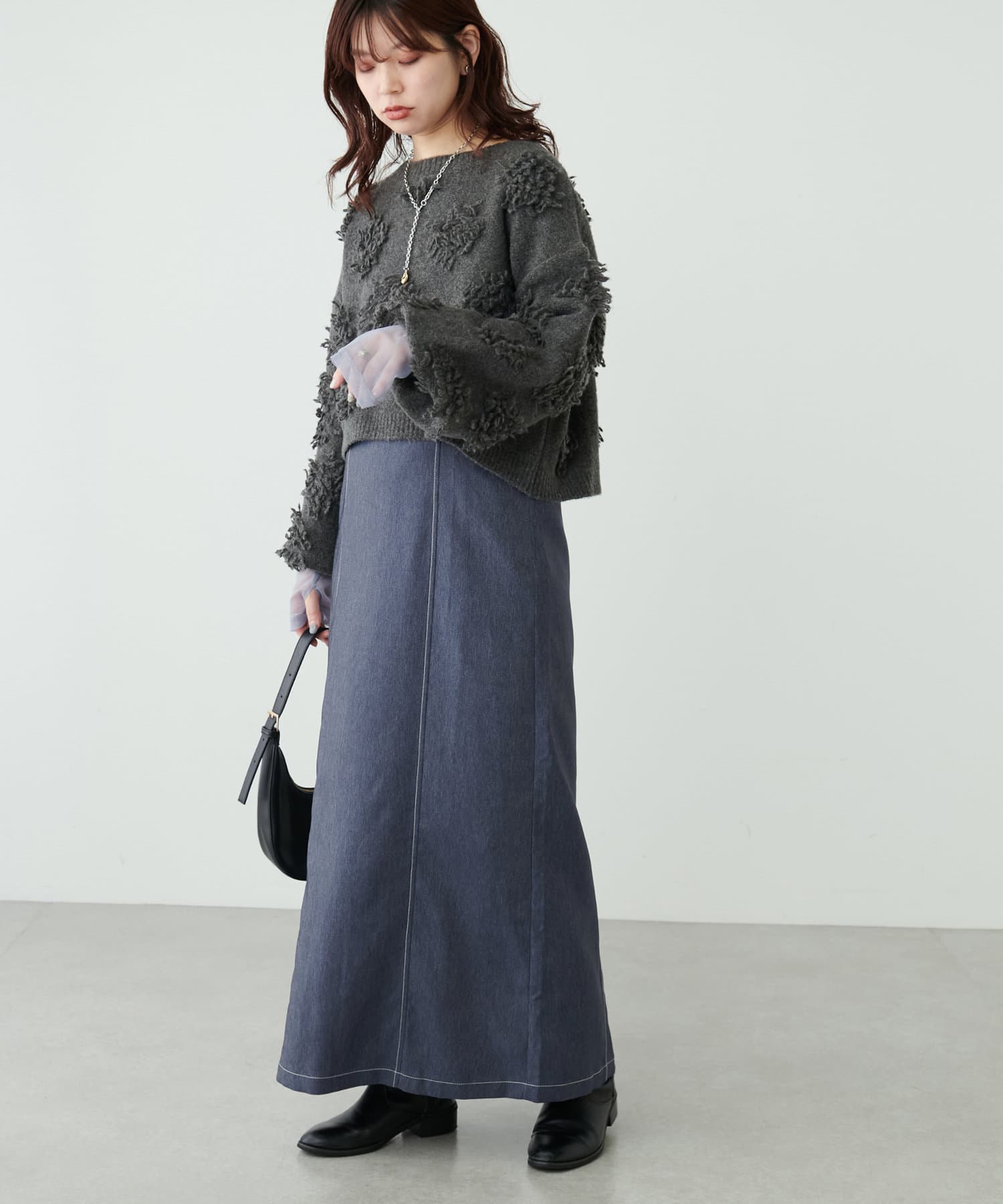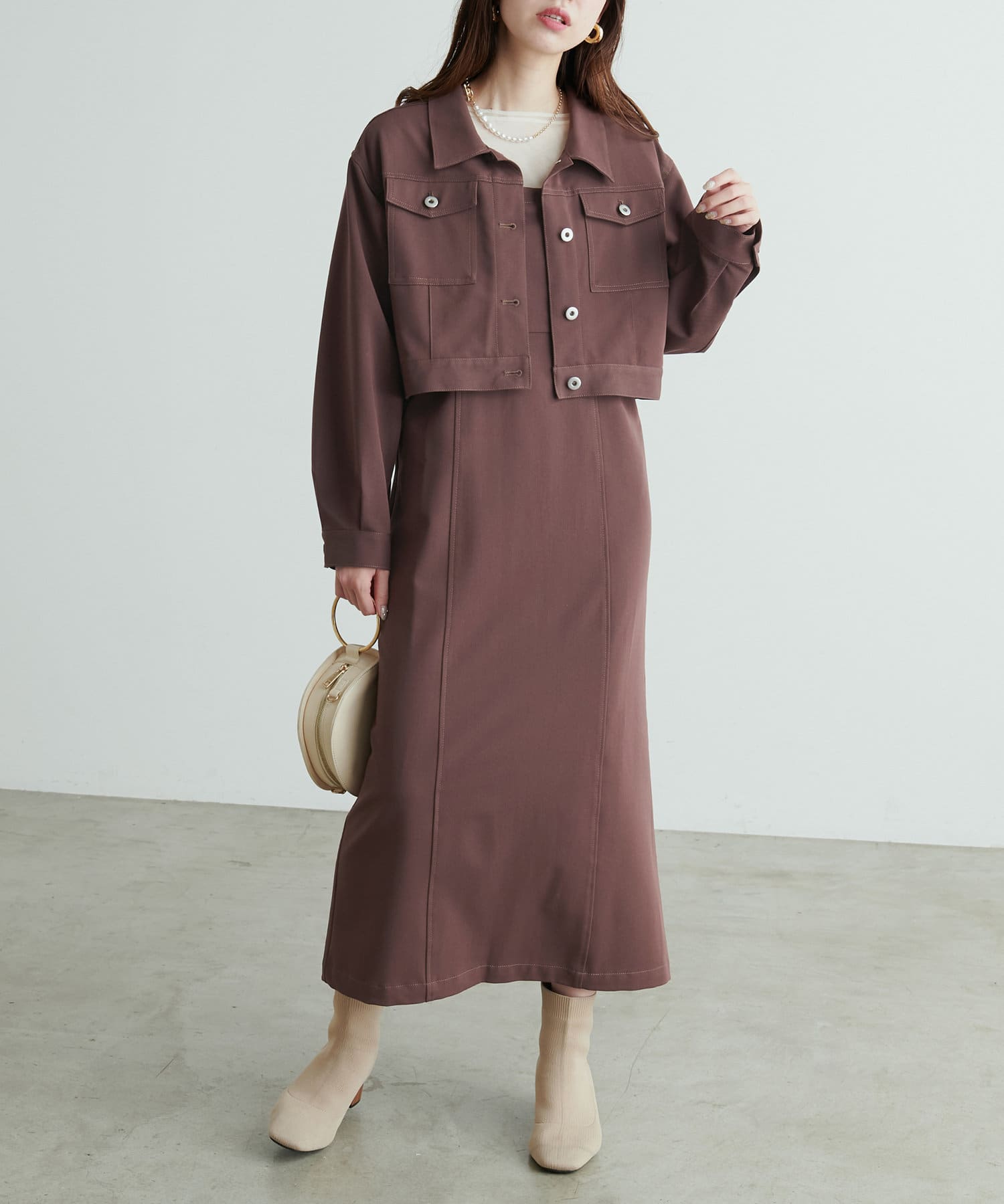 同素材のデニム風ショート丈ブルゾンとセットでお召し頂くと、よりこなれた大人のおでかけスタイルが完成します。