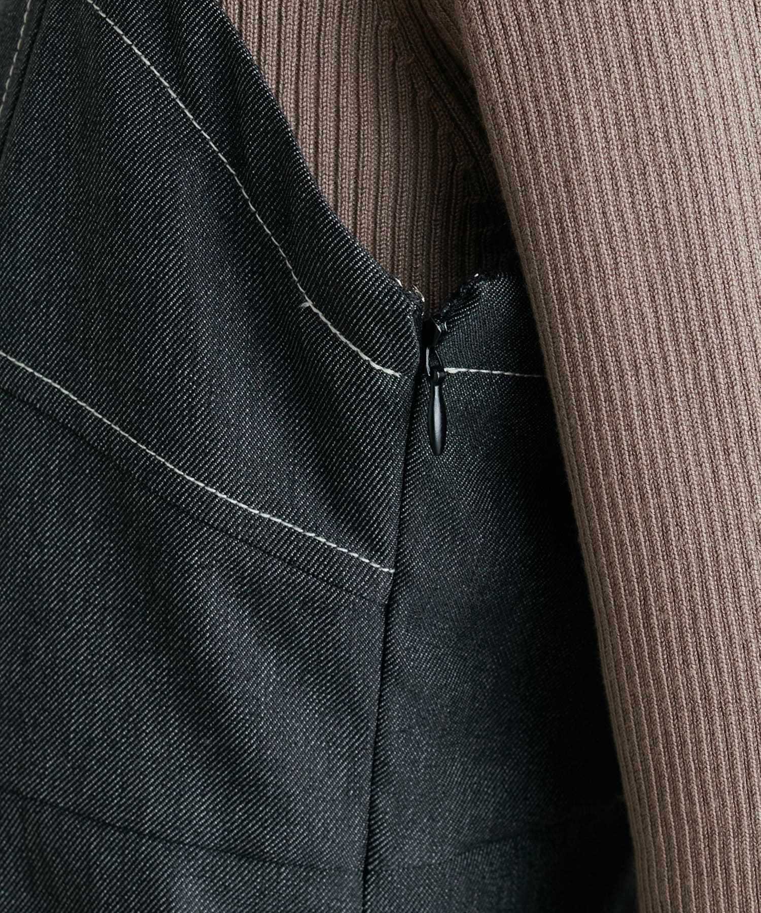肌寒い時季には身体に優しくフィットするリブニットを、暖かい時期はトレンドのシアートップスを合わせるも◎