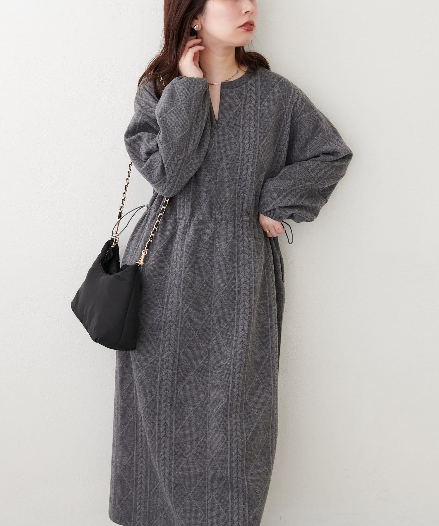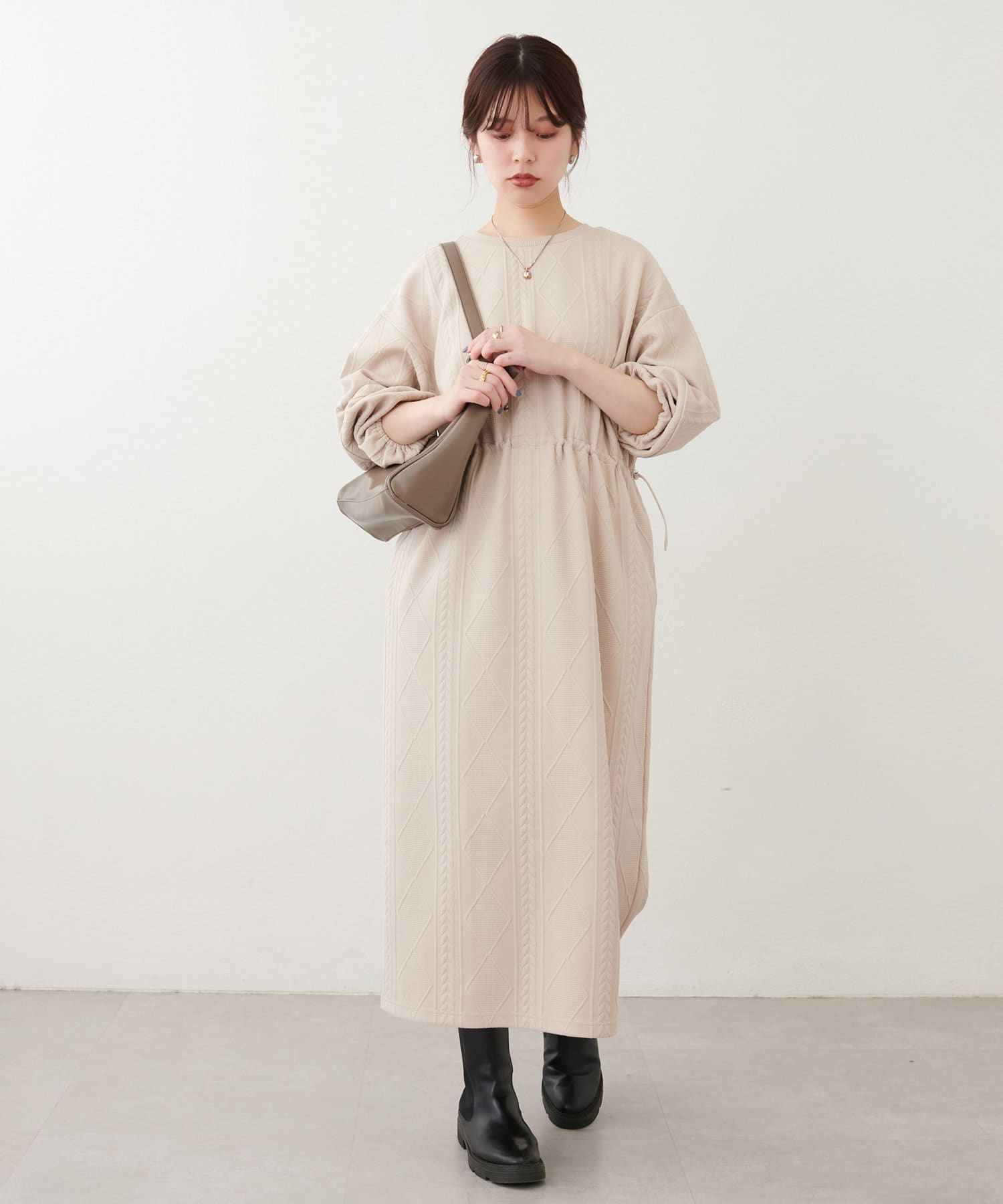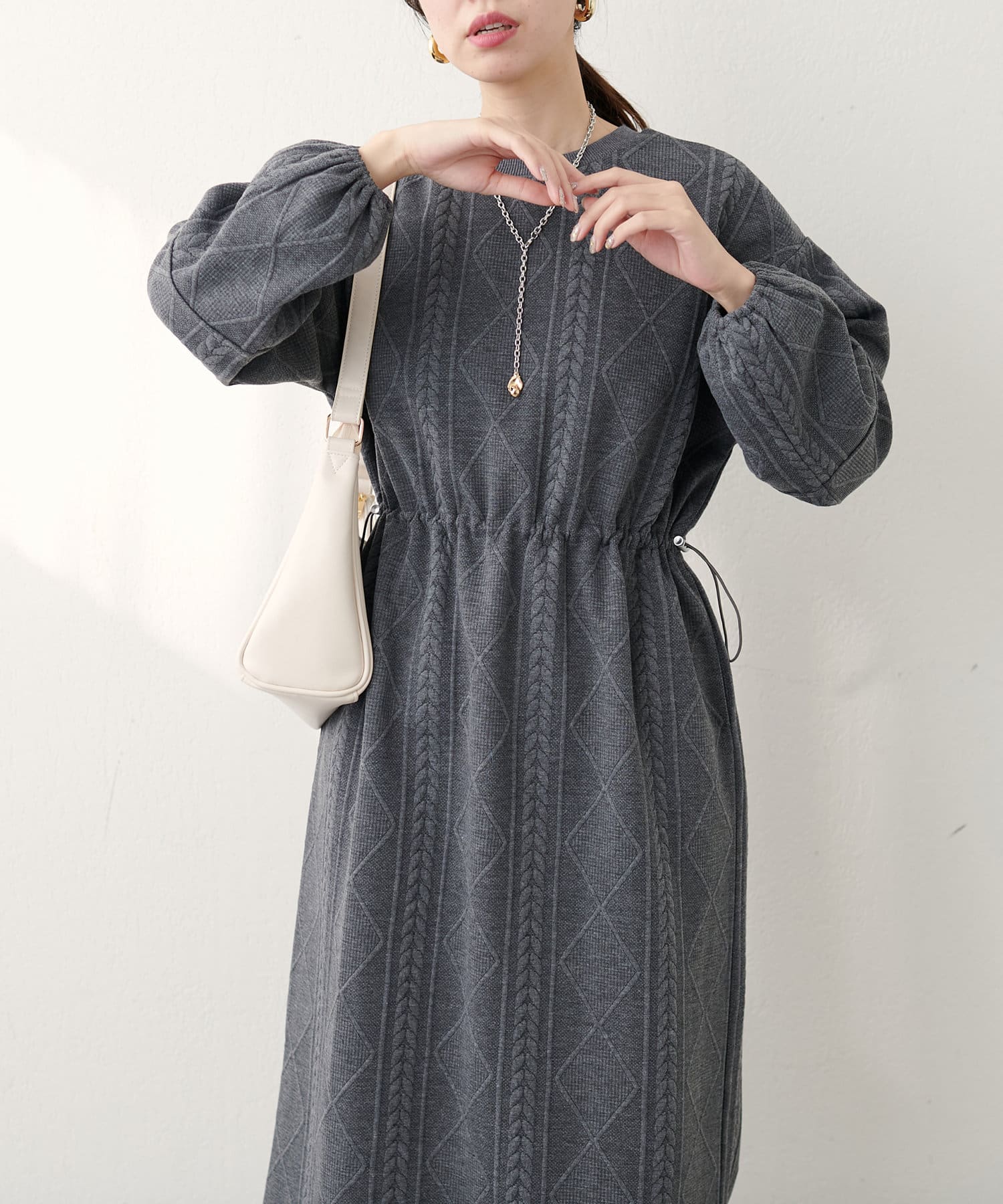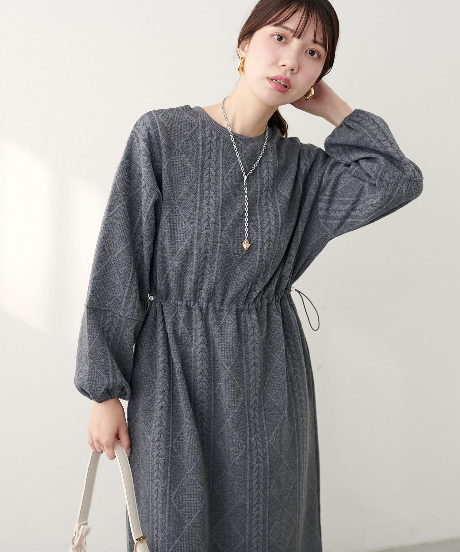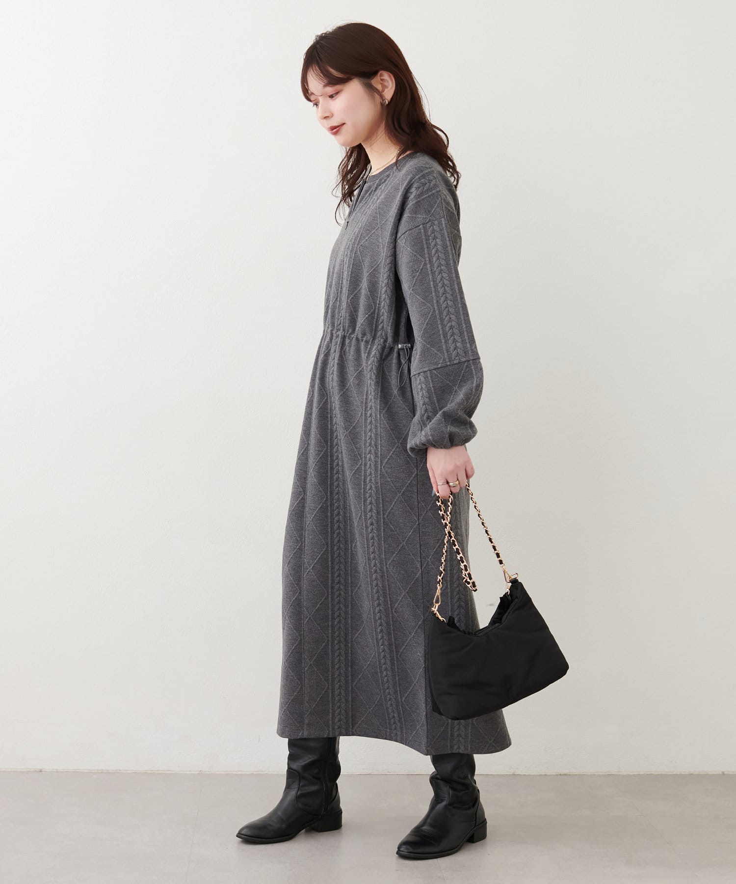 ウエストのドロストデザインと、まるでアランニットのような立体感のある柄がトレンドライクなmamamoのリバイバルワンピース。