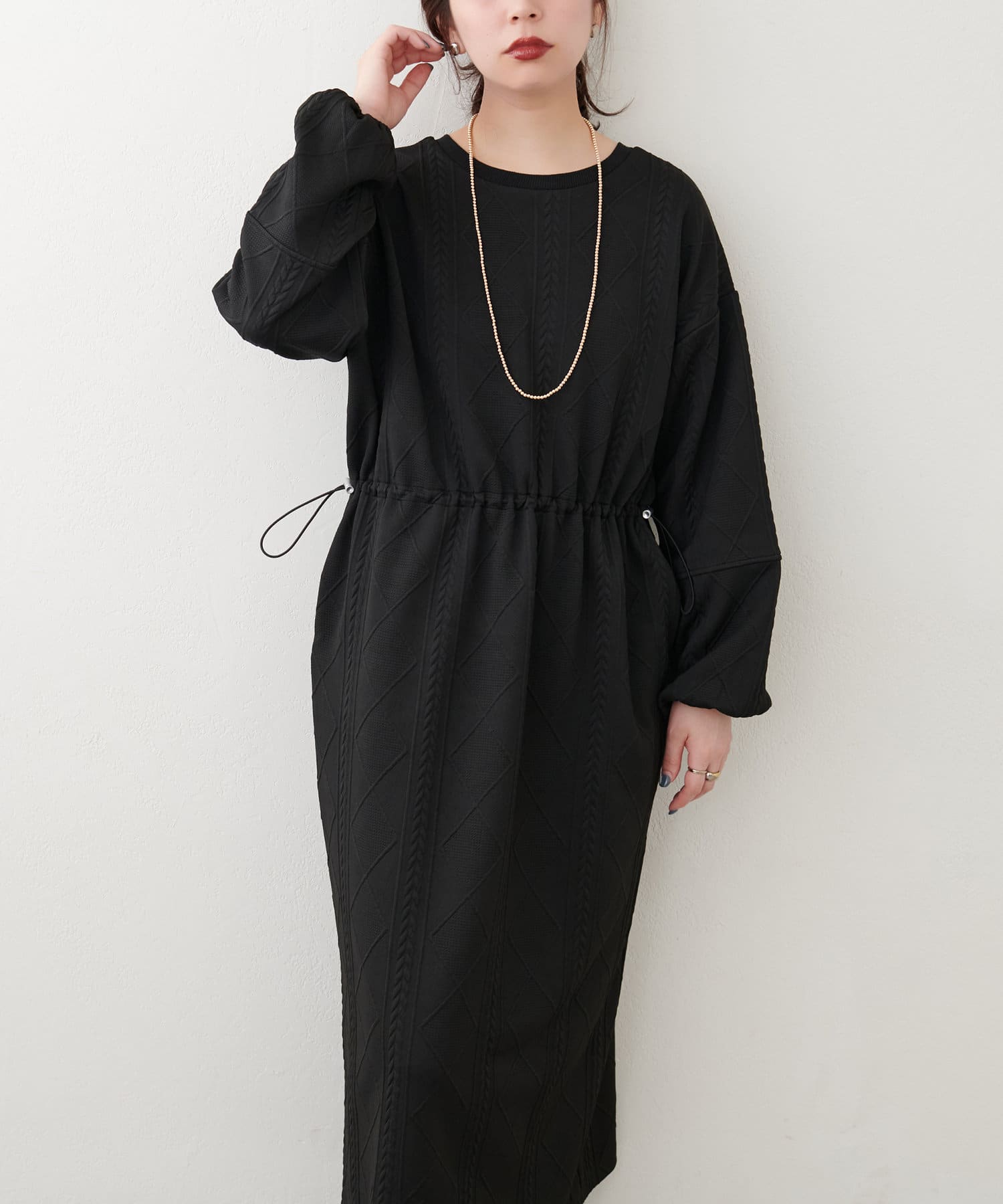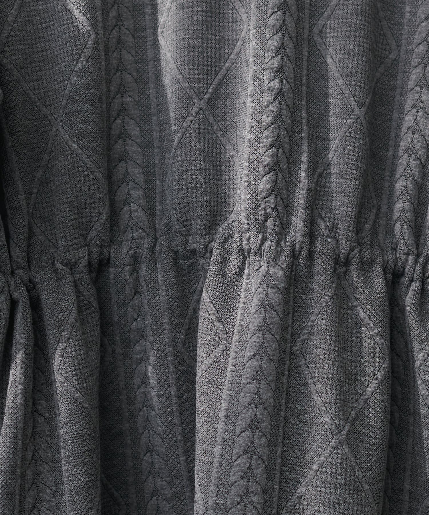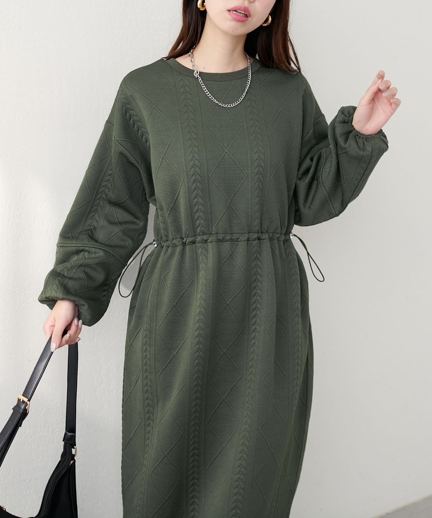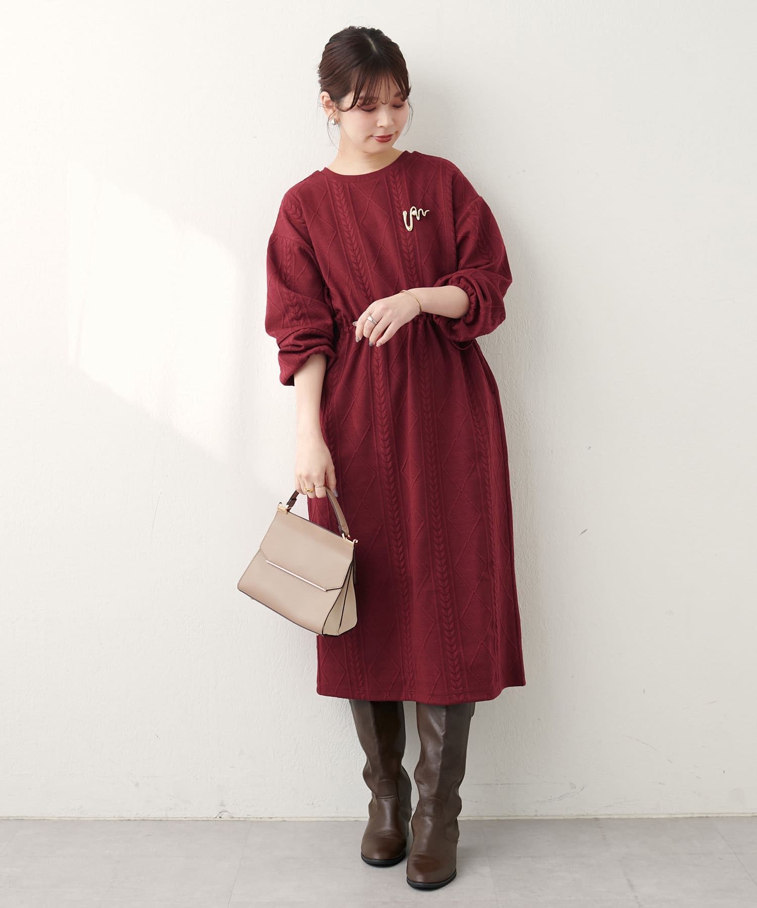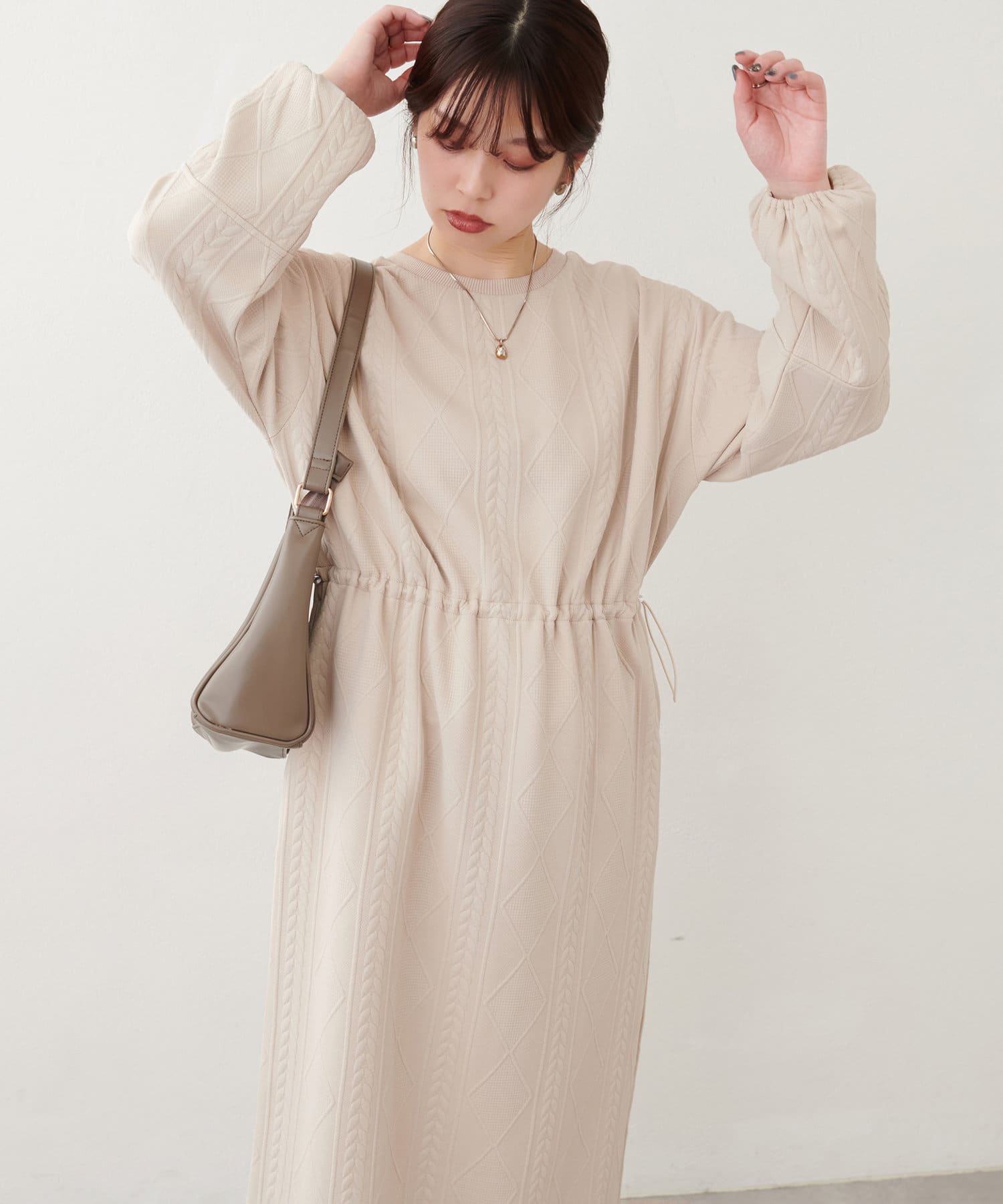 ウエストのドロストデザインと、まるでアランニットのような立体感のある柄がトレンドライクなmamamoのリバイバルワンピース。