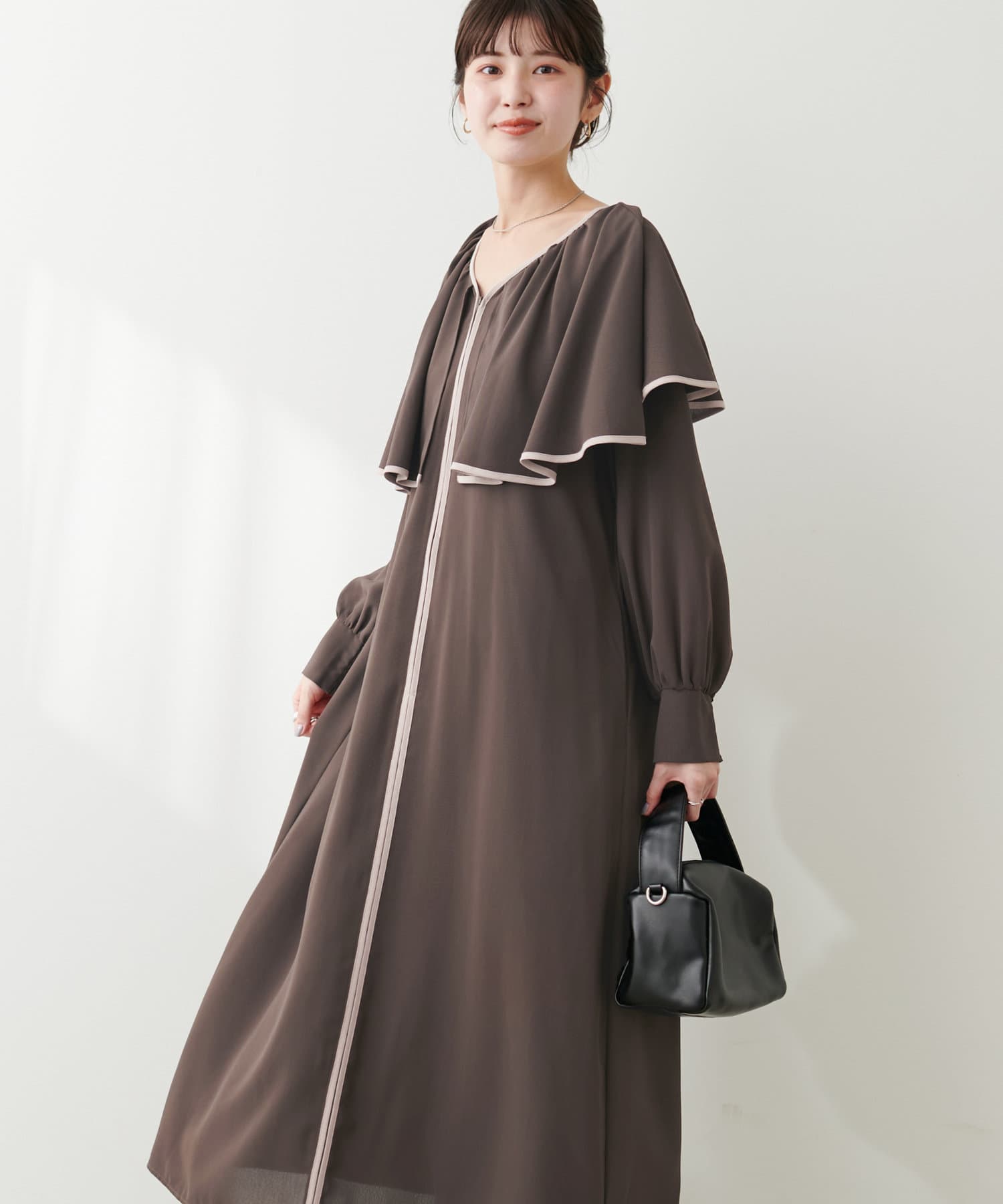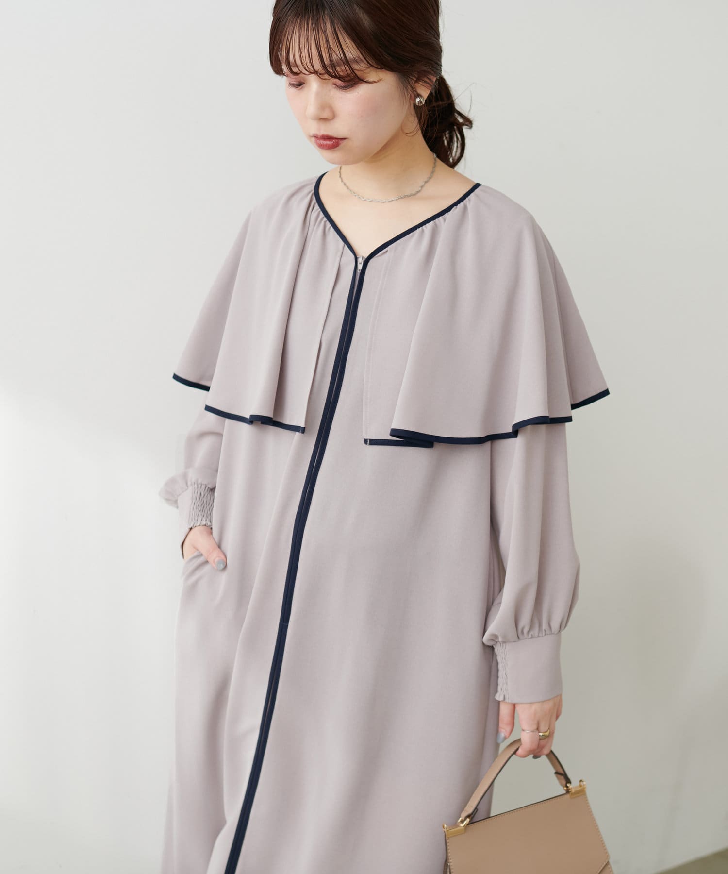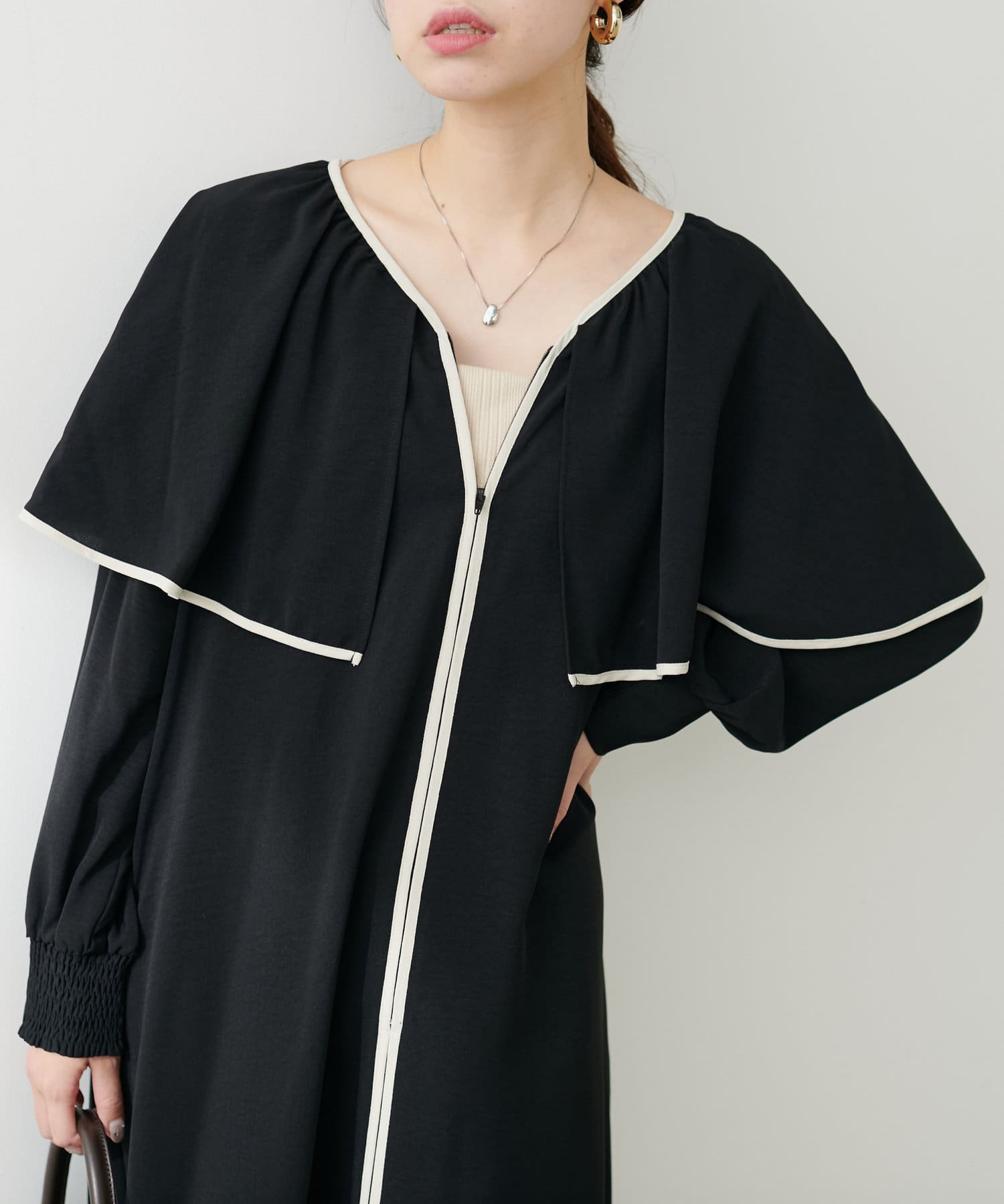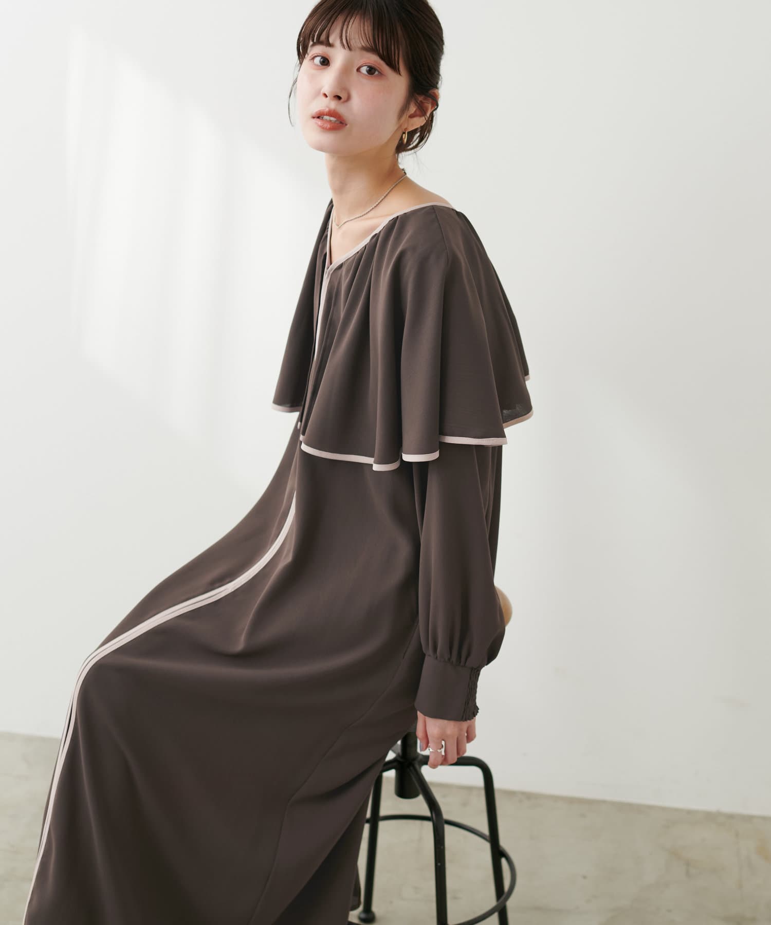 ケープデザインの衿元は、1枚で着ても可愛く、カーディガンと合わせて衿を出したスタイリングも◎