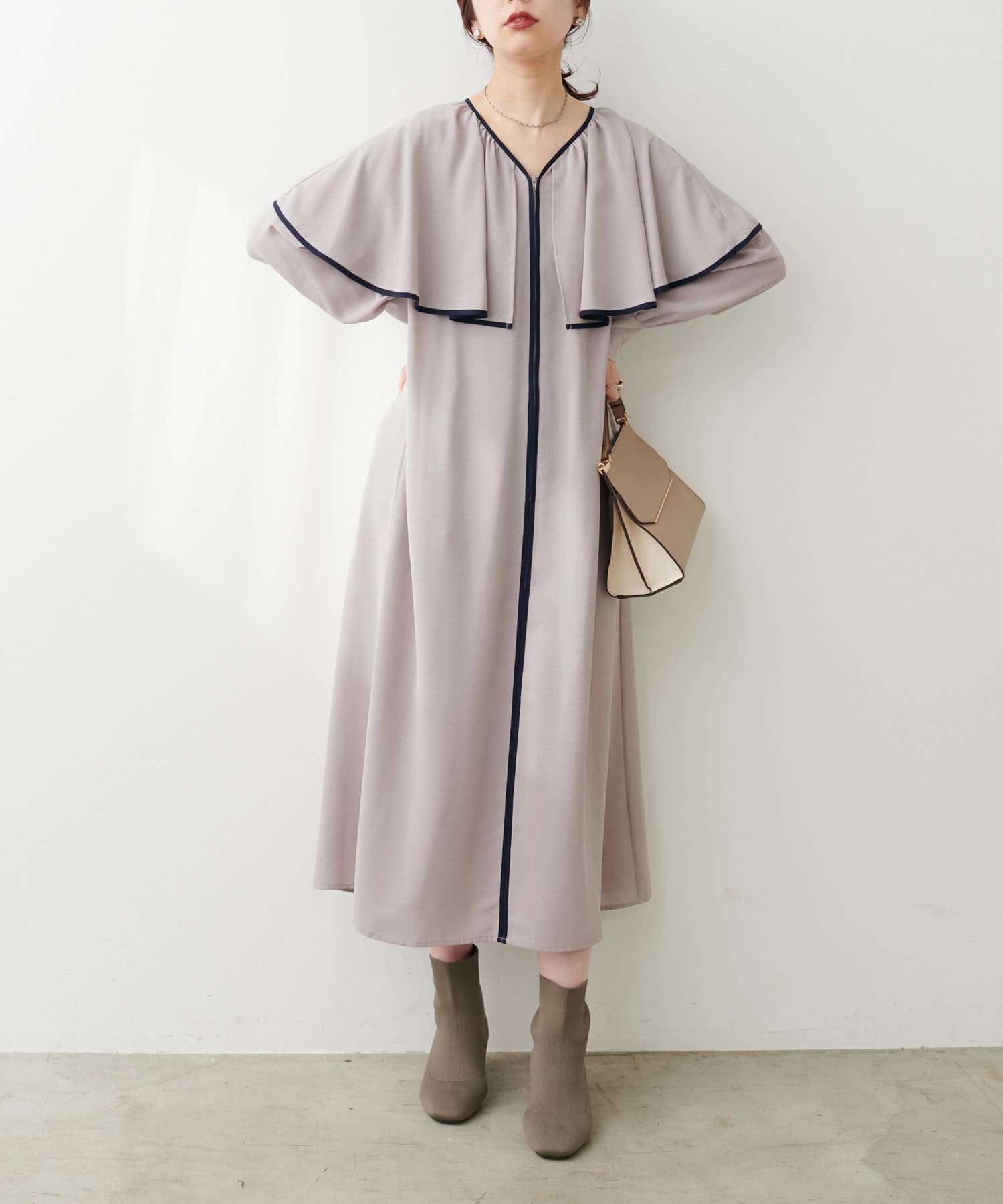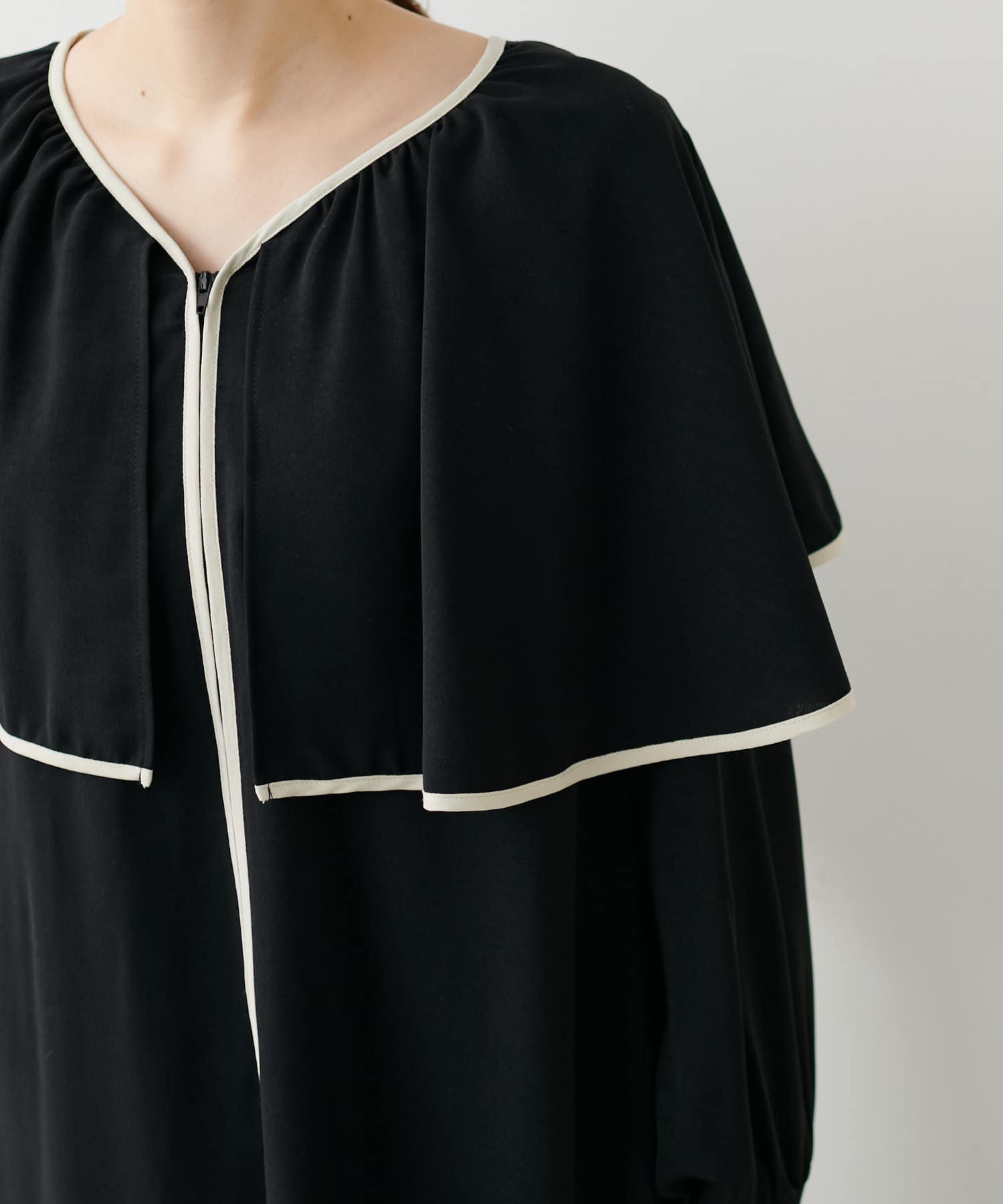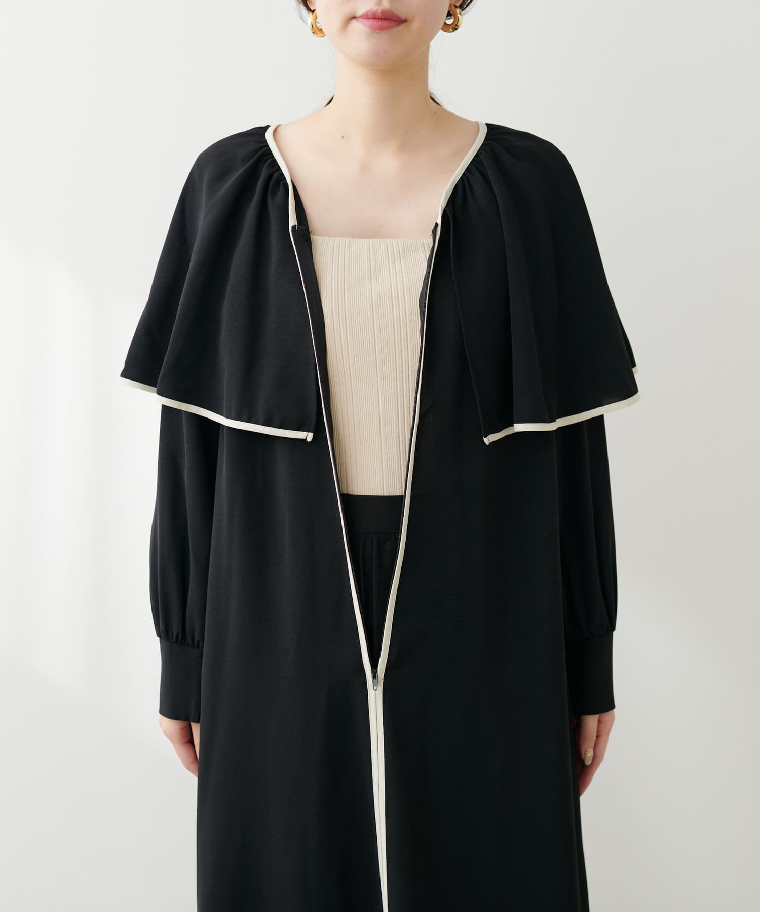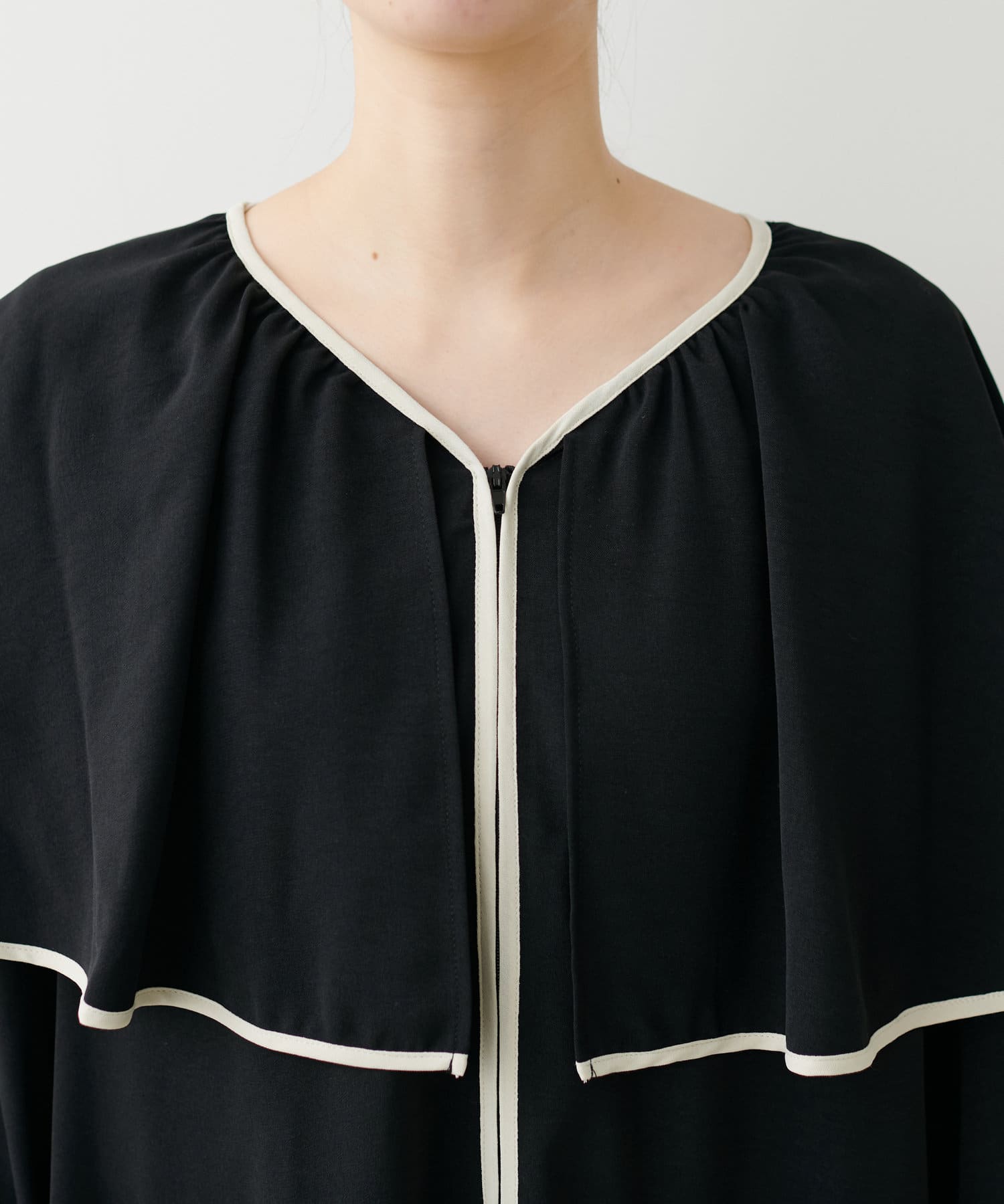 ケープデザインの衿元は、1枚で着ても可愛く、カーディガンと合わせて衿を出したスタイリングも◎