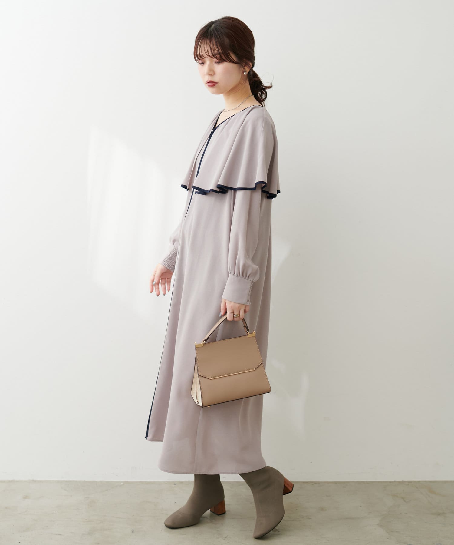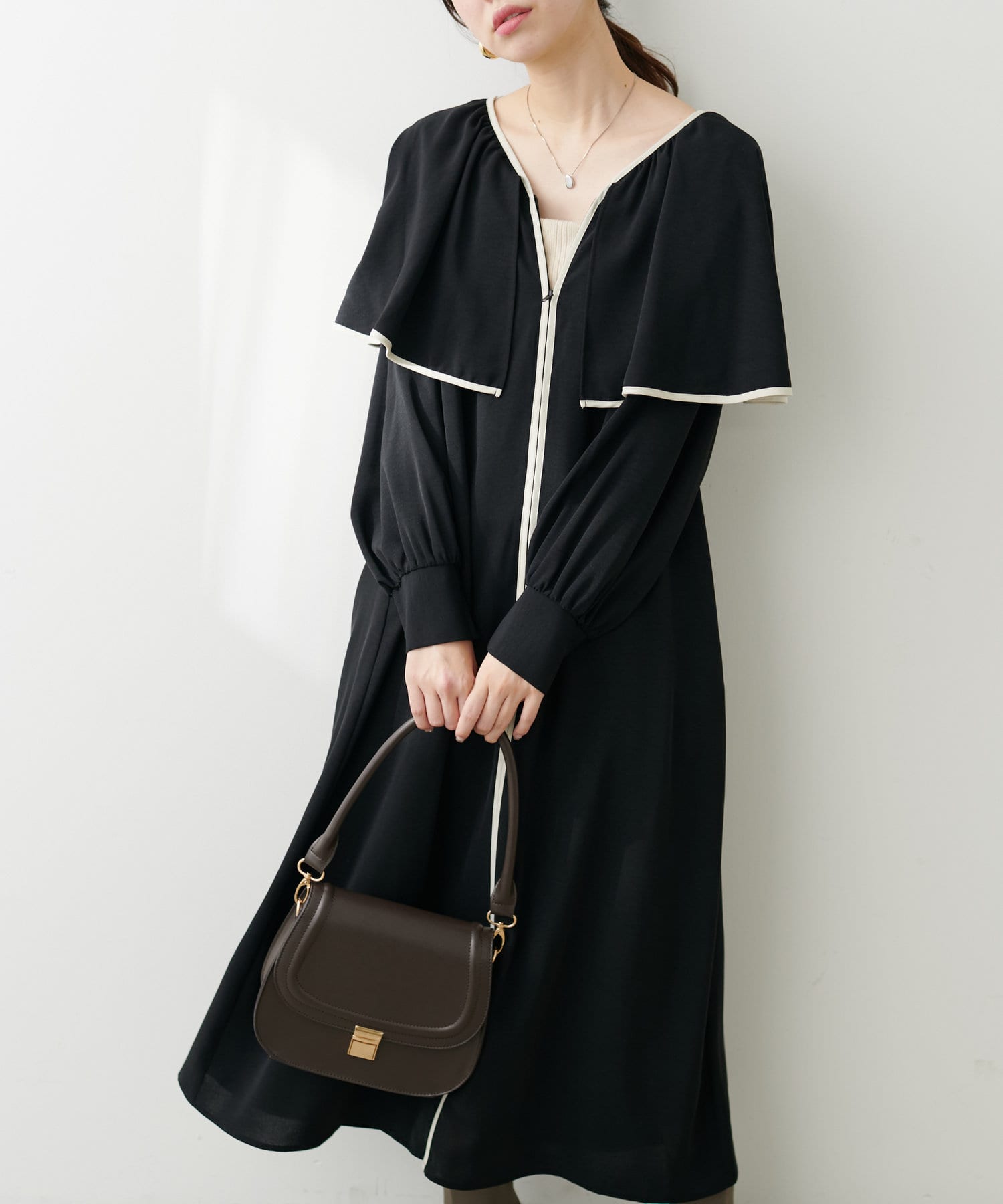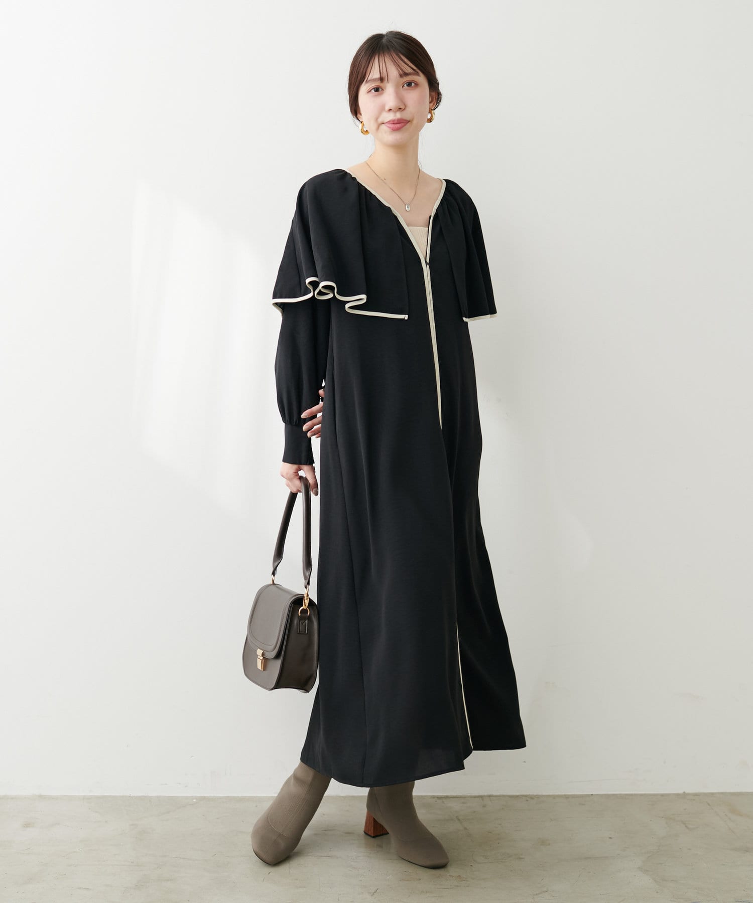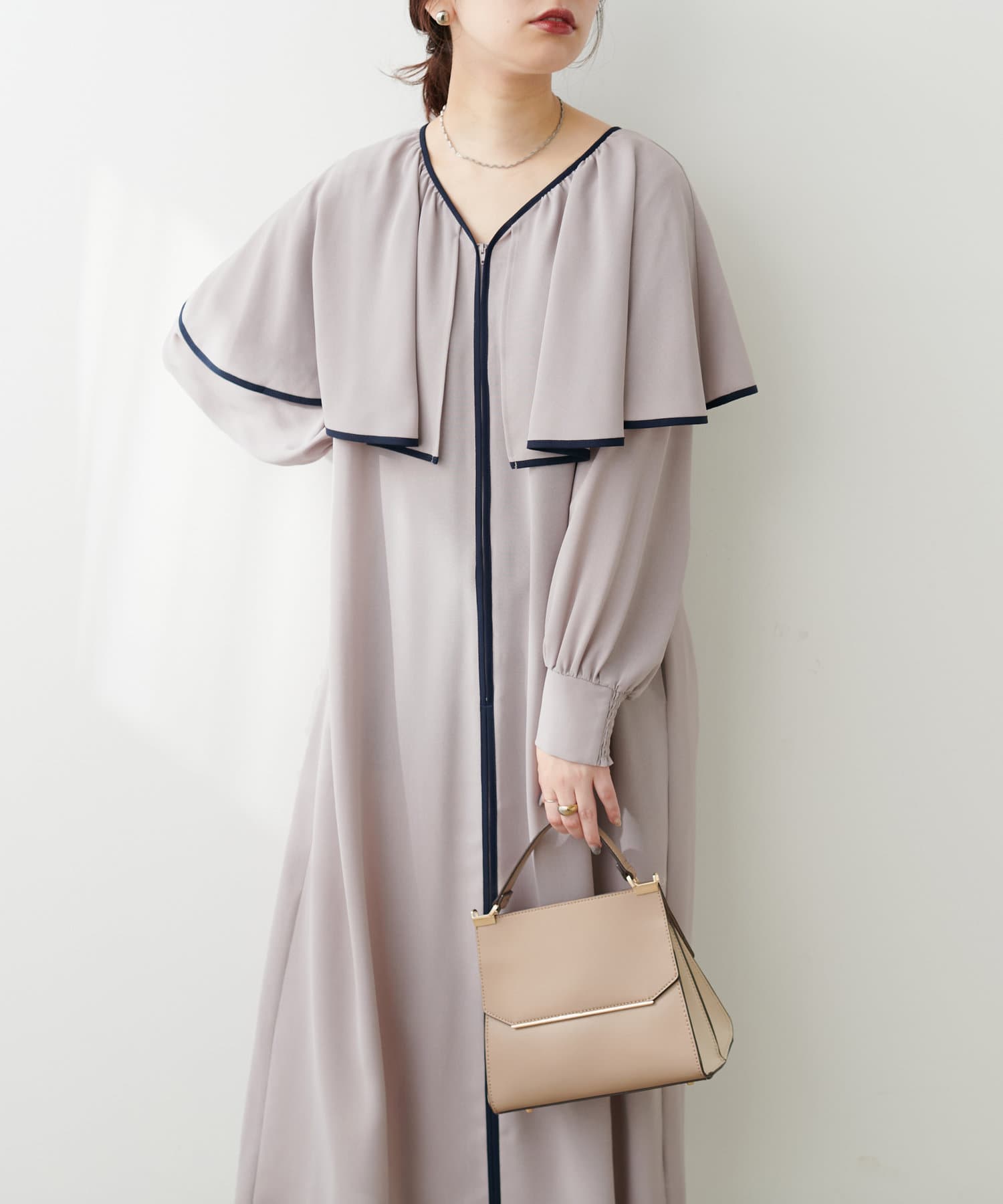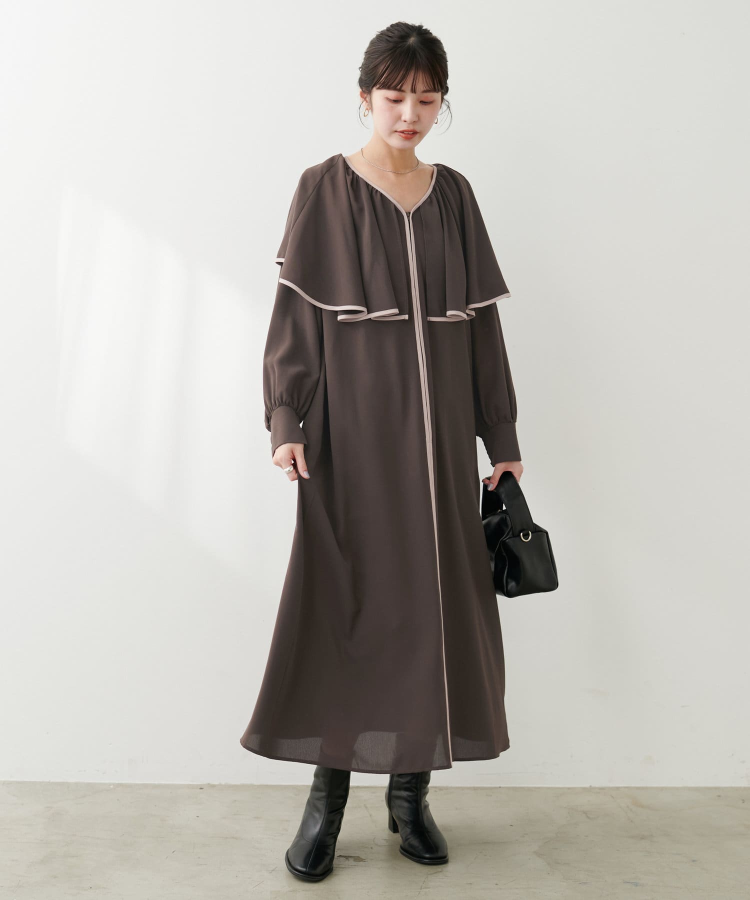 ケープデザインの衿元は、1枚で着ても可愛く、カーディガンと合わせて衿を出したスタイリングも◎