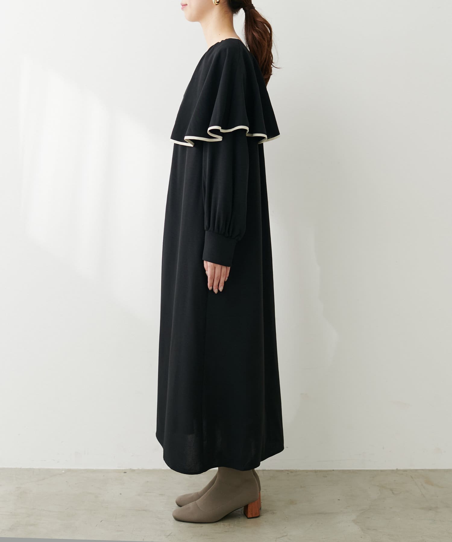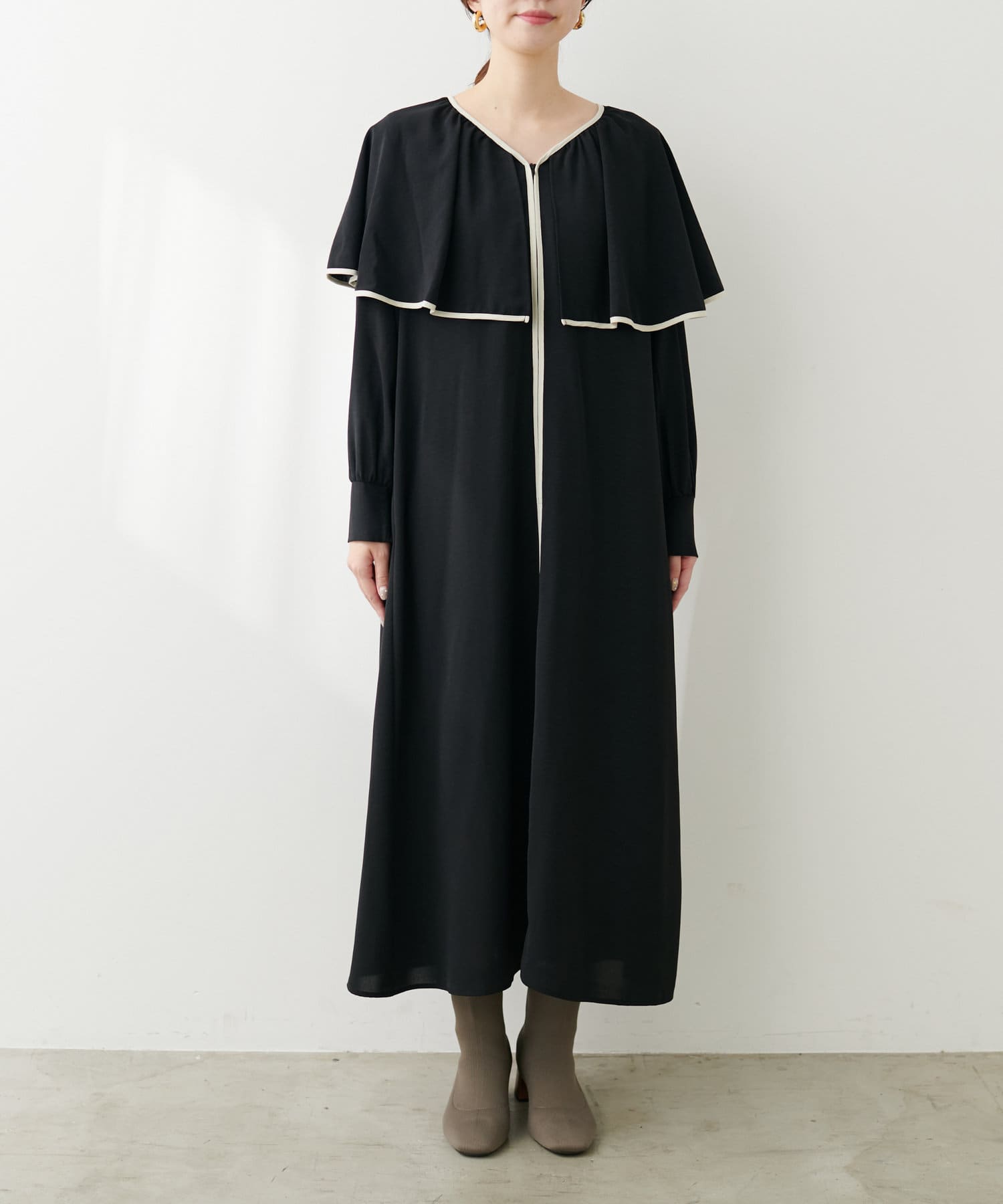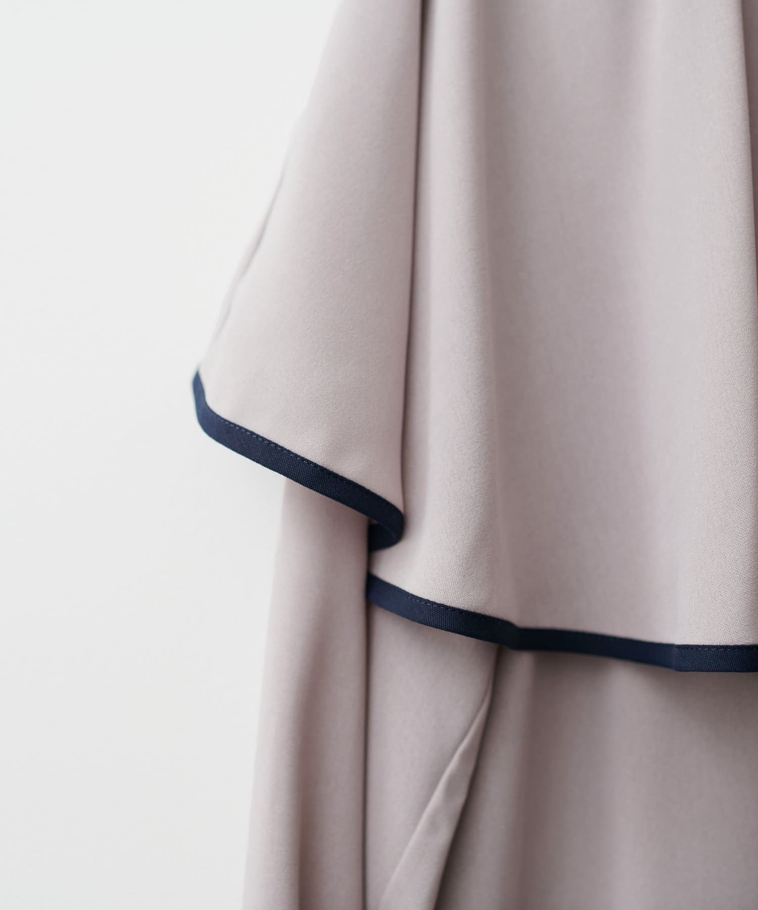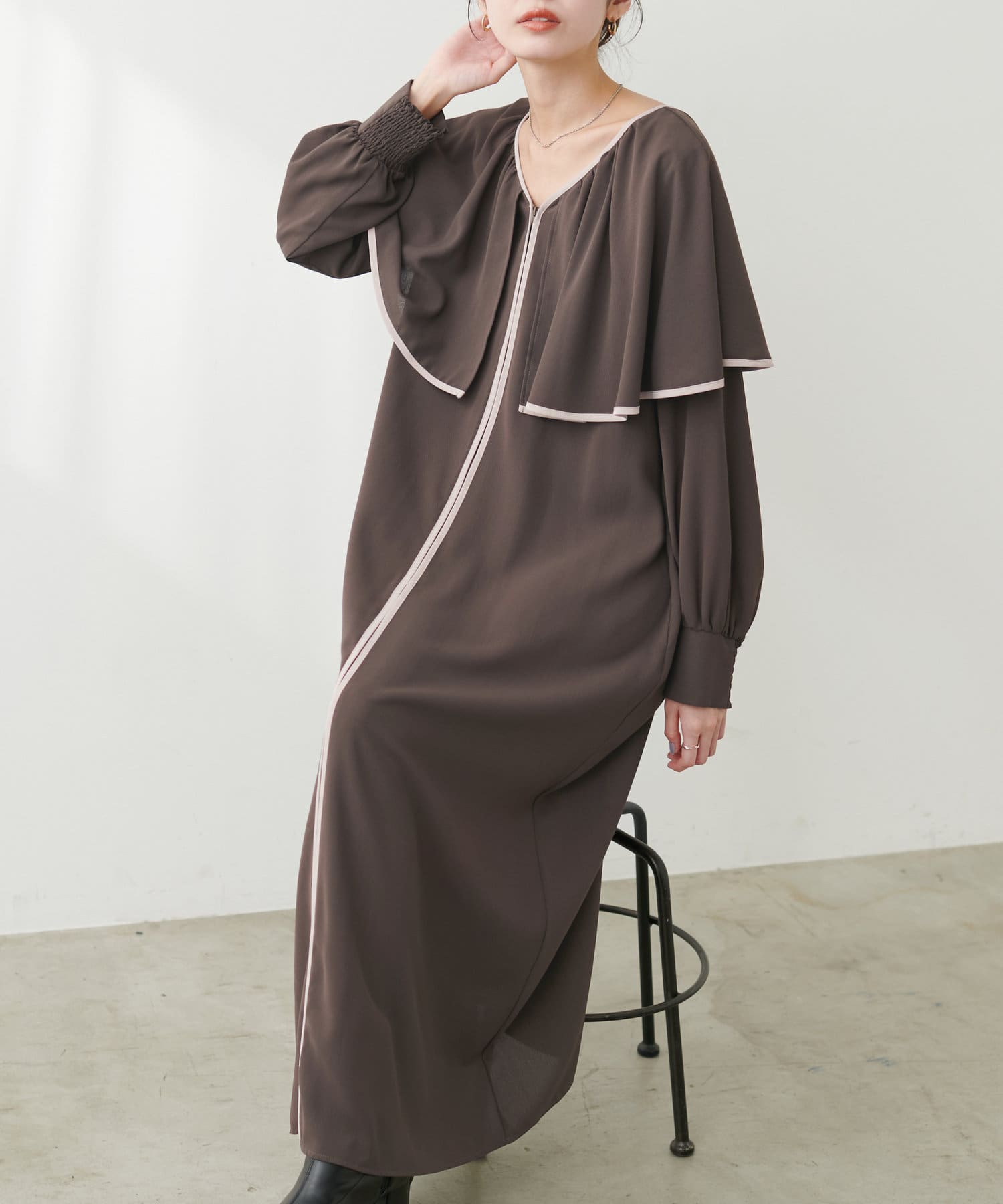 ケープデザインの衿元は、1枚で着ても可愛く、カーディガンと合わせて衿を出したスタイリングも◎