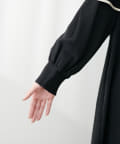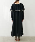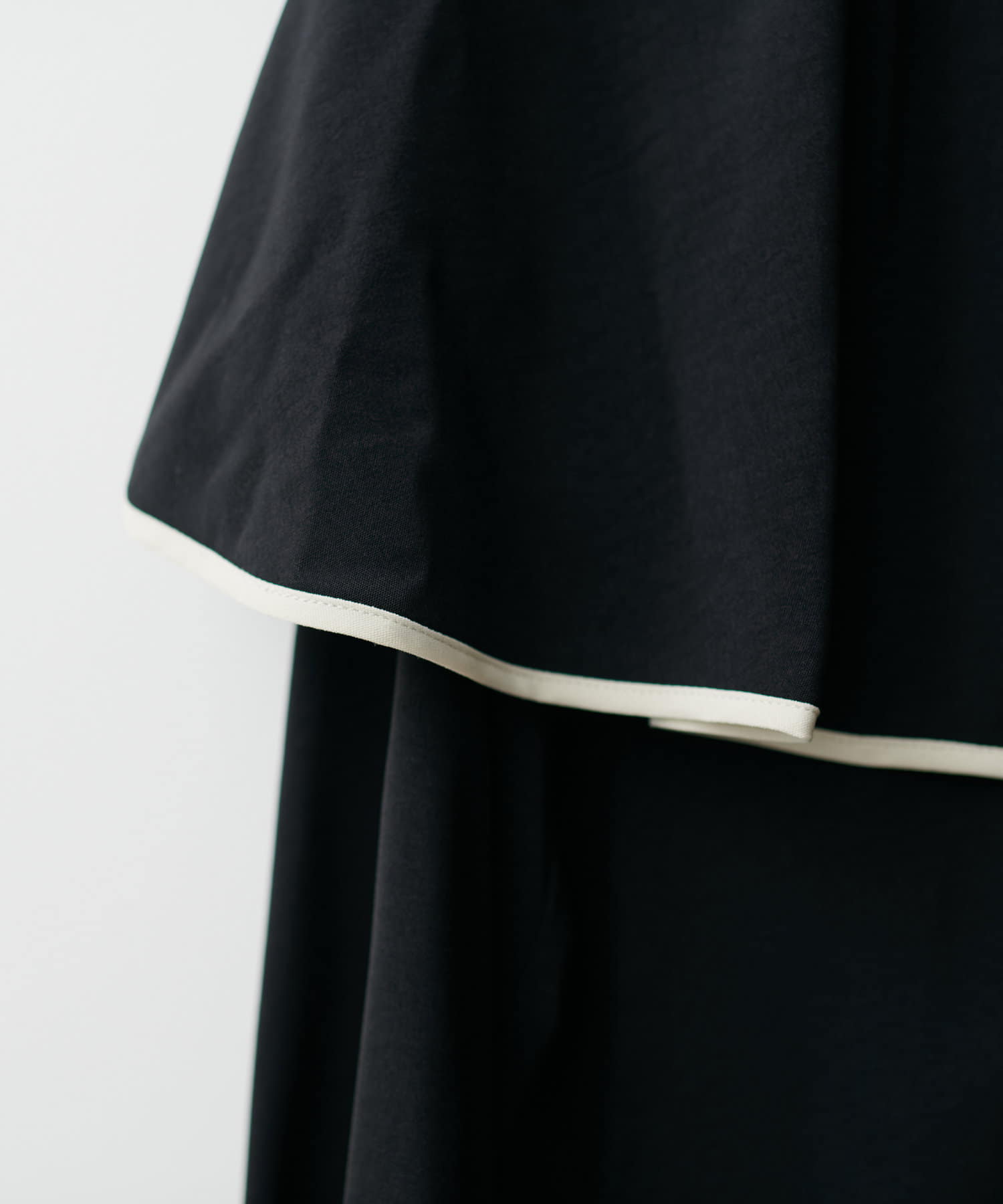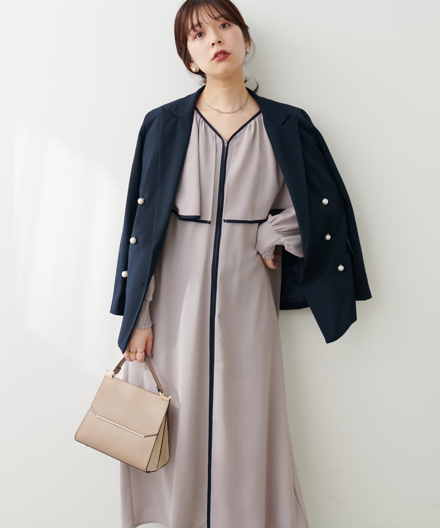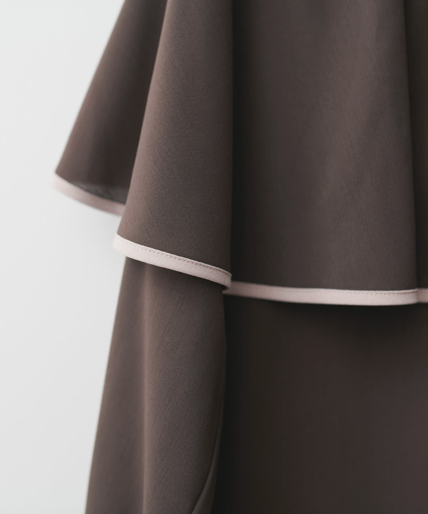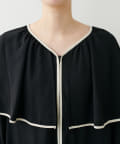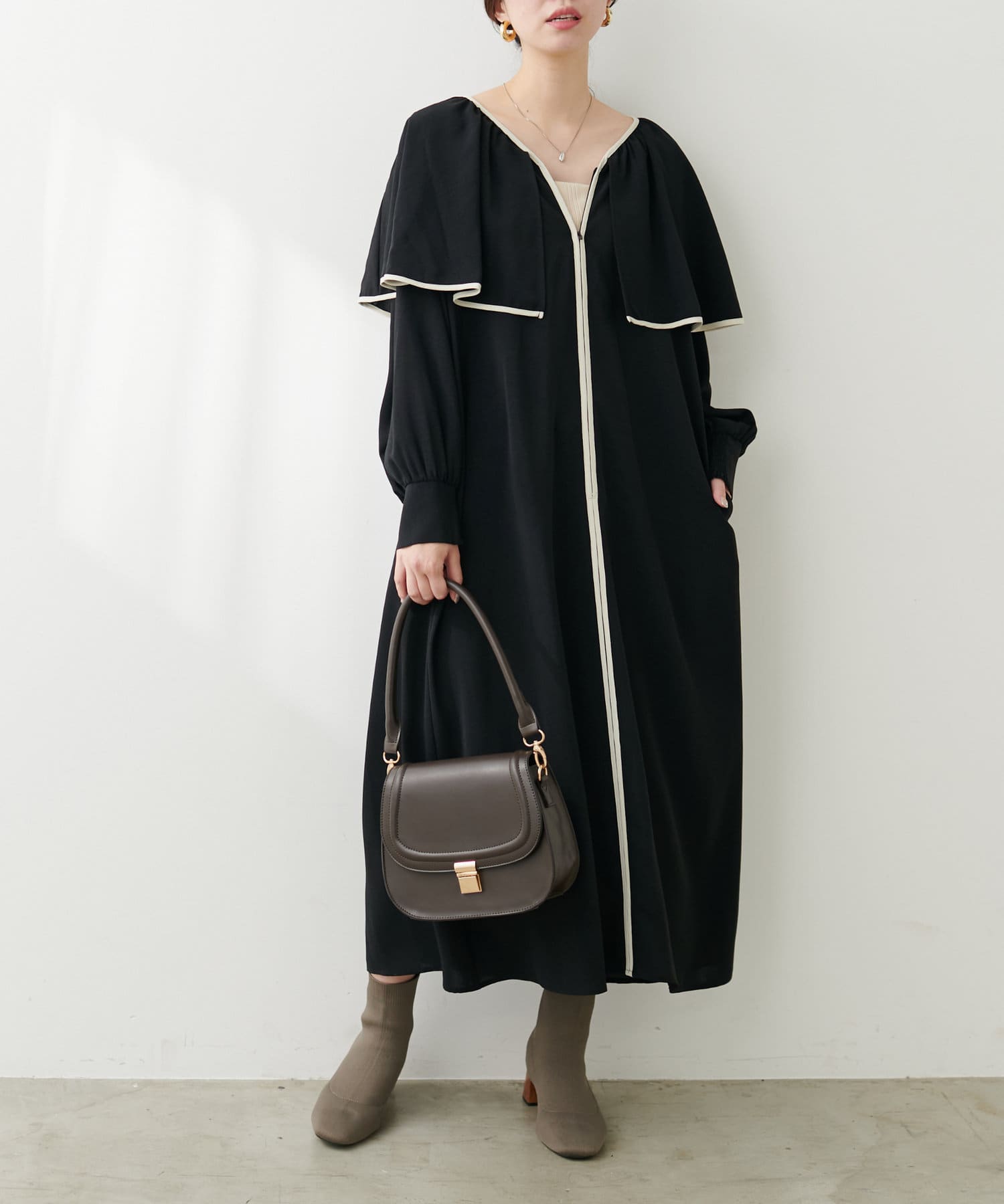 ケープデザインの衿元は、1枚で着ても可愛く、カーディガンと合わせて衿を出したスタイリングも◎