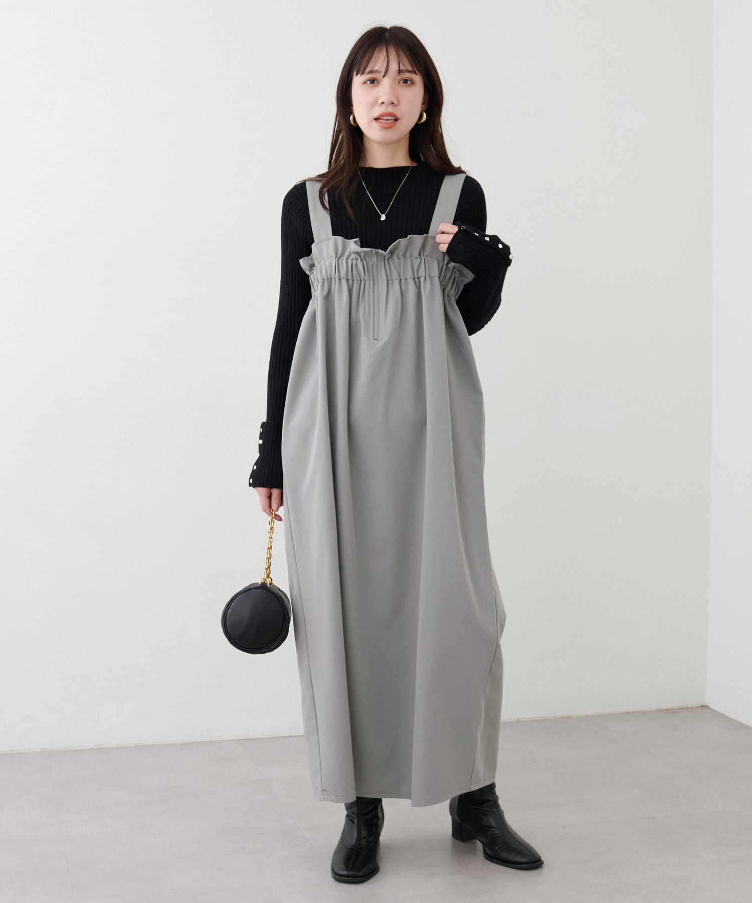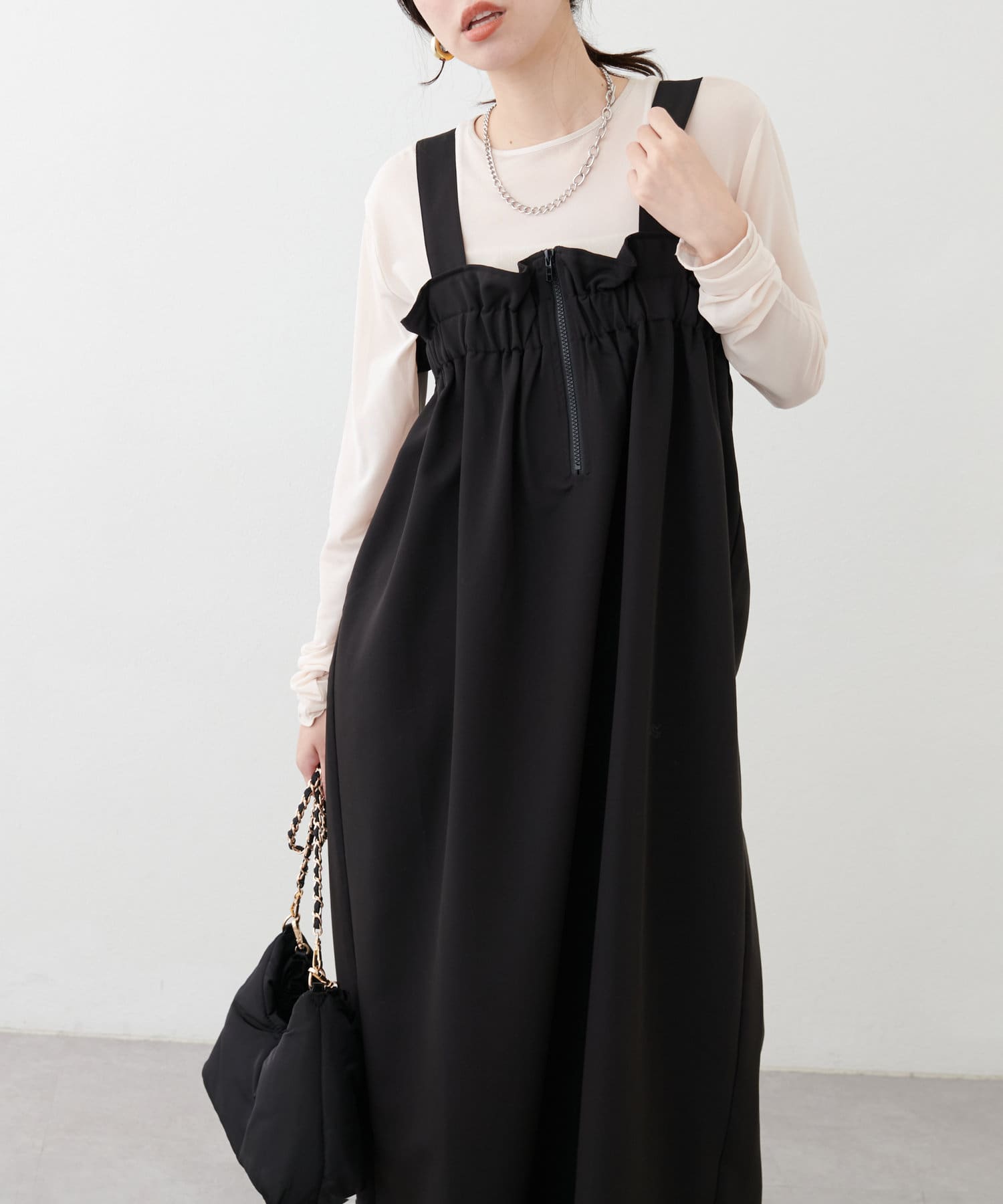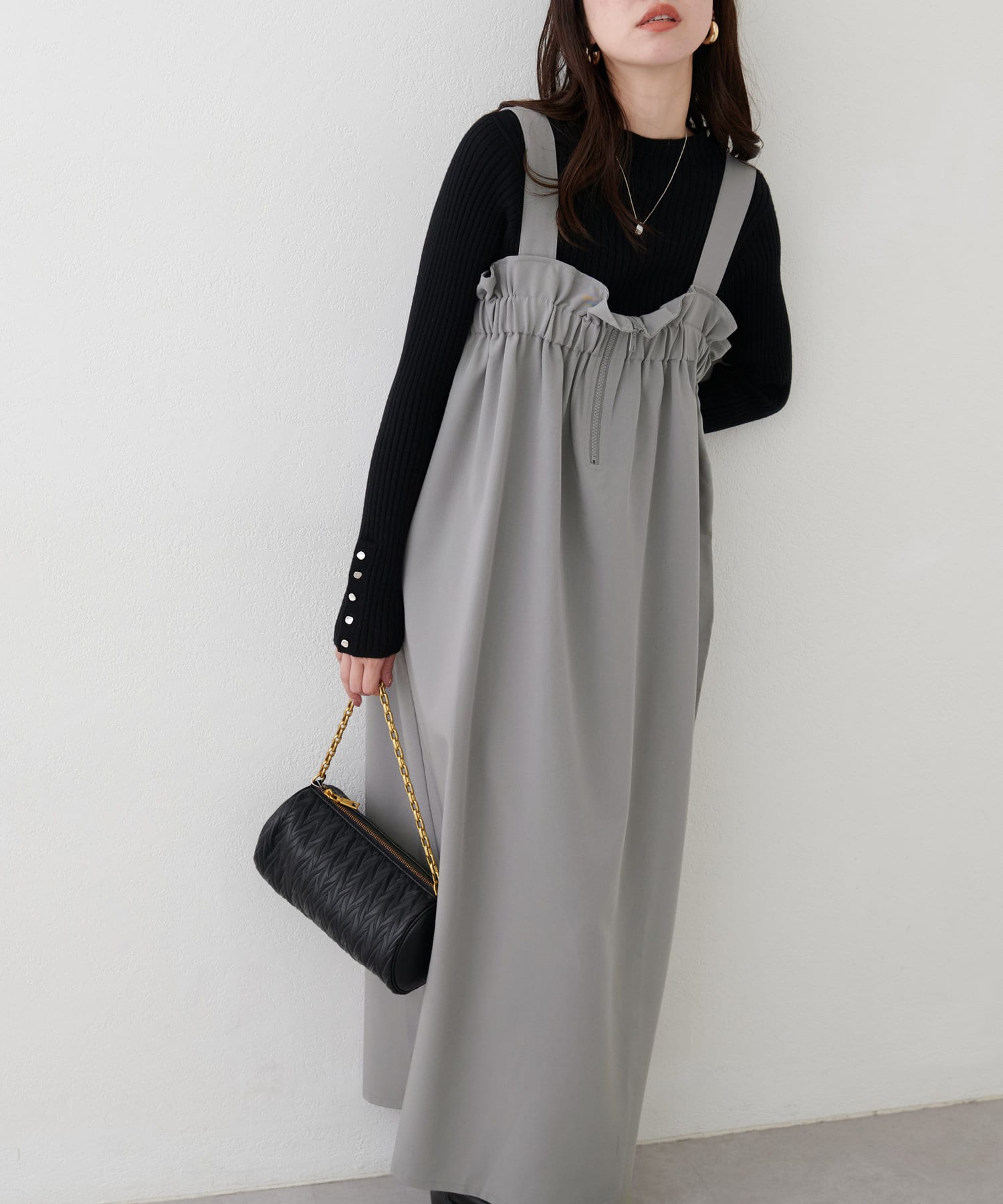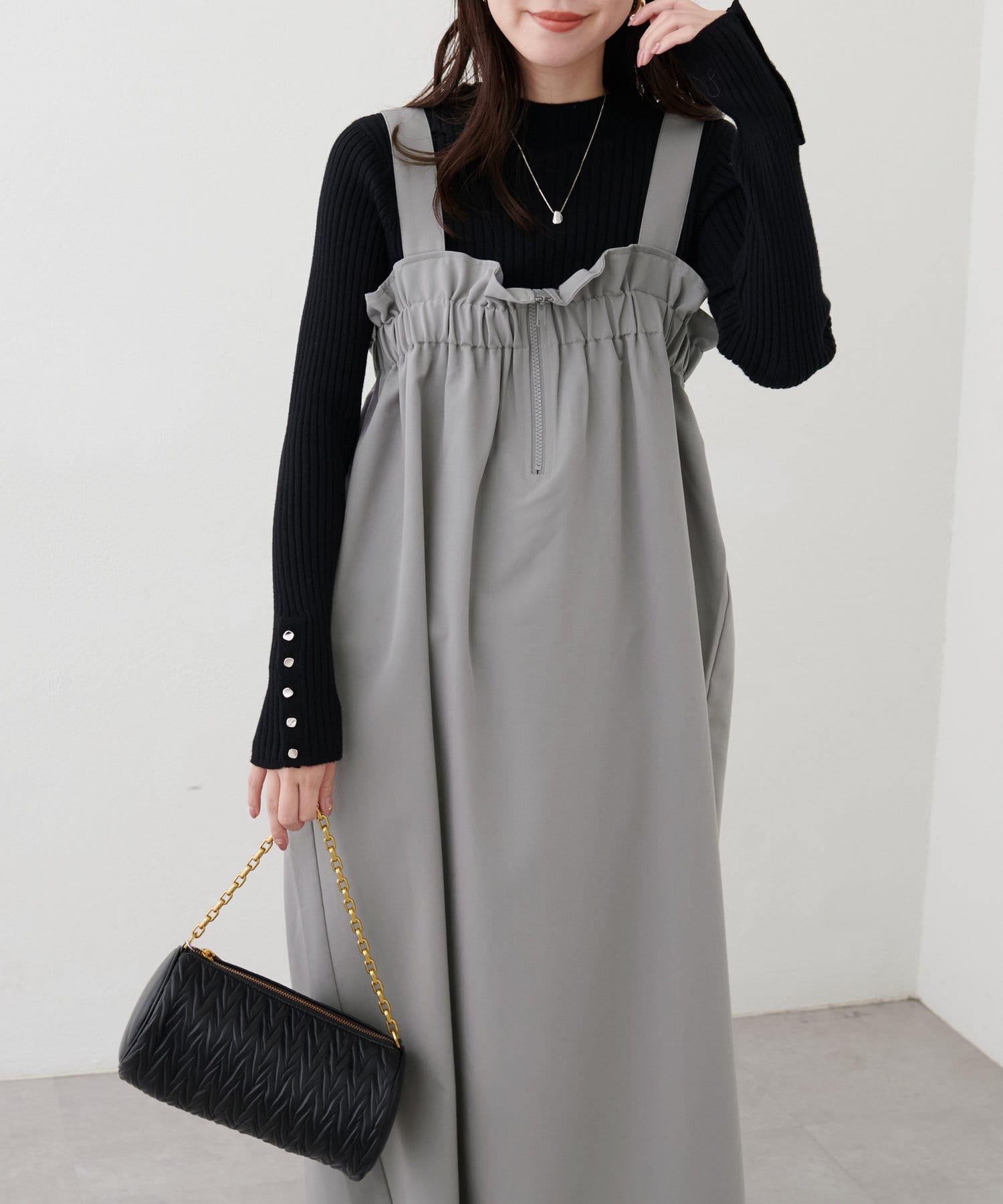 さらっとした軽めの素材とフロントジップでカジュアルみえするジャンスカ。