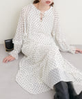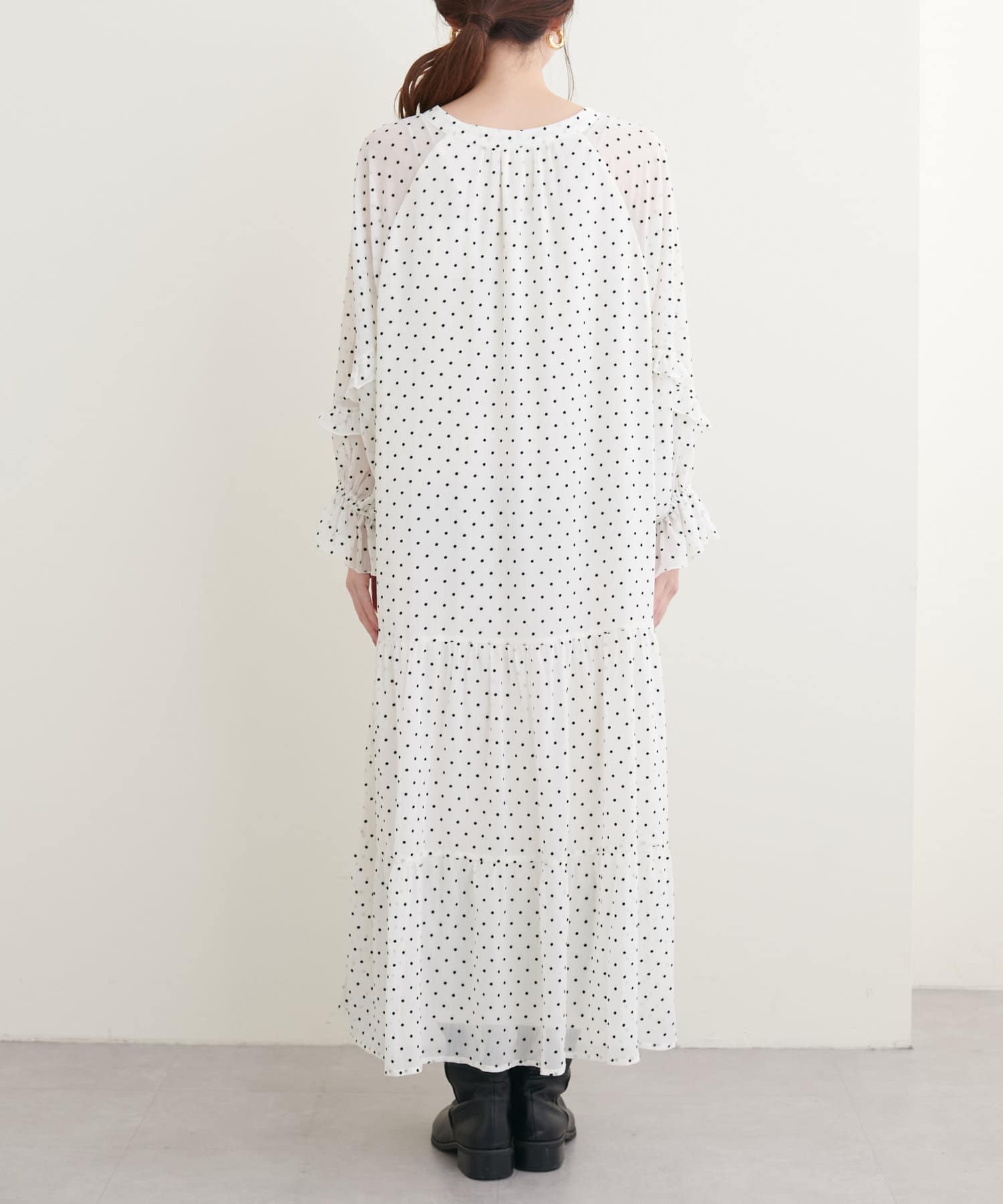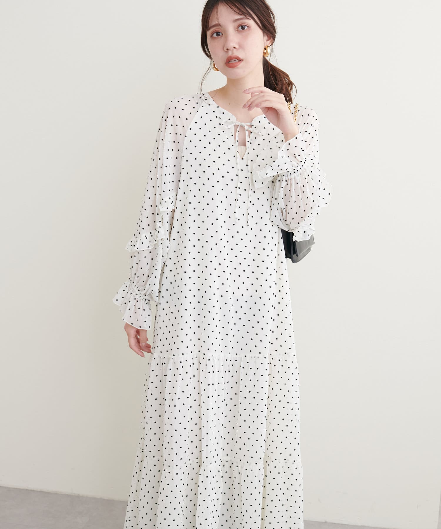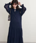 袖のフリルと、裾のティアードがポイントのワンピース。