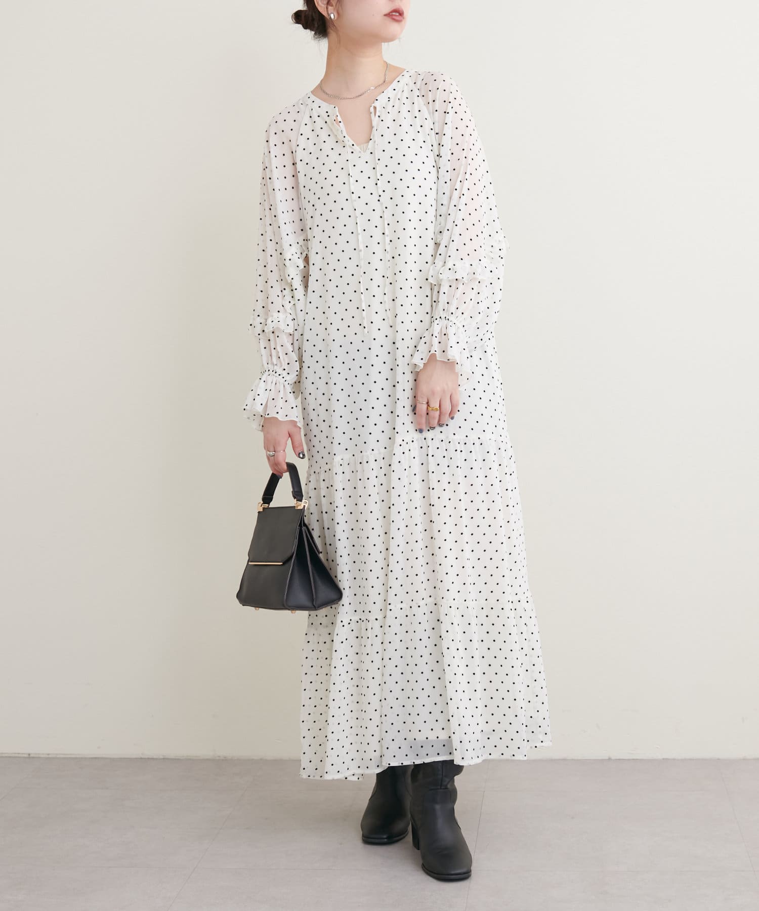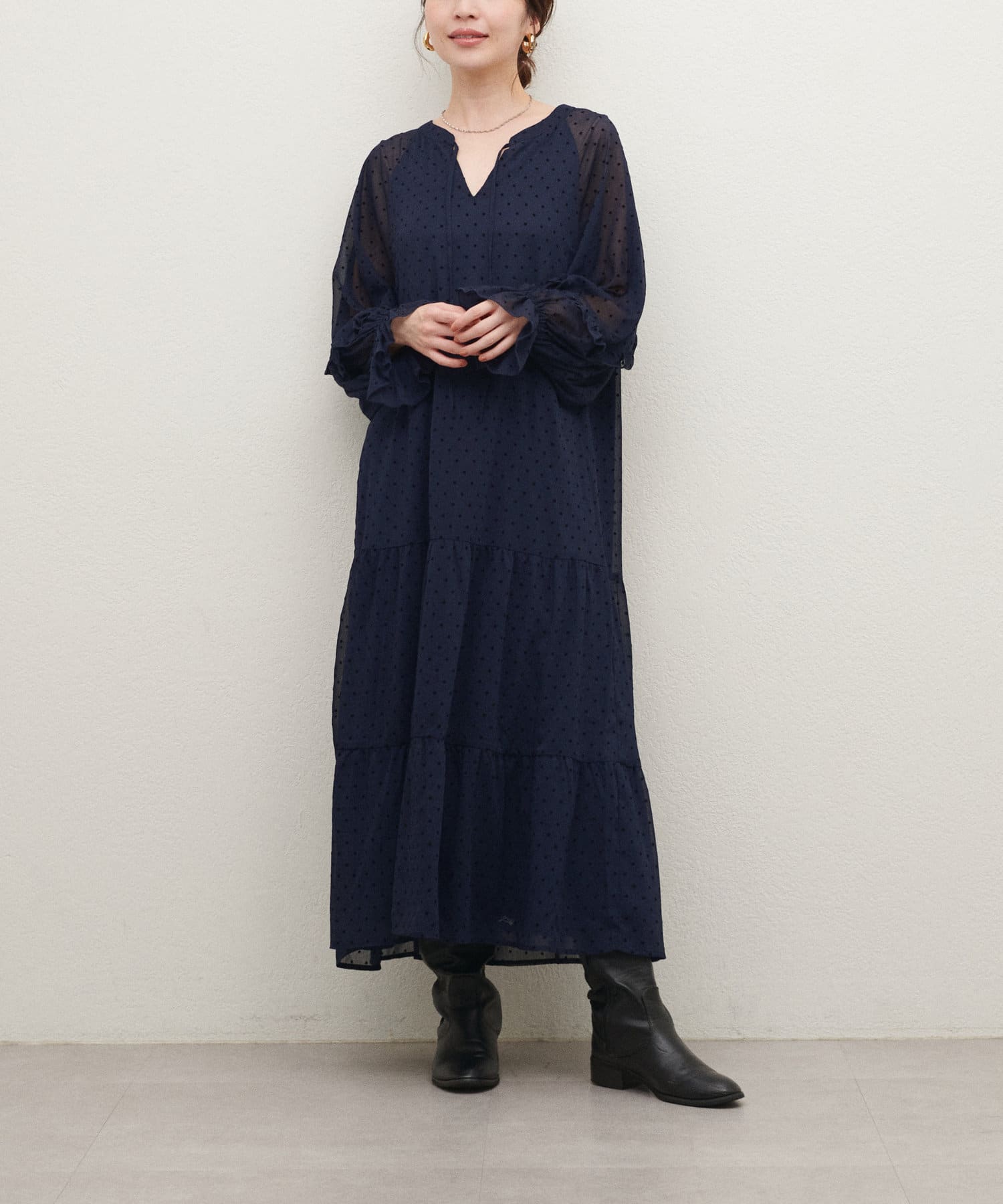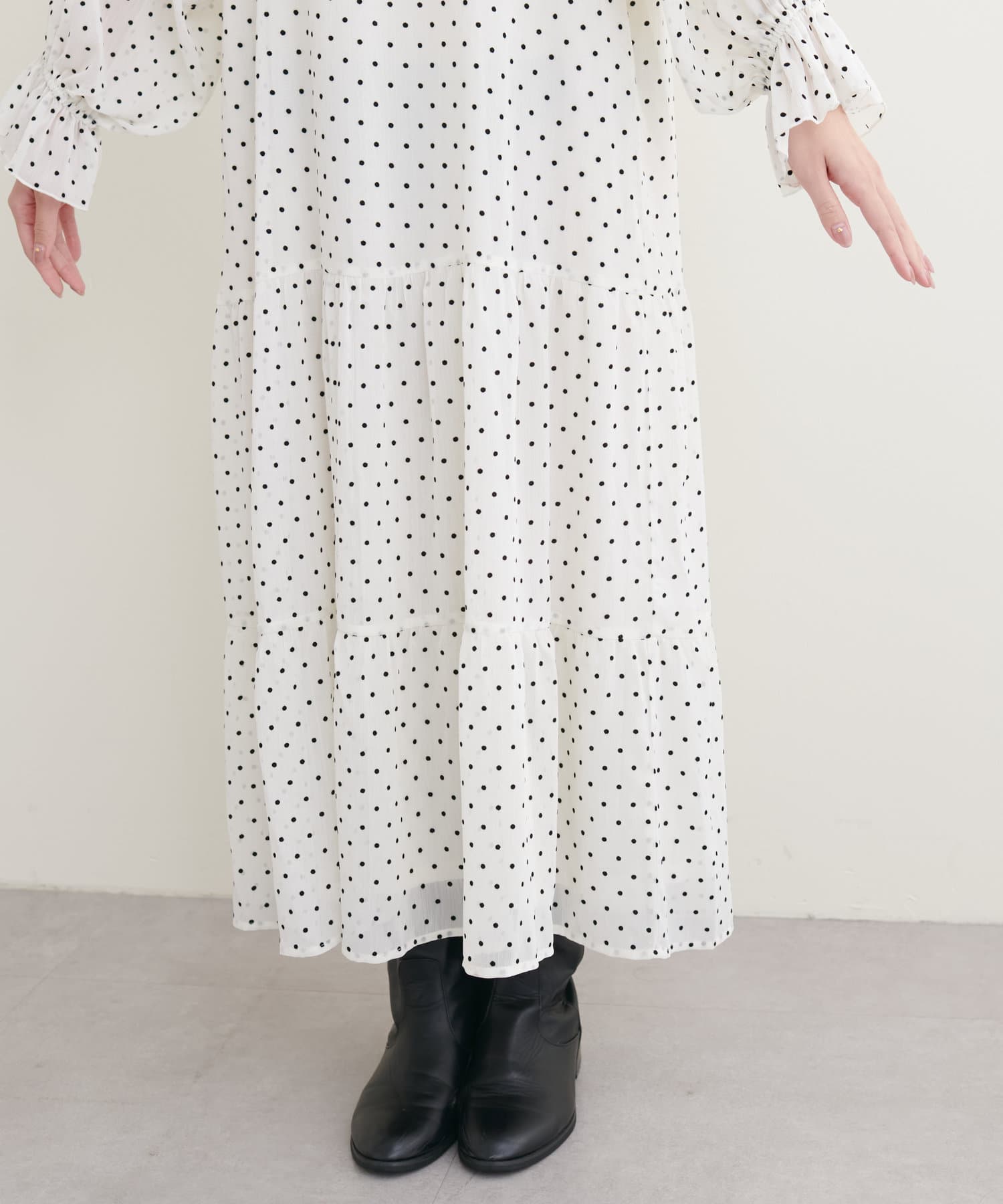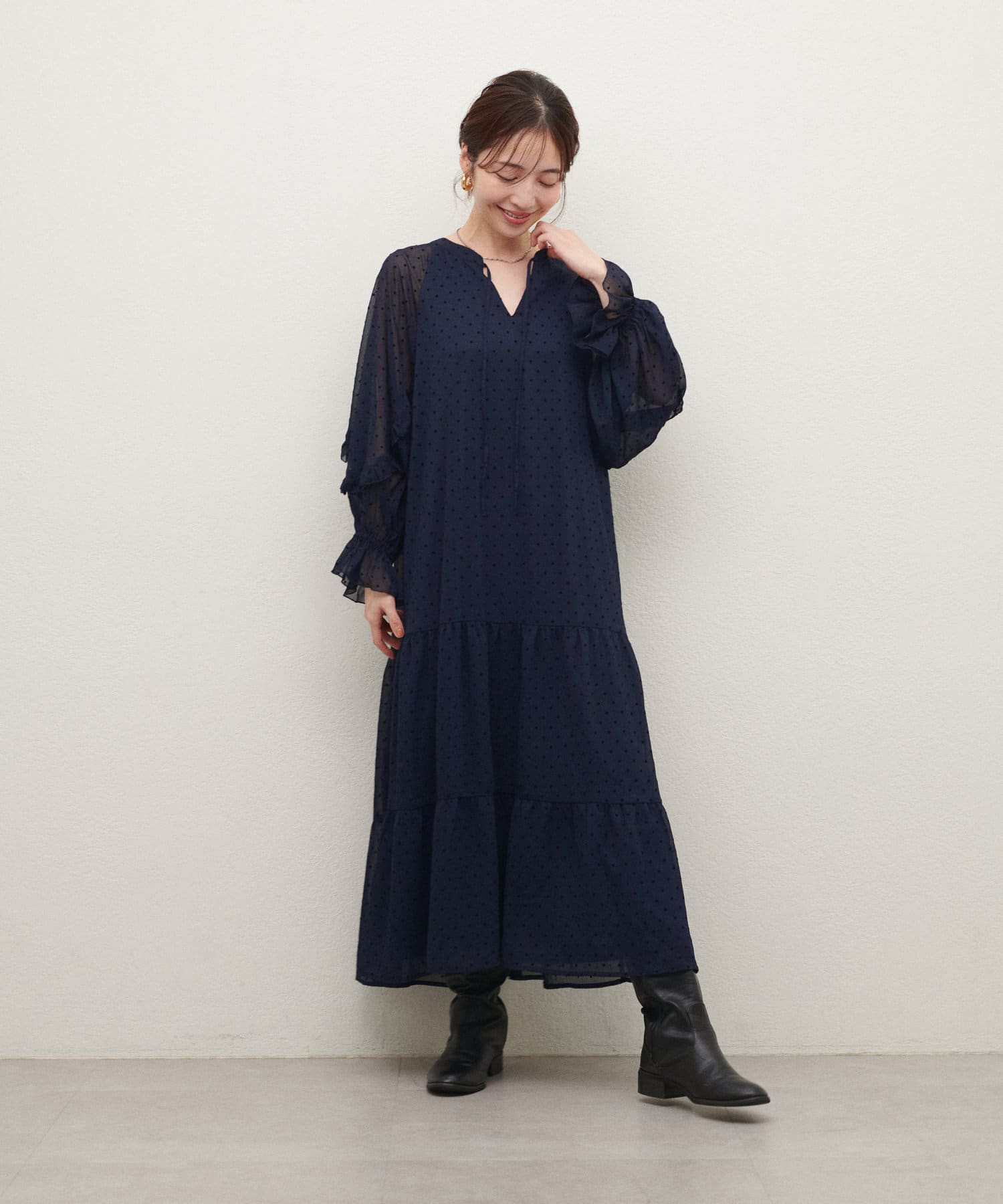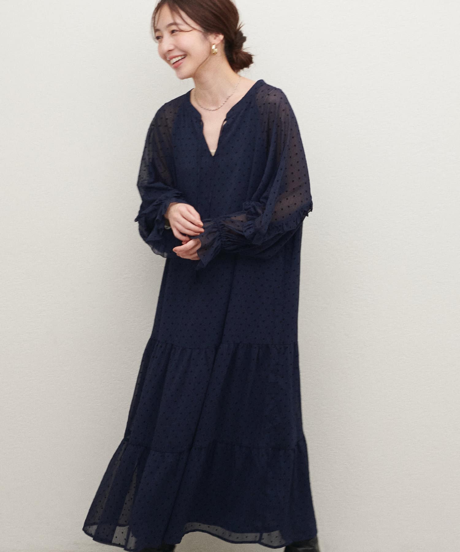 落ち感のある素材感でティアードでも甘すぎなく着やすいデザイン。