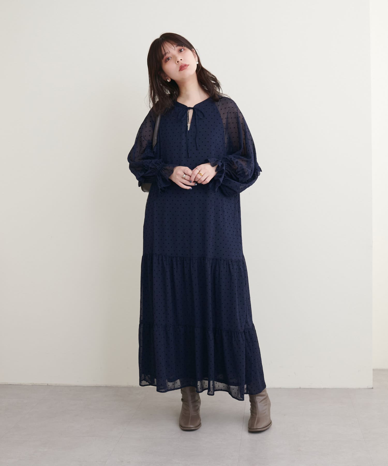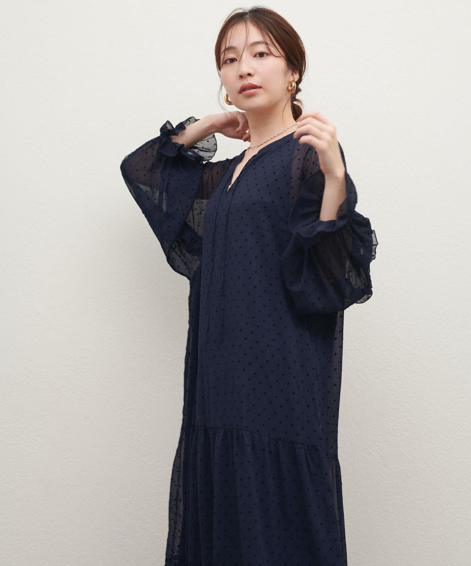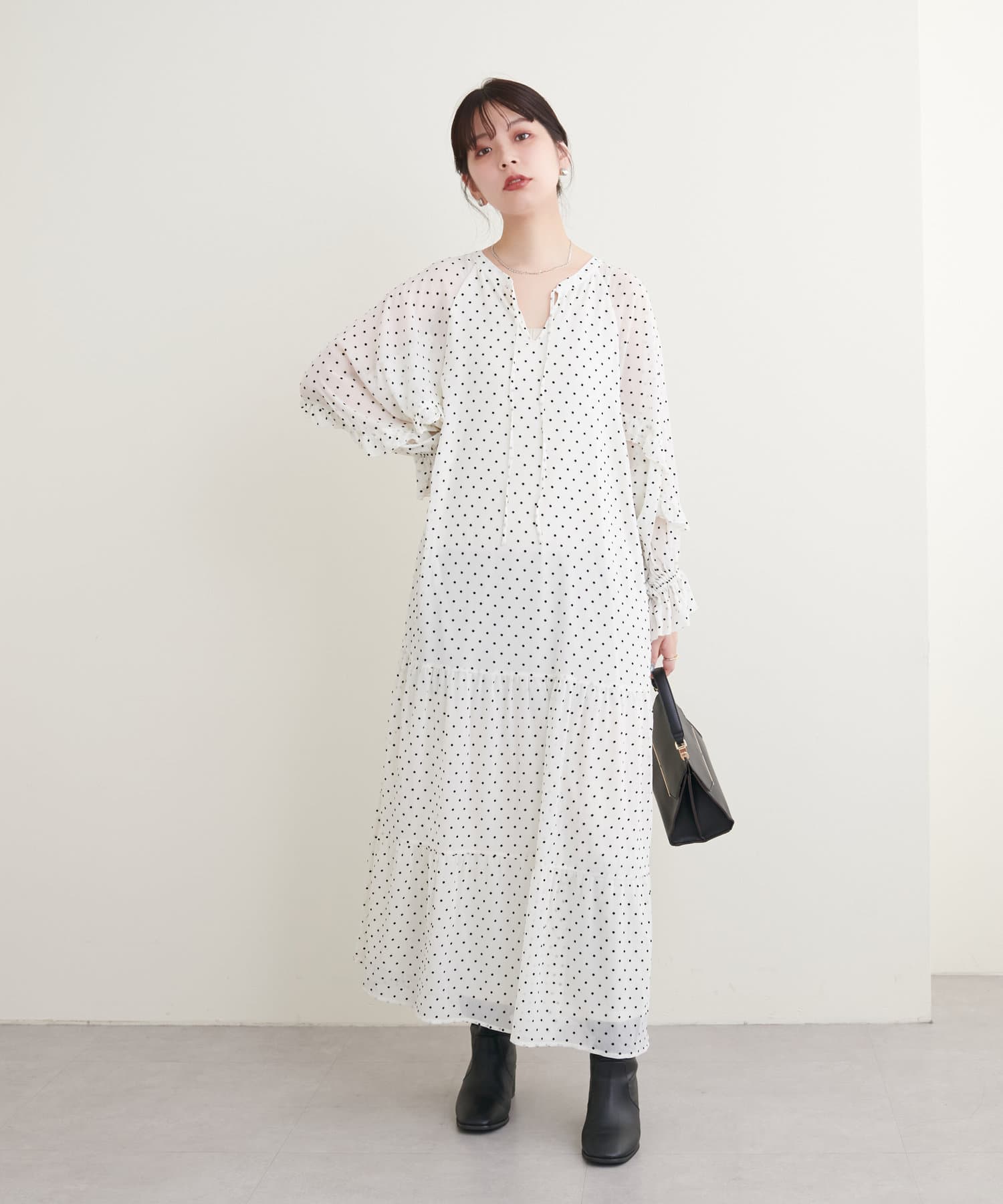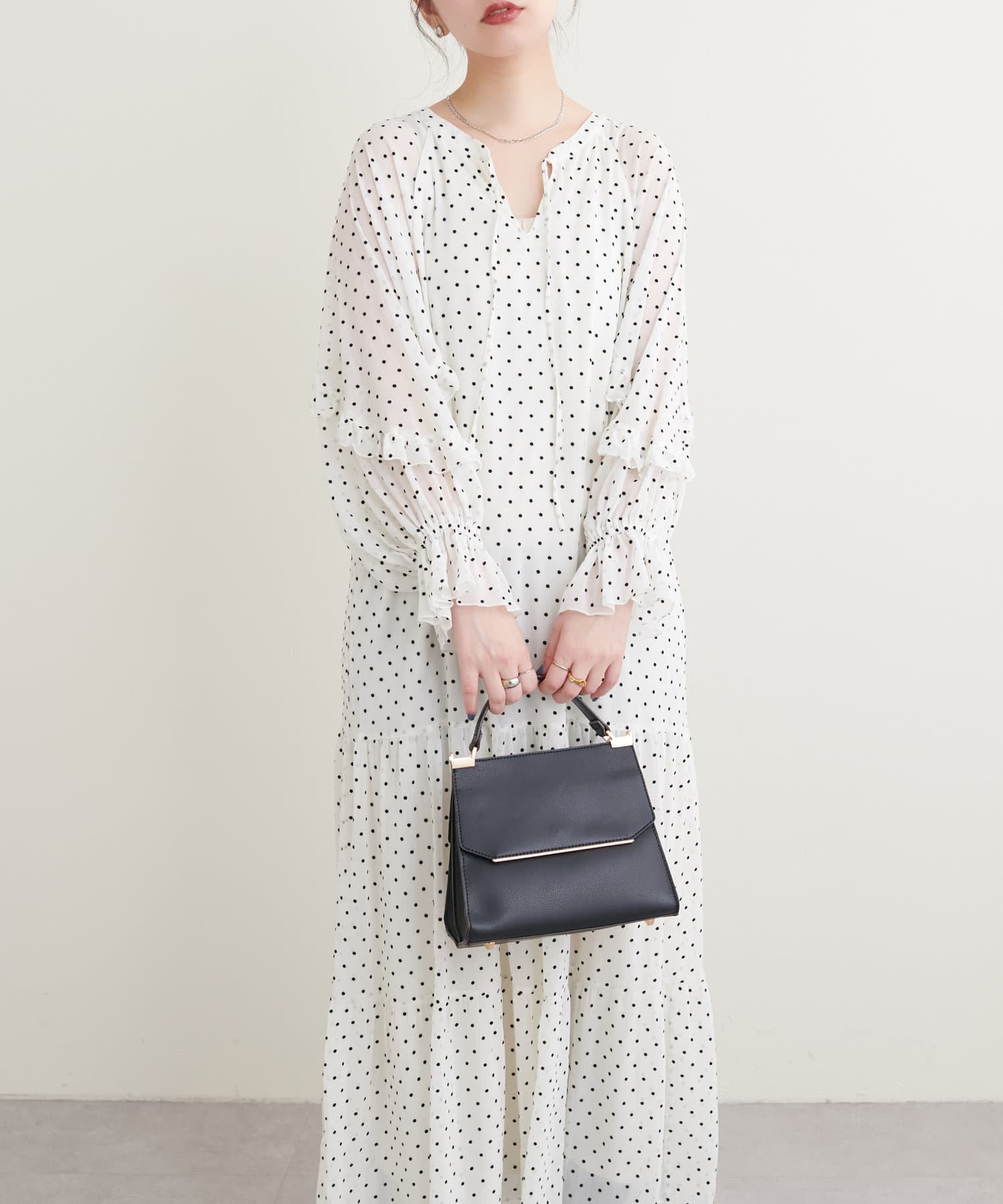 落ち感のある素材感でティアードでも甘すぎなく着やすいデザイン。