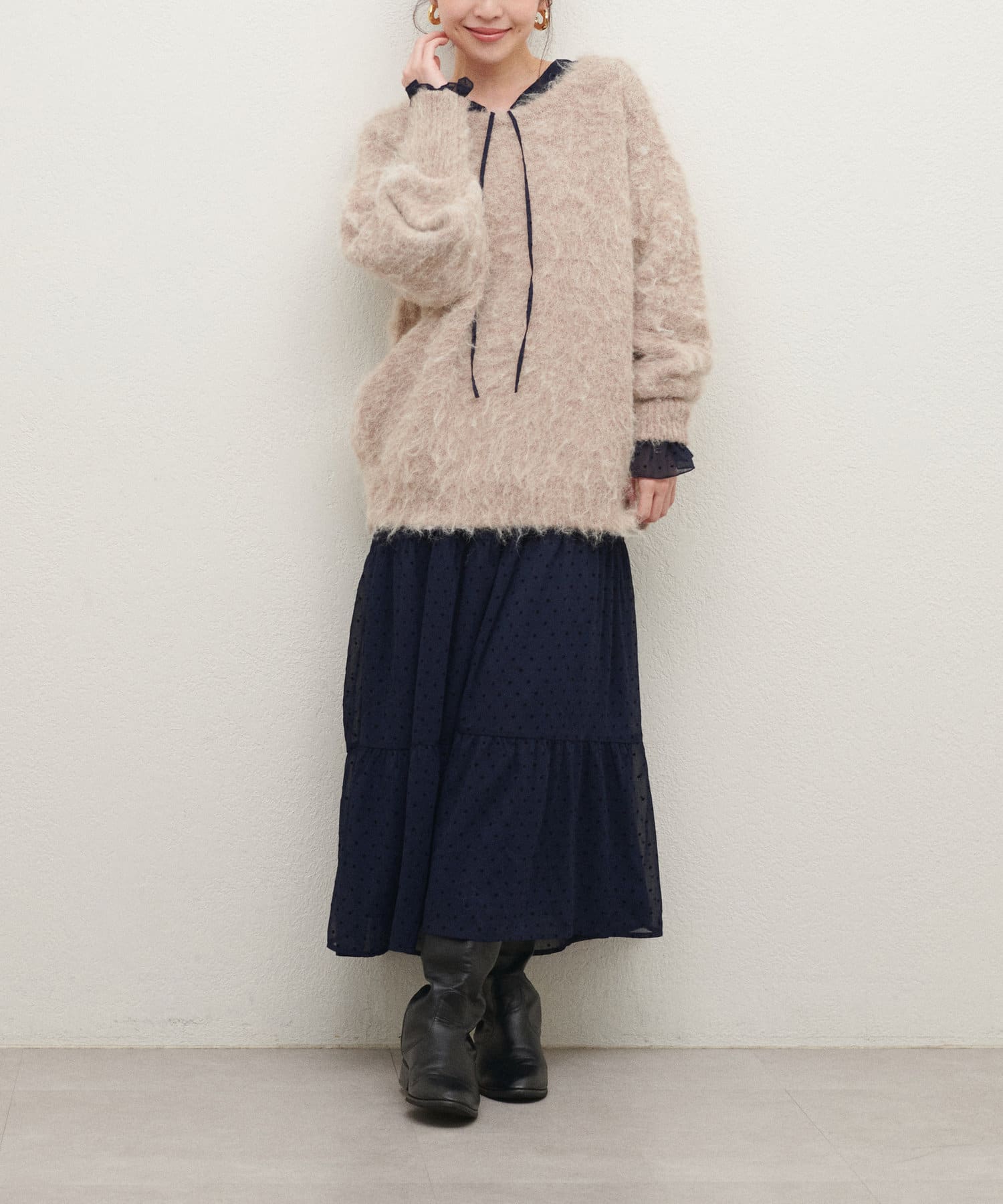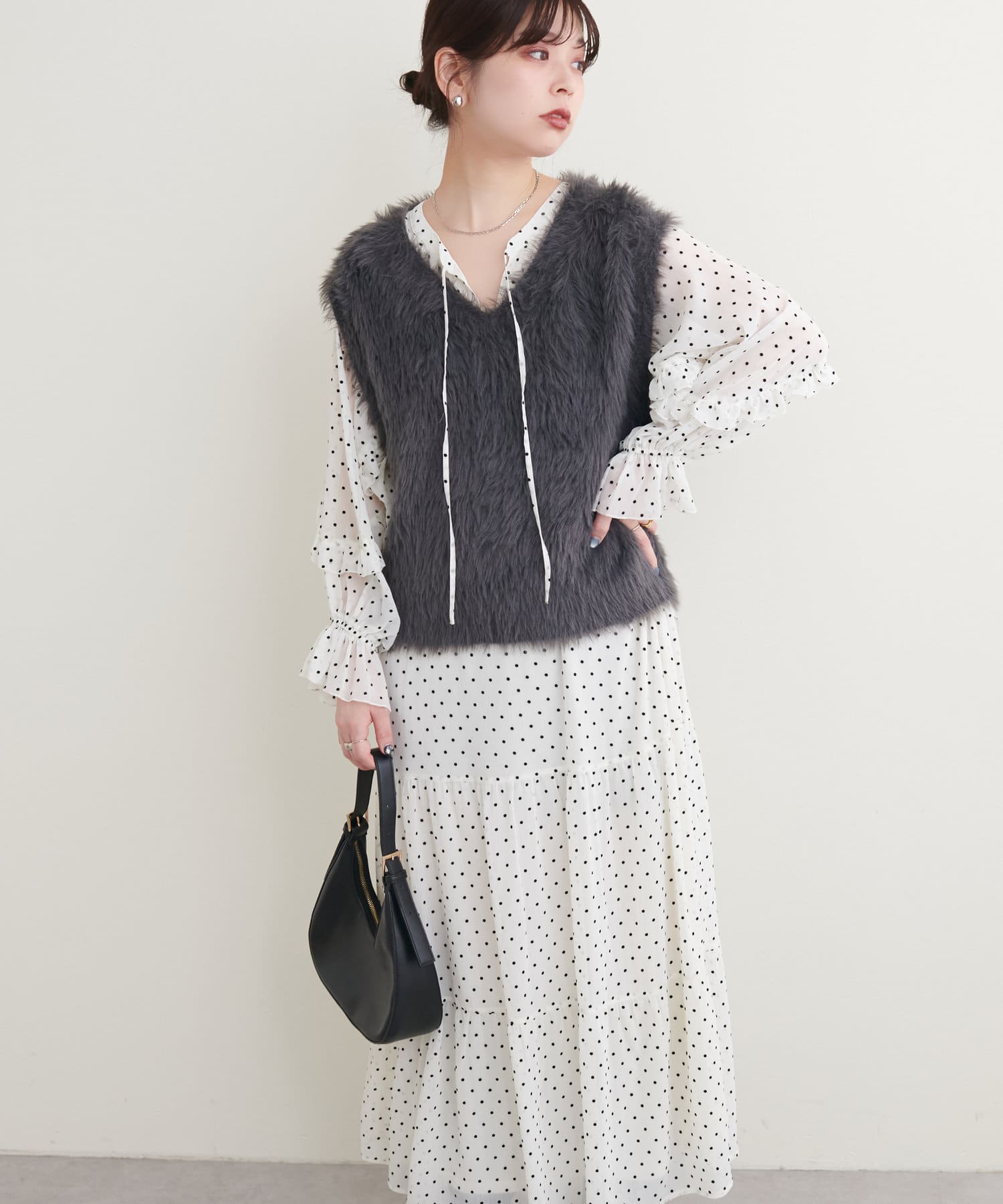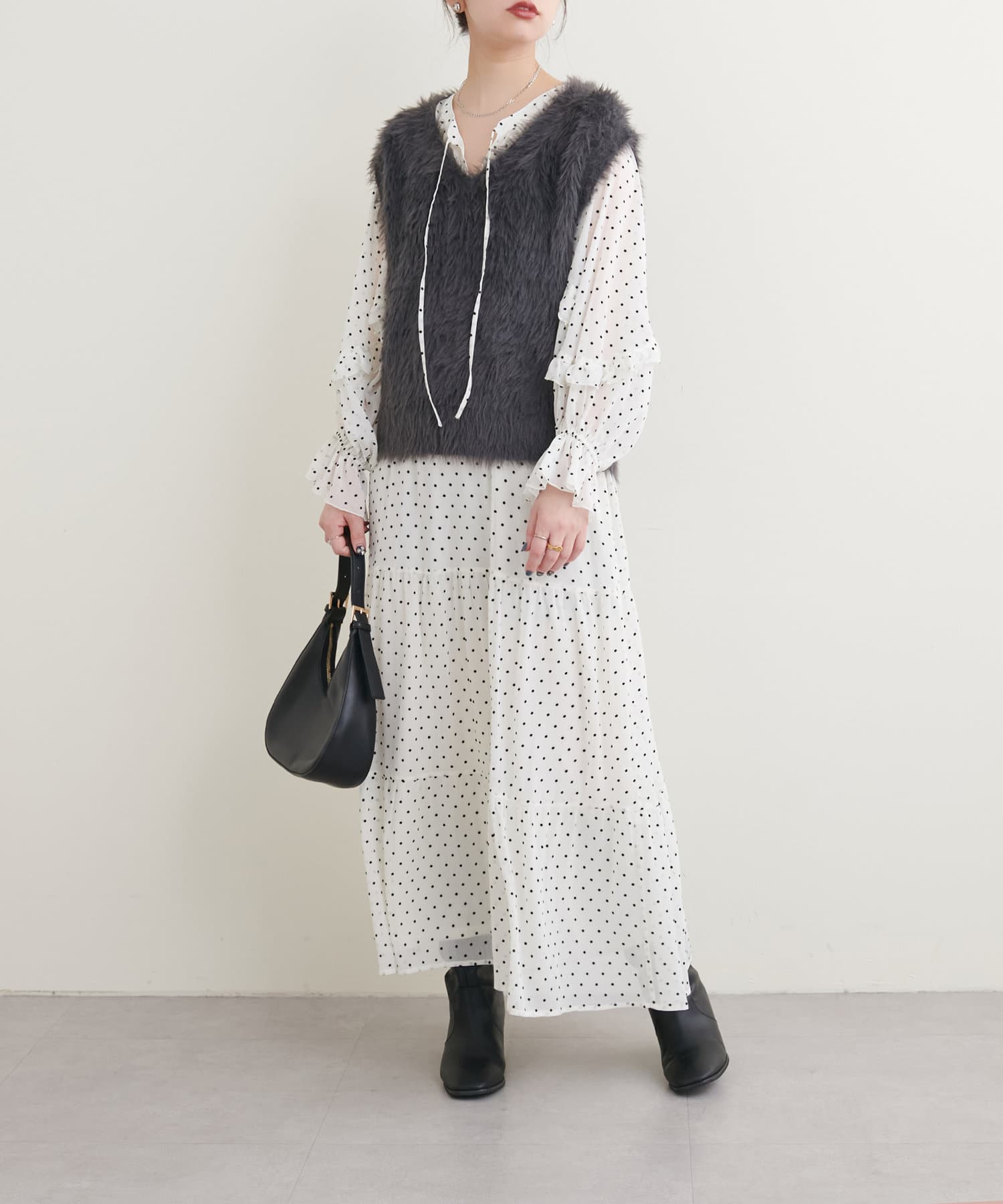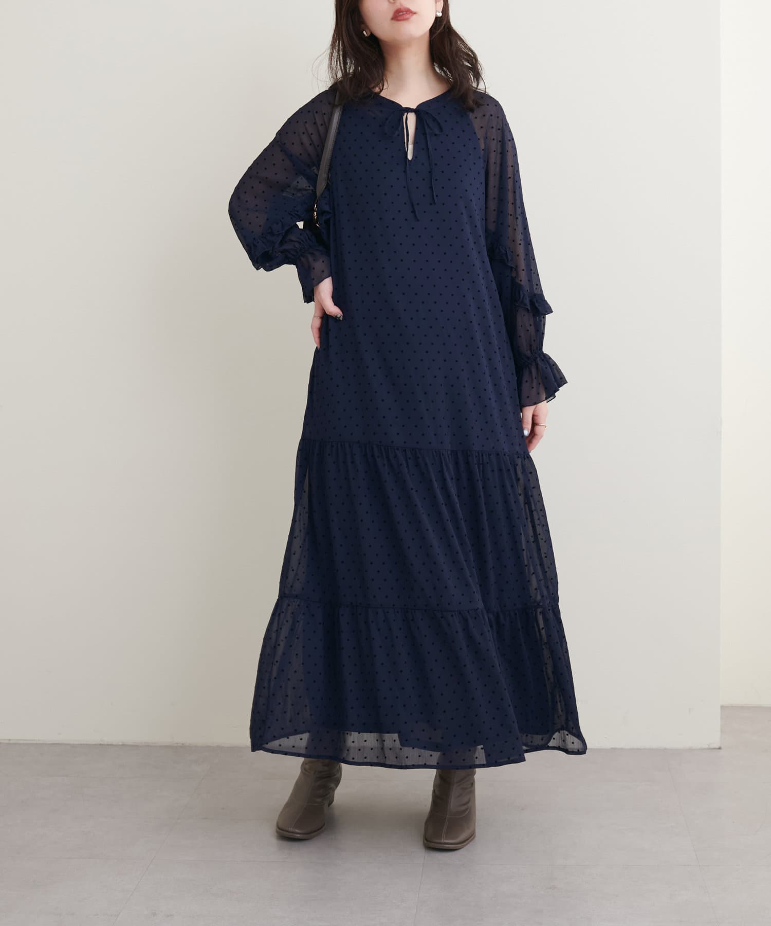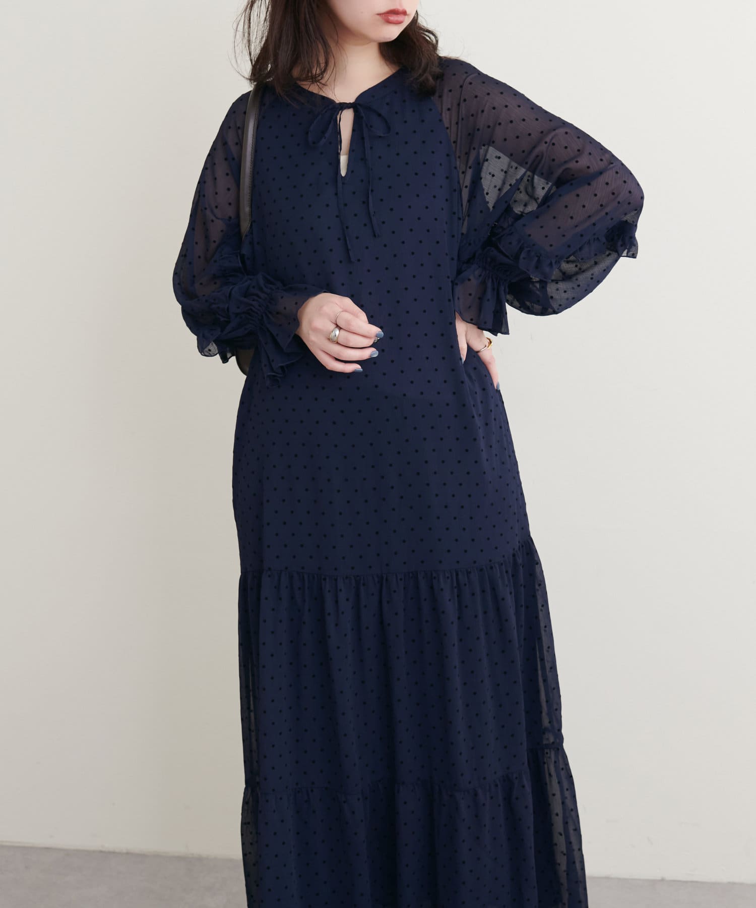 落ち感のある素材感でティアードでも甘すぎなく着やすいデザイン。