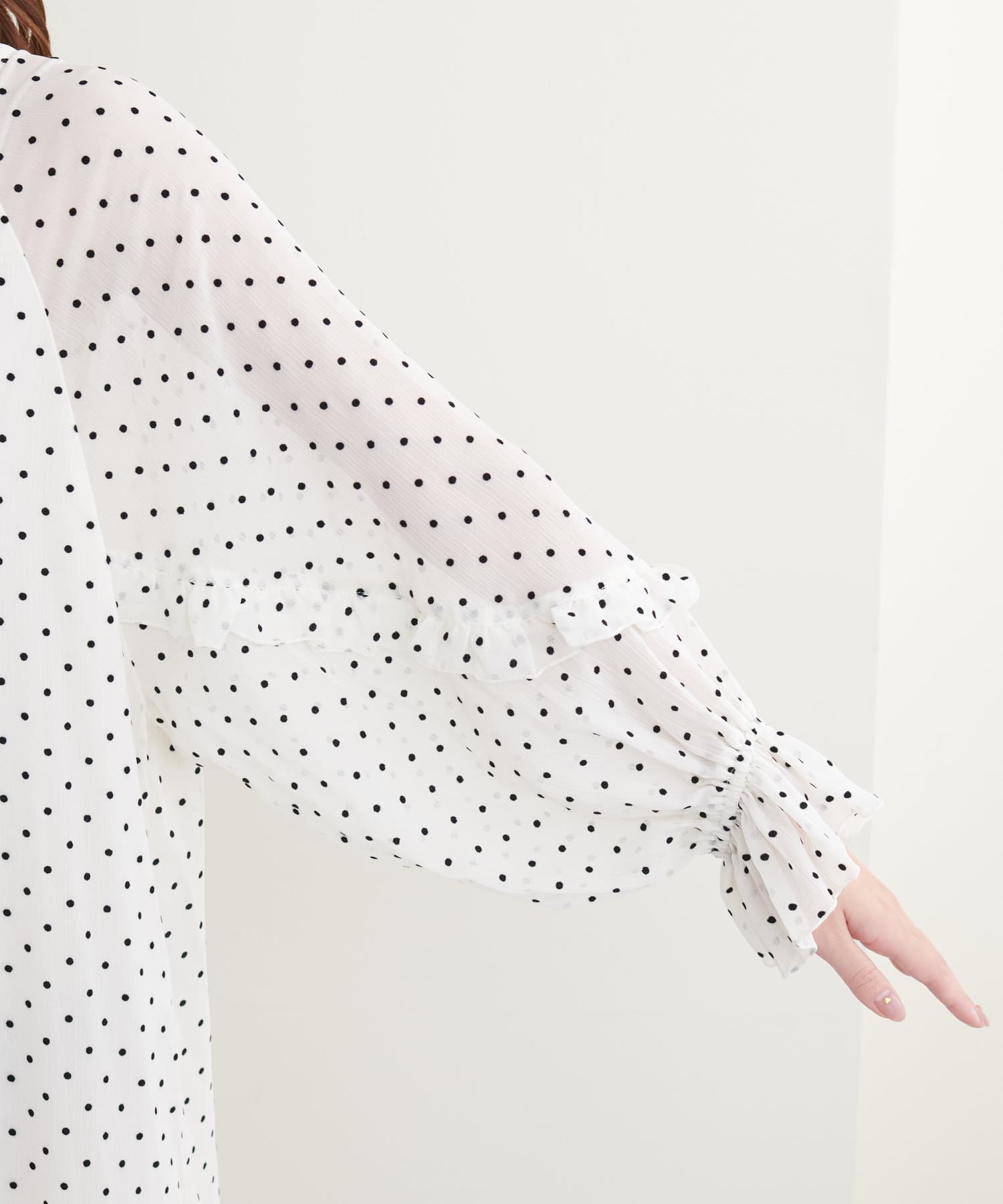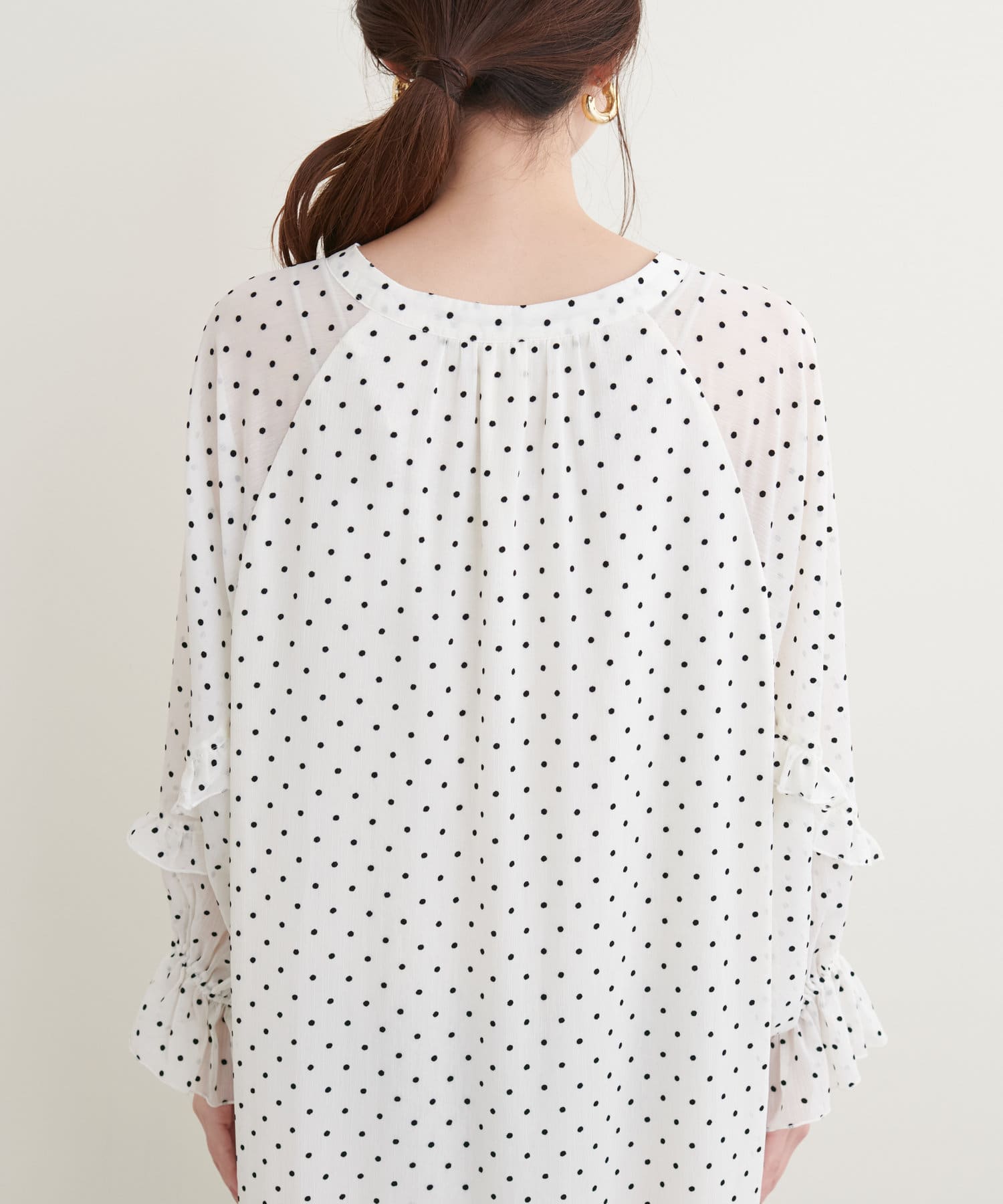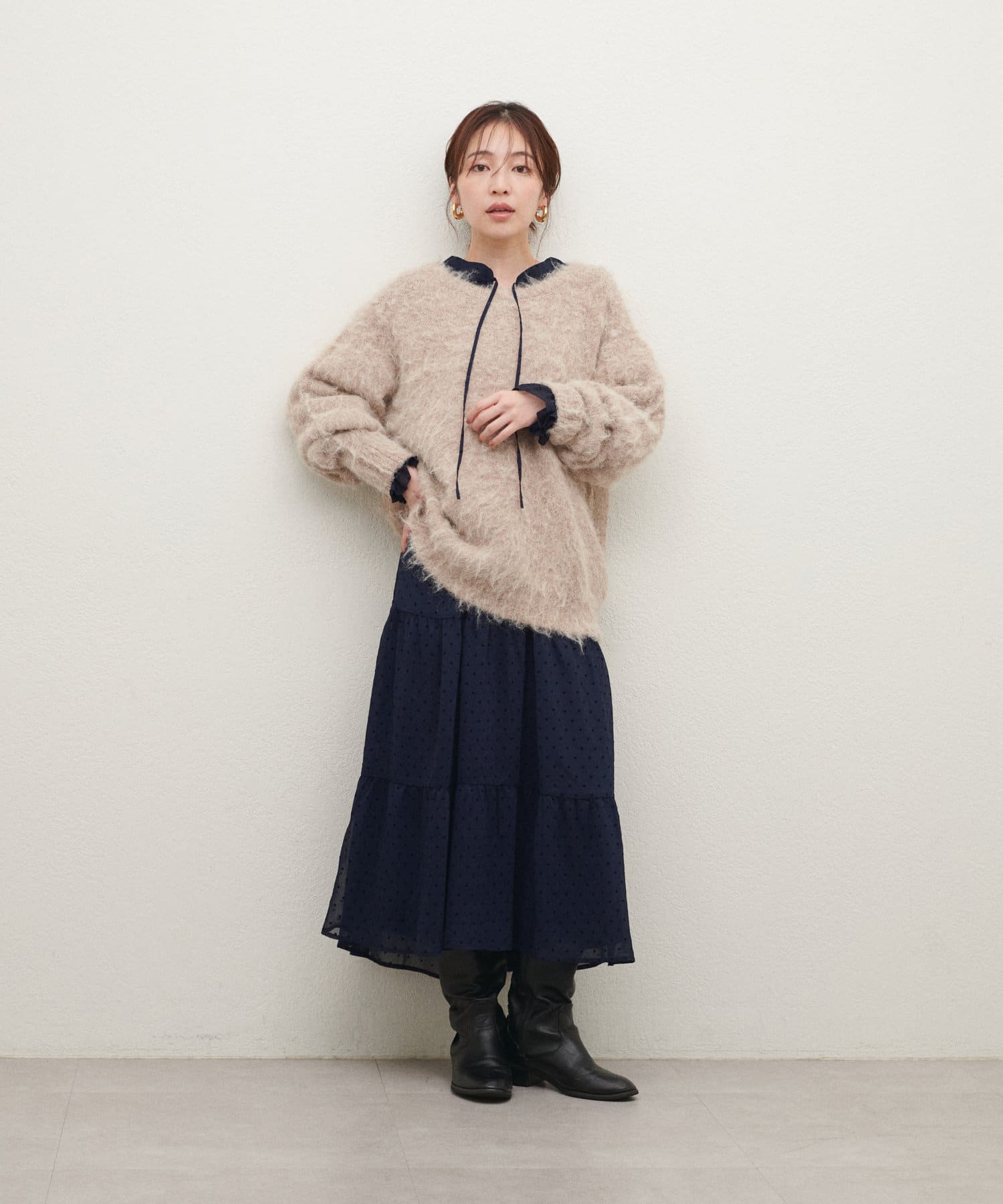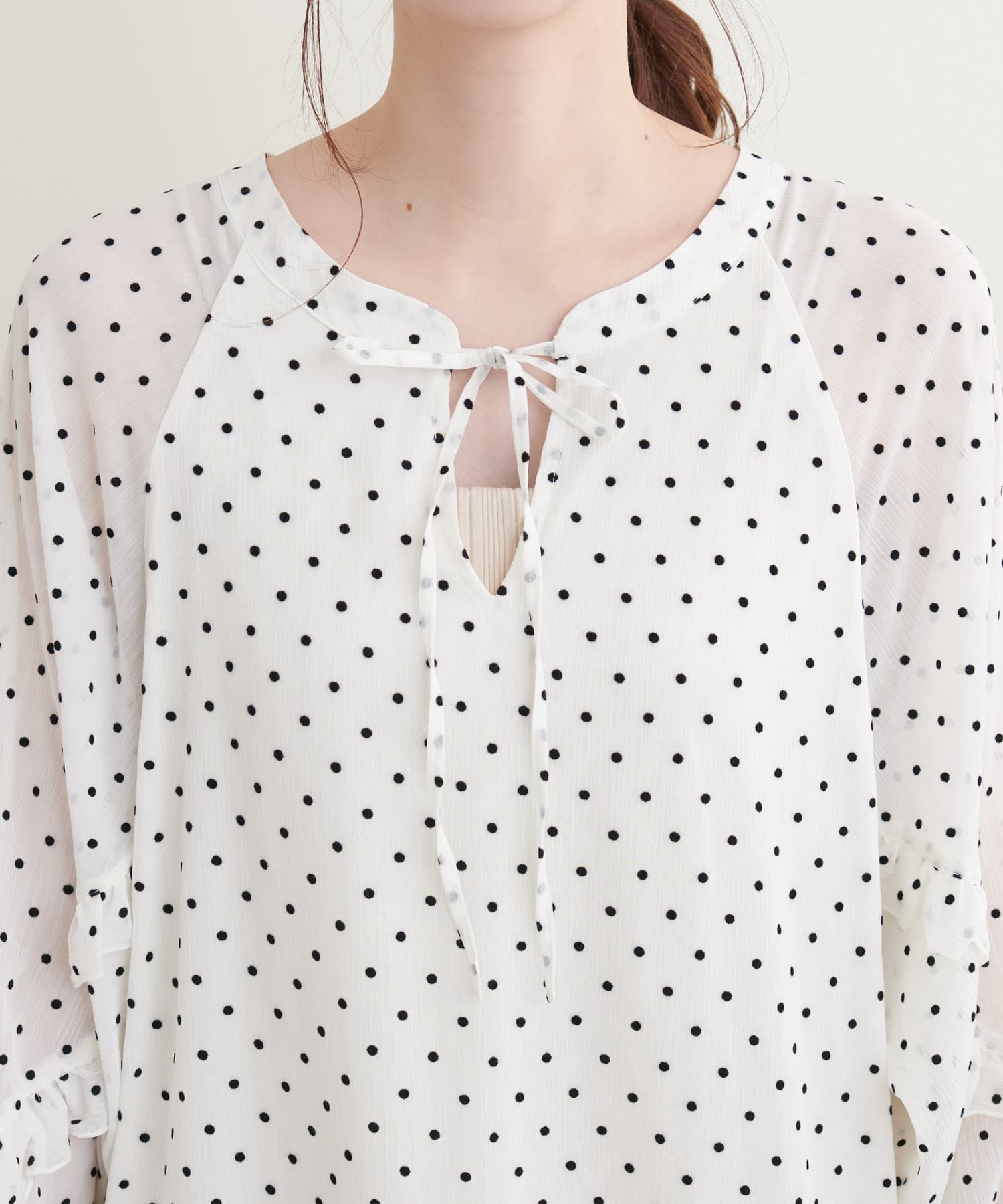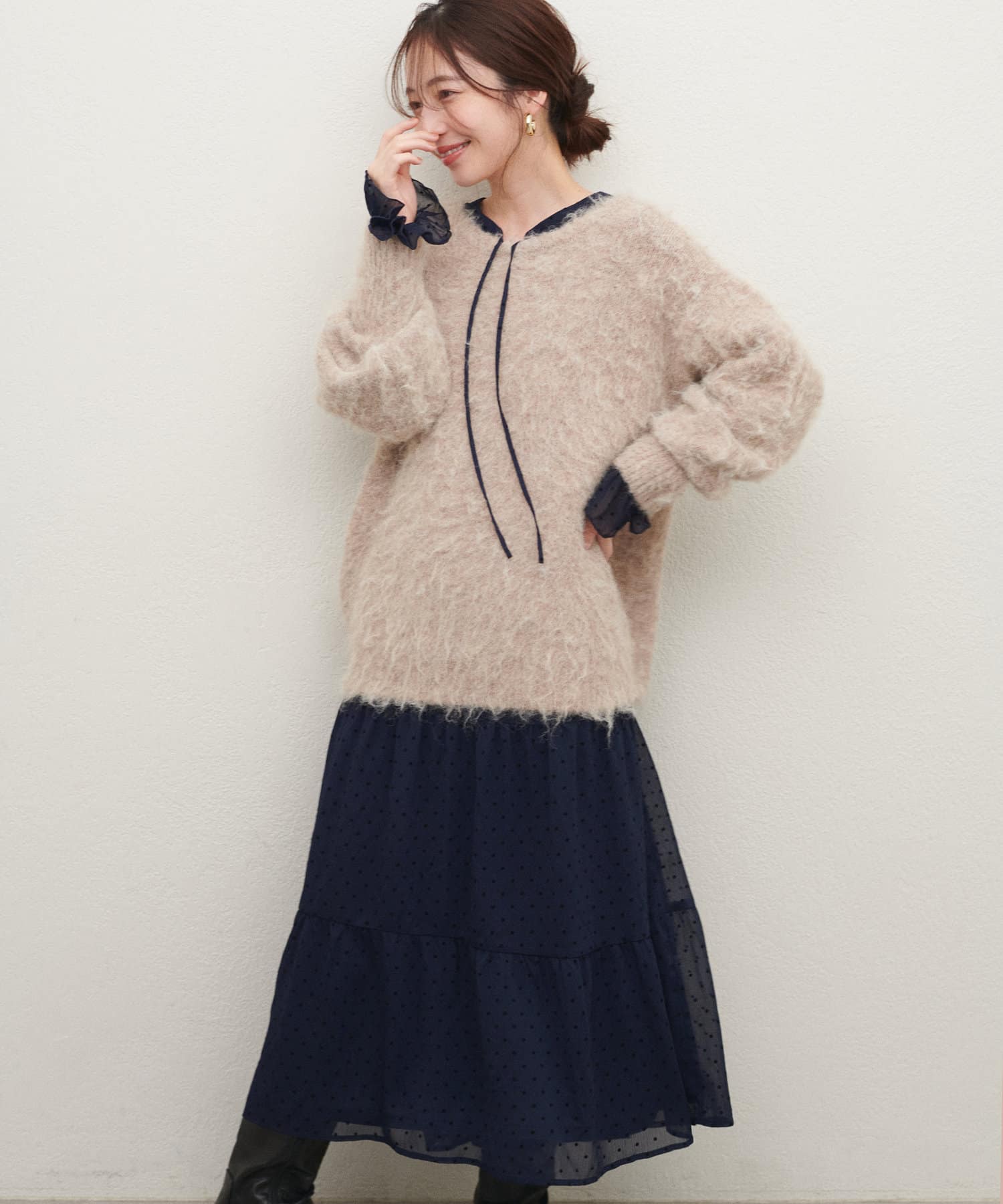リボンを結んでフェミニンに、リボンをたらして、キーネックで大人っぽい雰囲気でお召しいただけます。