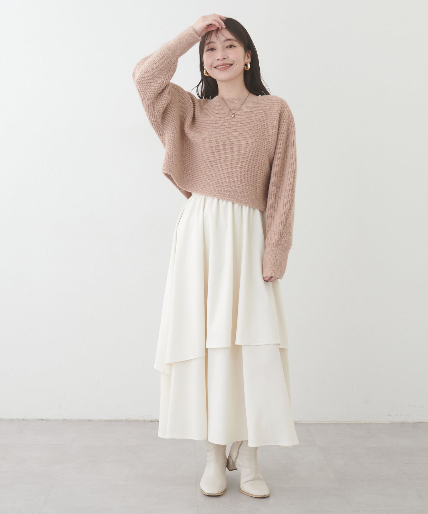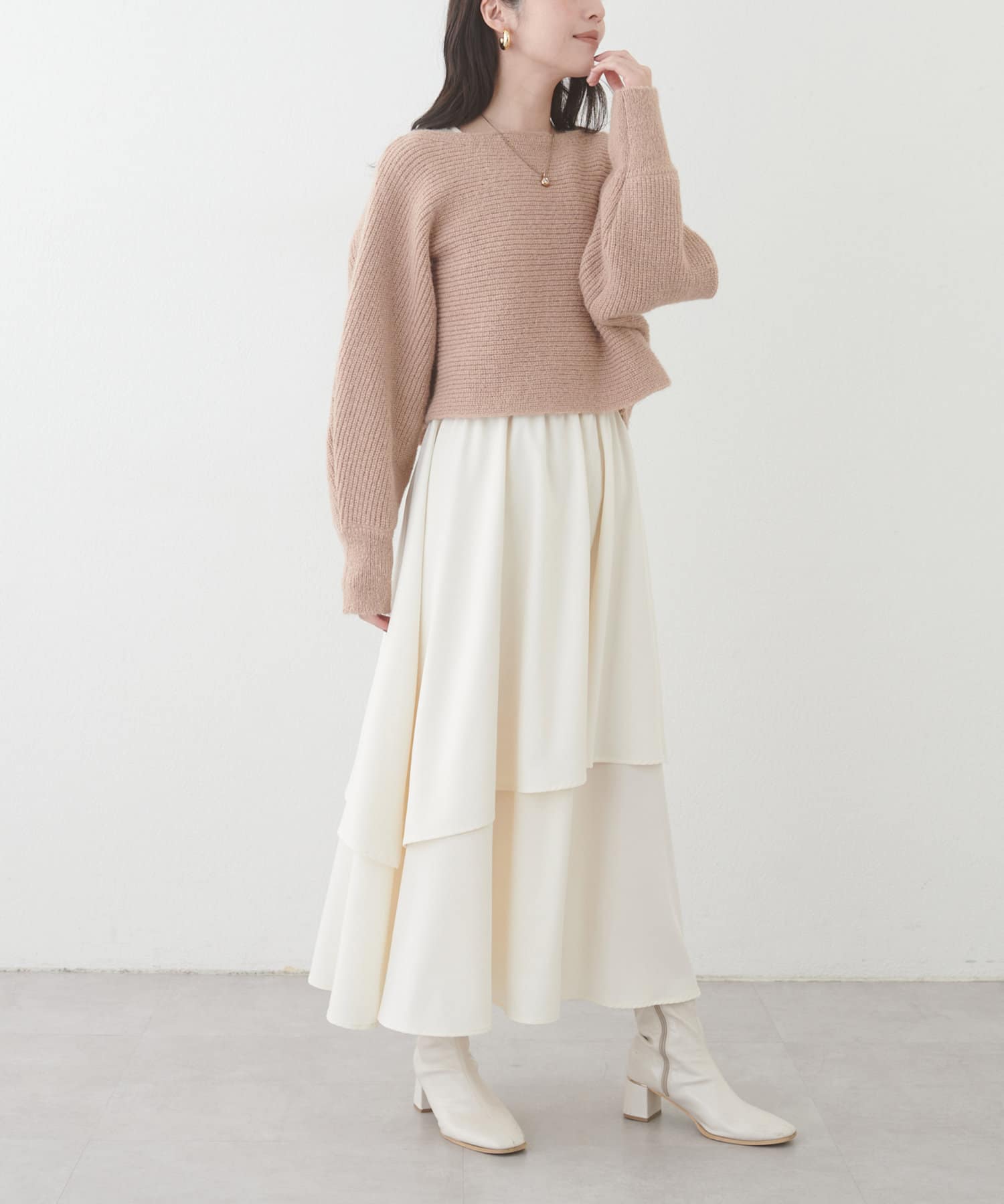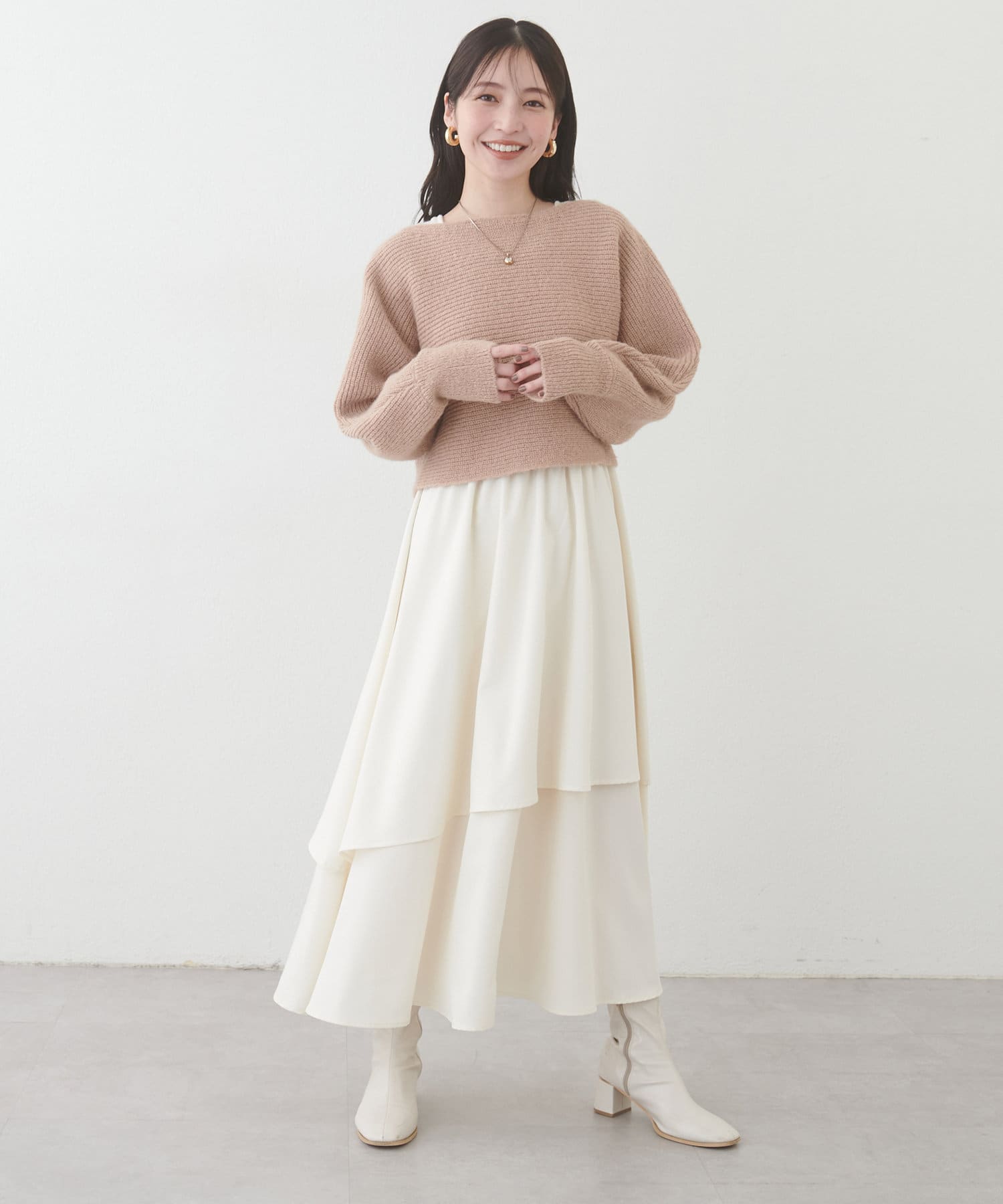 ゆるっとしたトップスを合わせてフェミニンカジュアルなスタイリング、