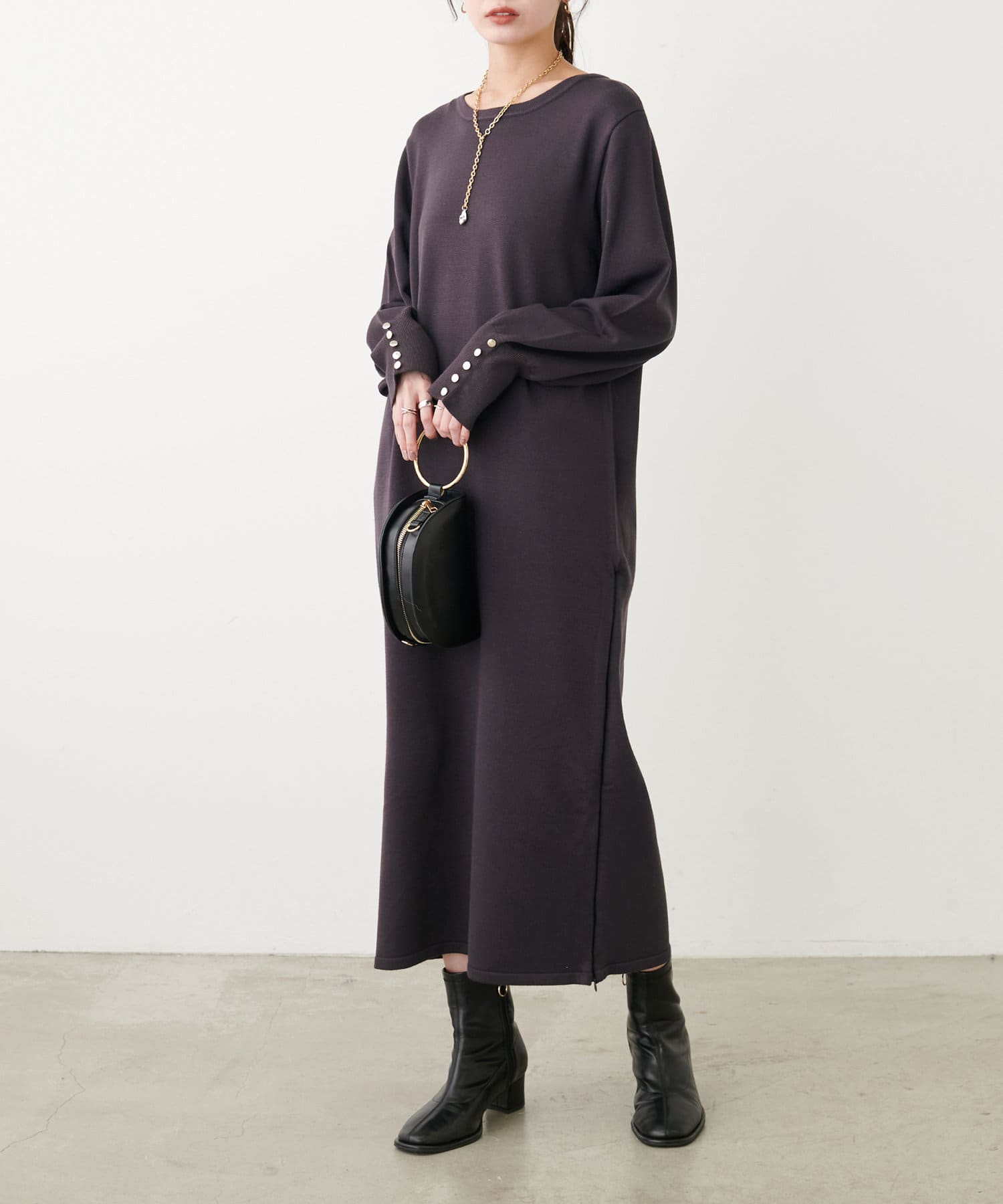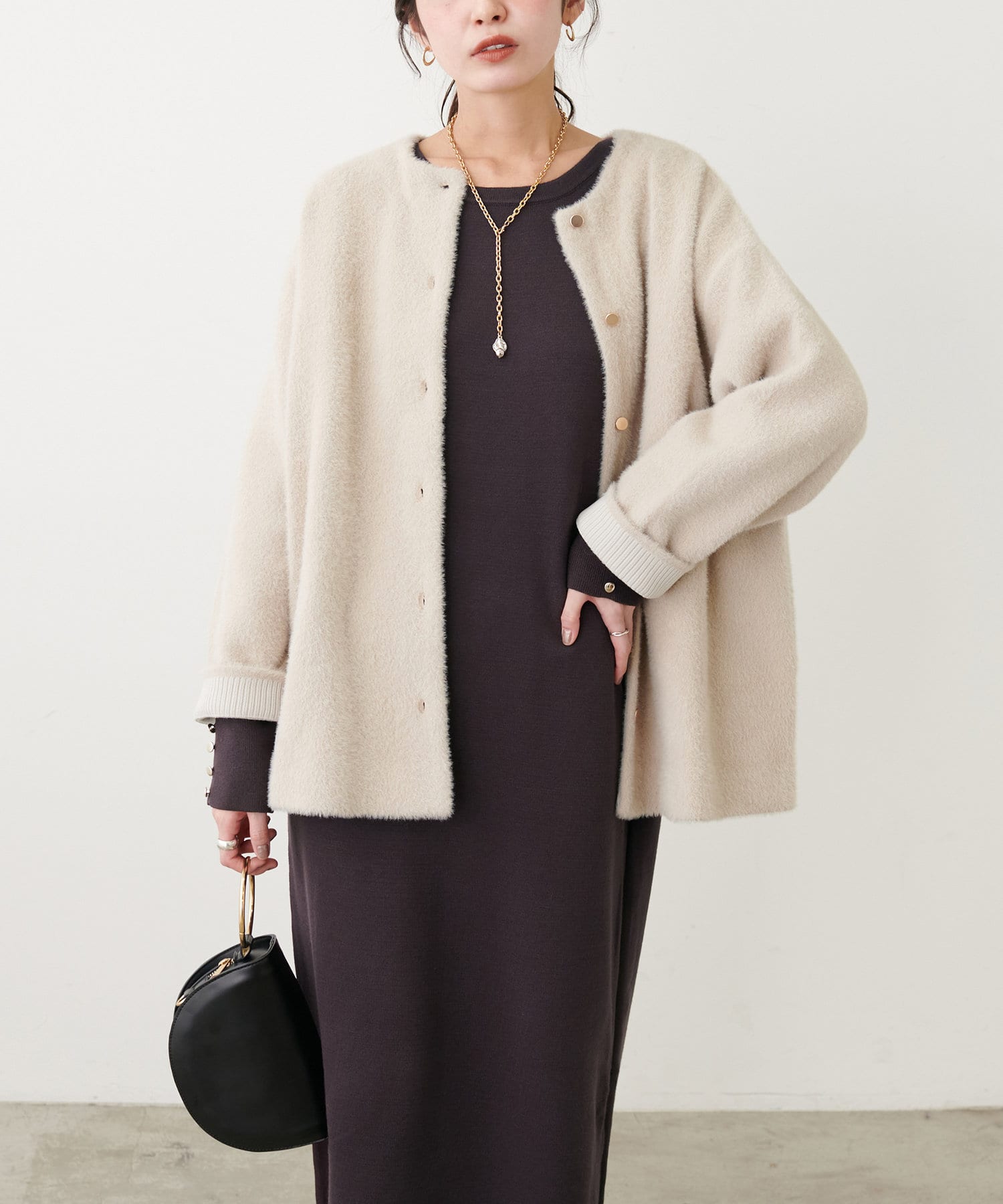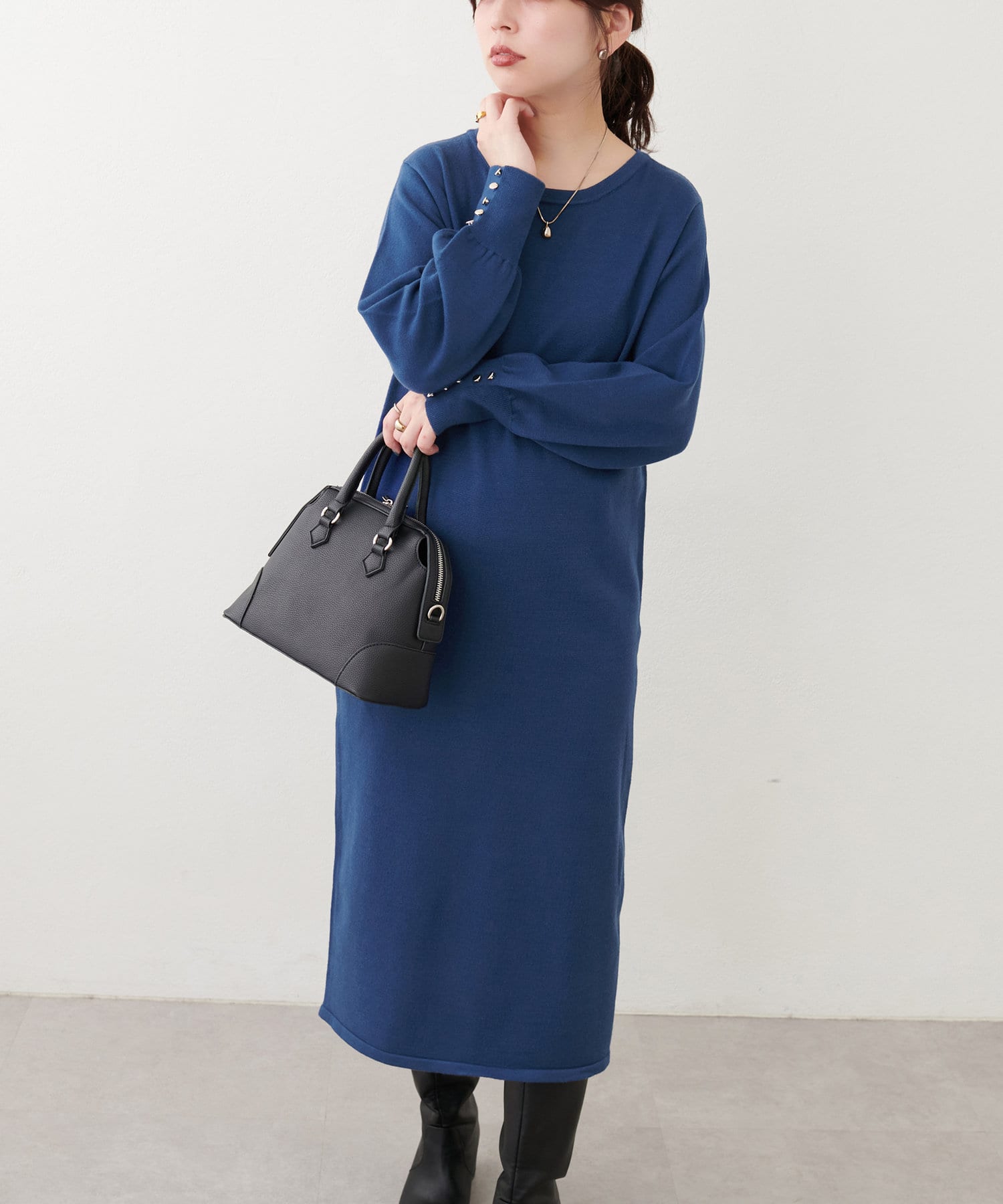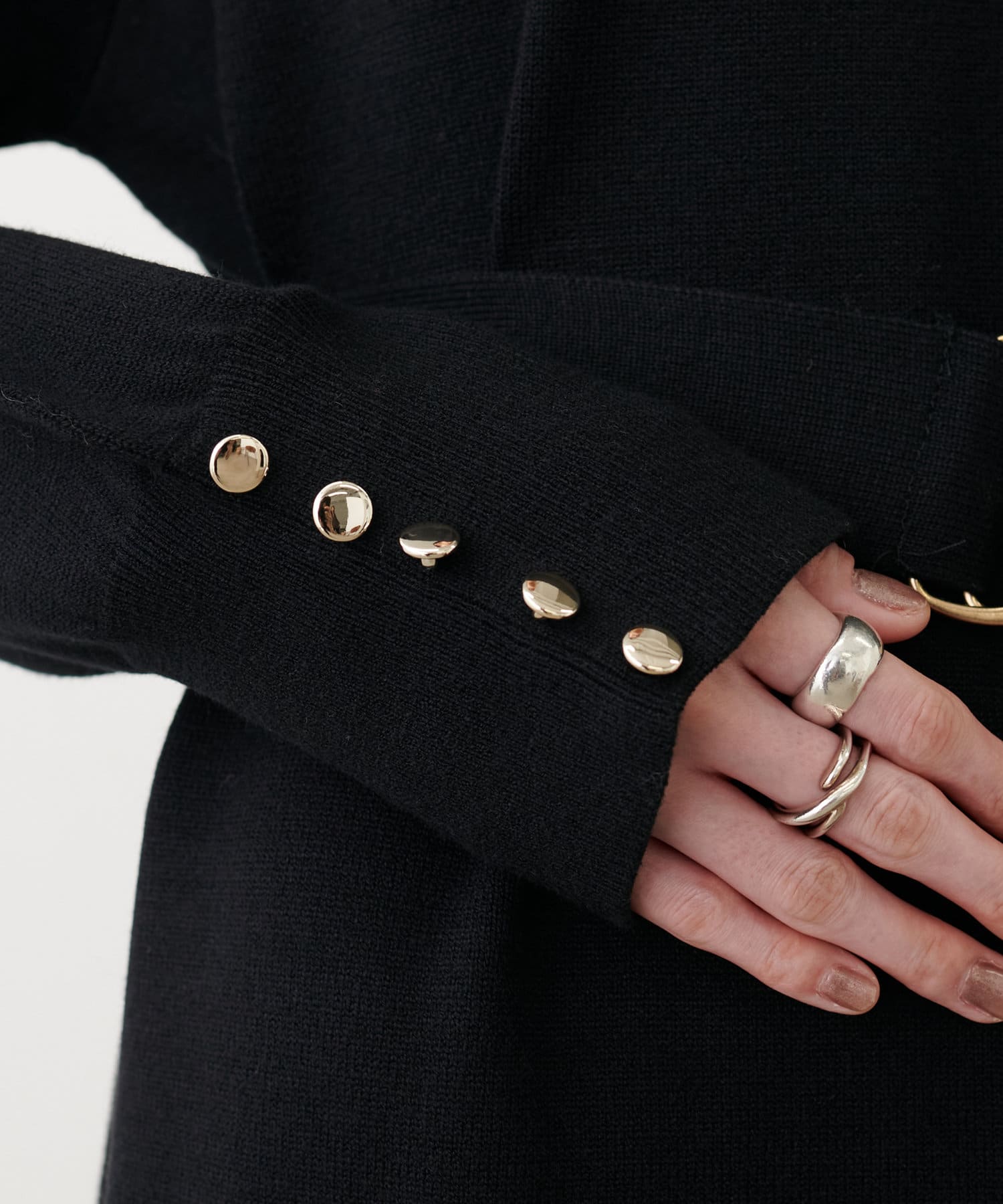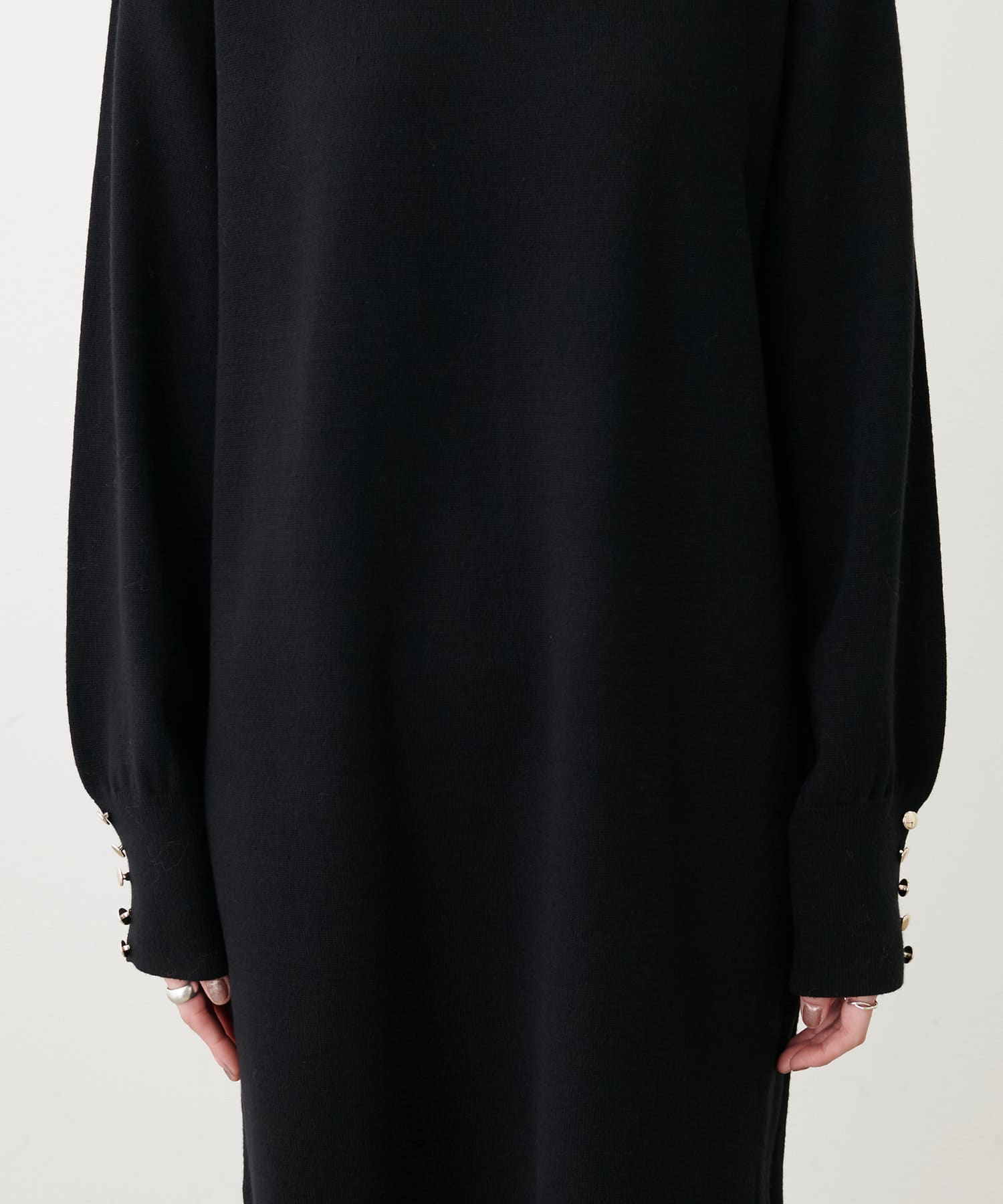 袖のボタンで上品さをプラスし、首元は詰まりすぎないスッキリとしたデザインです。