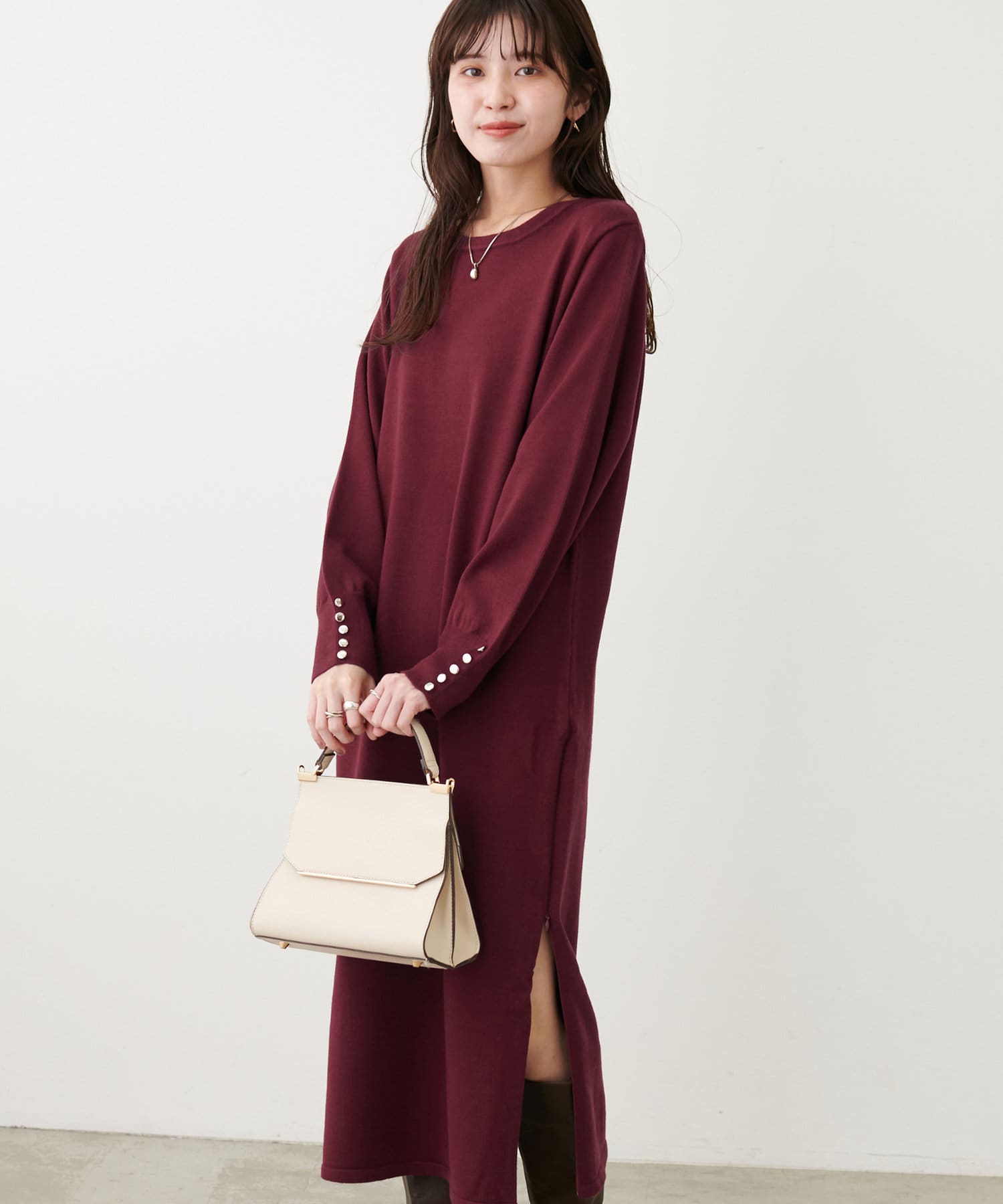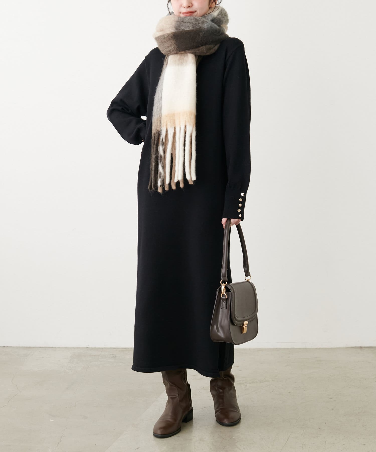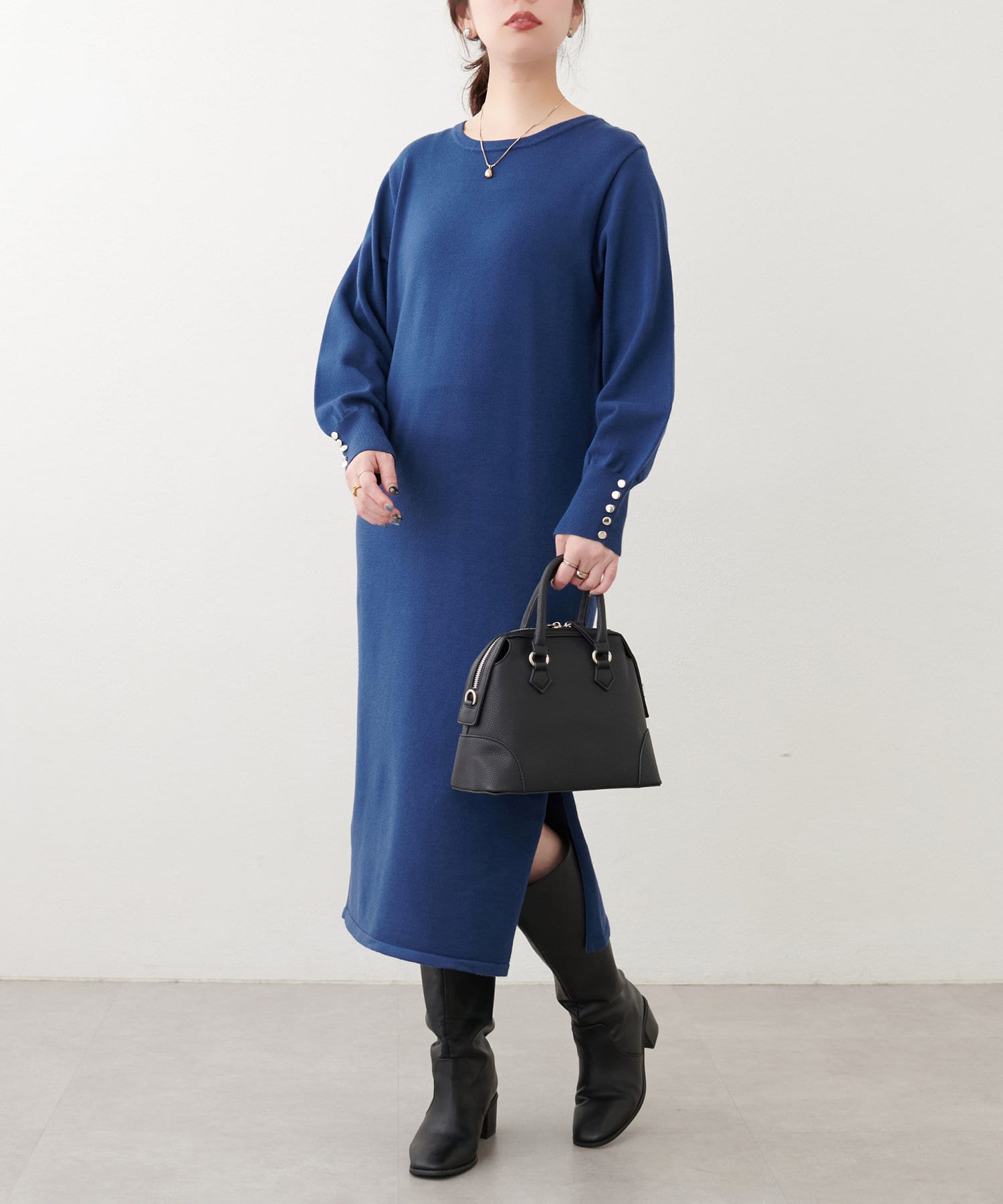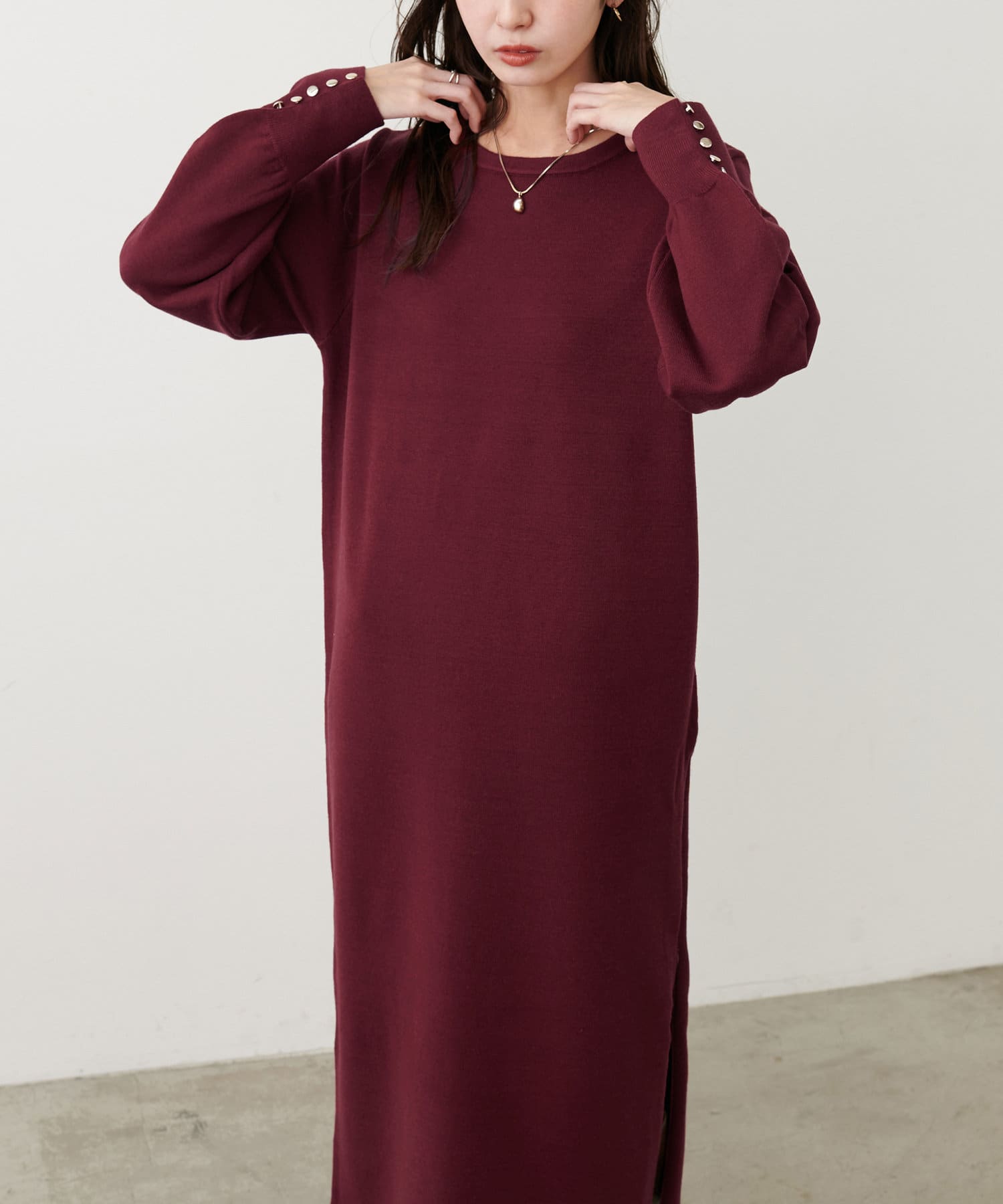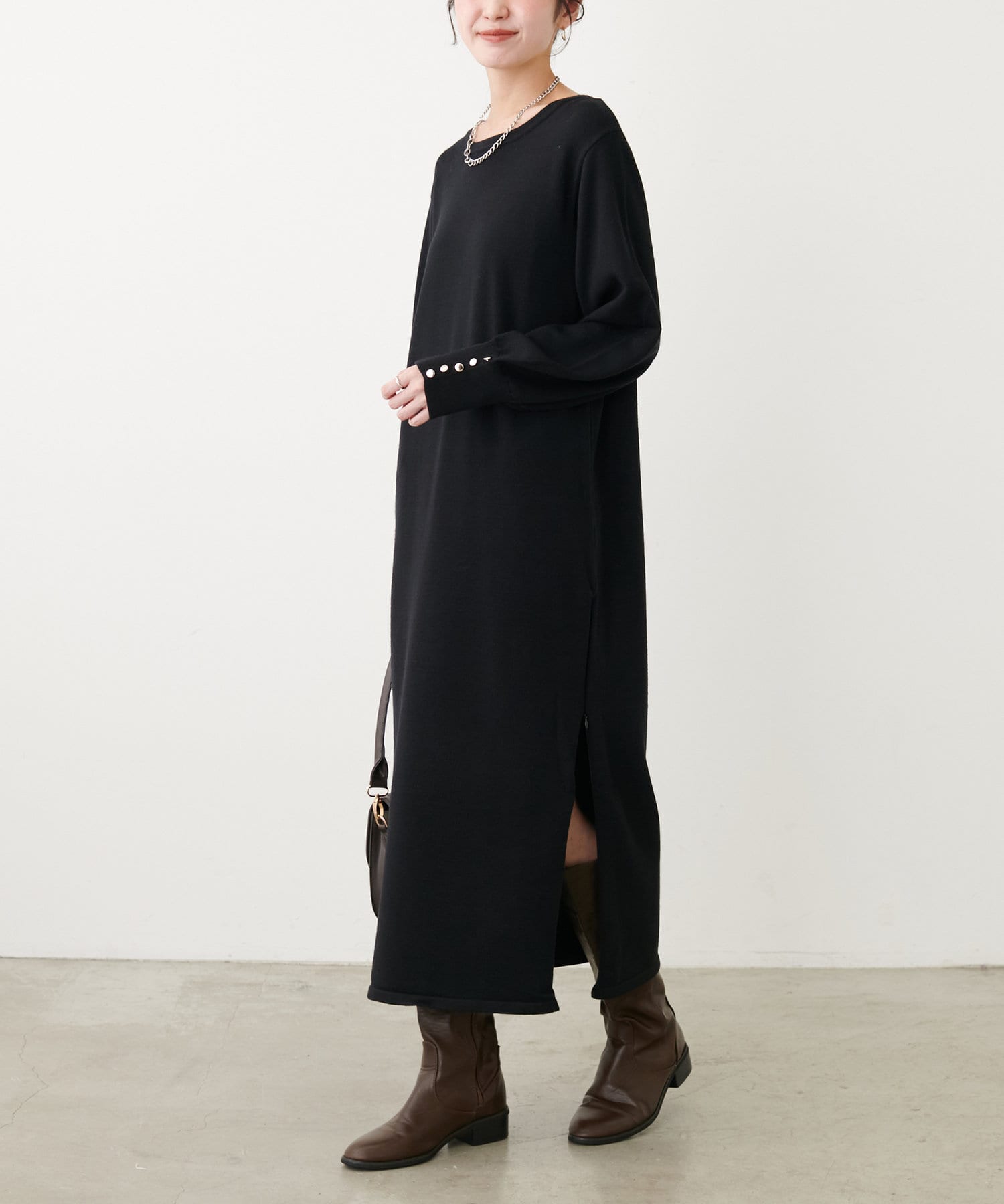 袖のボタンで上品さをプラスし、首元は詰まりすぎないスッキリとしたデザインです。