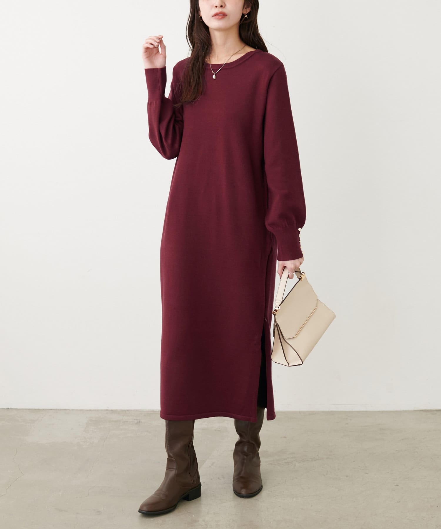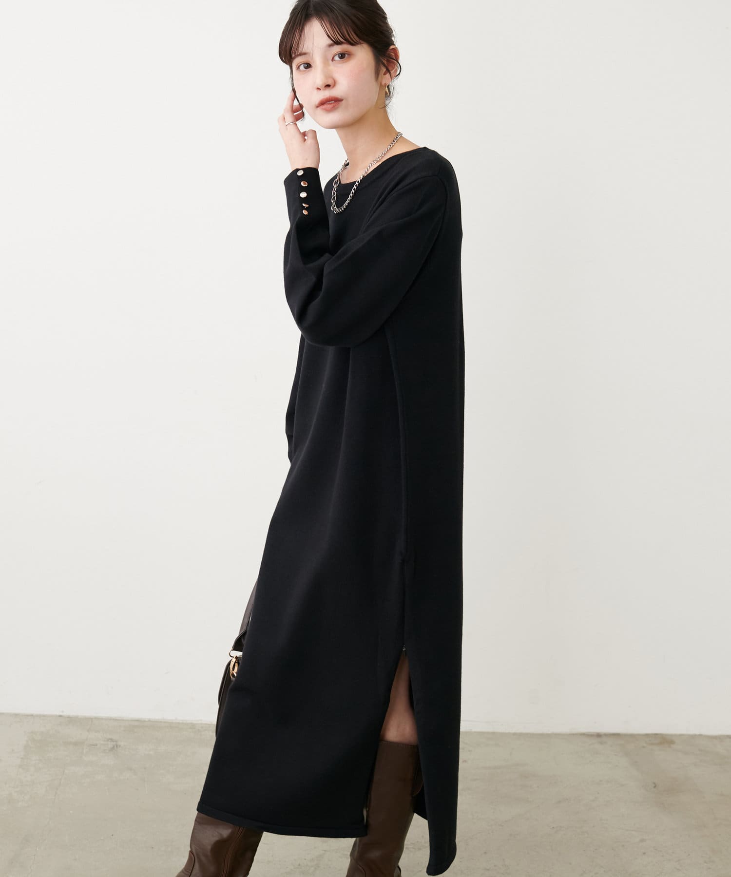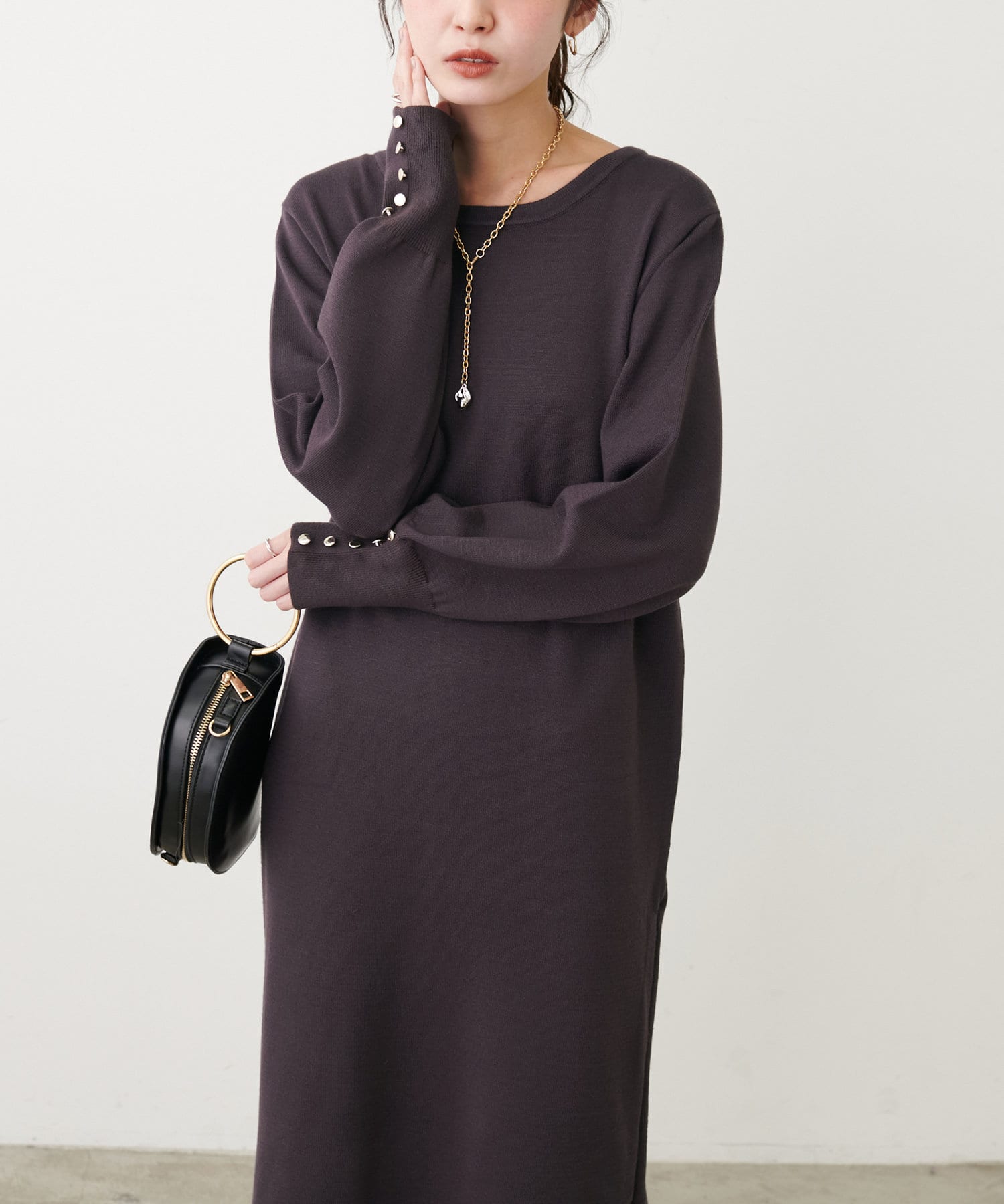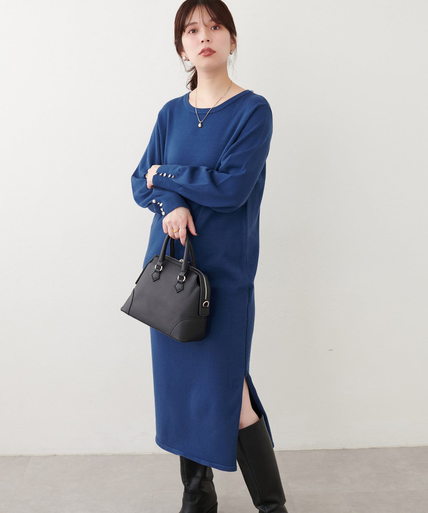 袖のボタンで上品さをプラスし、首元は詰まりすぎないスッキリとしたデザインです。